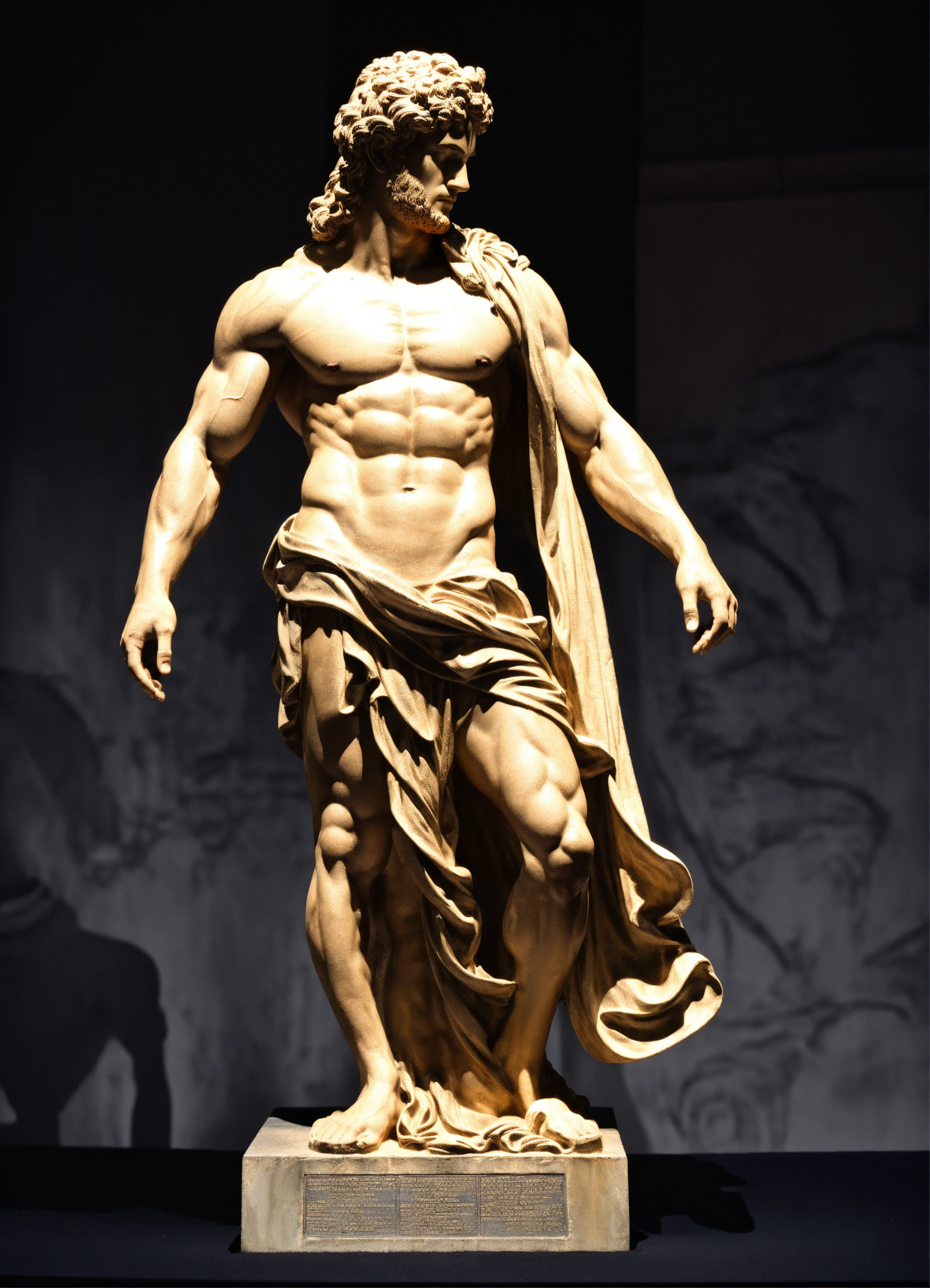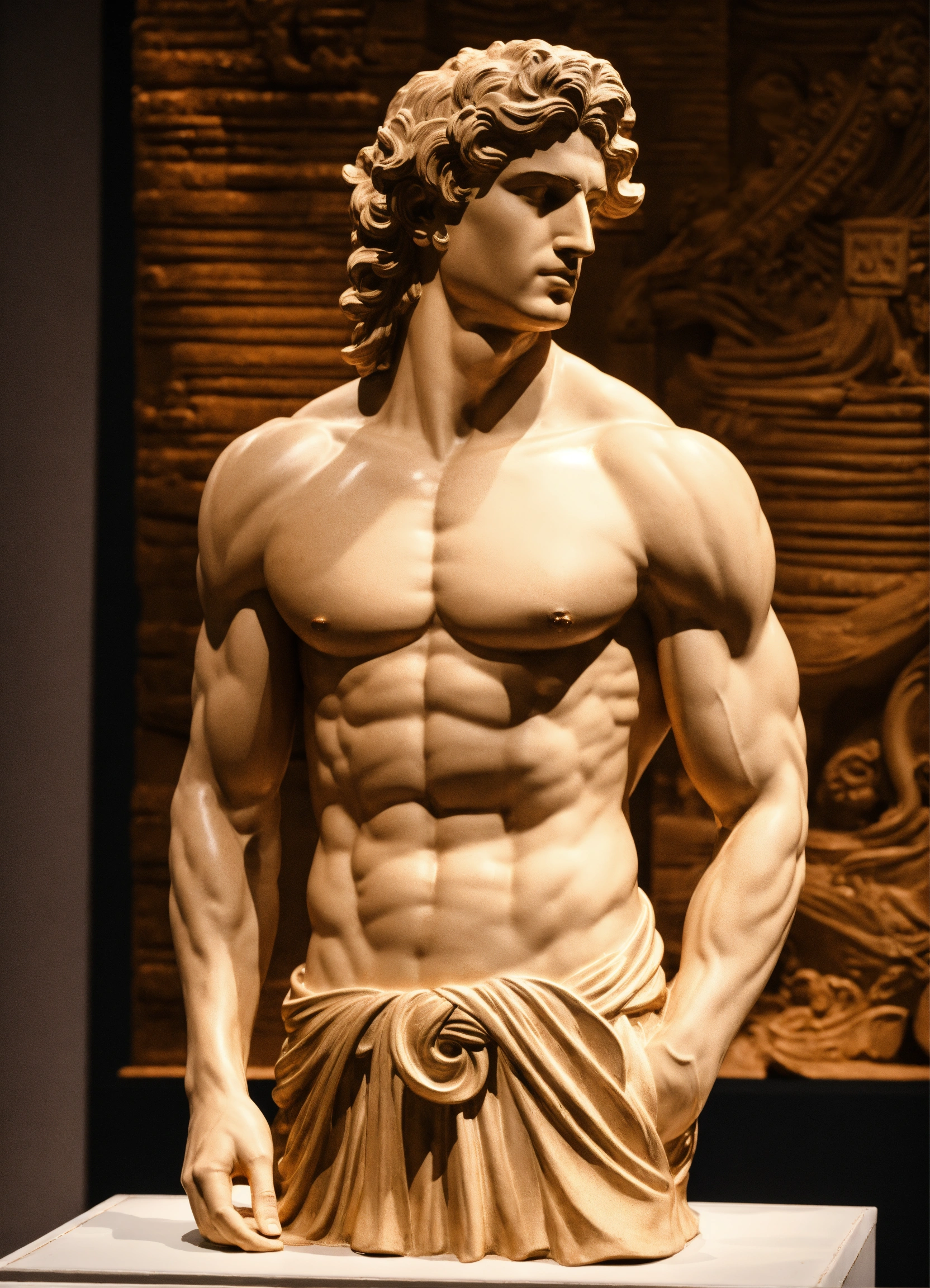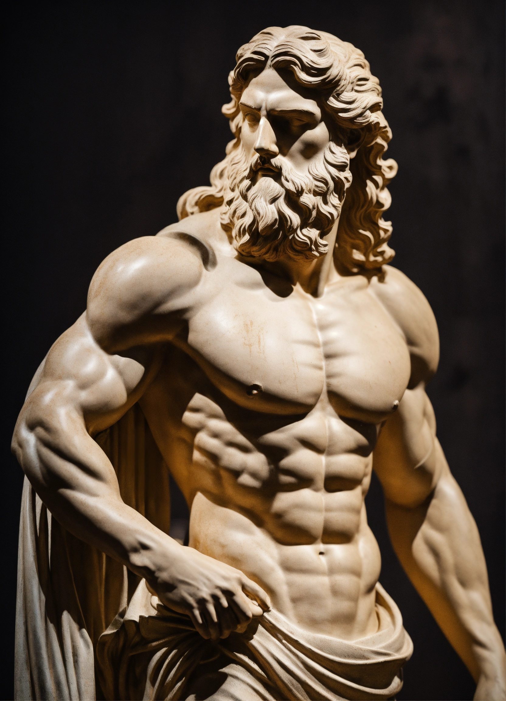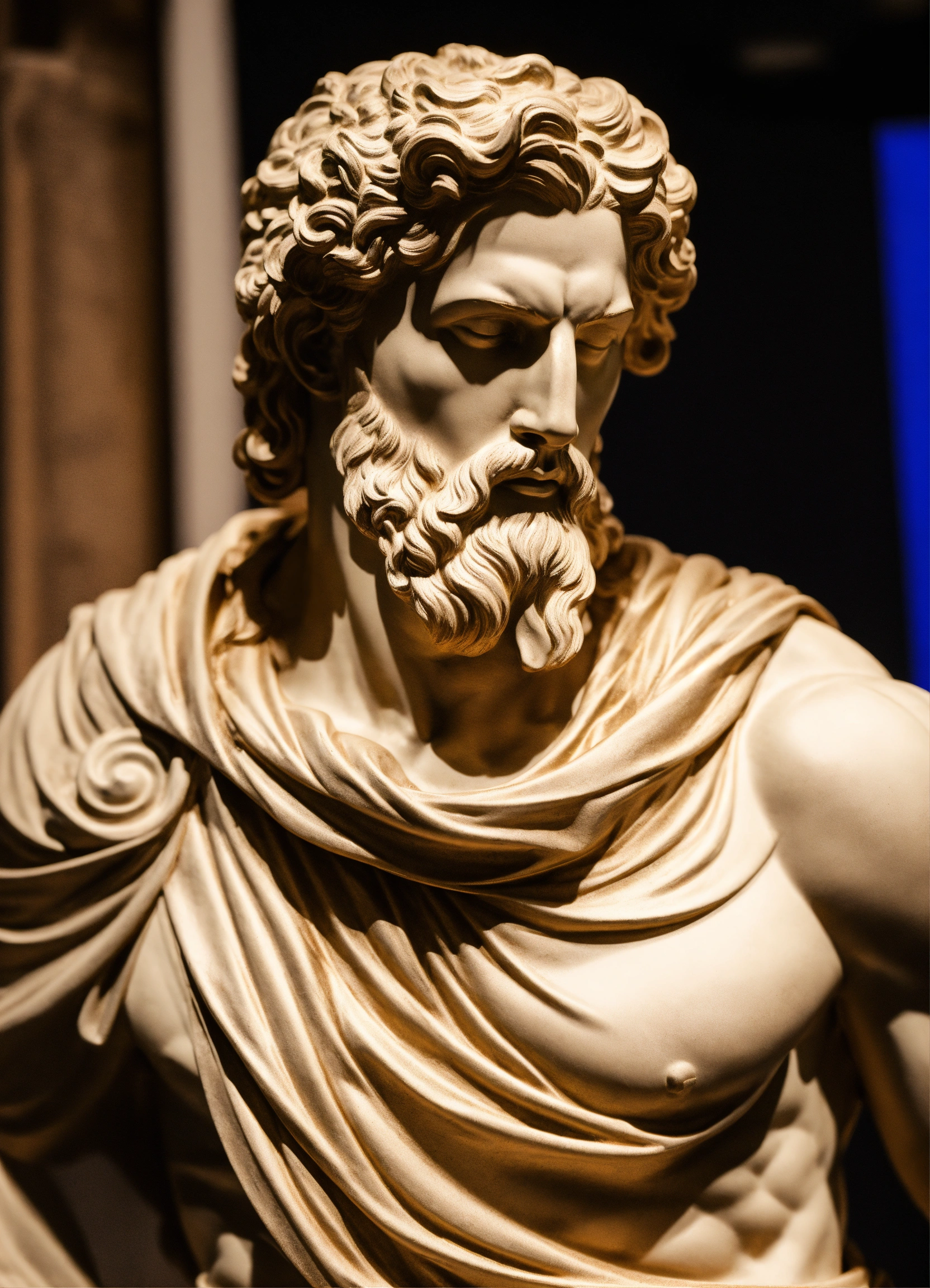 A statue from a muscular greek god statue with a wavey middel parting hair with wheit color with a black backround standing on a podest embroidered on a hoddie