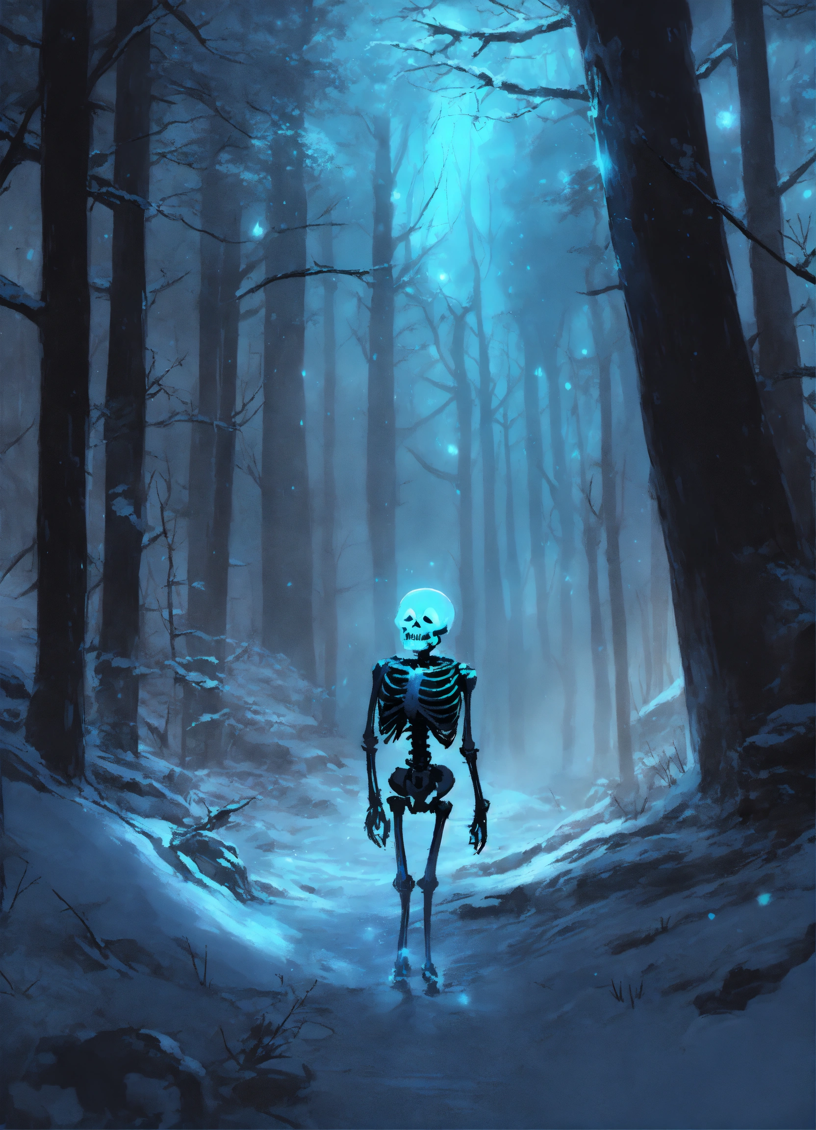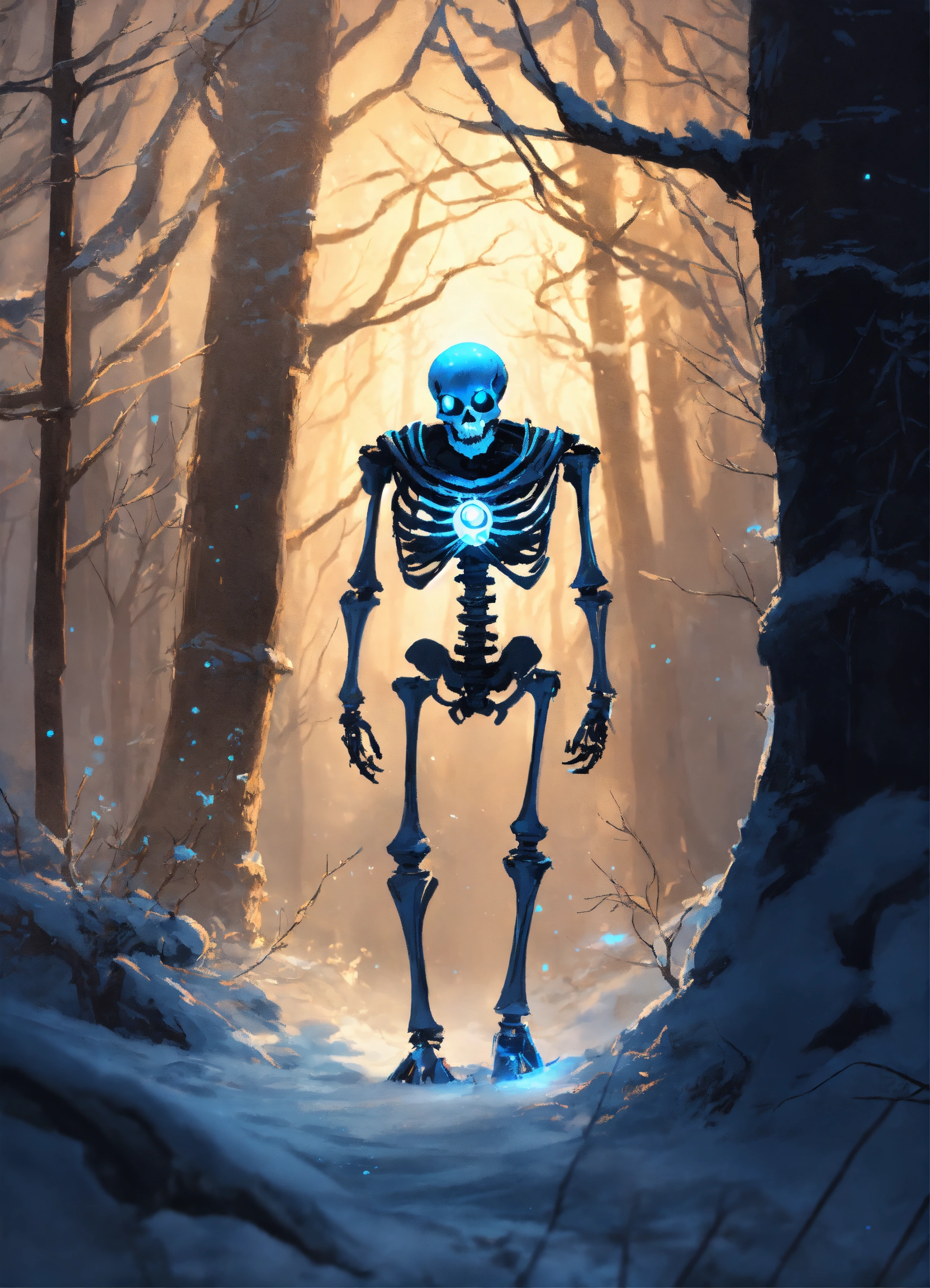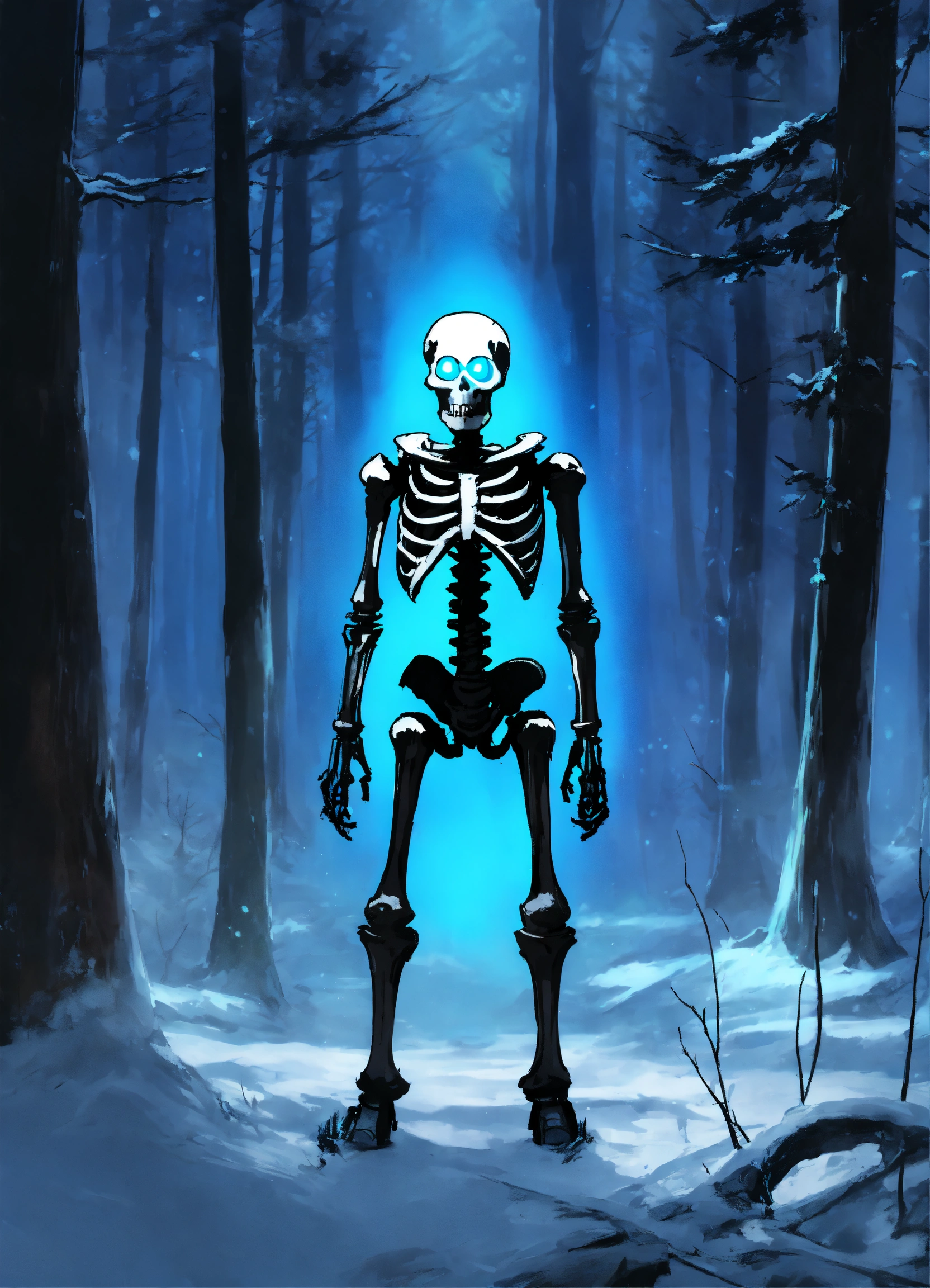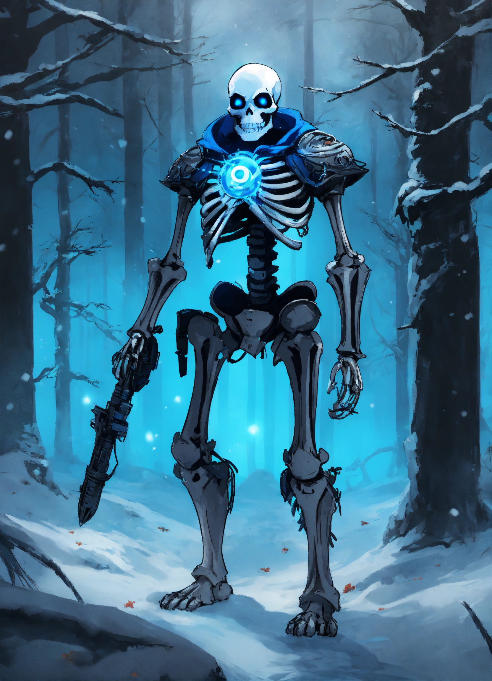 Concept art of sans the skeleton with a blue glowing eye standing in a dark snowy forest