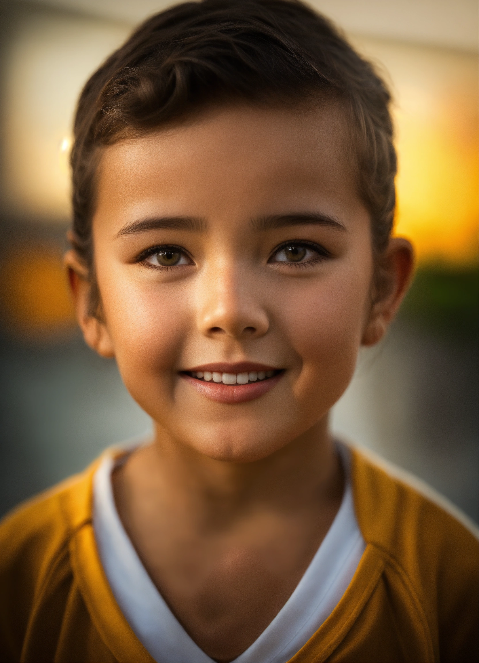 Genera una imagen de un niño con una expresión facial sonriente. la persona debe estar parada recta, mirando a la cámara y su cuerpo superior completo debe ser visible. la cabeza de la persona debe ser relativamente pequeña dentro de la imagen. la iluminación debe ser uniforme y equilibrada, sin sombras fuertes o áreas sobreexpuestas. el fondo debe ser discreto y simple, sin objetos que obstruyan la cara o el cuerpo de la persona. por favor, asegúrate de que la imagen sea de alta resolución y calidad.