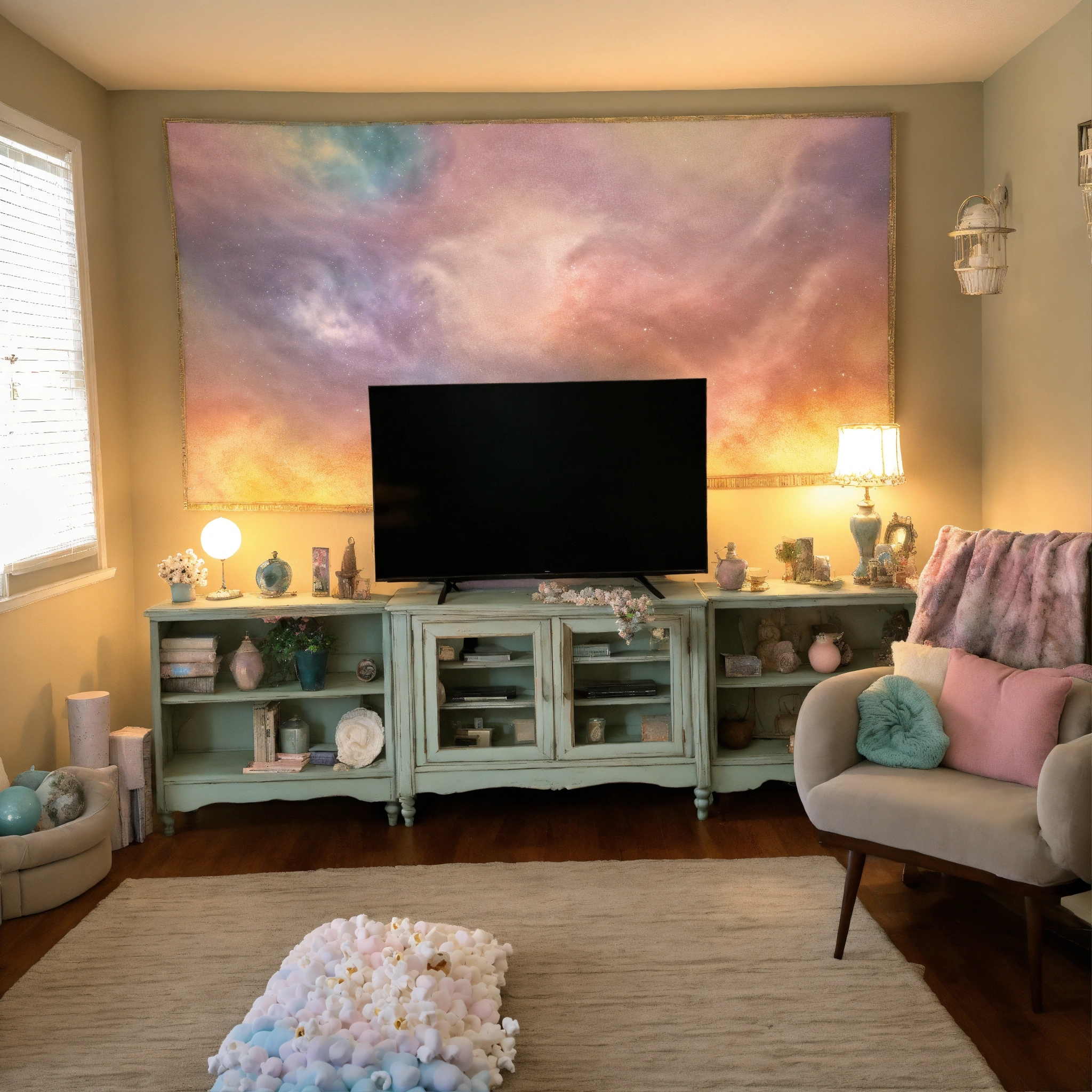 Shabby chic dreamy mist pastel junk journals the movie marathon retreat imagine a cozy family room dedicated to movie nights. a big, comfortable sectional sofa with plenty of throw blankets and popcorn is the centerpiece. a large screen tv or projector takes up one wall, and there's a shelf full of dvds or streaming devices. swirling magical fairytale abstract art style