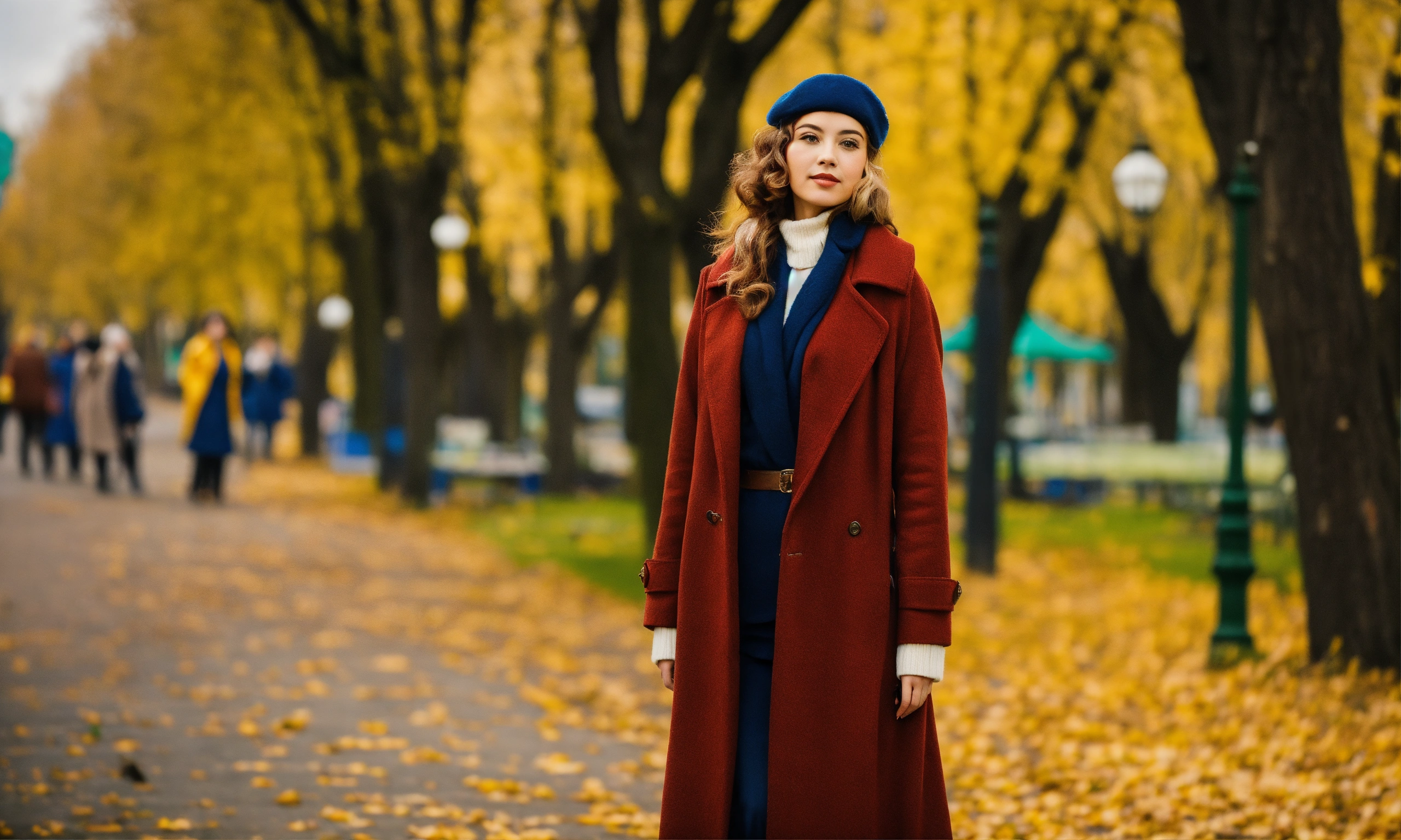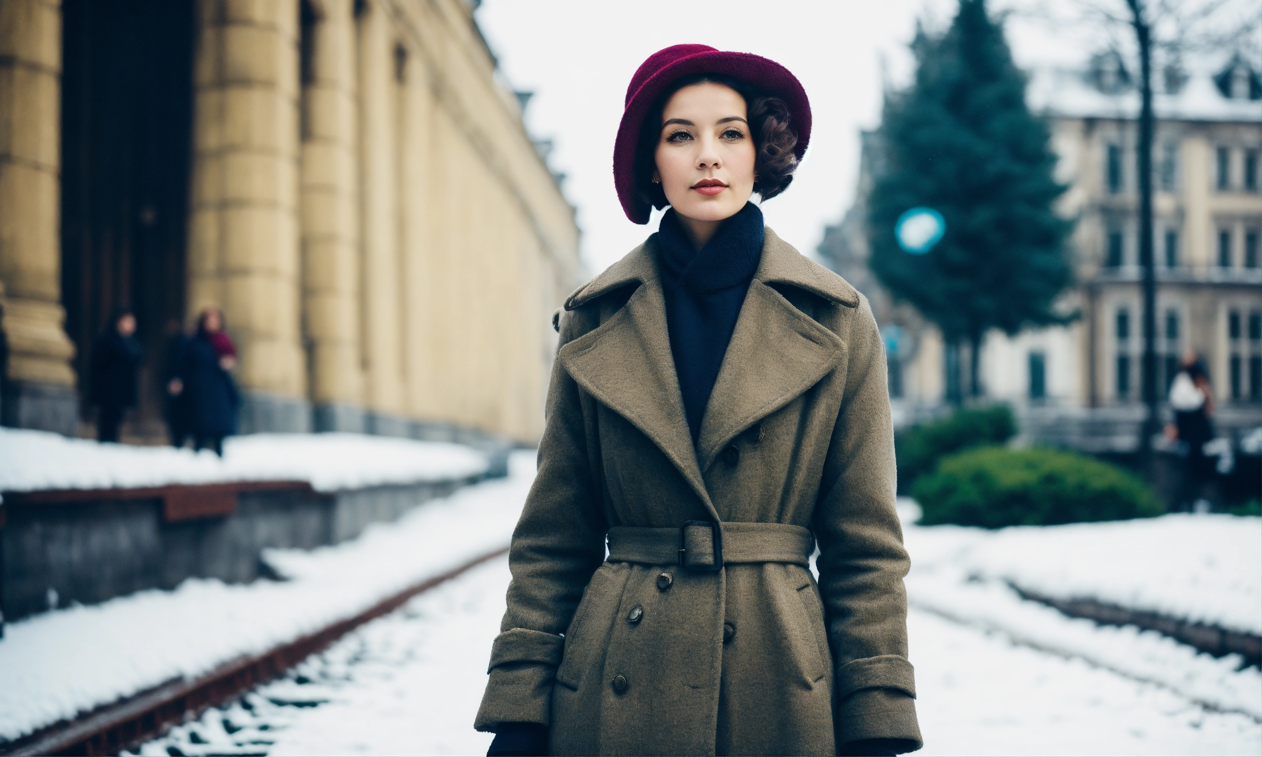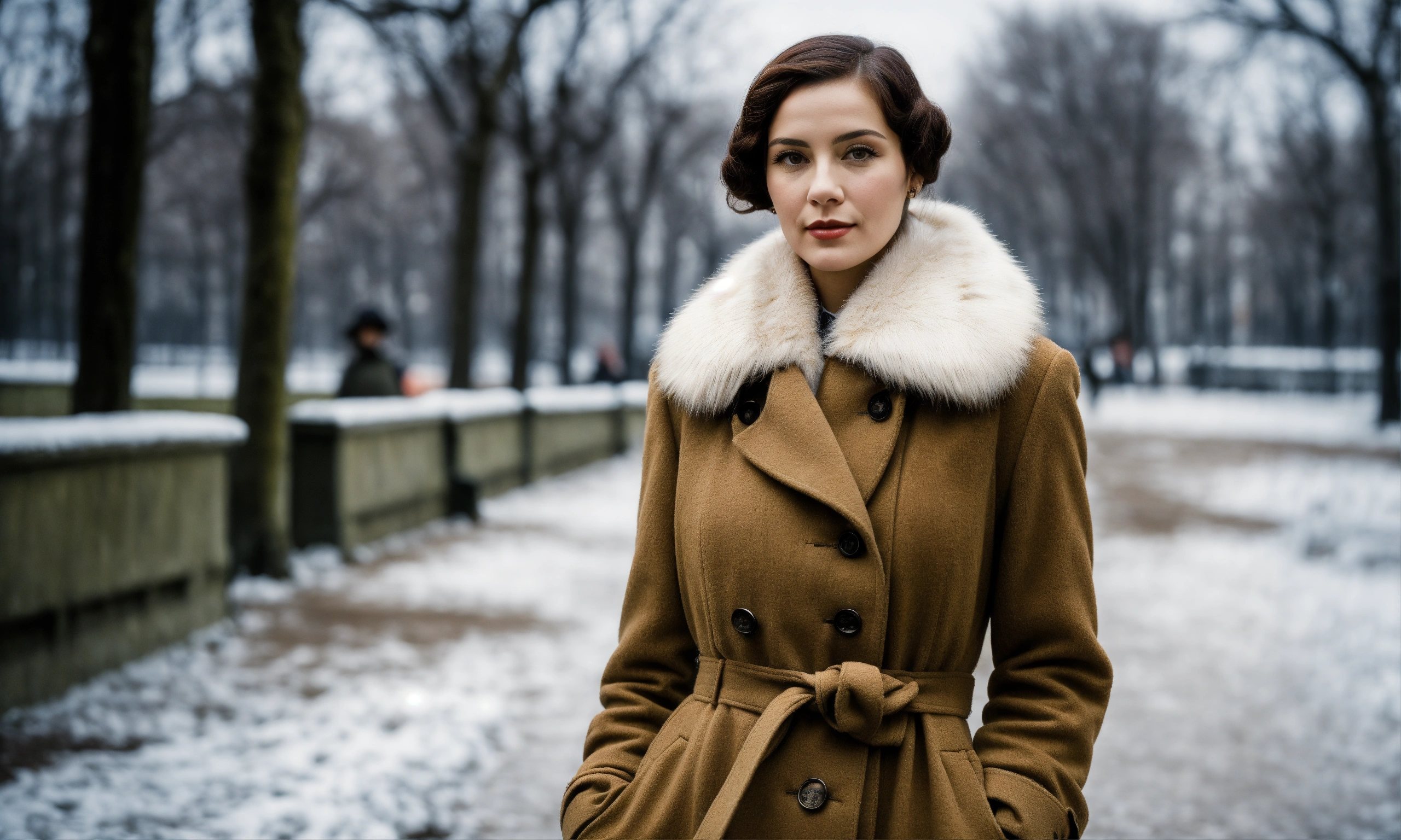 Retro warszawa 1920-1930, сute europian woman, looks at the camera at full height, retro style clothing long coat, the woman exudes kindness, calmness and ambition. she has a beard. retro warszawa 1920-1930, winter. retro style full haight. white skin in a park