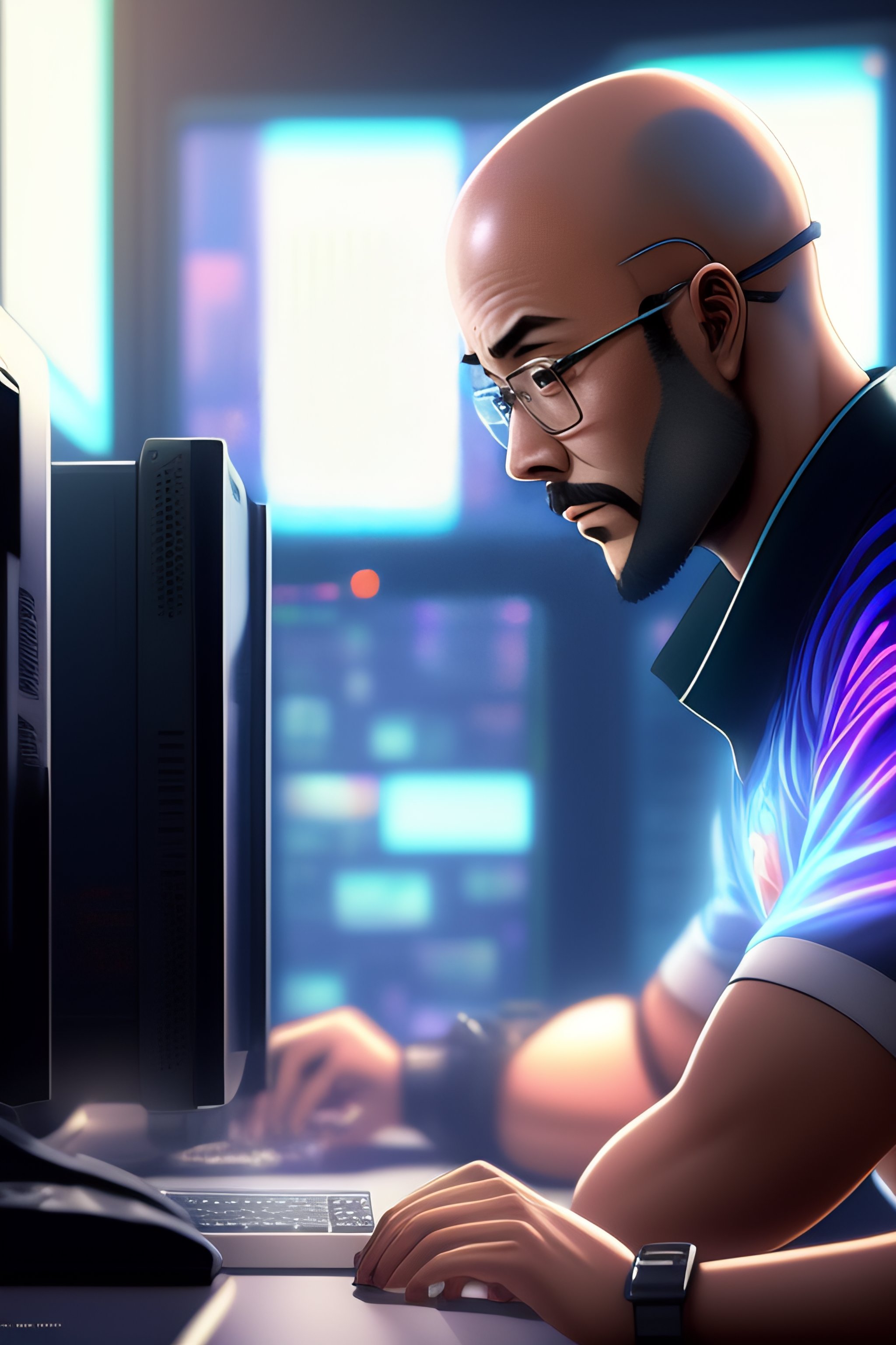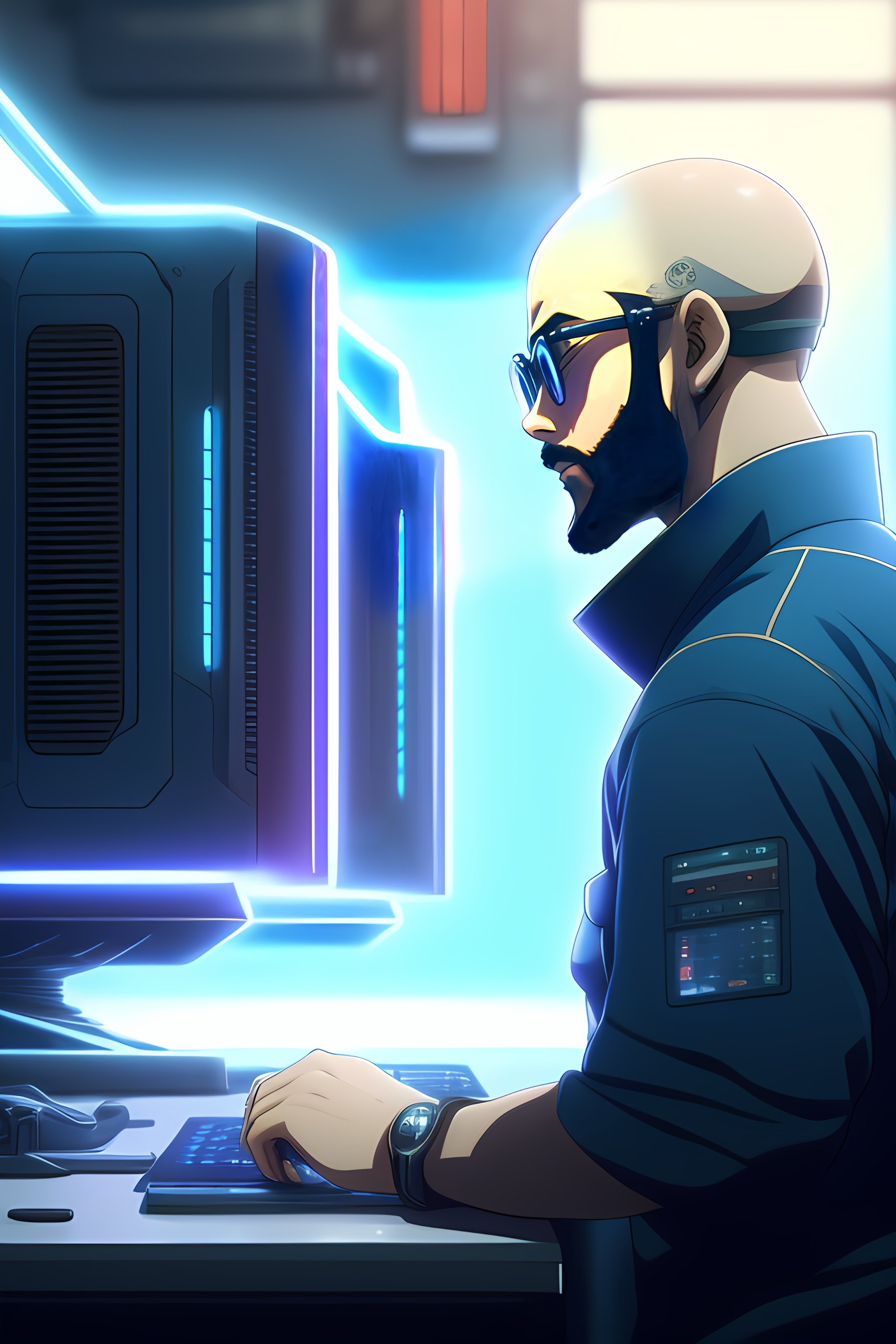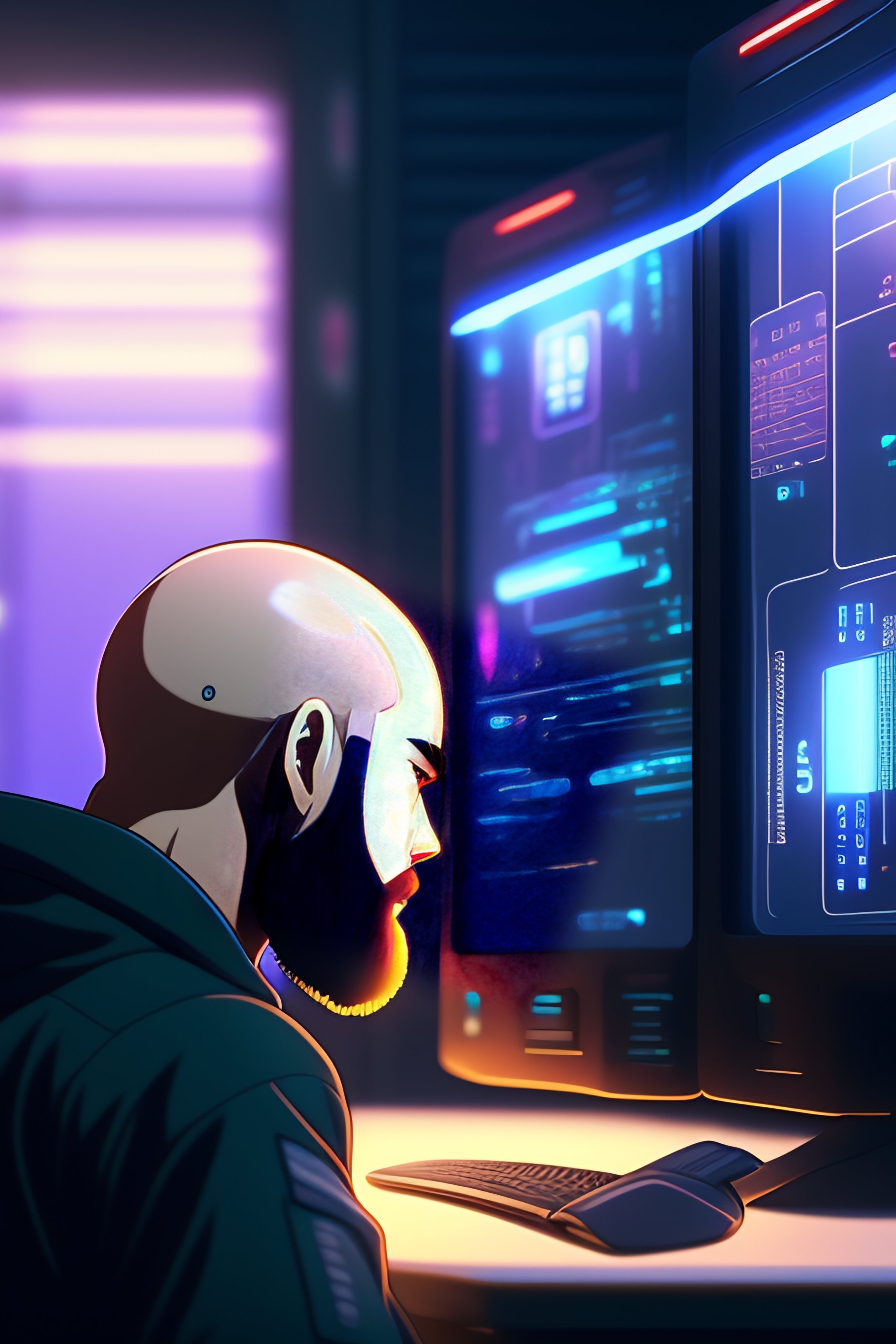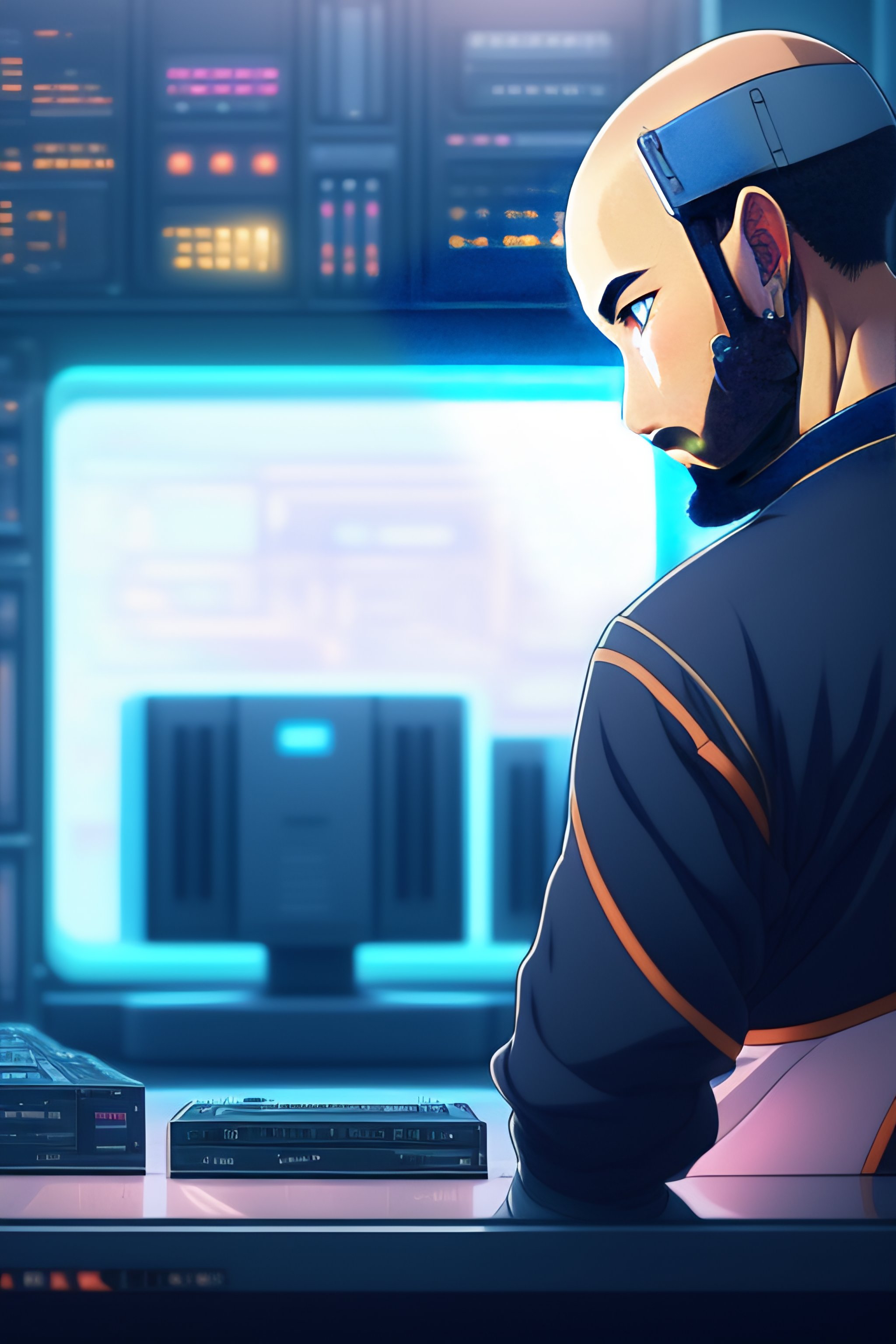 A bald bearded tech support guy fixing computers, anime, retro anime, 1980s anime, 1990s anime, ghost in the shell, serial experiments lain, 4k, rule of thirds, extreme detail, detailed drawing, trending artstation, hd, realistic lighting, sharp focus, backlit, symmetrical features