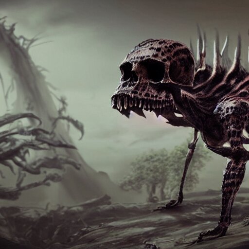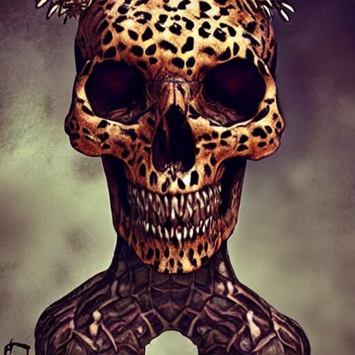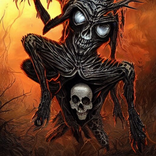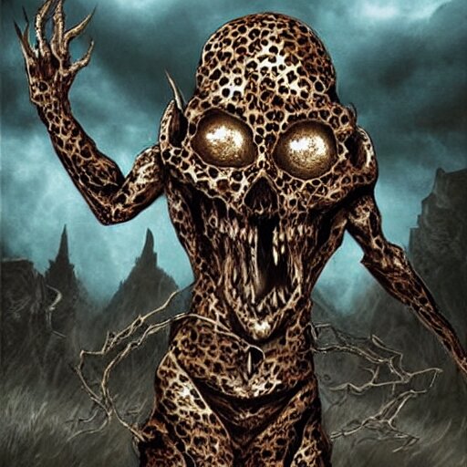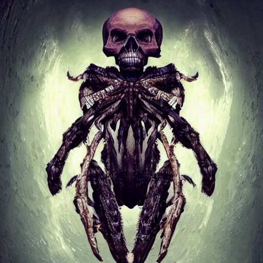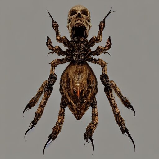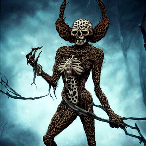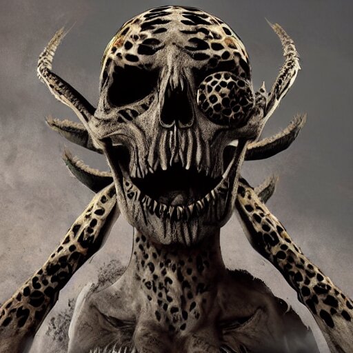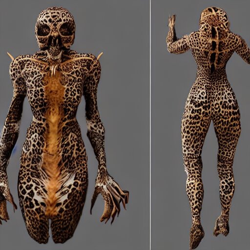 Skull that look too much like skull!, crypt lurker!!, grasp of darkness!!!, pitchburn devils, giant terrestrial starfish!!!!!, 8k cg character rendering of a spider-like hunting female on its back, fangs extended, wearing a leopard-patterned dress, set against a white background, with textured hair and skin.