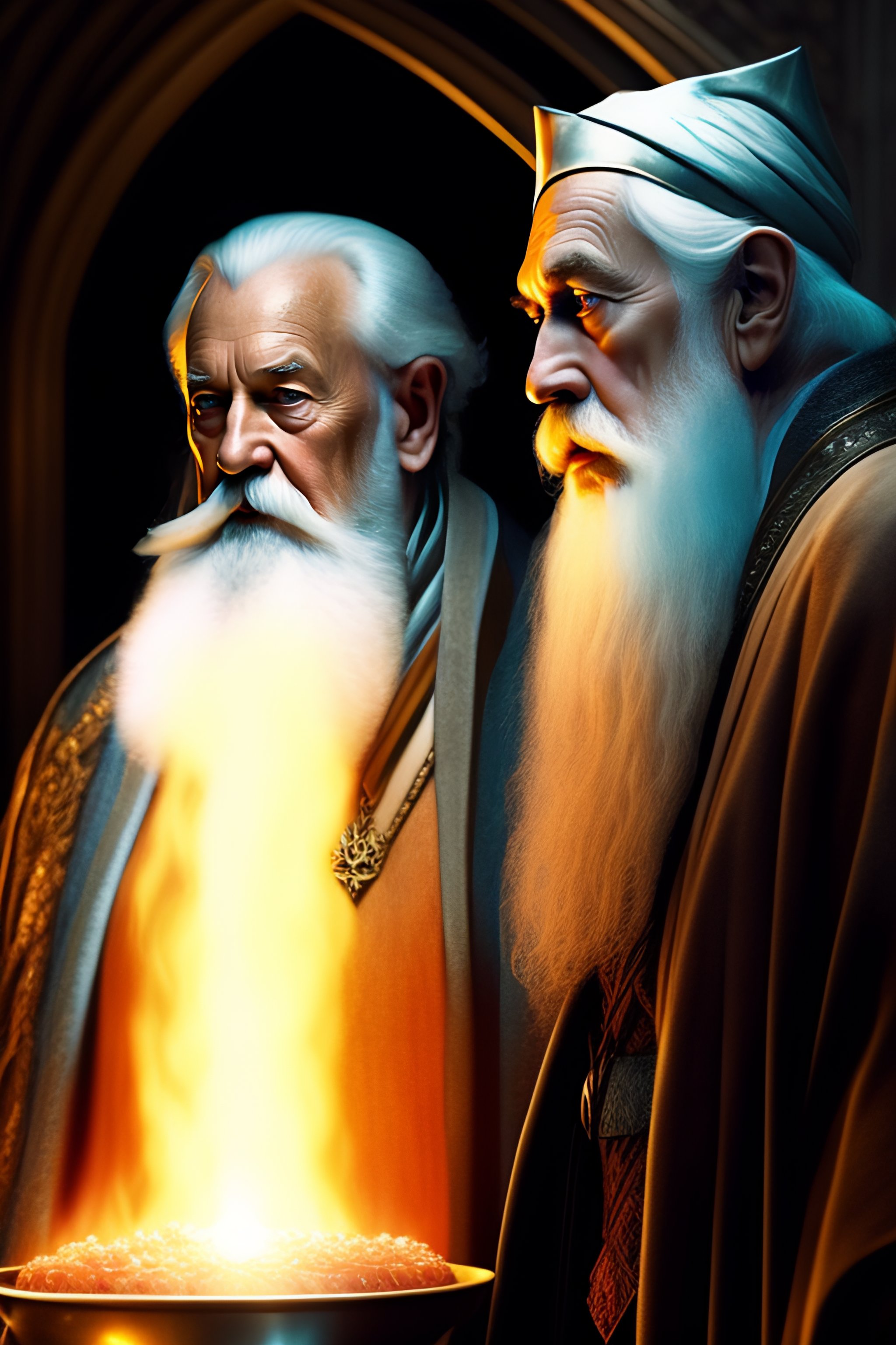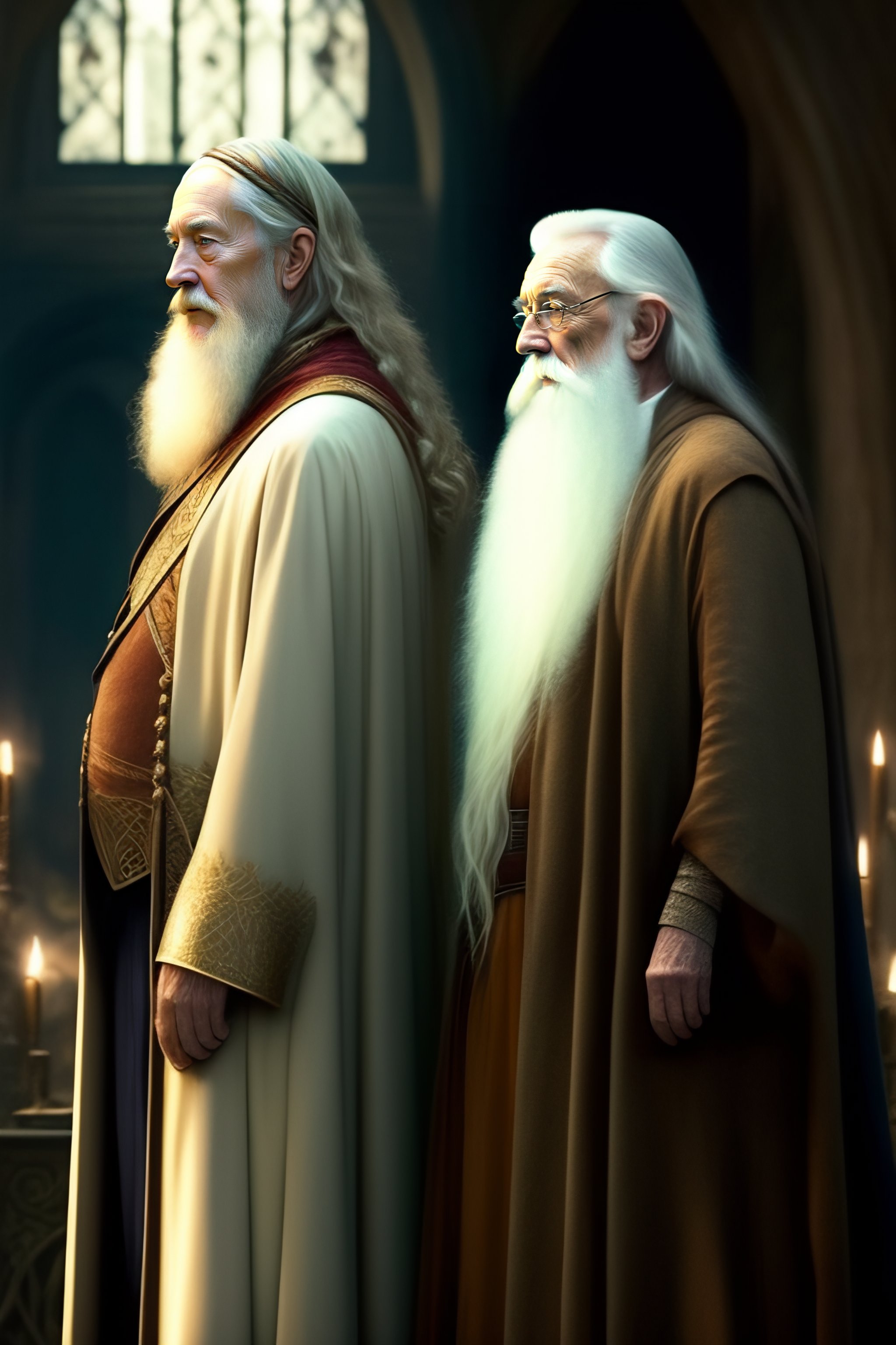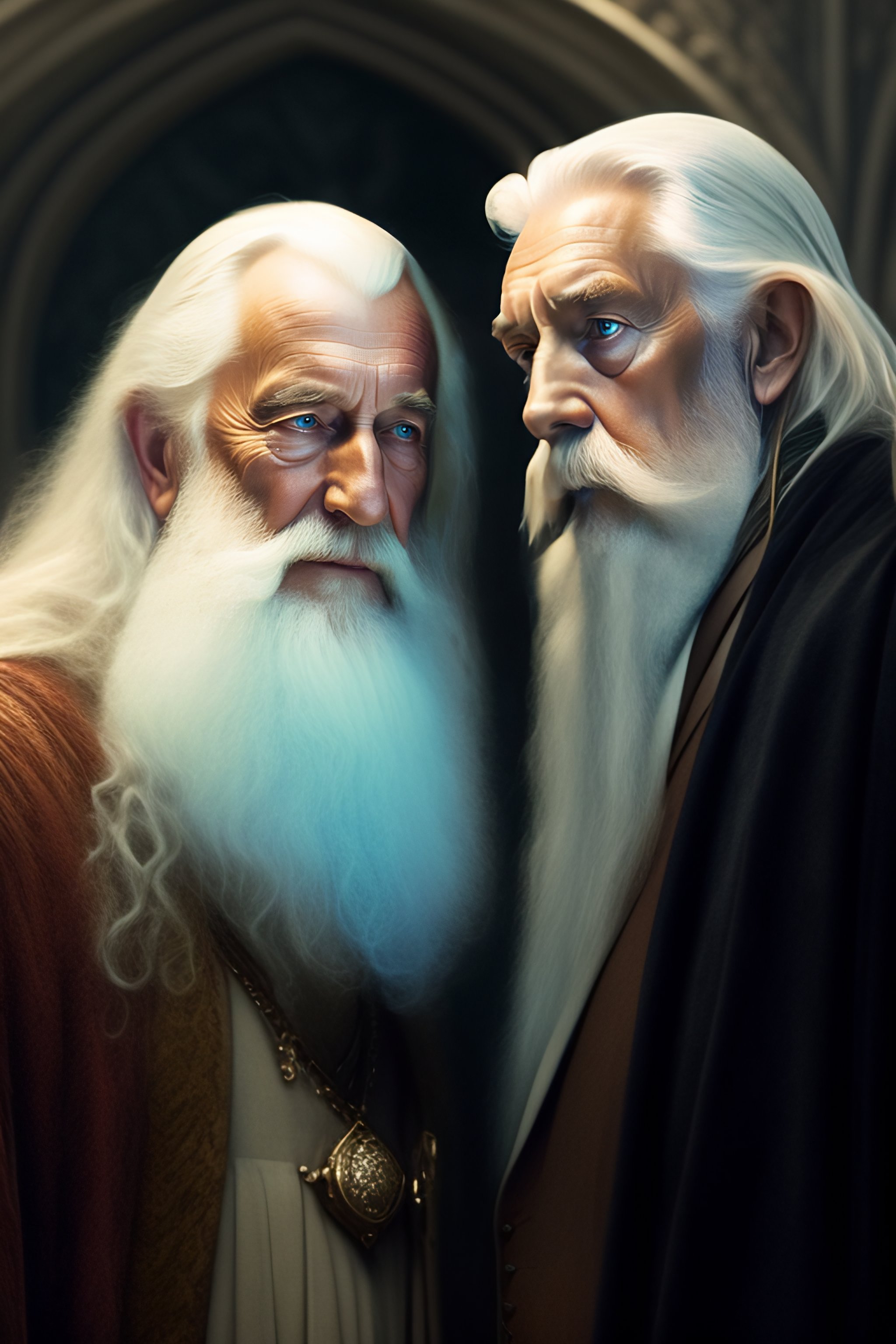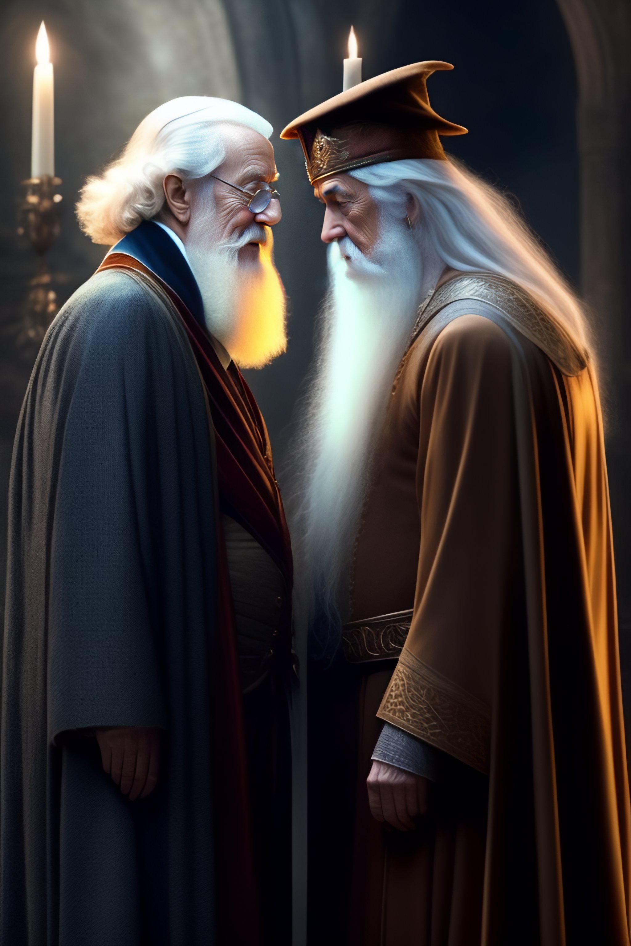 Dumbledore and gandalf standing front to each other, little smiles on their faces, like greeting an old friend, they are preparing to embrace each other with open arms