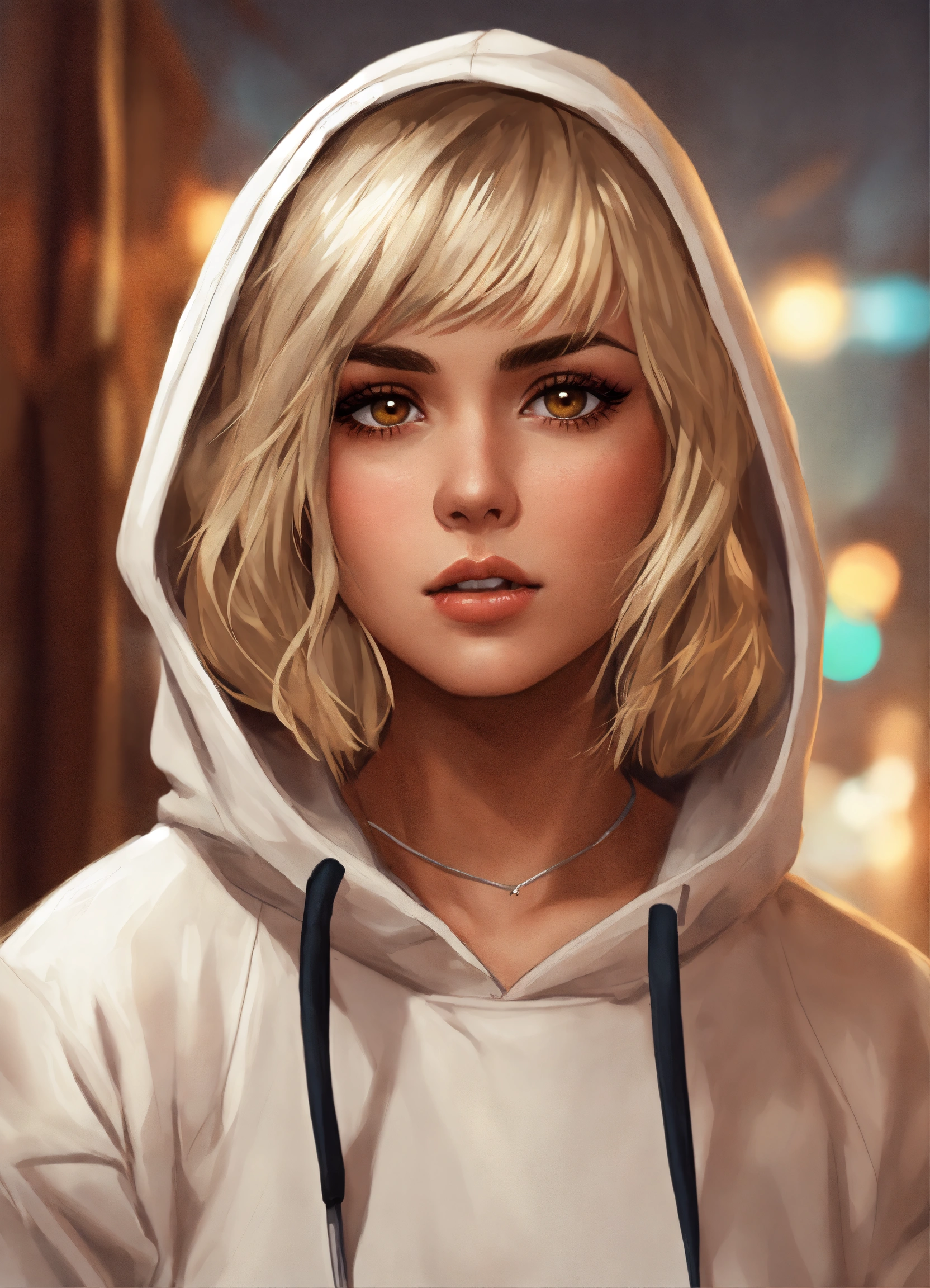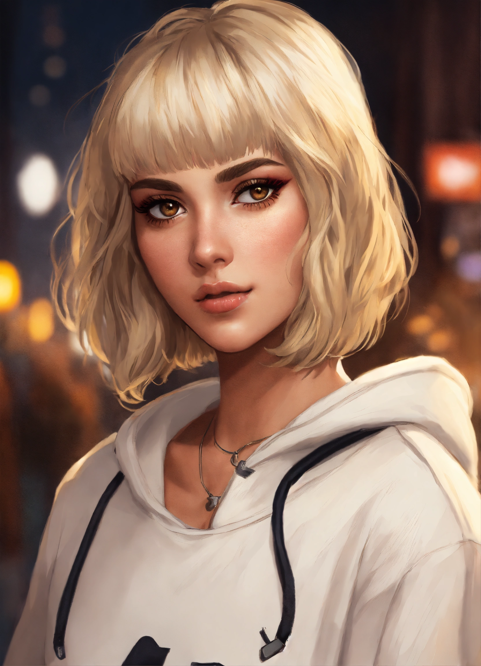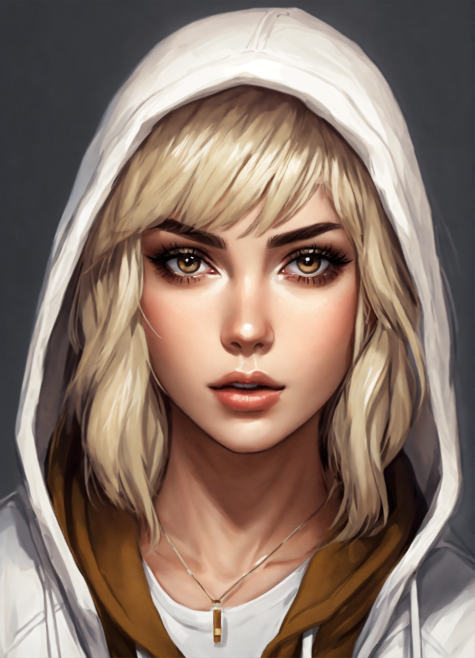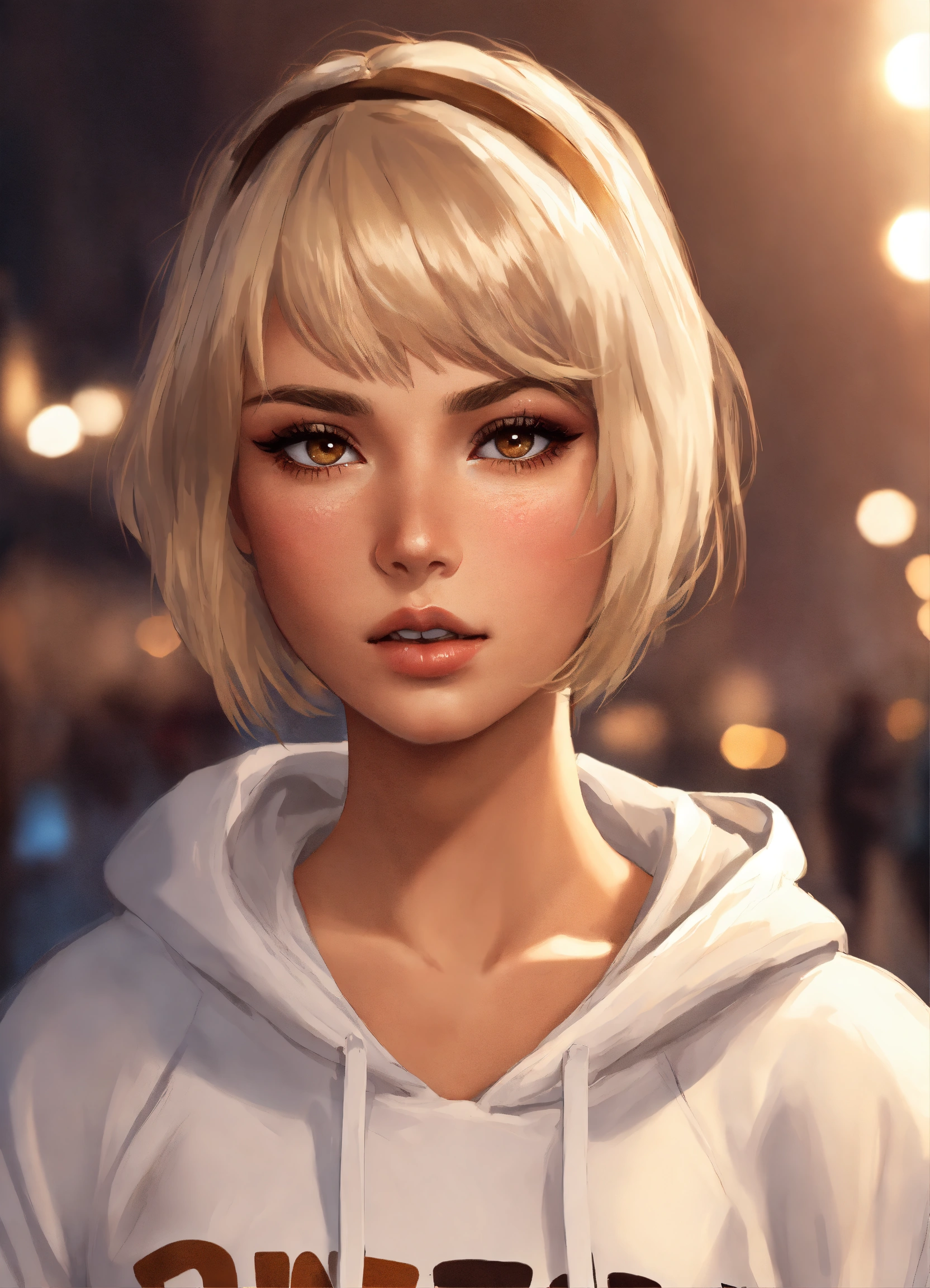 Cute white female, short dirty blonde hair with bangs, brown eyes, heavy eyeliner, makeup, white hoodie, realistic cartoon