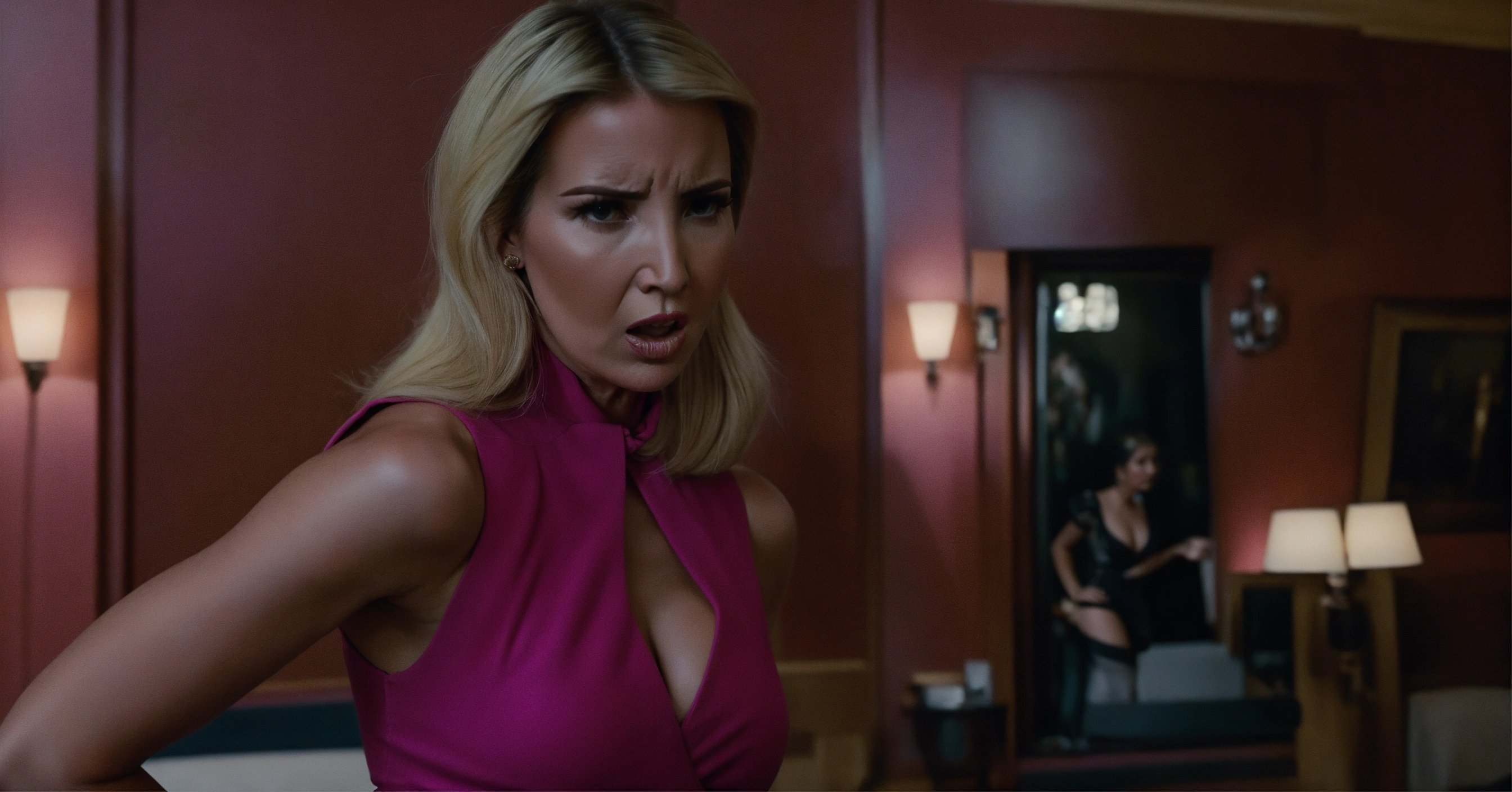 Full body 8k wide angle image of angry ivanka trump wearing a sleeveless dark pink wrap over mini dress with pink gogo boots standing angrily in an room, hands on her hips, front view picture, angry, standing angrily with hands on hips