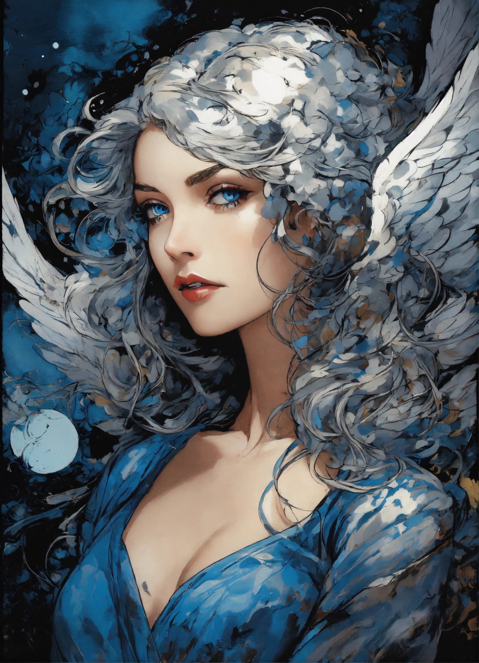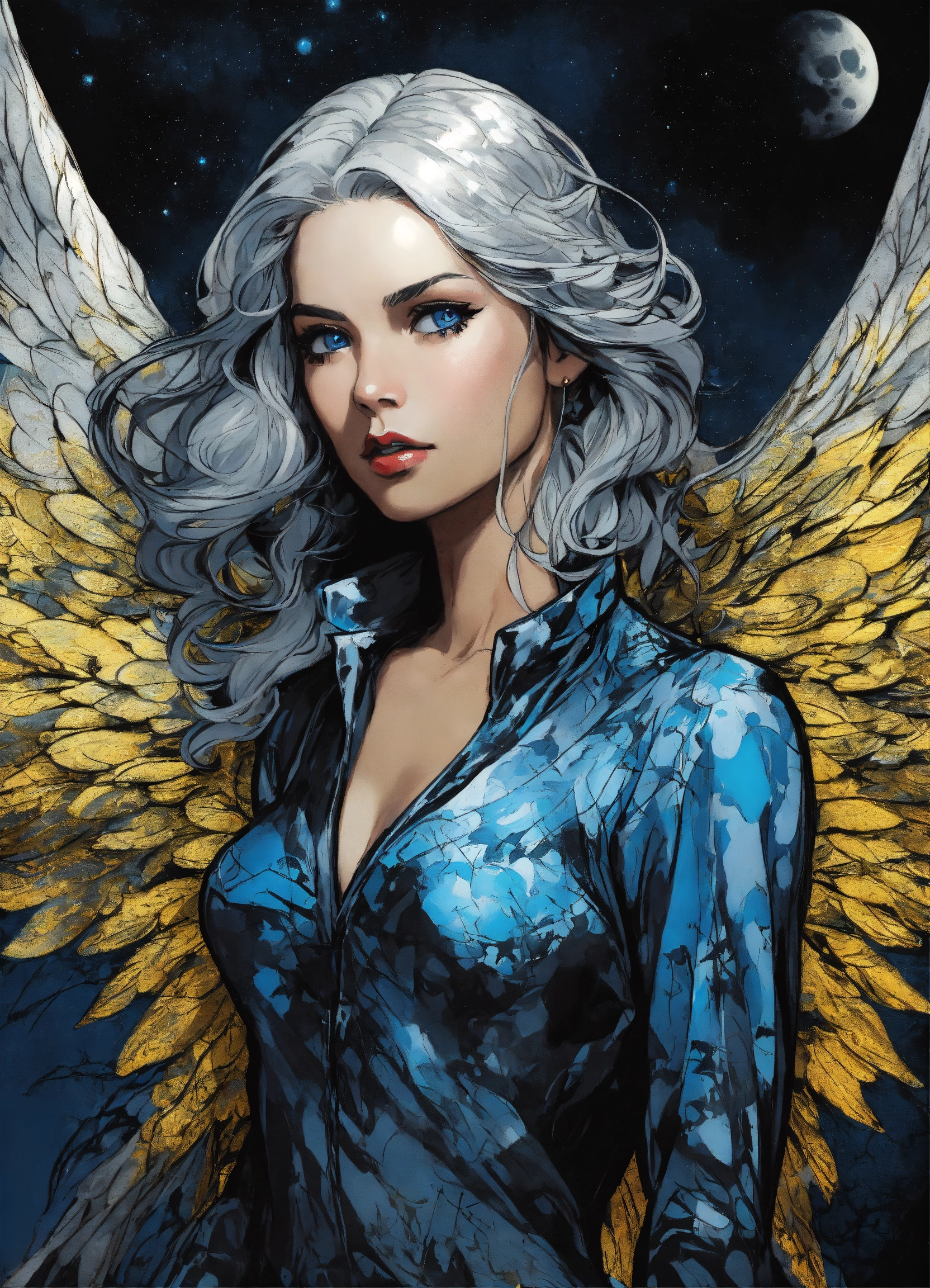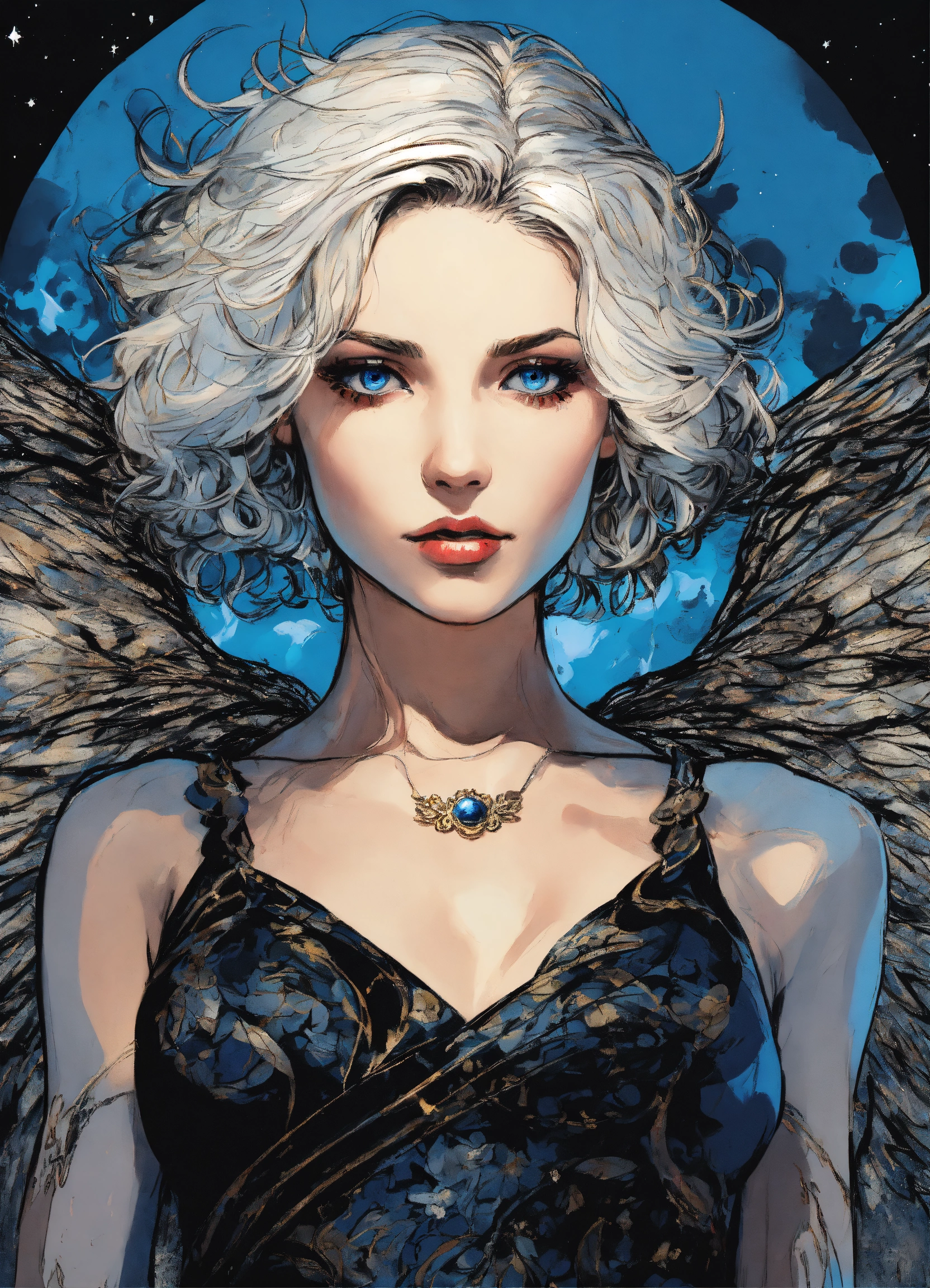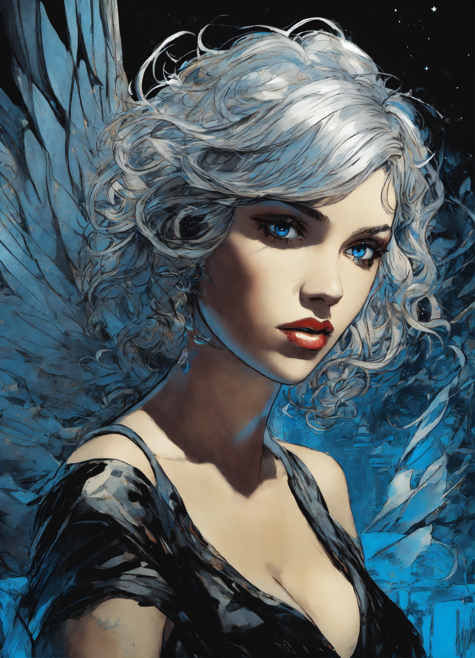 Pop art, mysterious beautiful silver-haired female angel, blue eyes, black dress, fantasy, concept art, sharp focus, intricate, highly detailed, smooth, moonlight, art by jackson pollock, comic book art style
