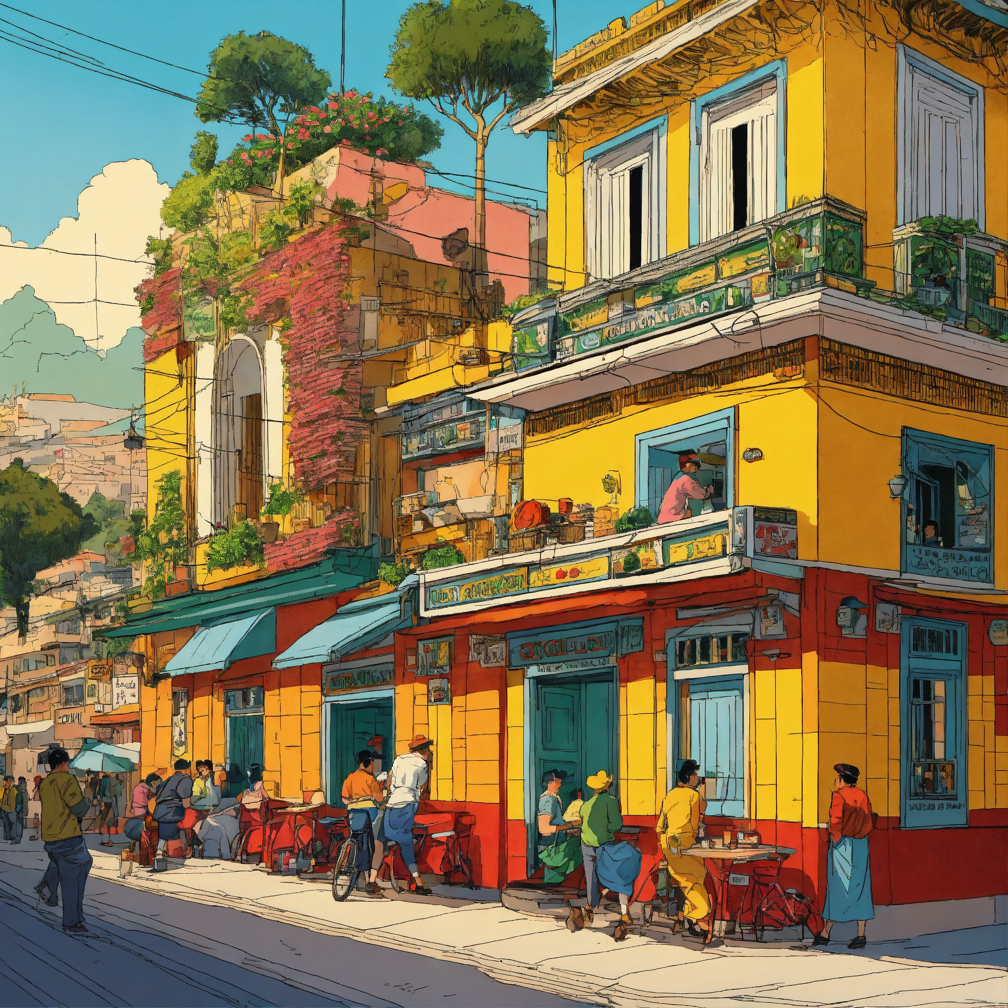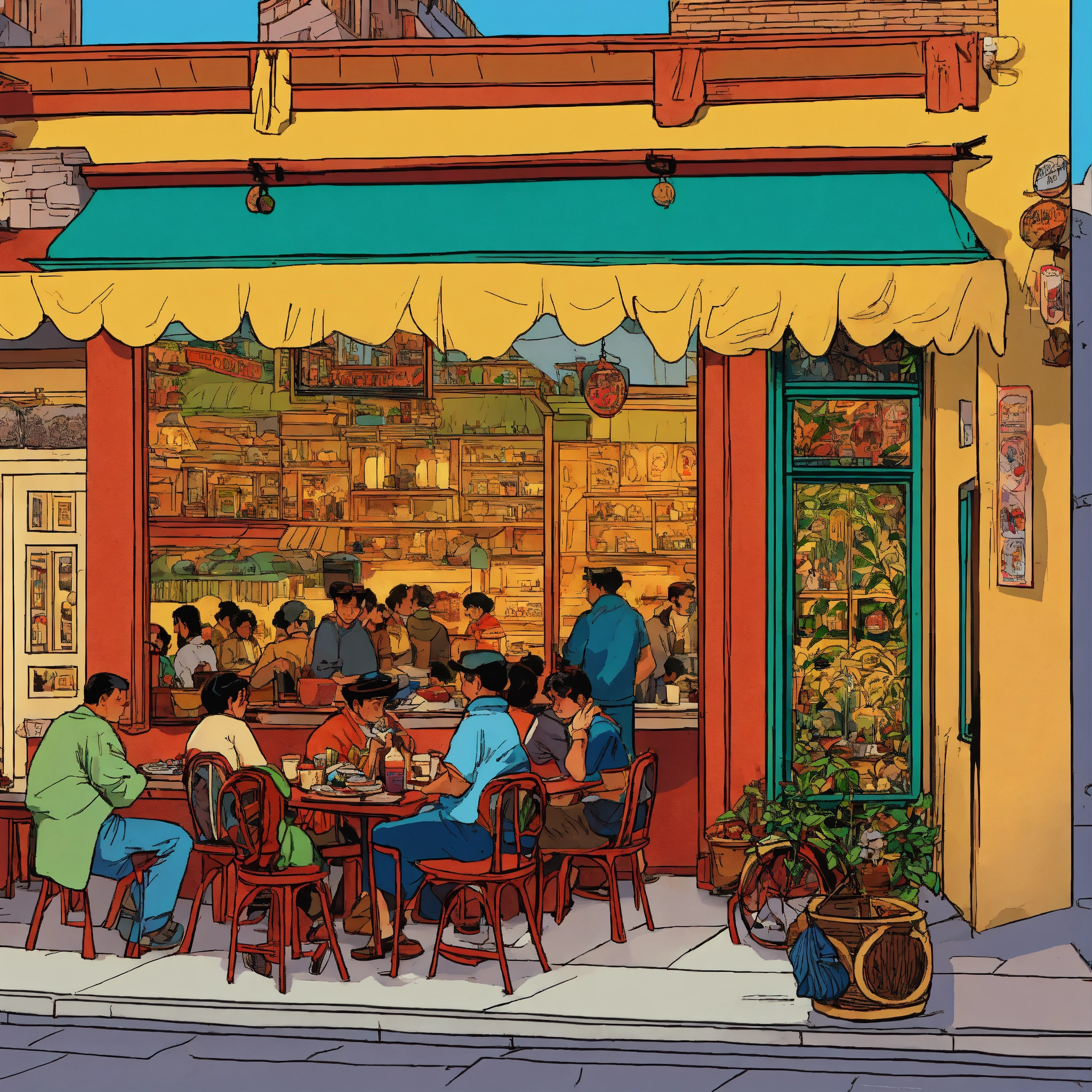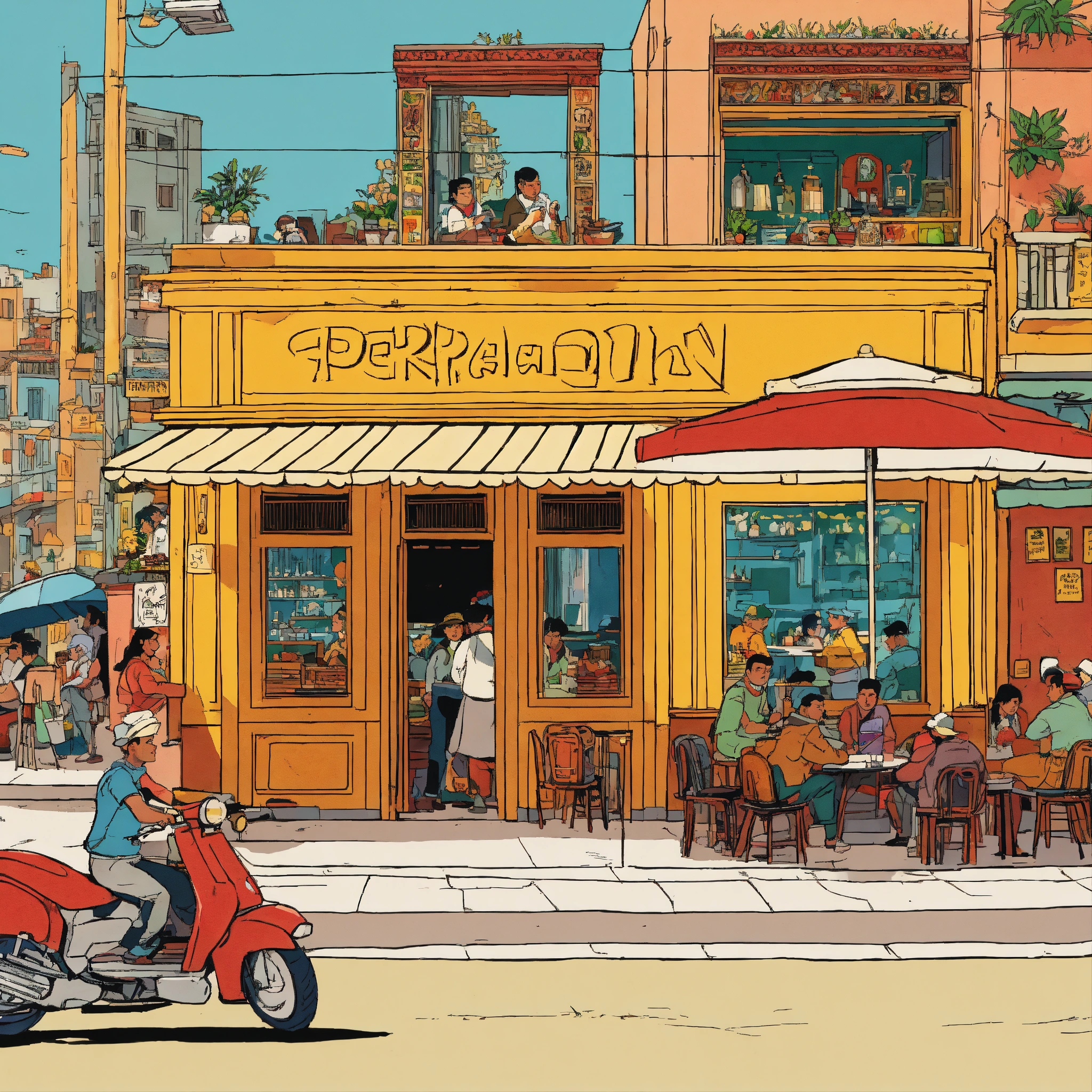 Detailed, vibrant illustration of a peruvian restaurant in lima, motos, by herge, in the style of tin-tin comics, vibrant colors, detailed, lots of people, morning light, beautiful illustration, 1024x1024