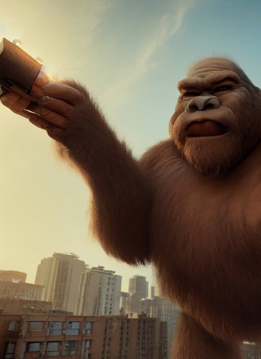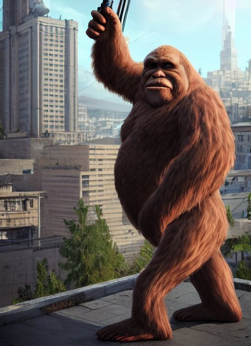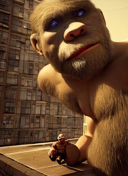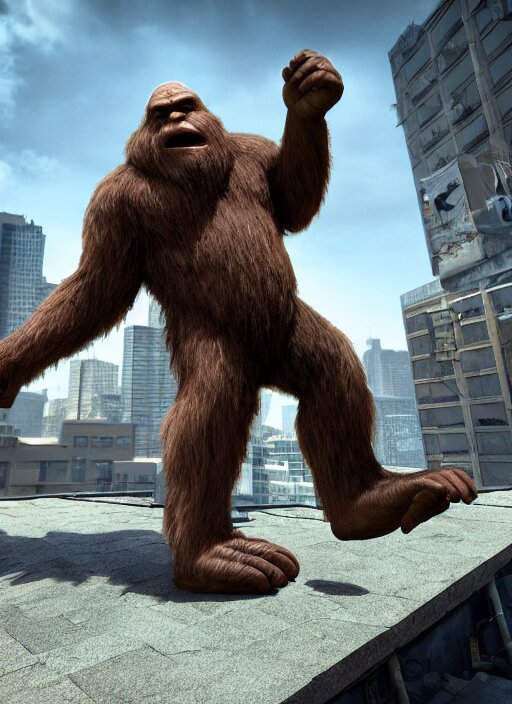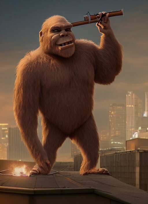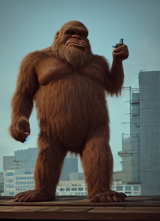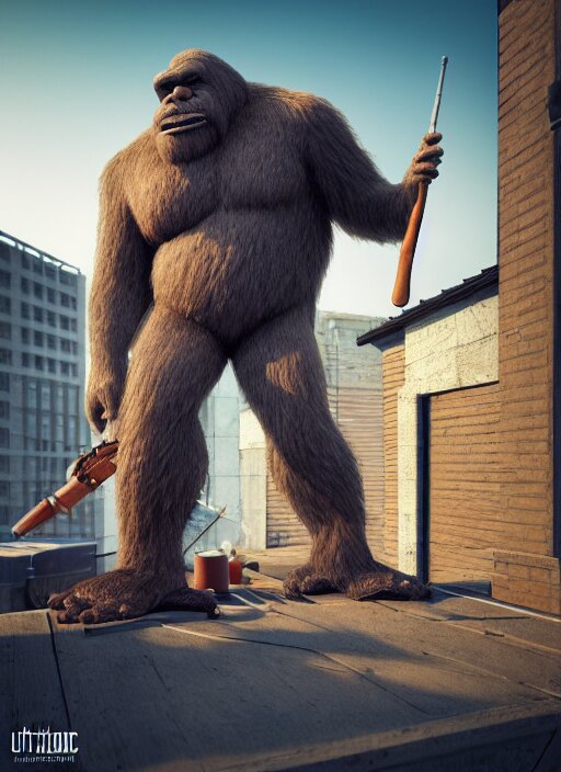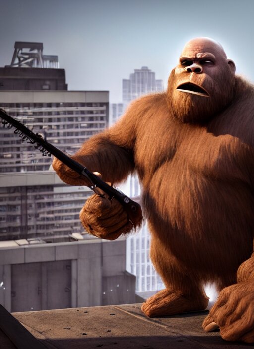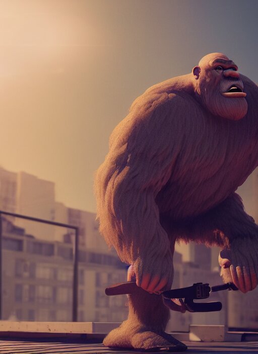 Old bald midget bigfoot playing harph on the rooftop, music, instrument, rpg style, dnd style, ultra detailed, trending on artstation, concept art, octane render, unreal engine