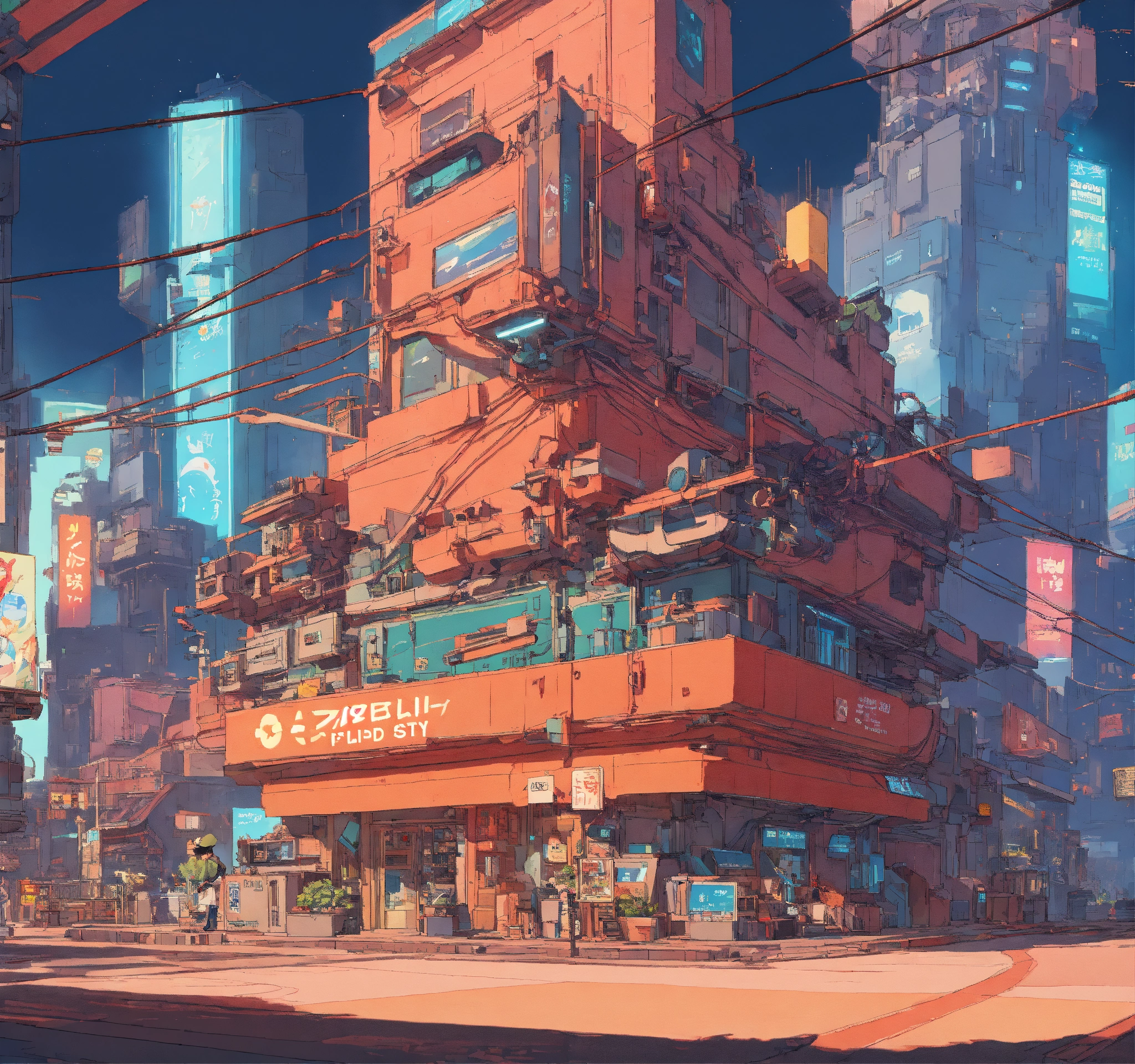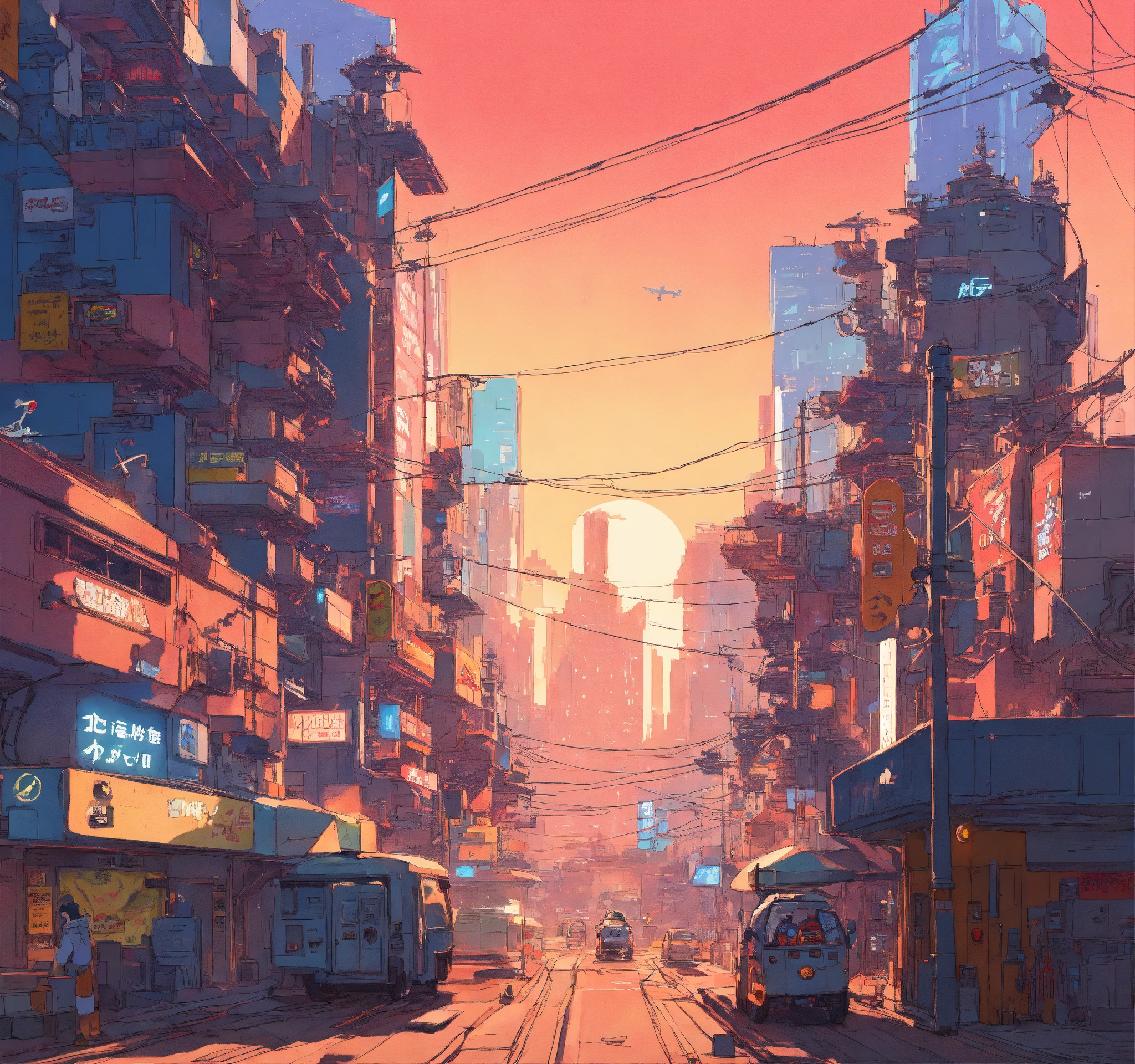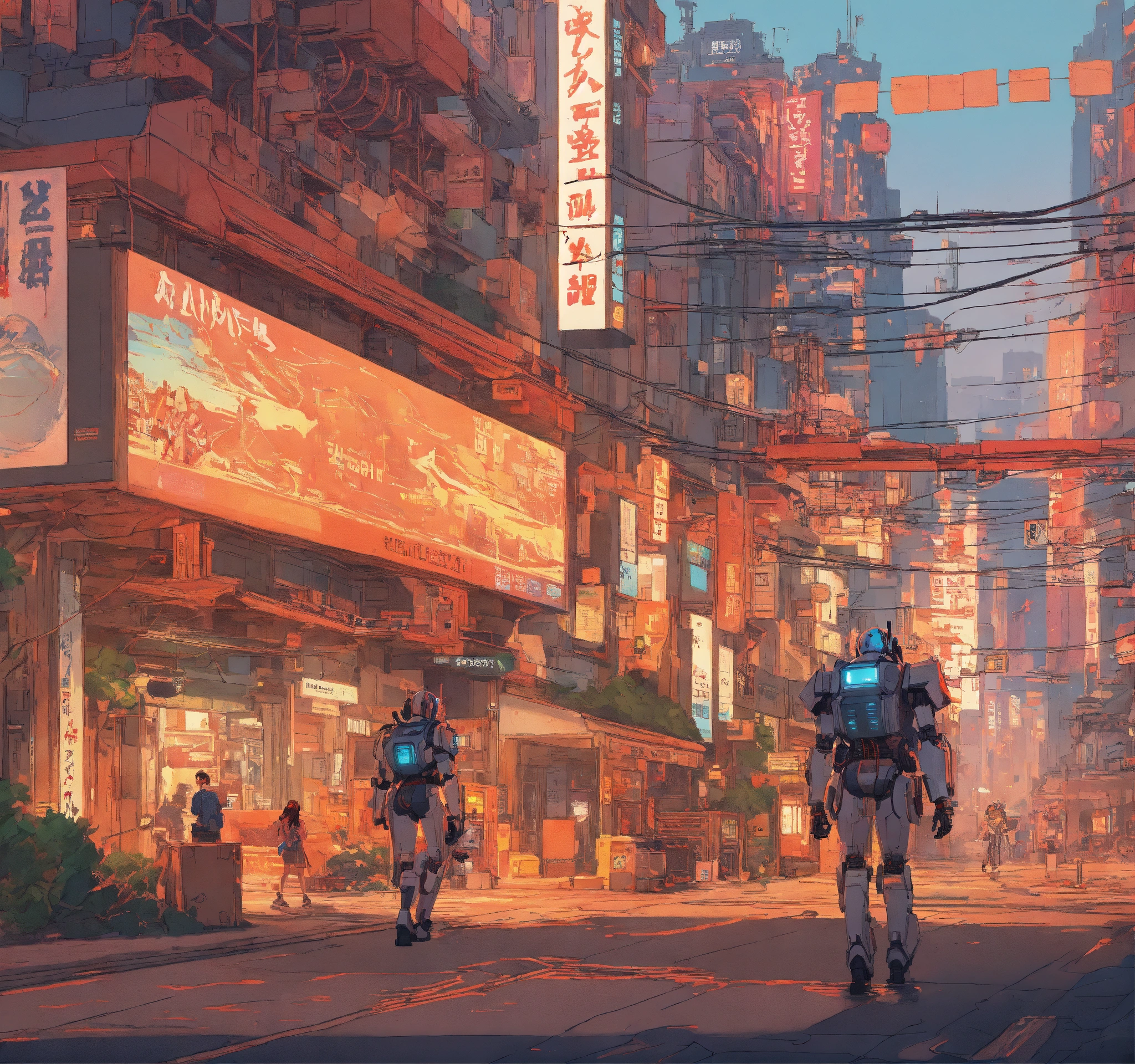 Photo of a sci-fi action, robot city, lots of cables, style of laurie greasley, studio ghibli, akira toriyama, james gilleard, genshin impact, trending pixiv fanbox, acrylic palette knife, 4k, vibrant colors, devinart, trending on artstation, low details