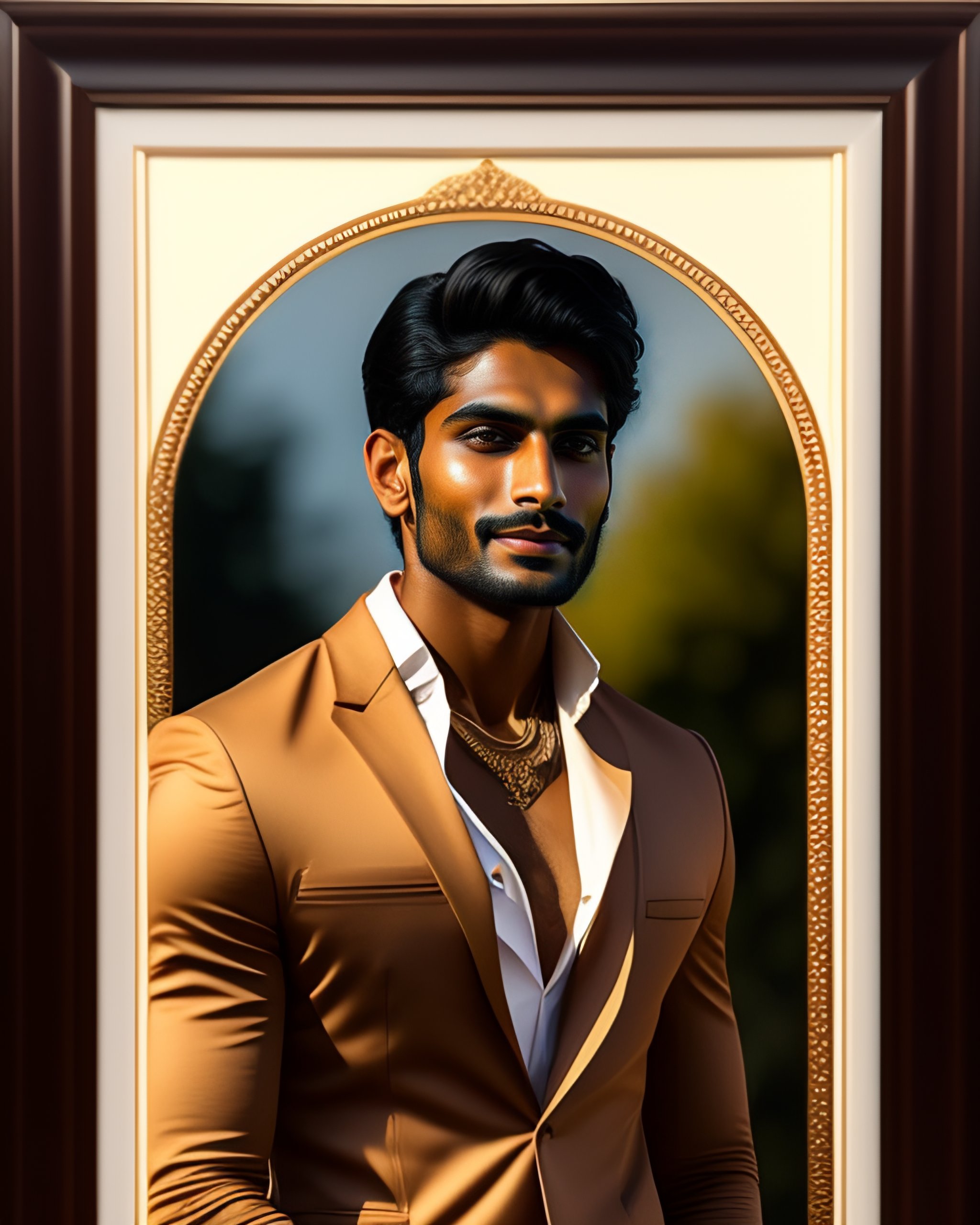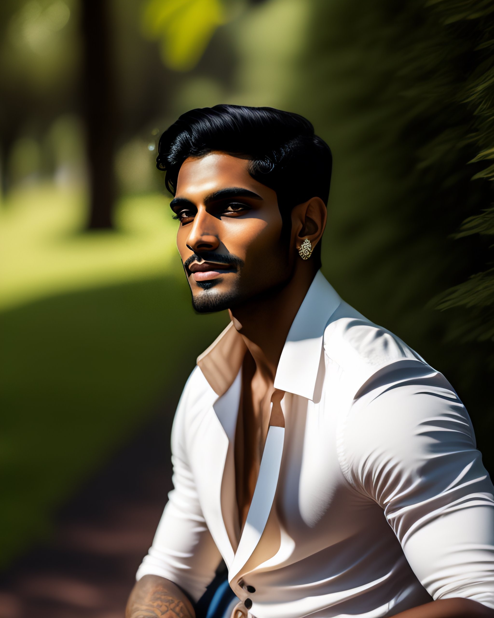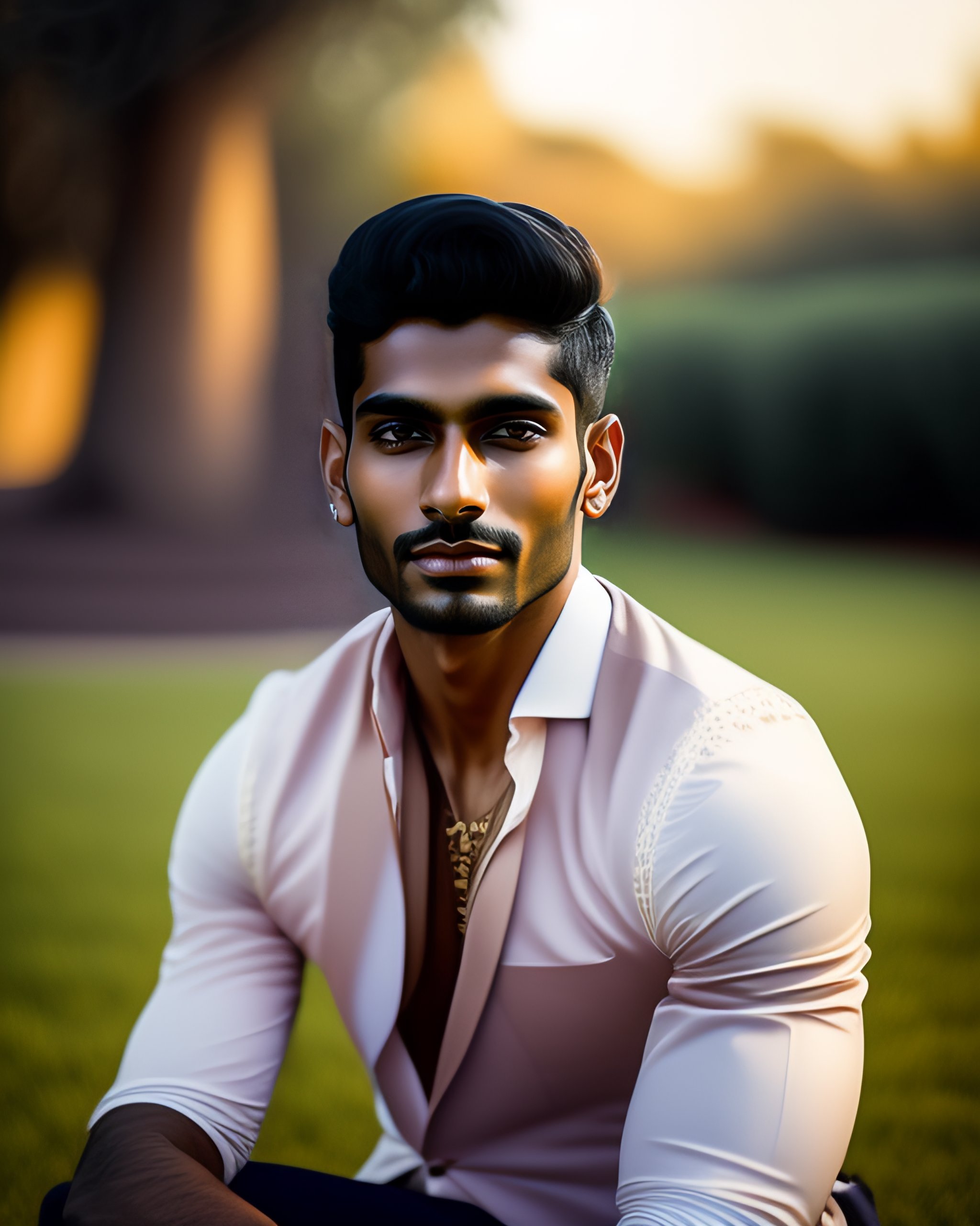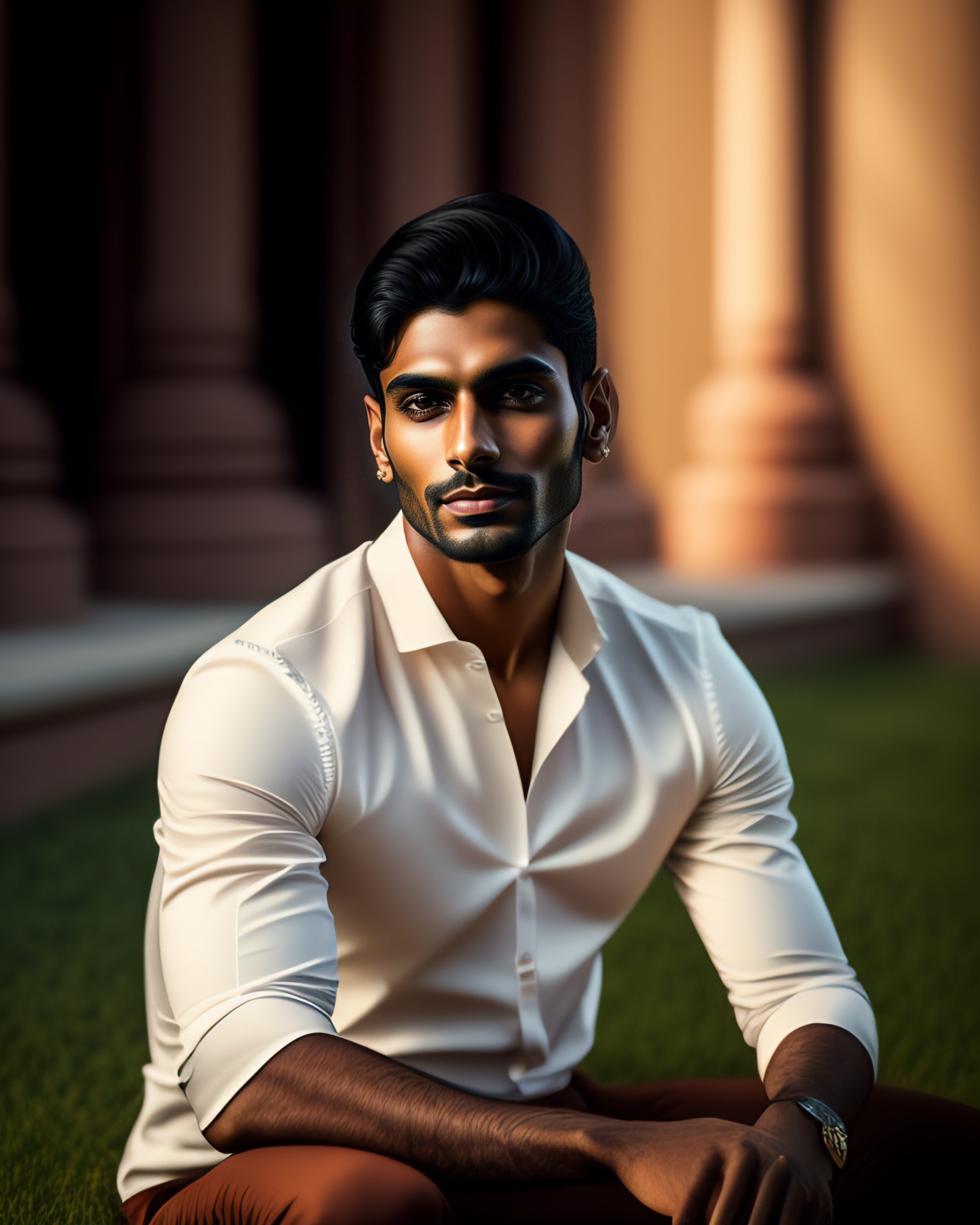 A young slim indian man with smooth brown skin wearing a shirt and an elegant scarf sat on the grass posing for a picture at daytime, yard background, beautiful portrait, intricate frame, tender depiction, detailed, sharp focus, clear lighting, joyful, classical oil painting