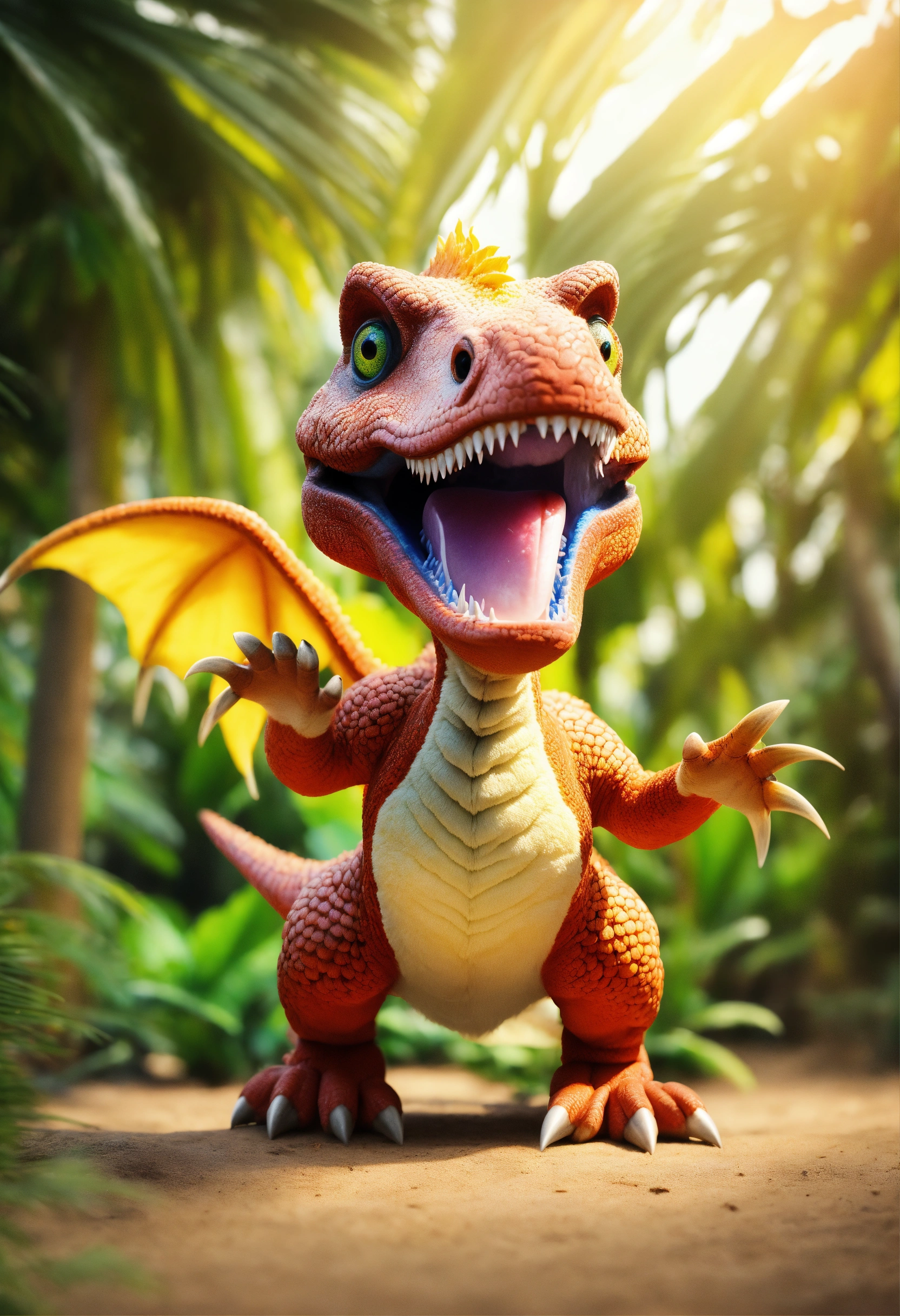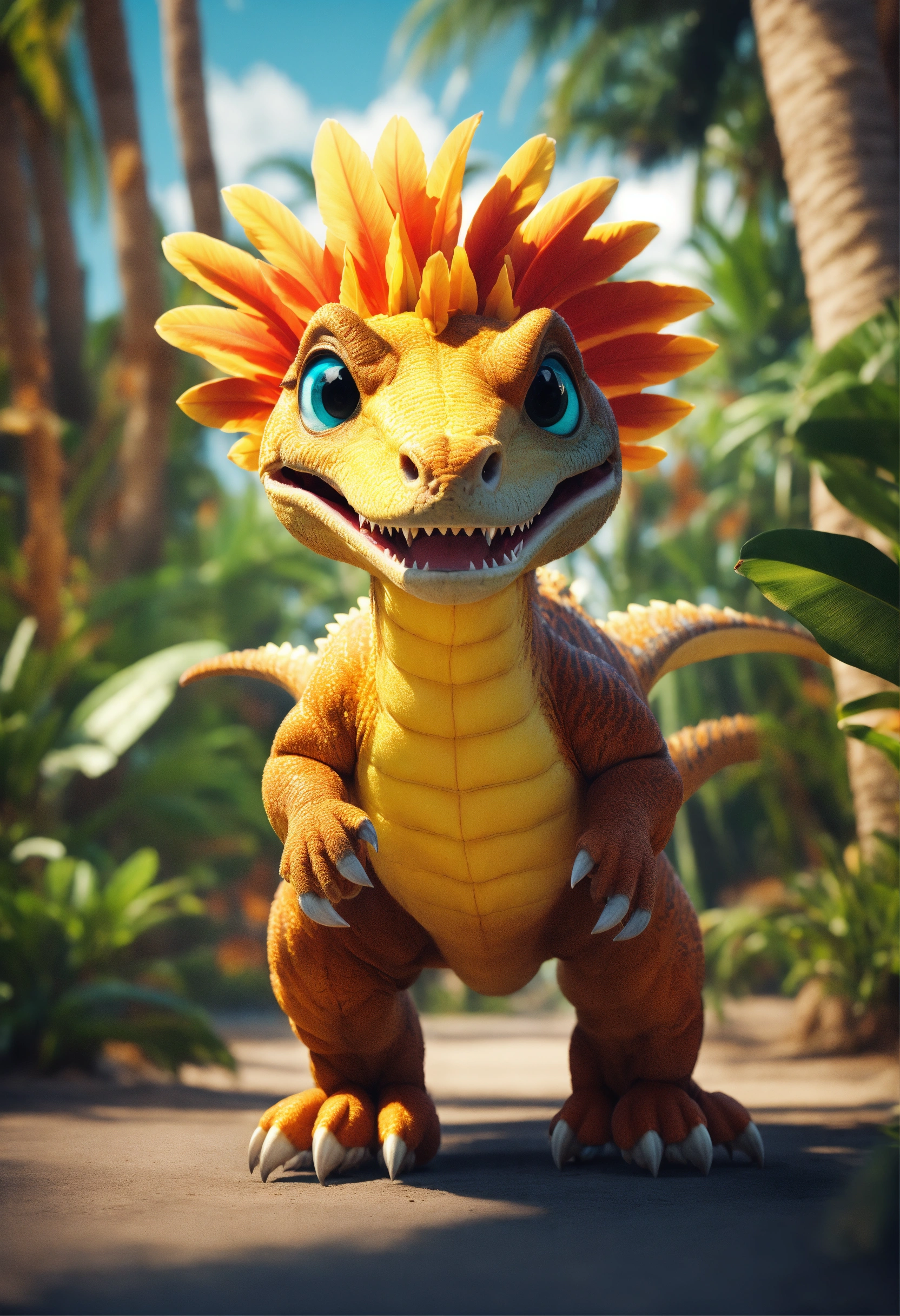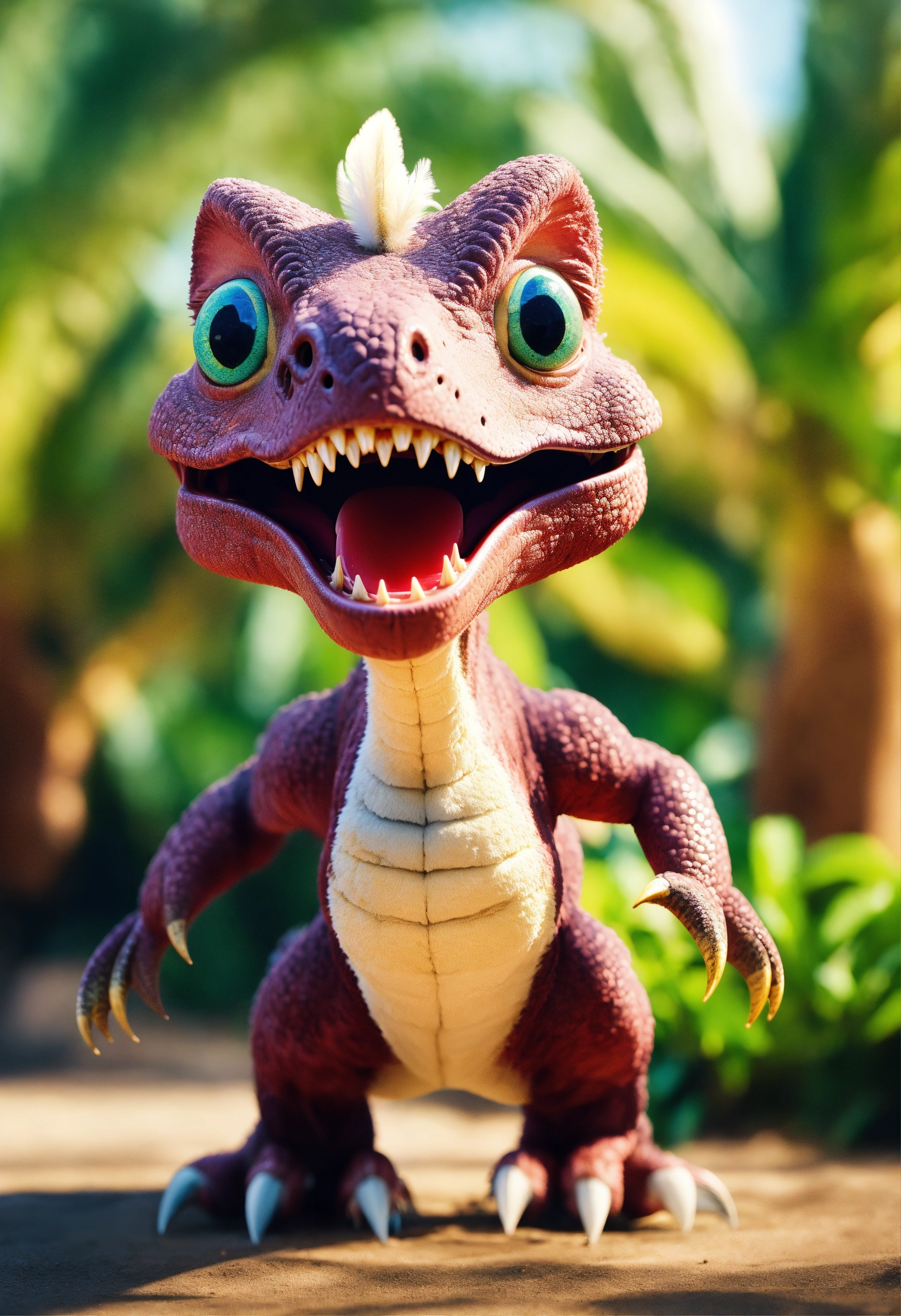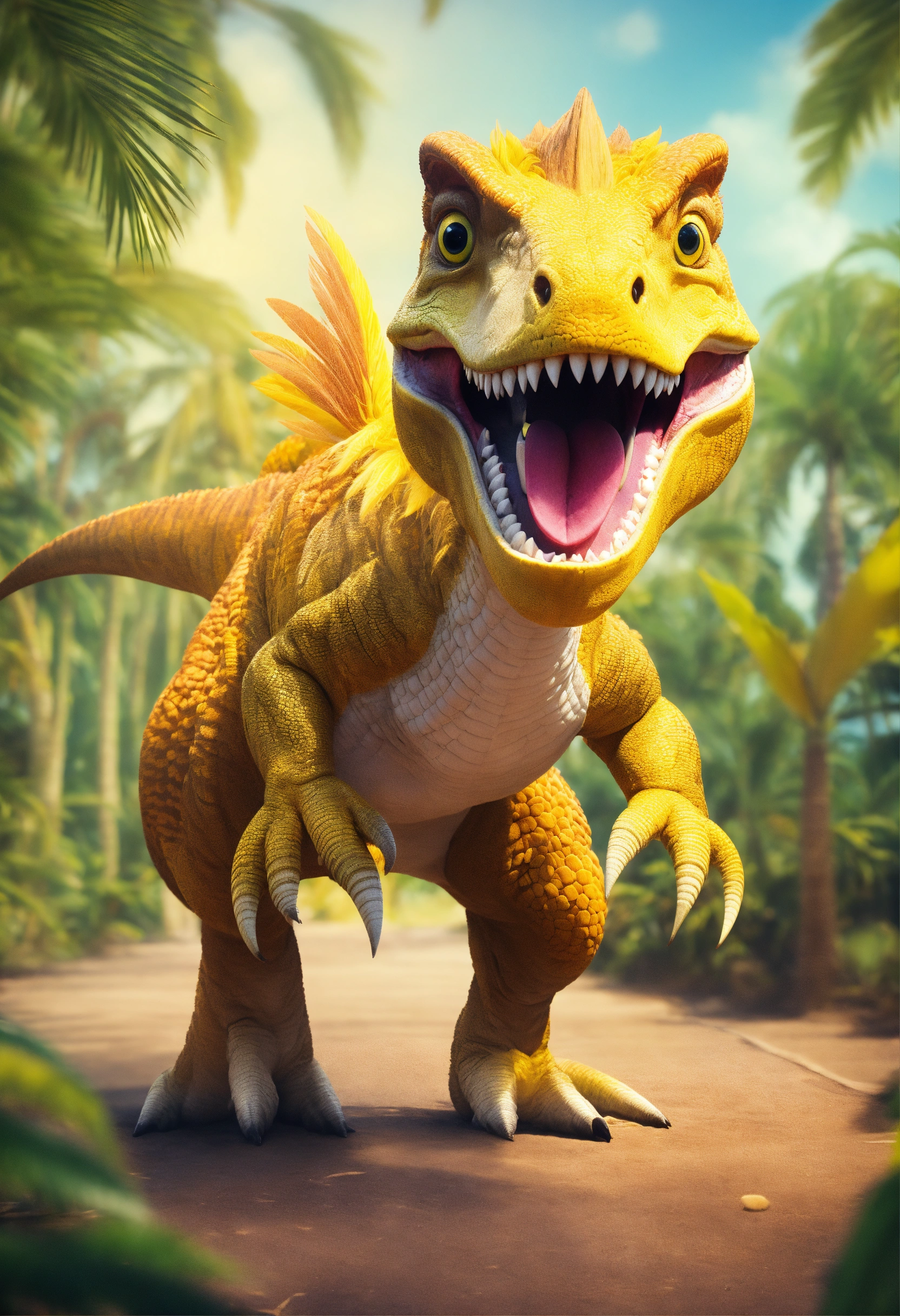 An adorable and fluffy tyrannosaur dinosaur with big color eyes and big and huge ears, in action and moveing modus, big and huge head, look cool and little angry, with soft feathers and wings, tropical island, multicolor skin with stripes, tusks, smiling and happy, sunny, palm trees, banana plant, with blur background, high quality, 8k