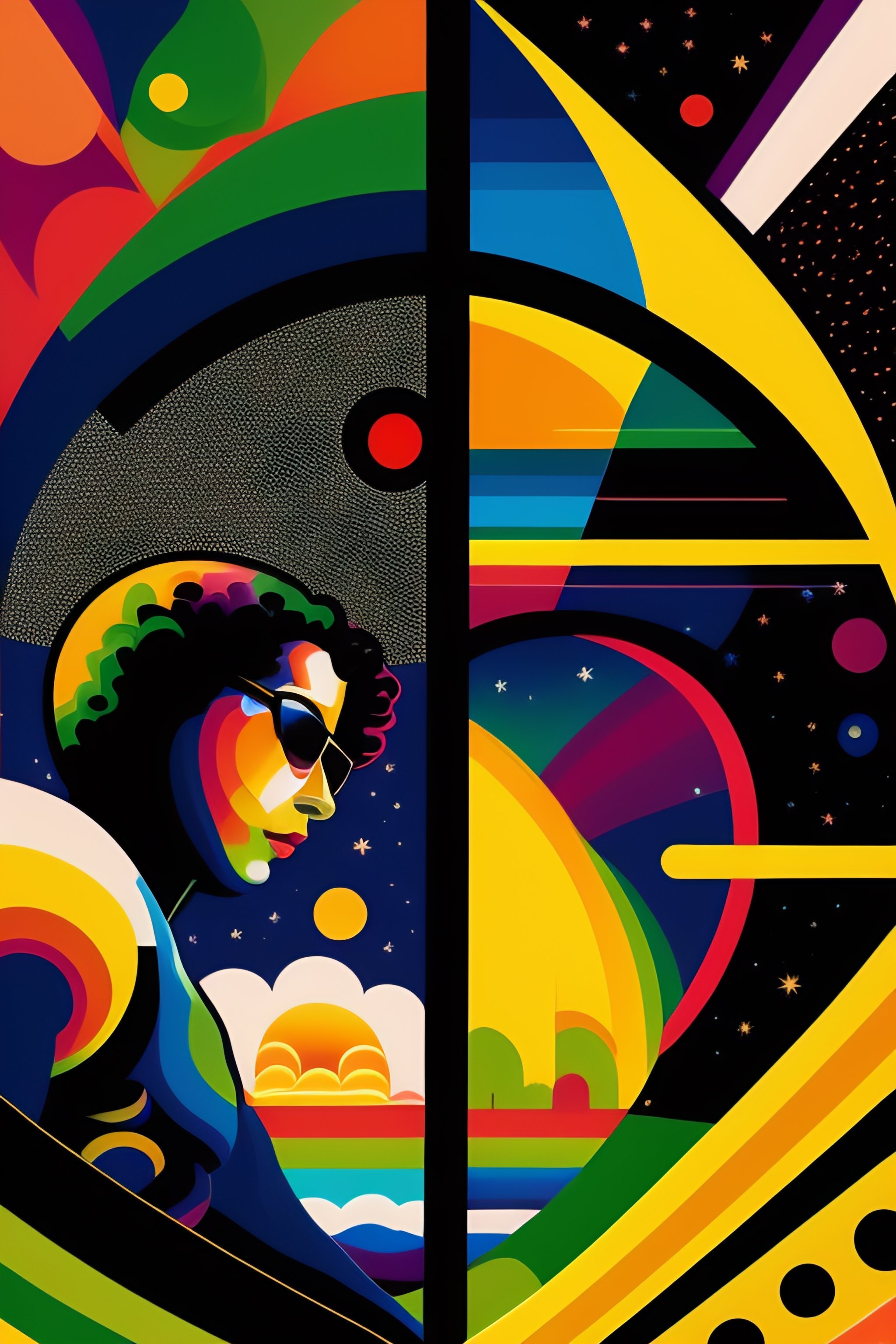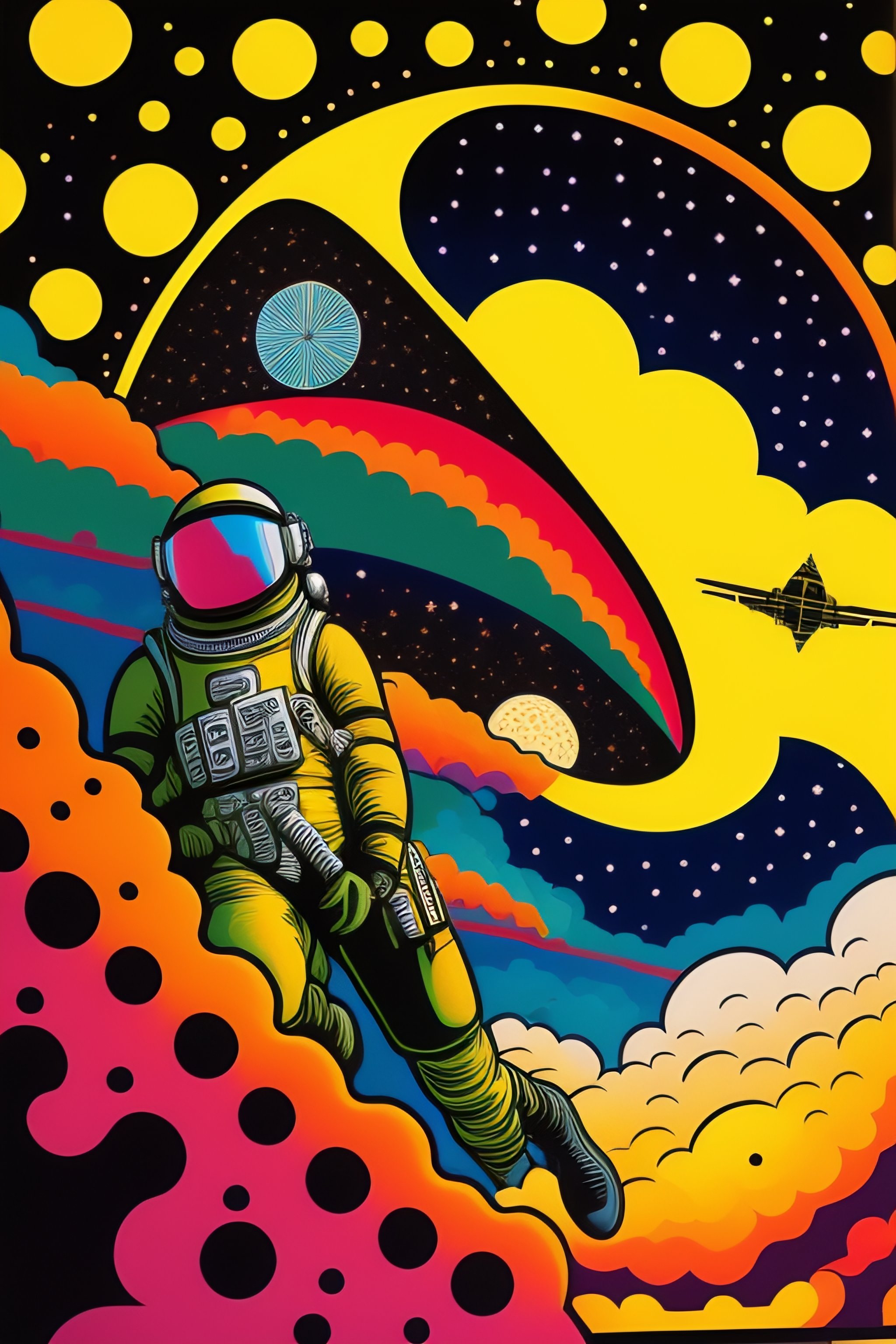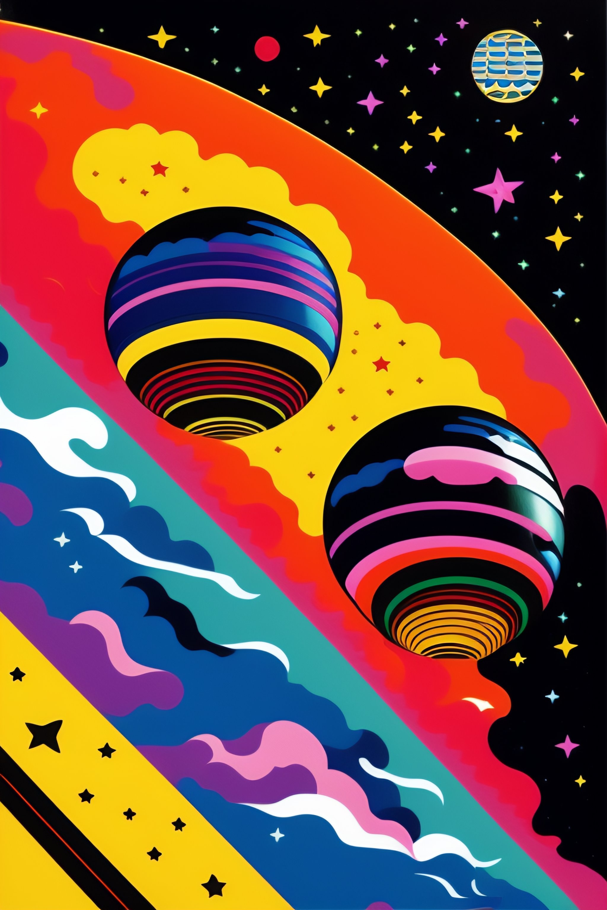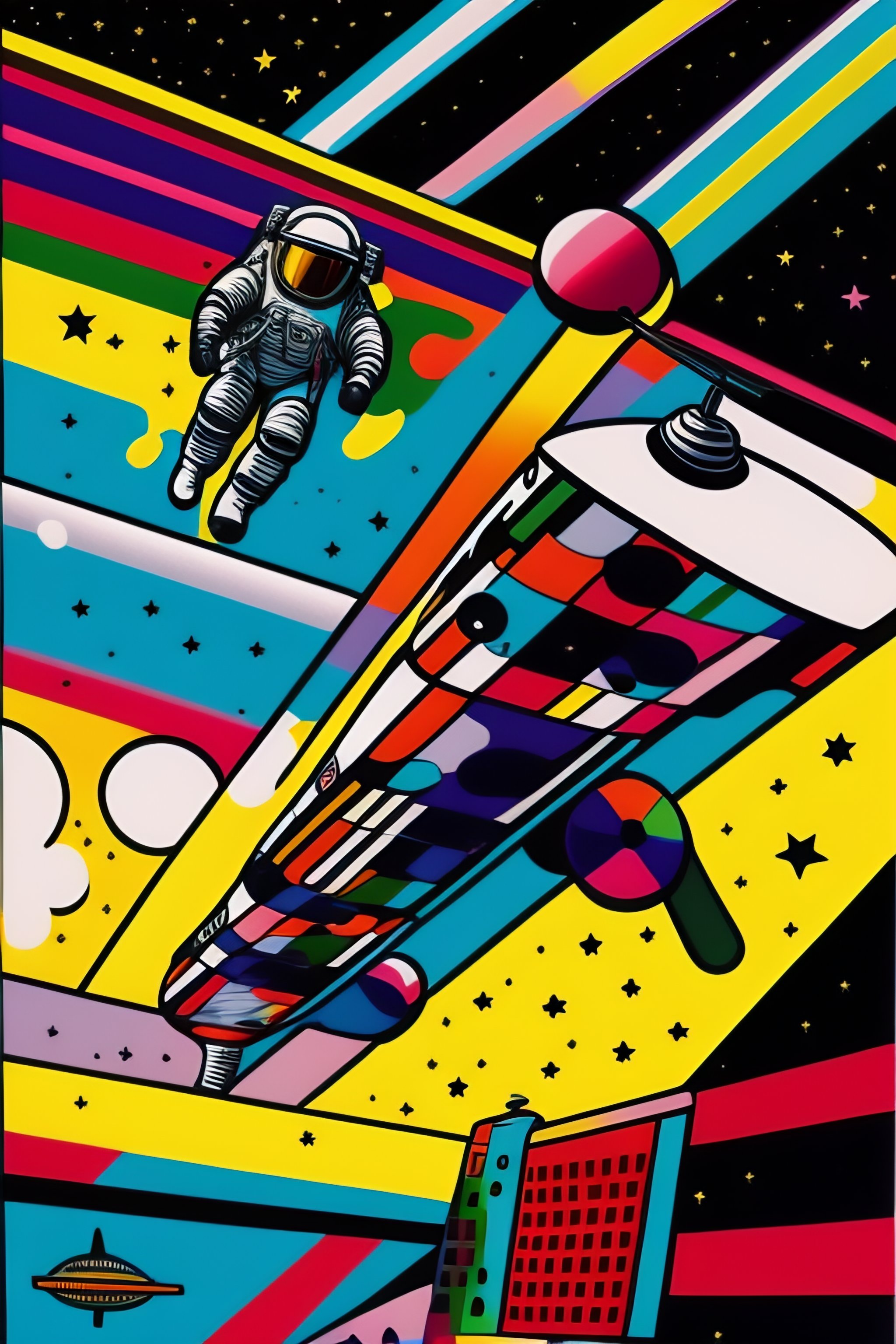 Two astronauts wearing romero britto clothes falling from the sky, down below with the perspective of the earth:: 1980s::1.4 backlight::1 eugene delacroix::1 carbon fiber::1