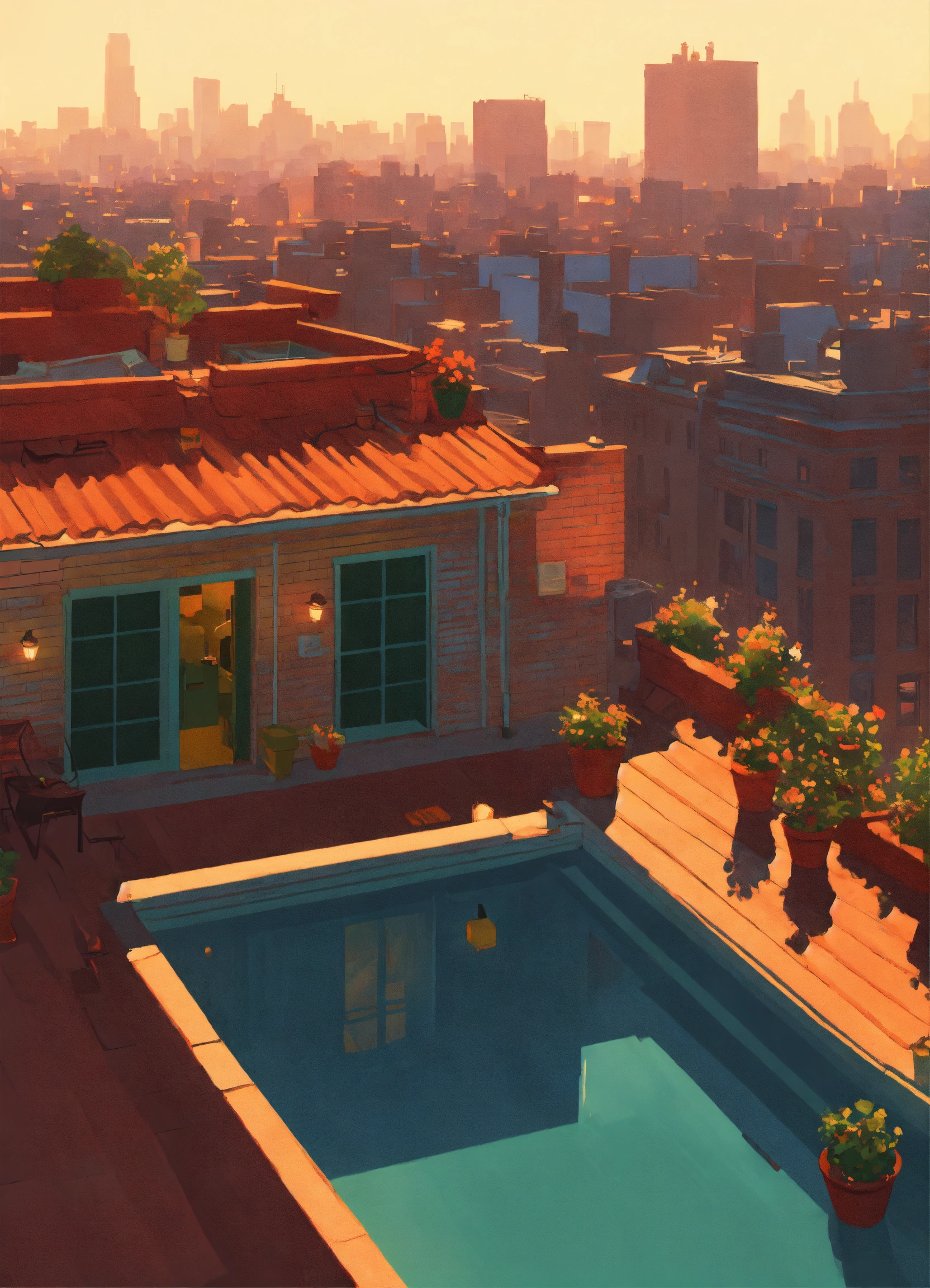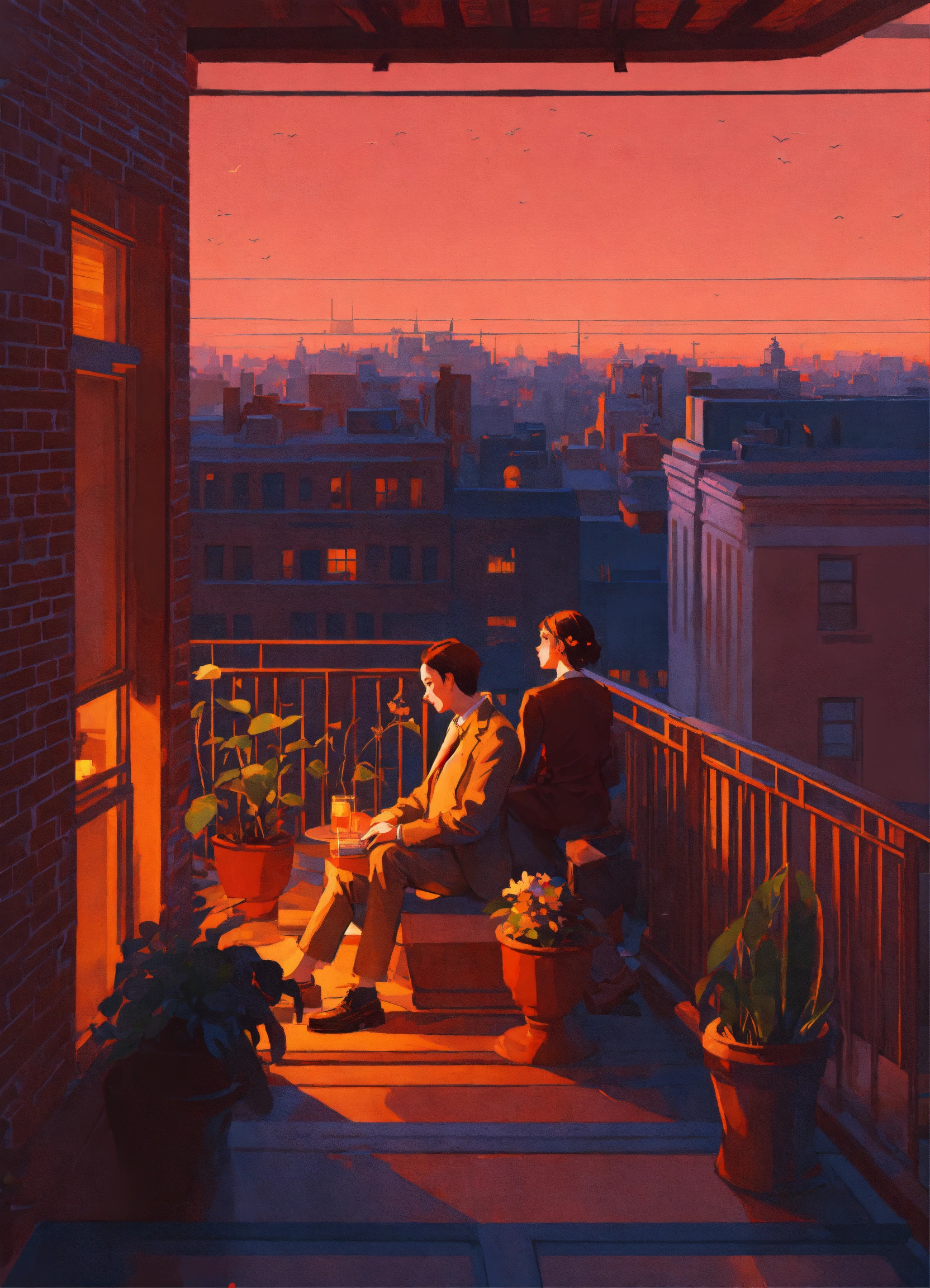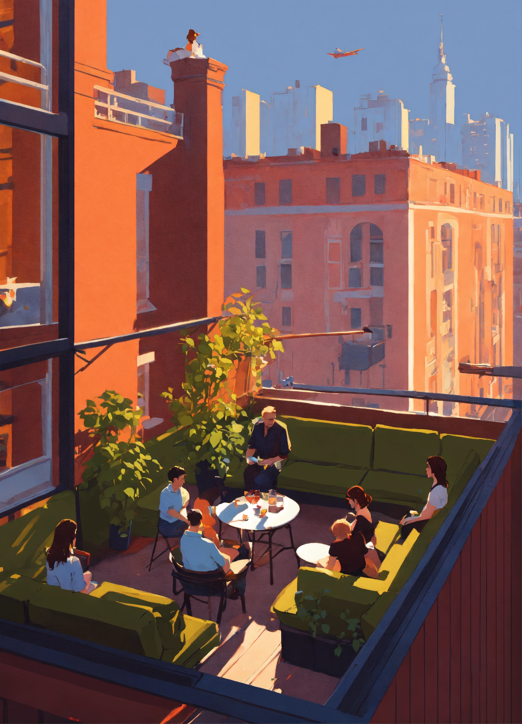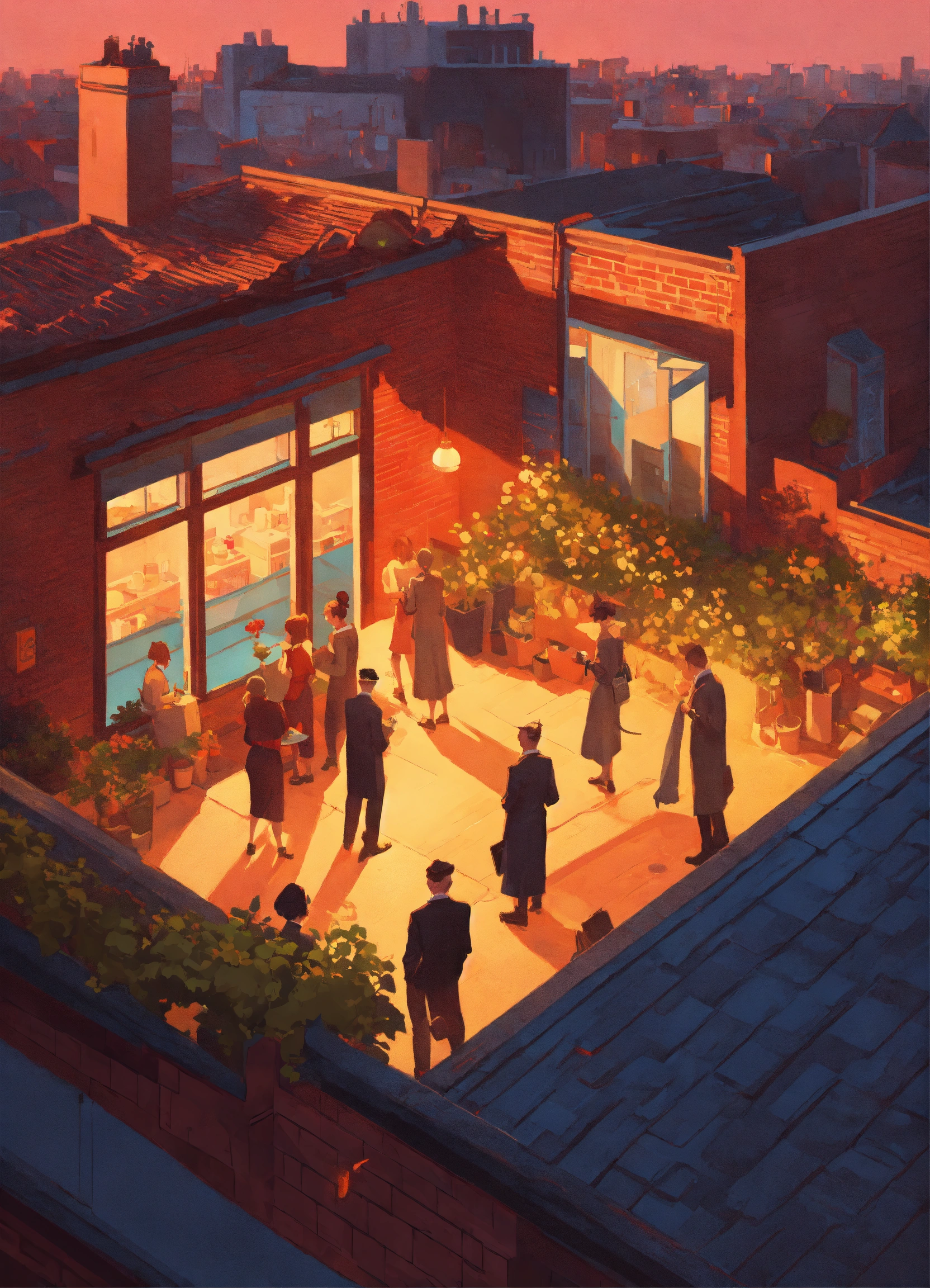 A rooftop gathering illustration by atey ghailan and escher and edward hopper