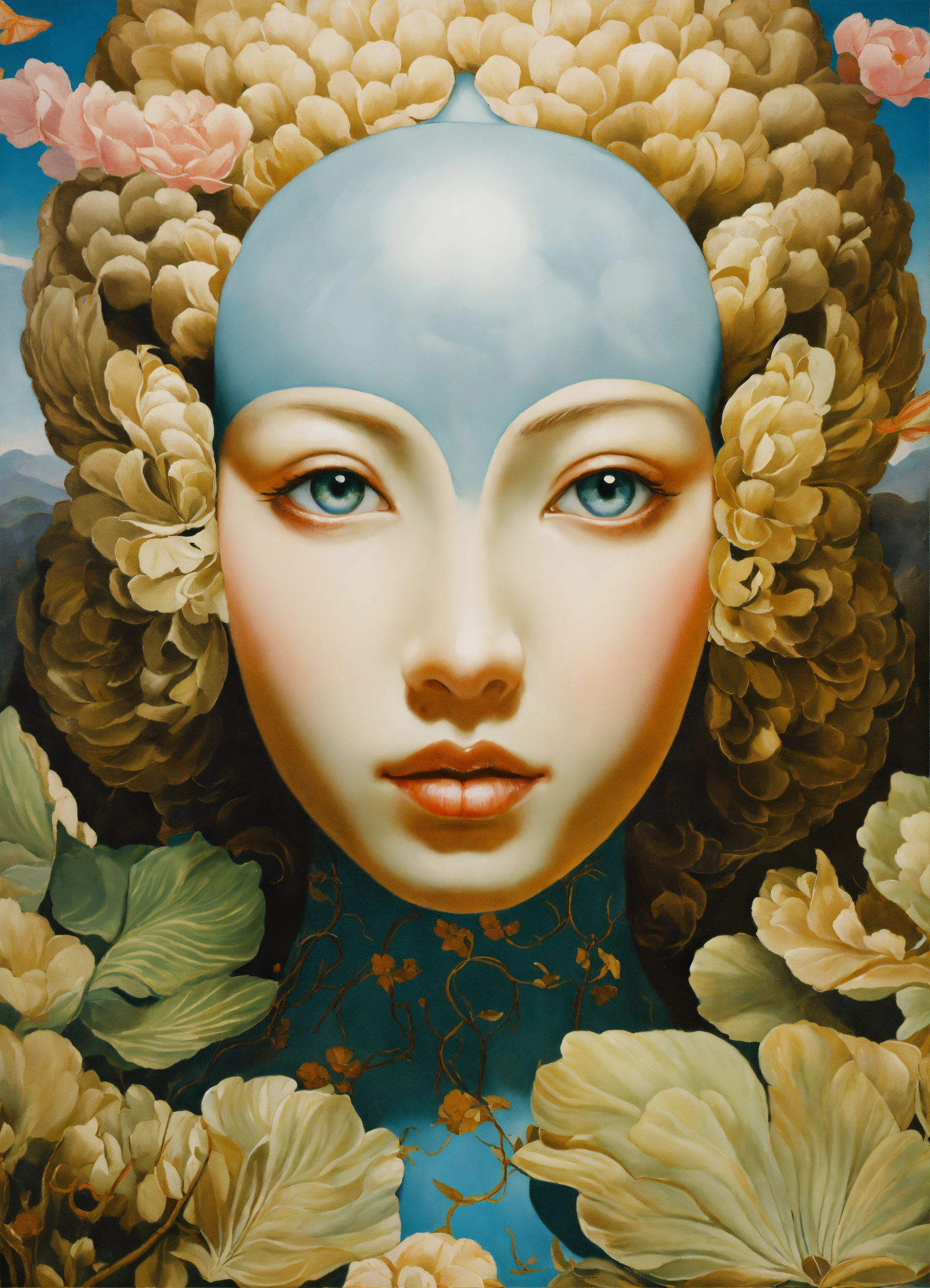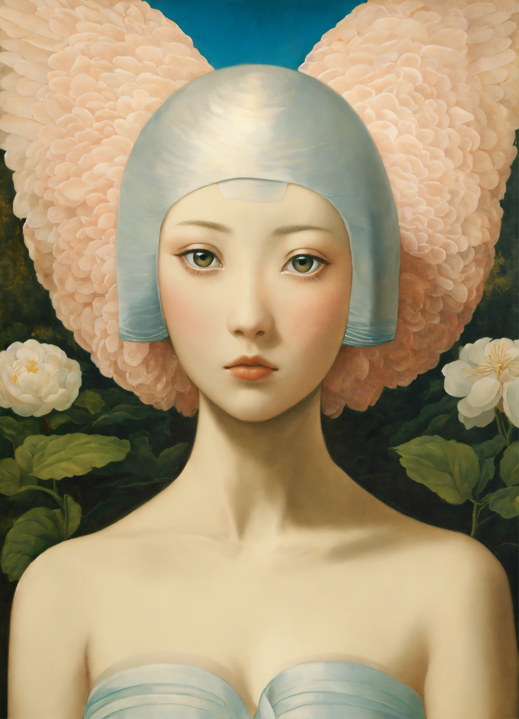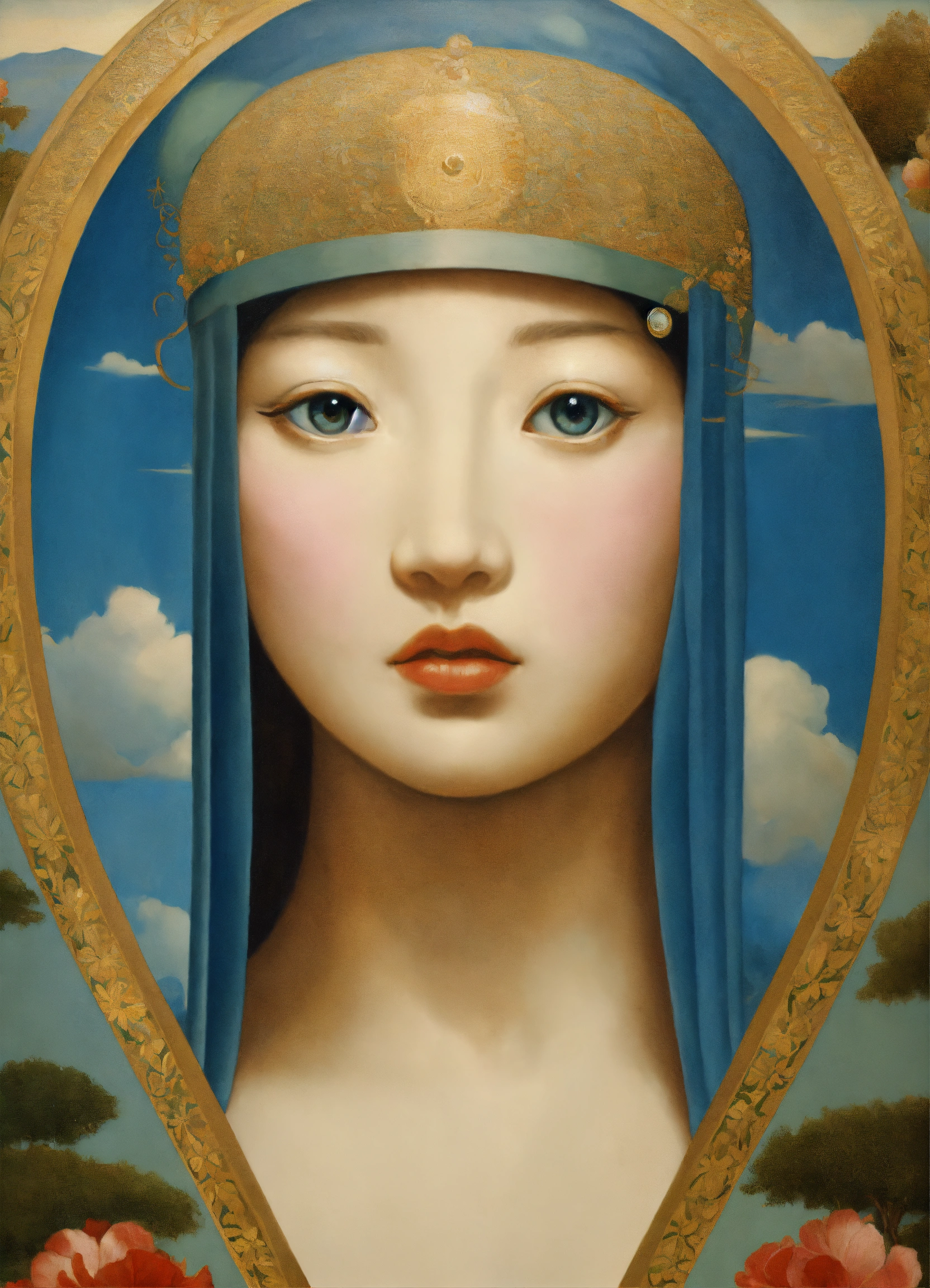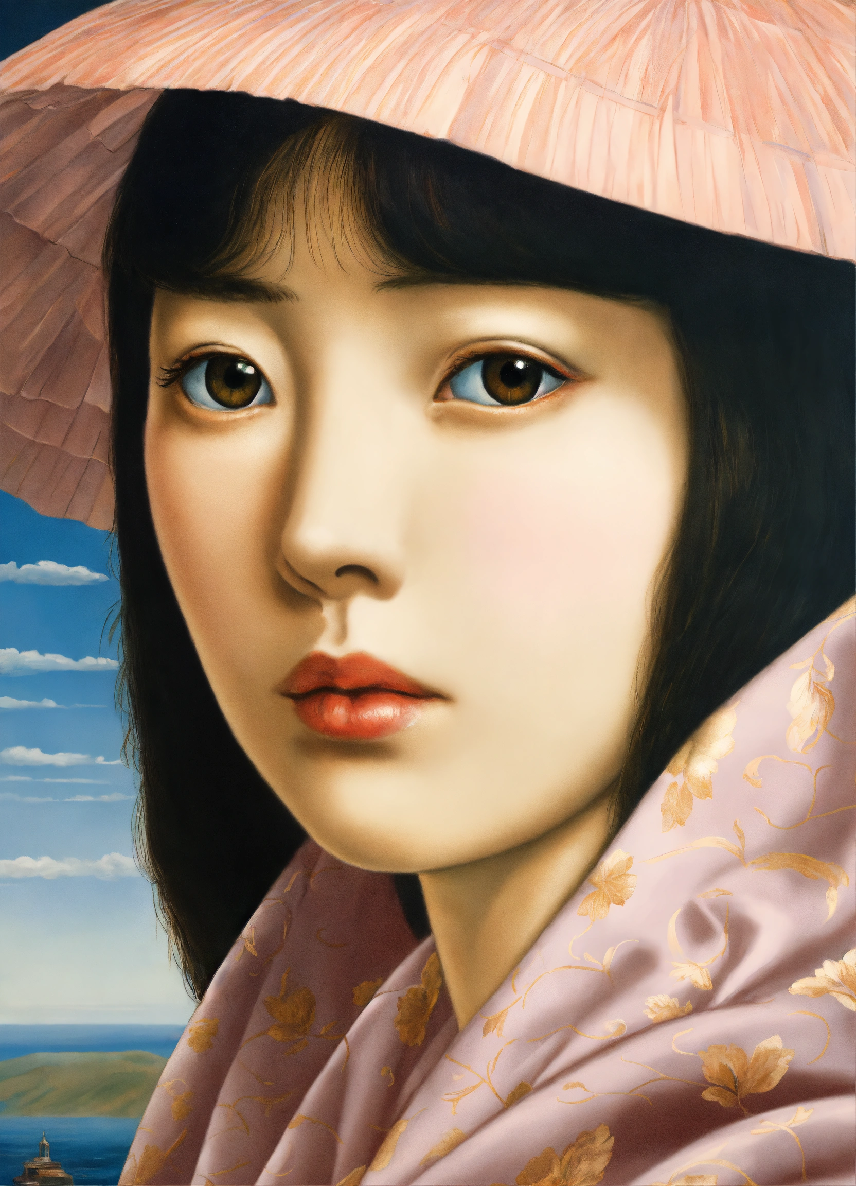 "closeup of a japanese aphrodite looking at us with very big eyes" in a painting by rene magritte and raphael, surrealistic, 64k resolution, highly detailed, sharp image.