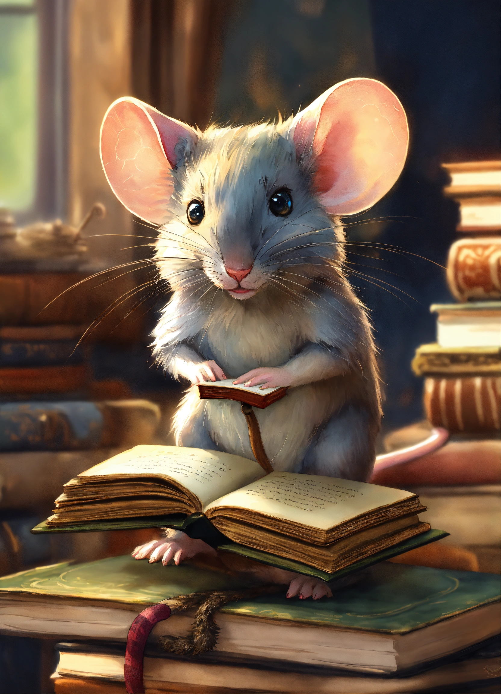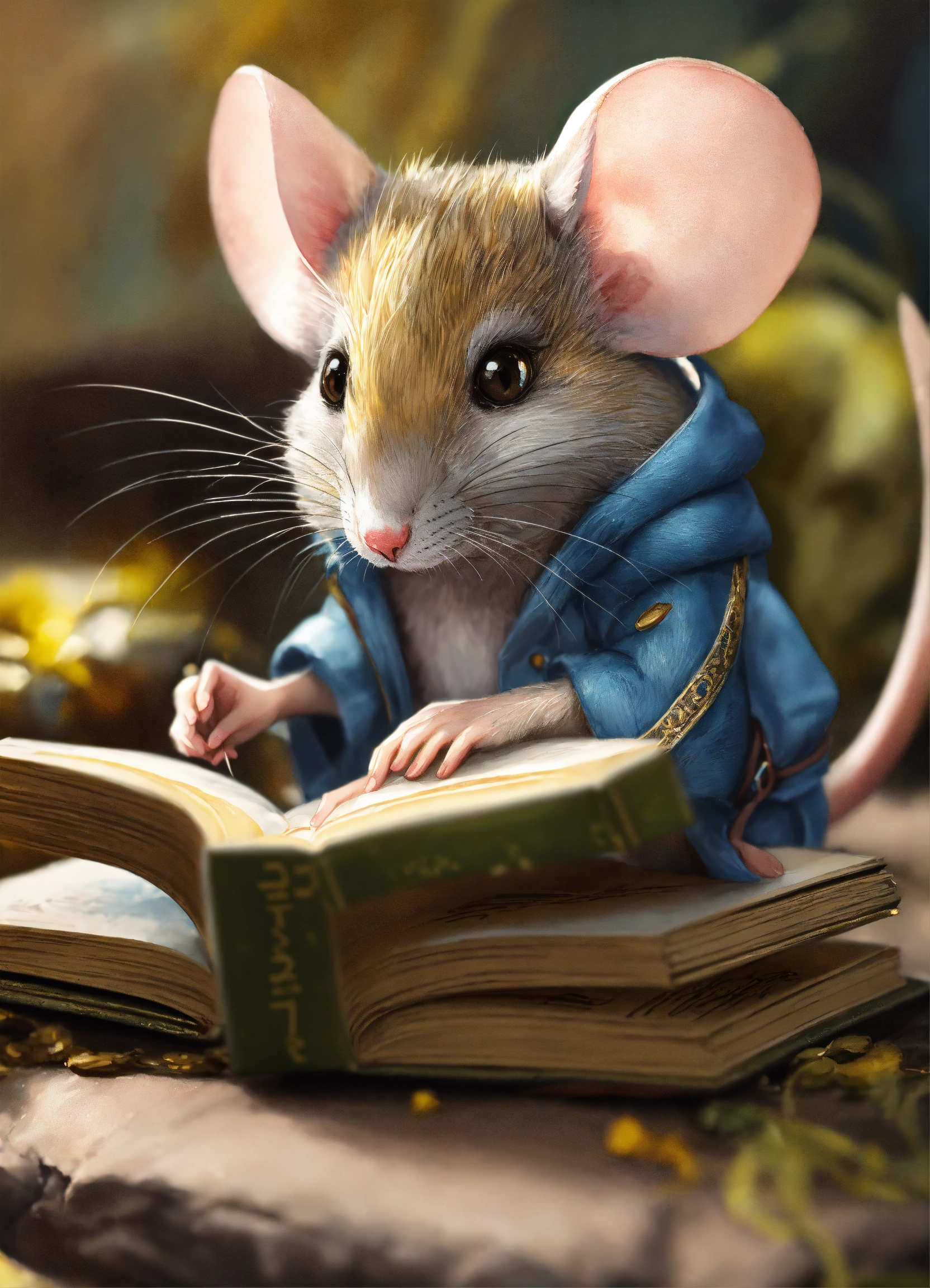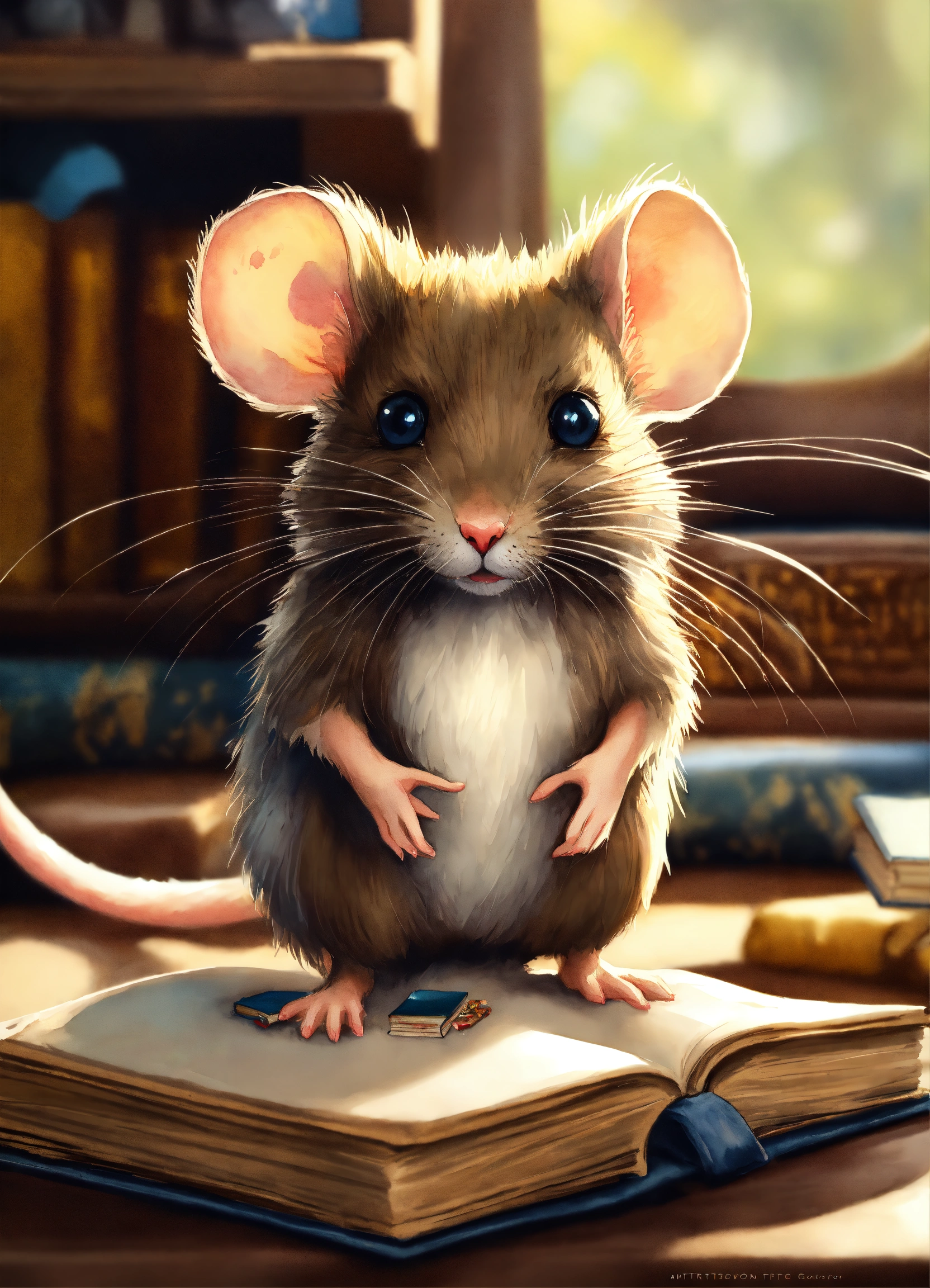 Close-up of mouse with book and mouse, adorable digital painting, furry fantasy art, cute, furry artist, hyperdetailed fantasy character, watercolor, trending on artstation, sharp focus, studio photo, intricate details, highly detailed, by greg rutkowski