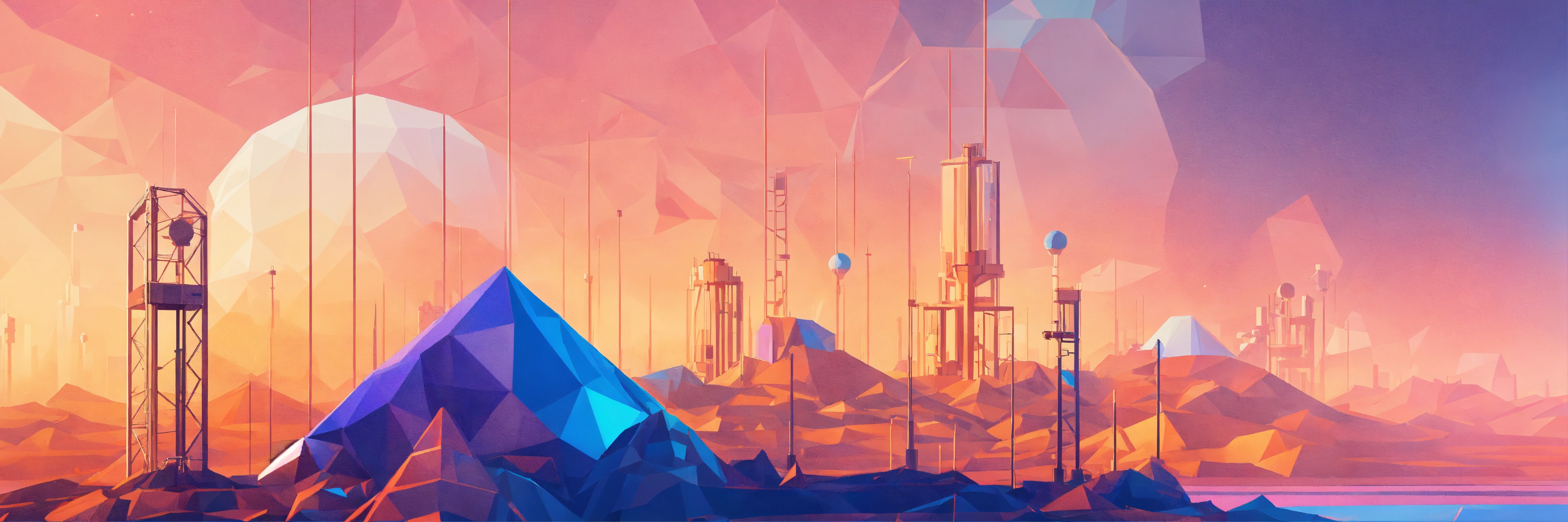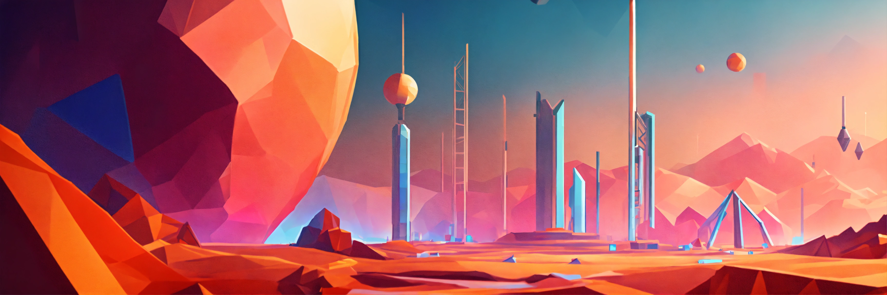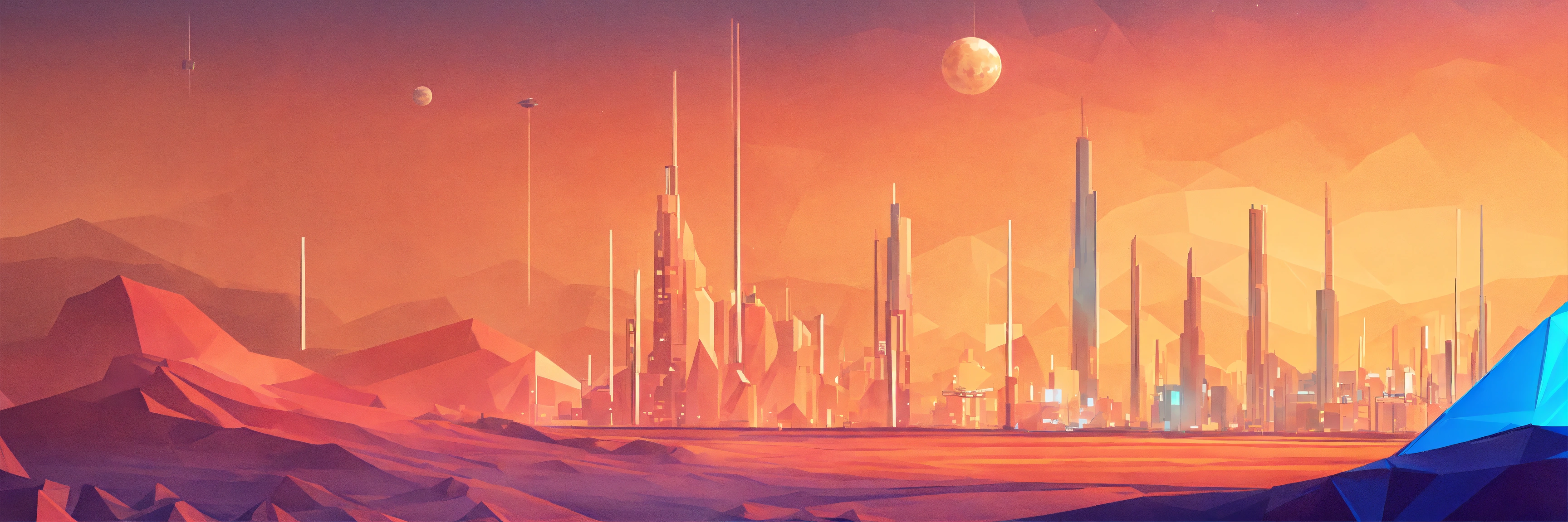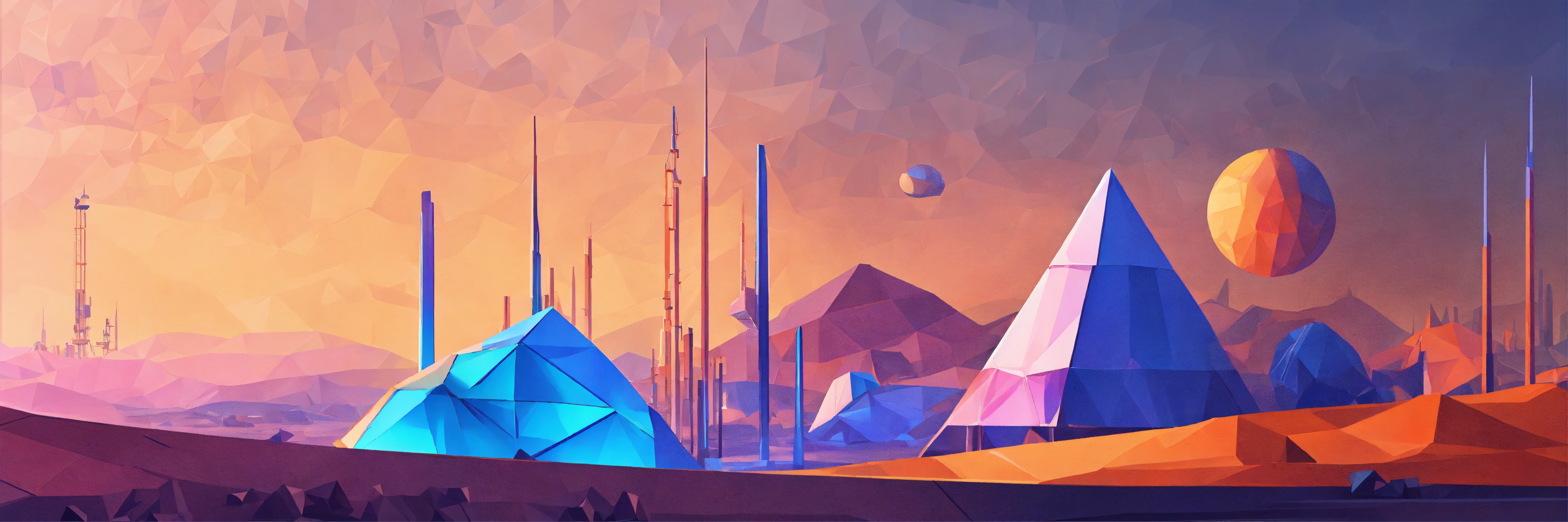 A minimalist low poly attractive background for linkedin header with mostly orange, little blue and sunset colors with a few far distant blurred sci-fi constructions on the empty planet, beautiful, a minimalistic masterpiece, low poly art, patterns, behance, ilm.