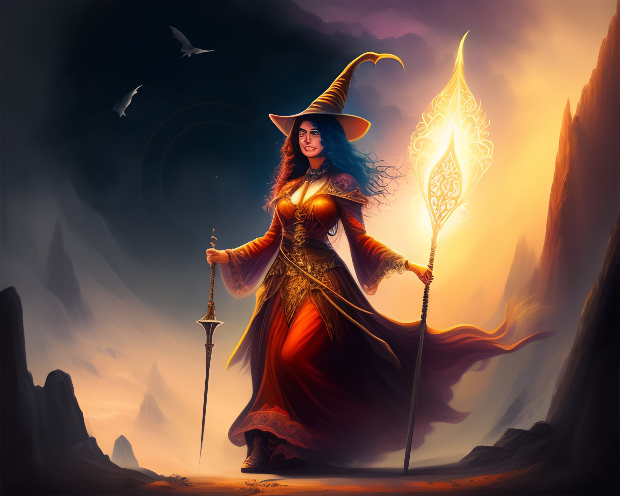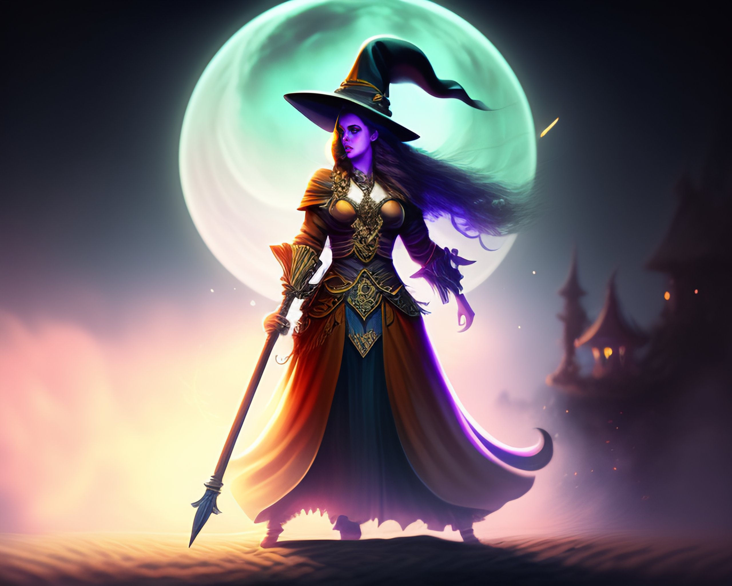 Top down full body view of a witch holding a staff and casting spells fantasy art