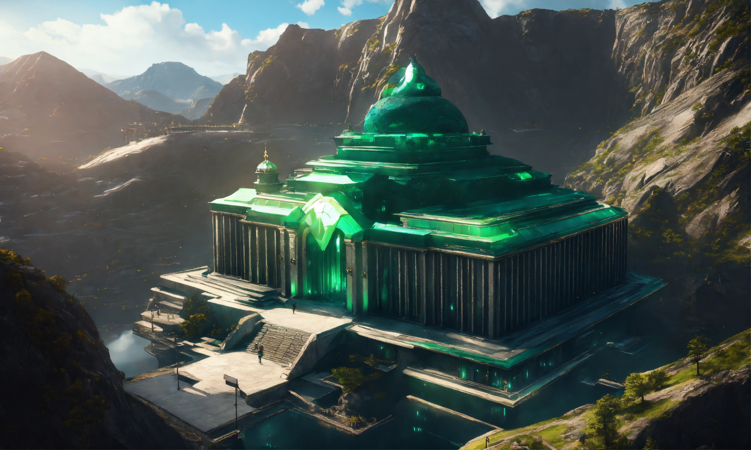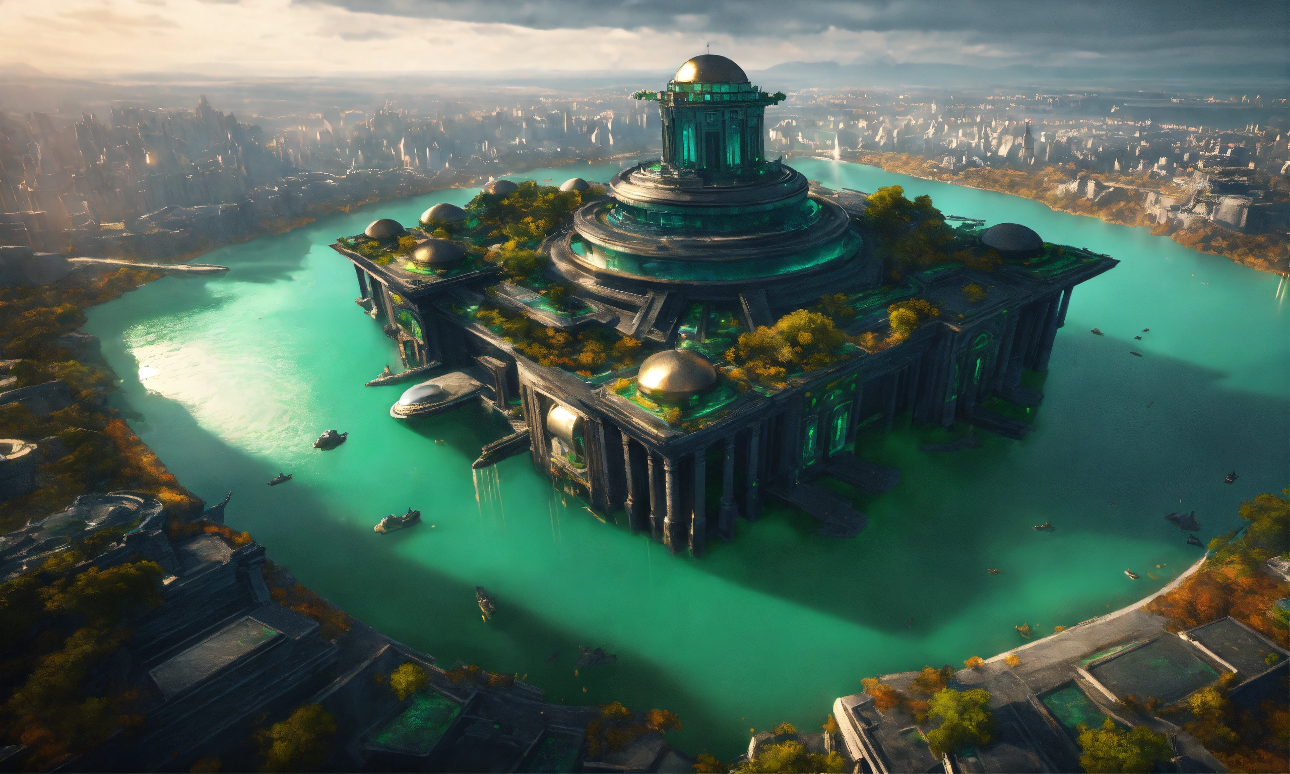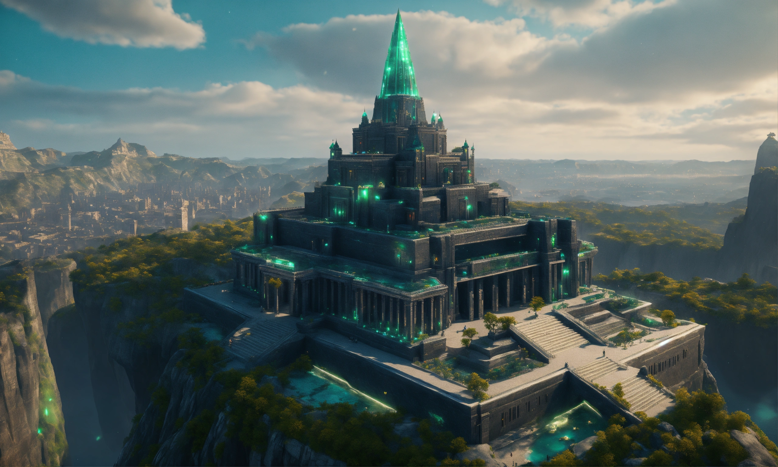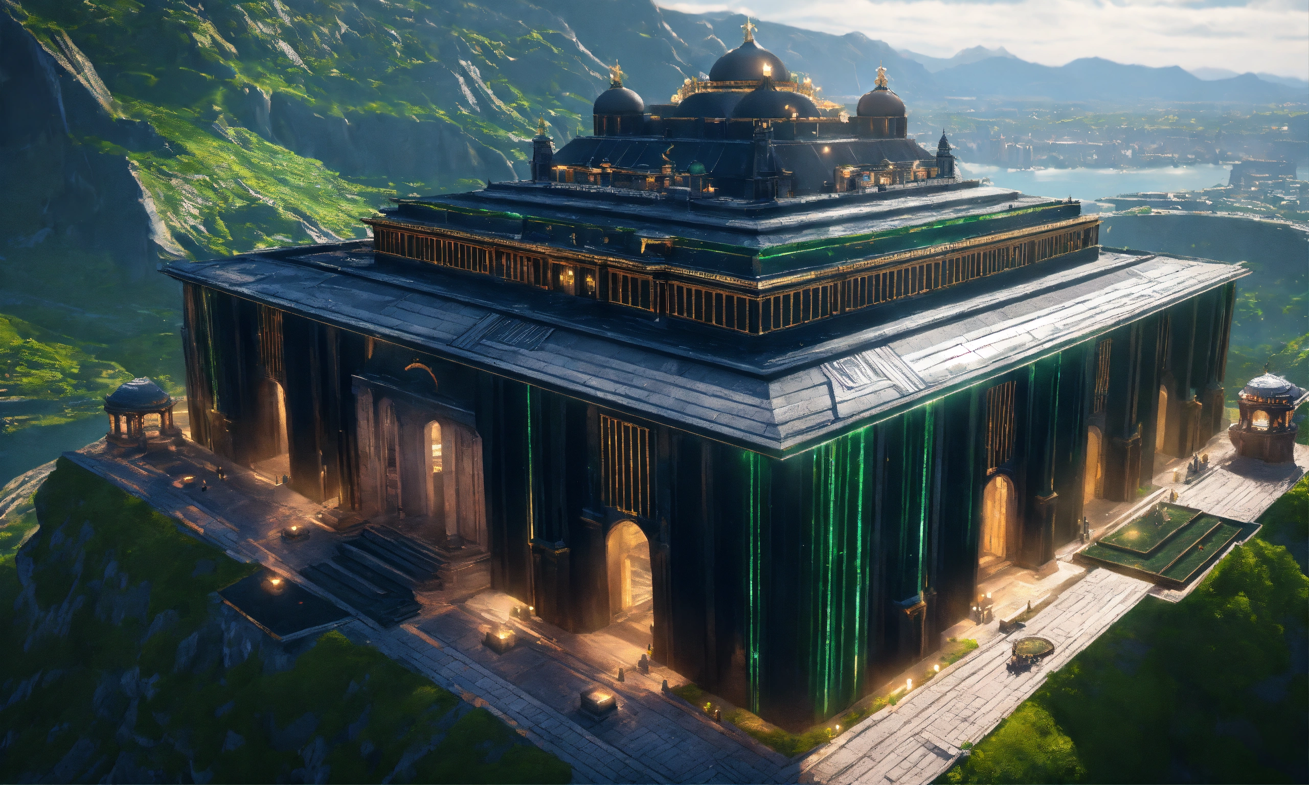 Overhead view of a black marble and jade sci fi royal palace on a cliff overlooking a sci fi city, russian architecture, 8k, unreal engine
