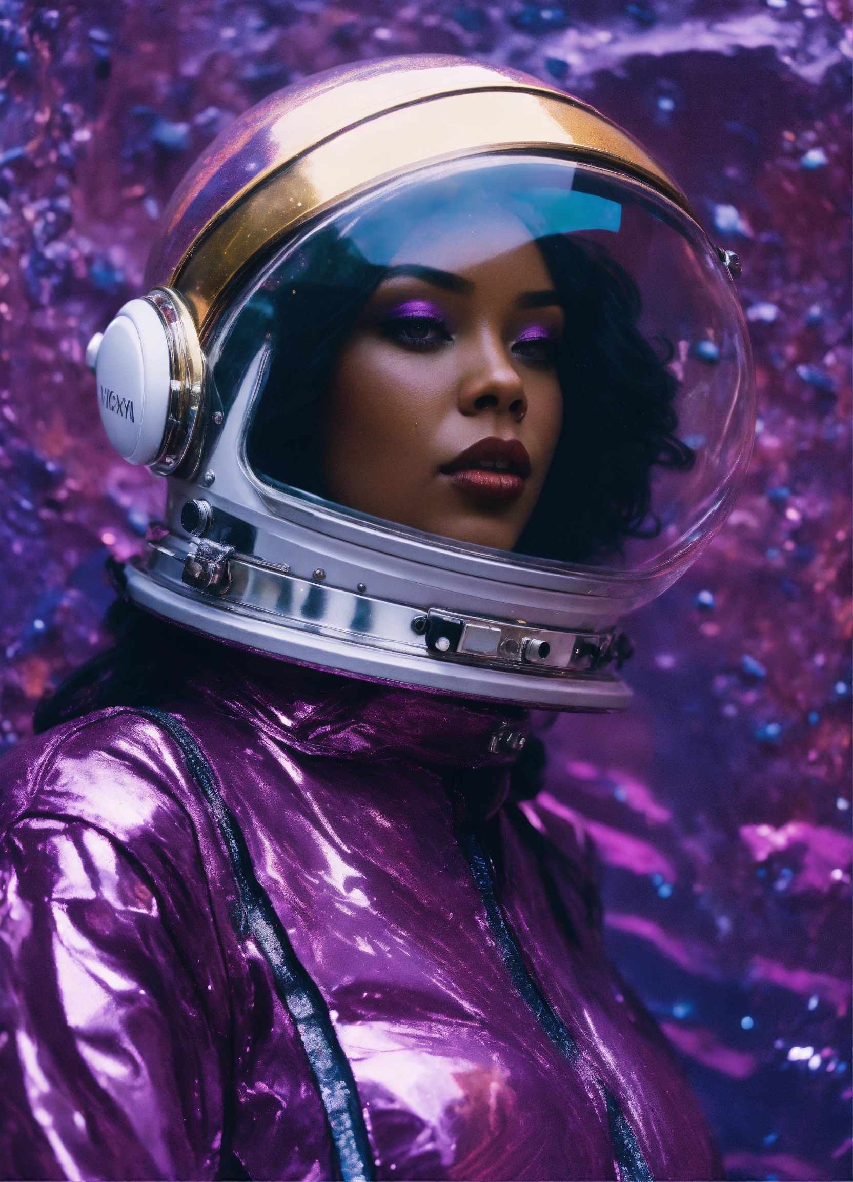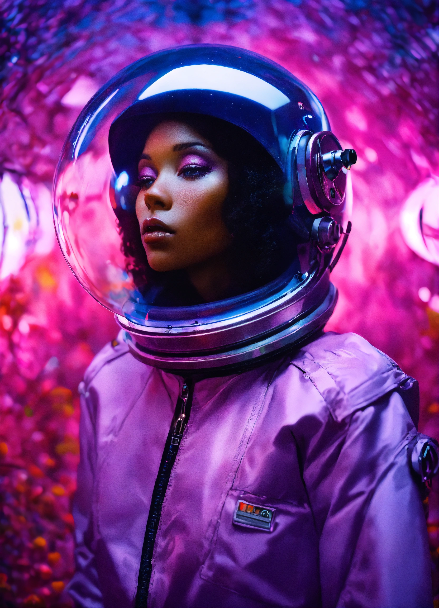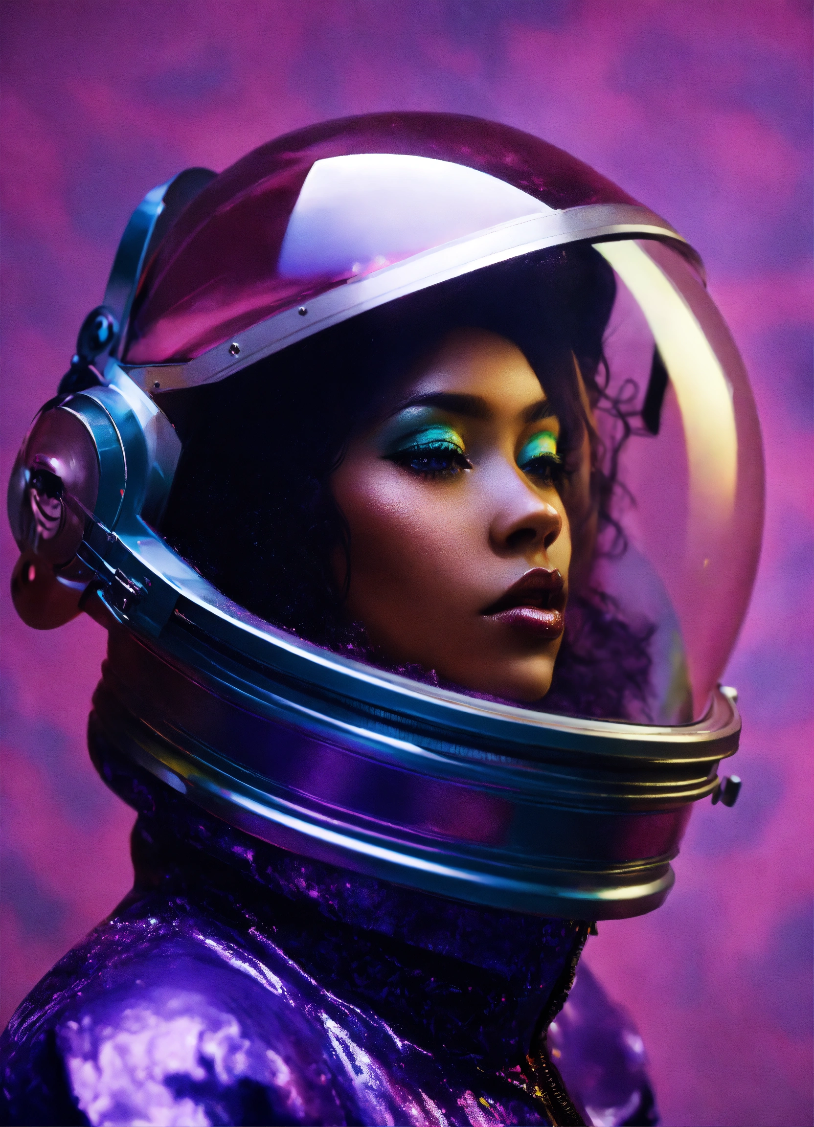 Abstract 1998, fashion photography, 24mm, long shot, 60's black woman astronaut in purple spacesuit with large plexiglass helmet, 80 degree view, art by victor moscoso and bridget riley kodak ektar 100 8k, make it magical by carne griffiths fluid art, conrad roset ilya kuvshinov, mark fielding, zwy studio high lights in eyes, salt. art by sergio lopez, natalie shau.