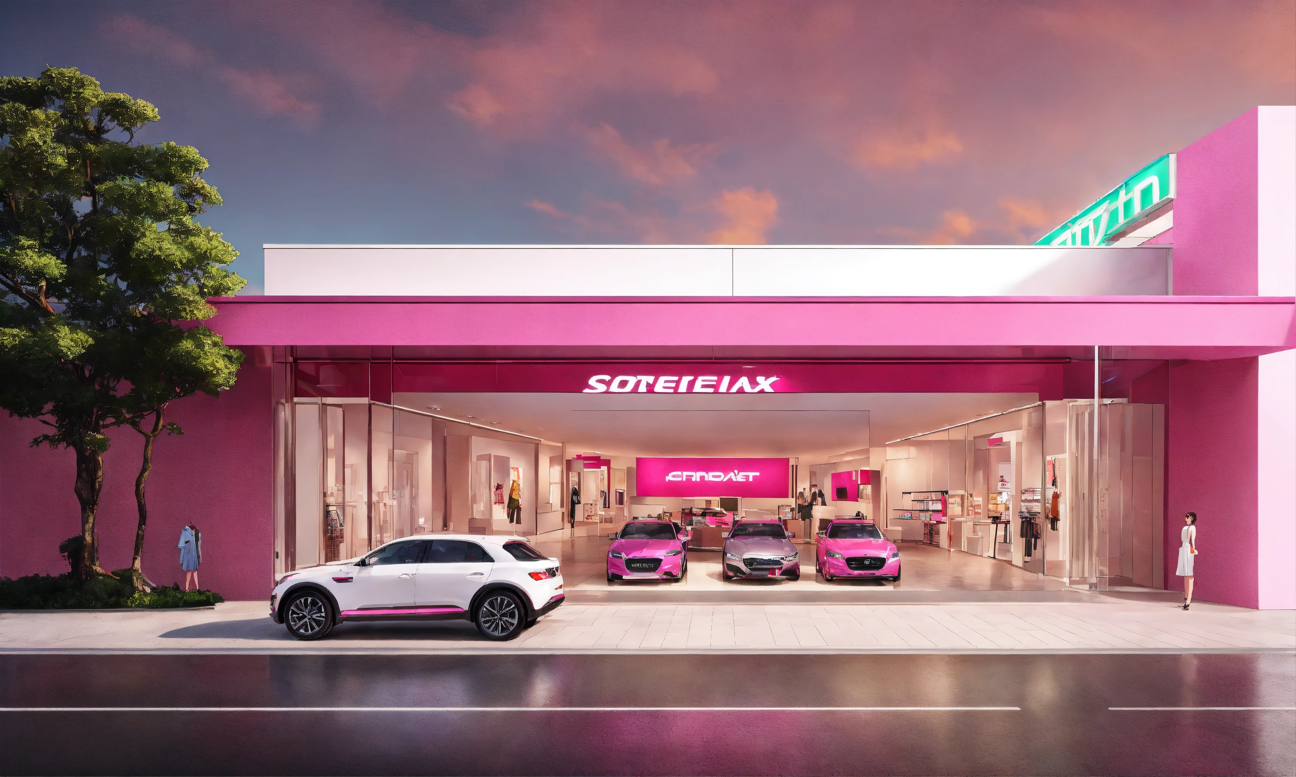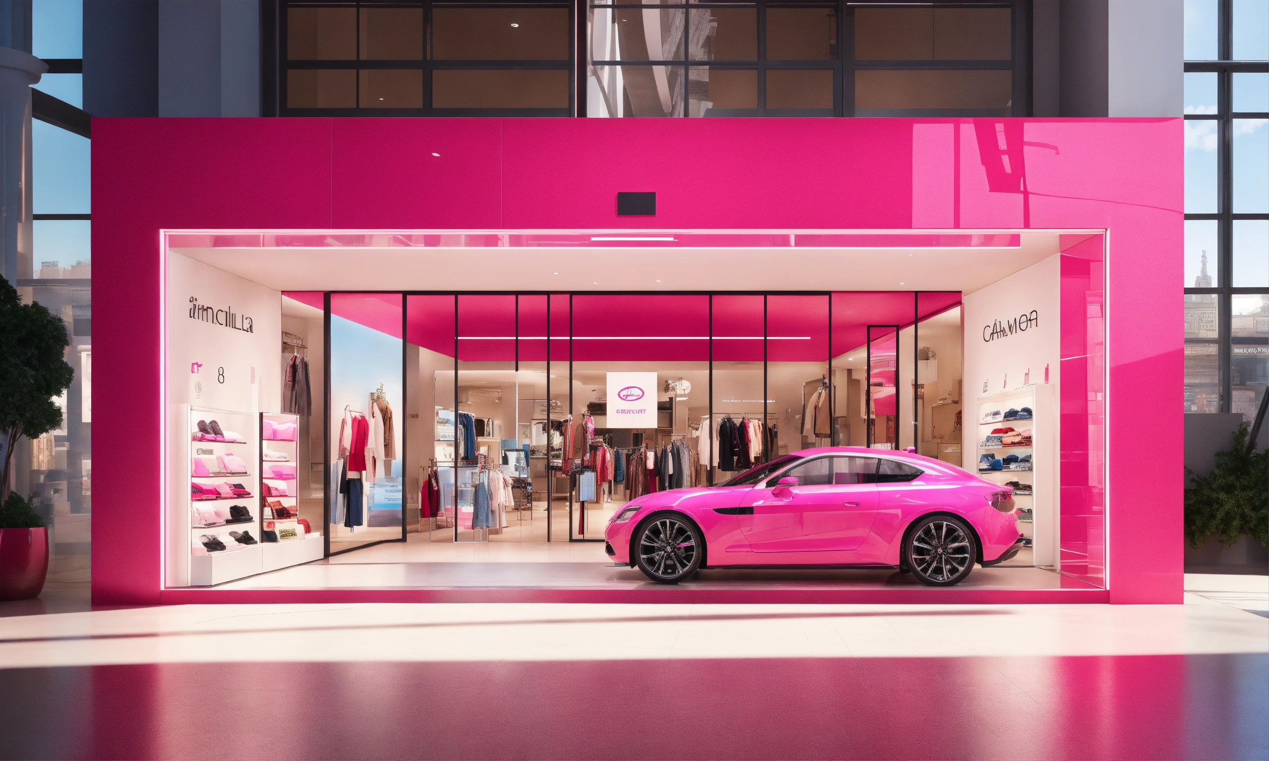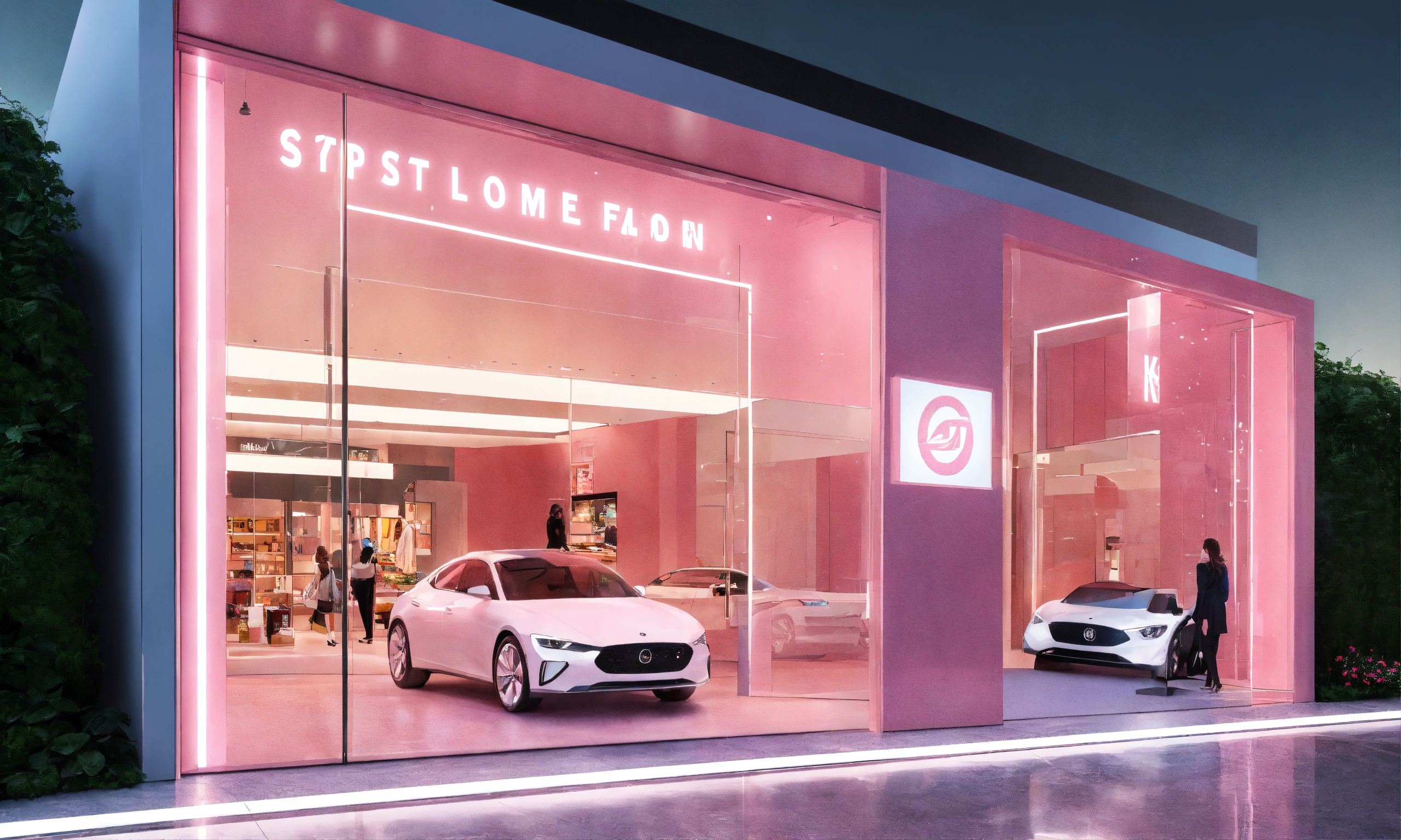 Indoor, inside mall, small store, car rental store, pink car, with large glass windows and a smooth white facade. the entrance is marked by a sleek, minimalist logo, and inside storefront is lined with display models of the latest fashion clothes for ladies, photo-realistic, 8k, high definition