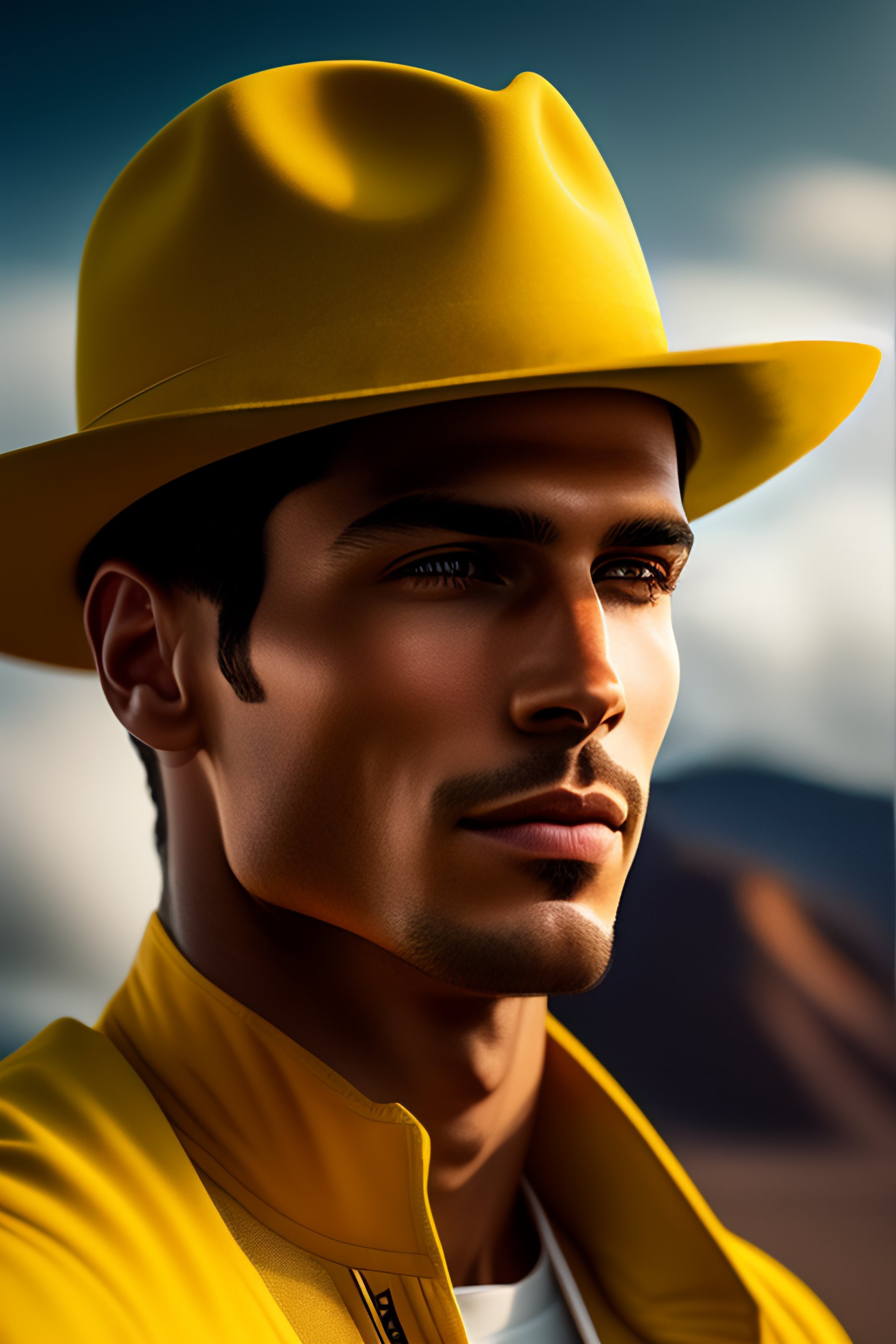 A realistic photo of a guy wearing a yellow hat