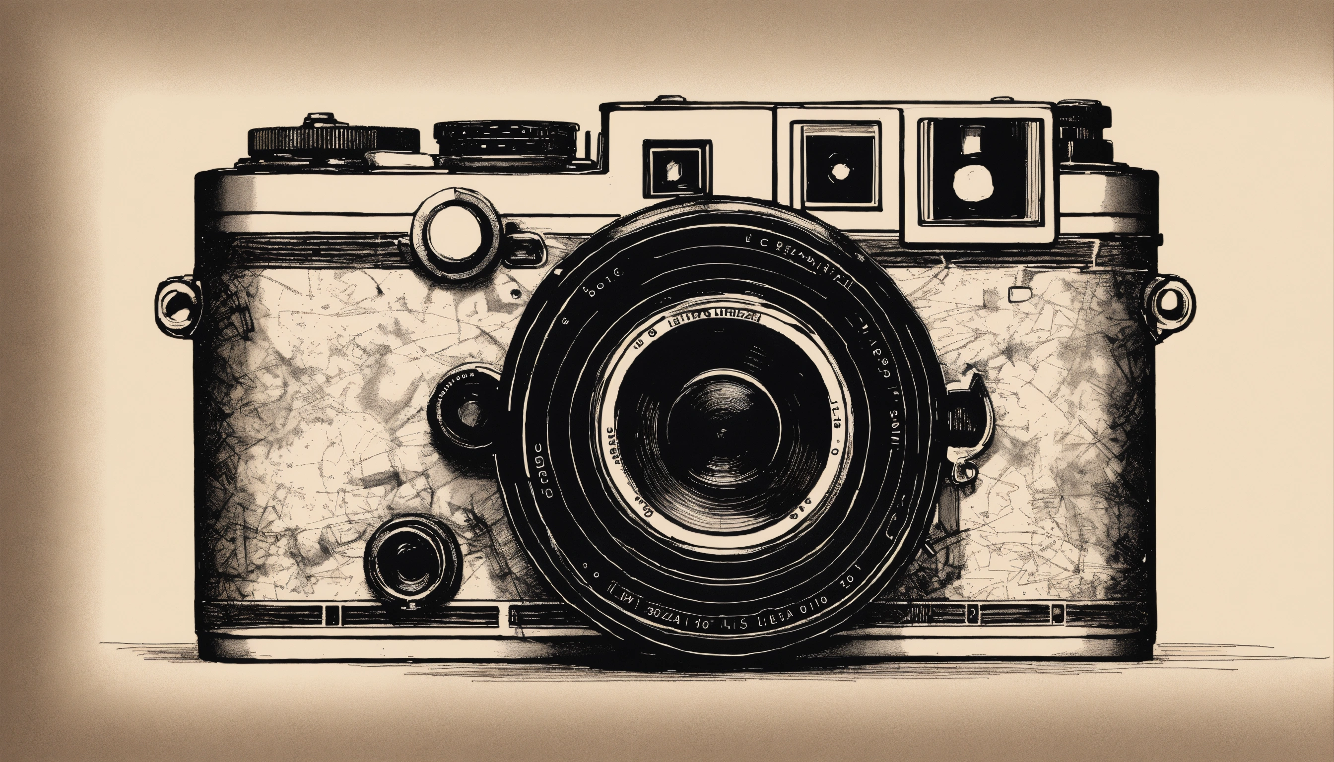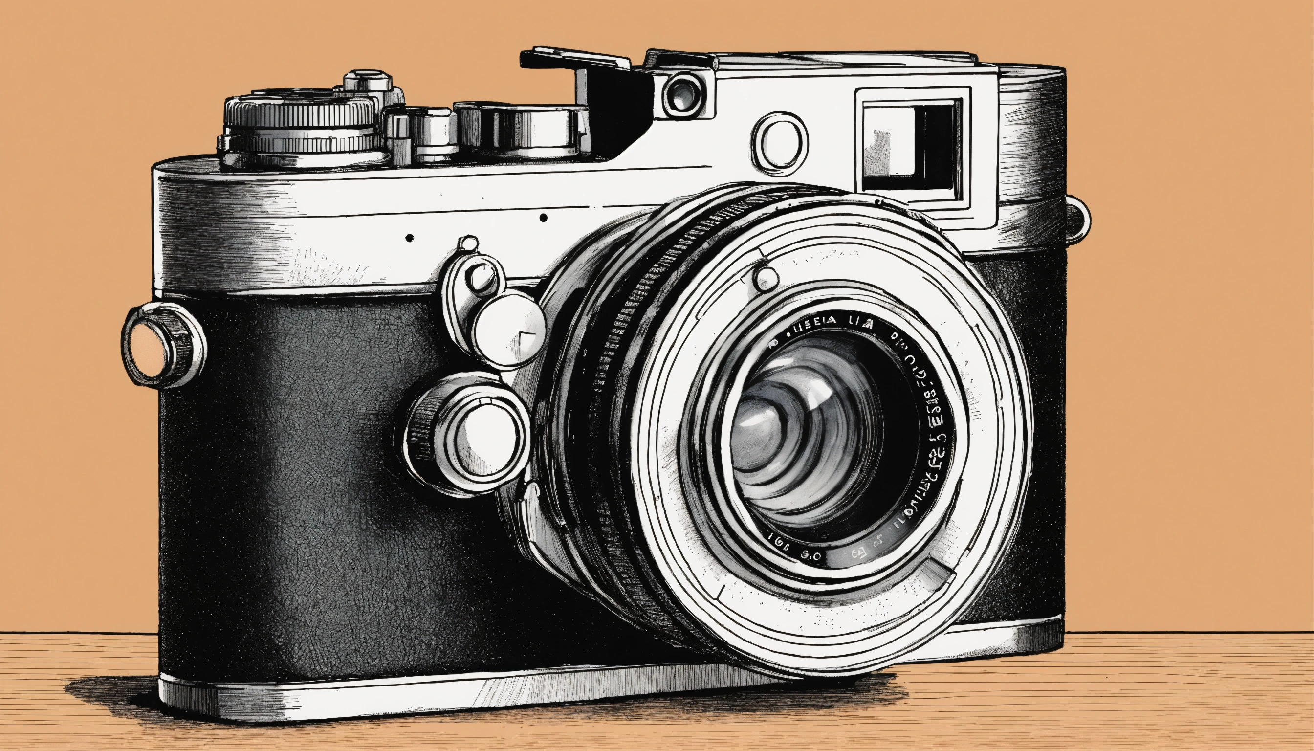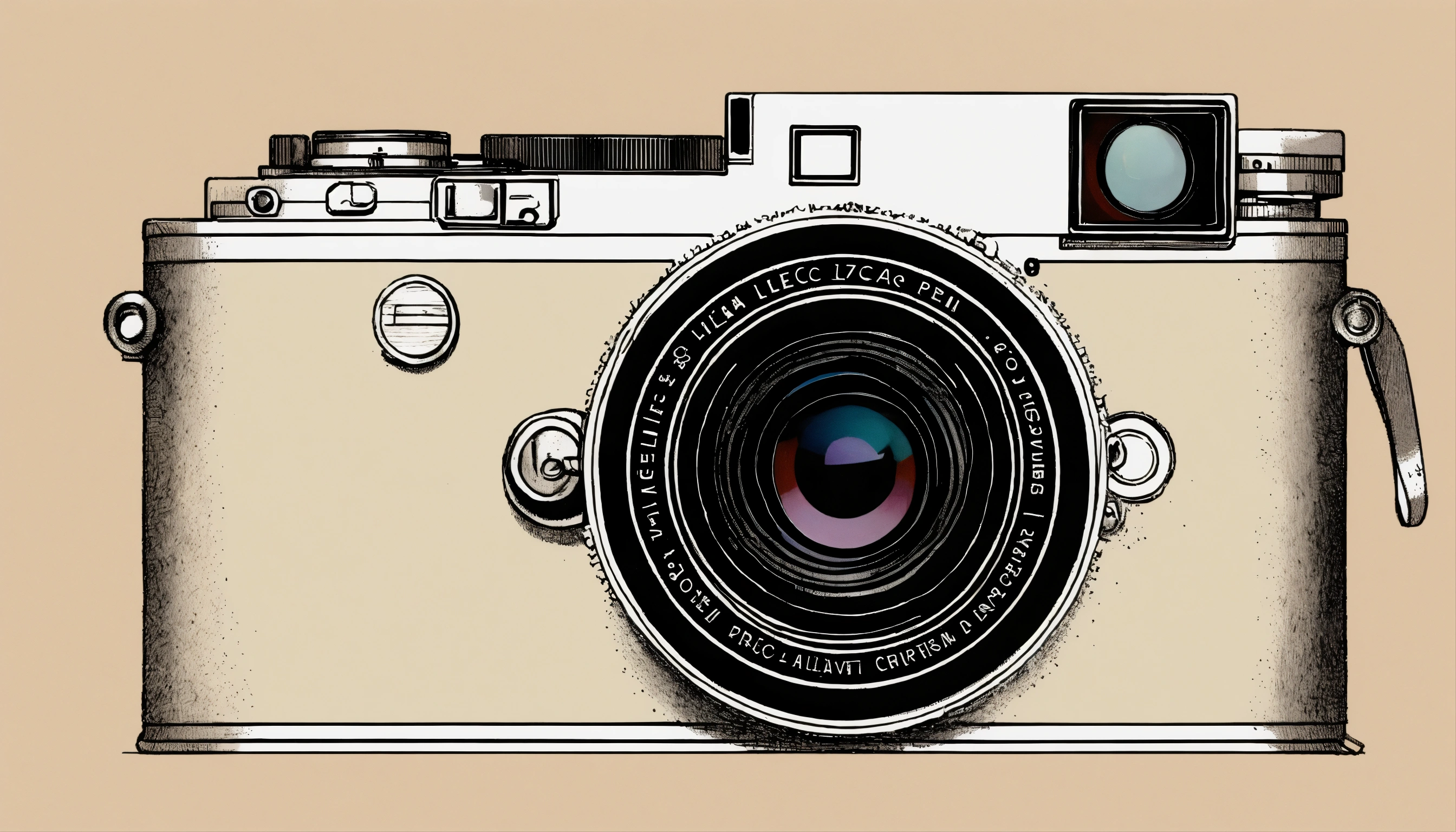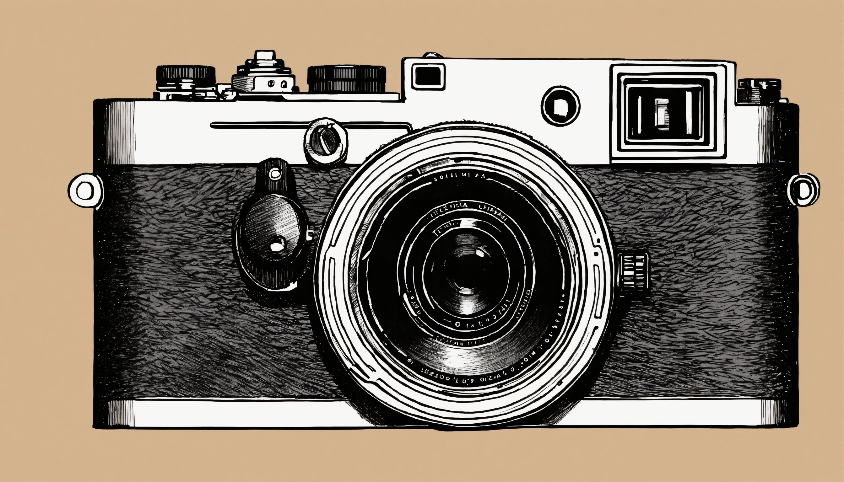 A minimalistic etching-illustration of a leica camera, capturing its essence with clean lines and simplified forms, perfect for printing on art prints and tote bags, loose sketch.