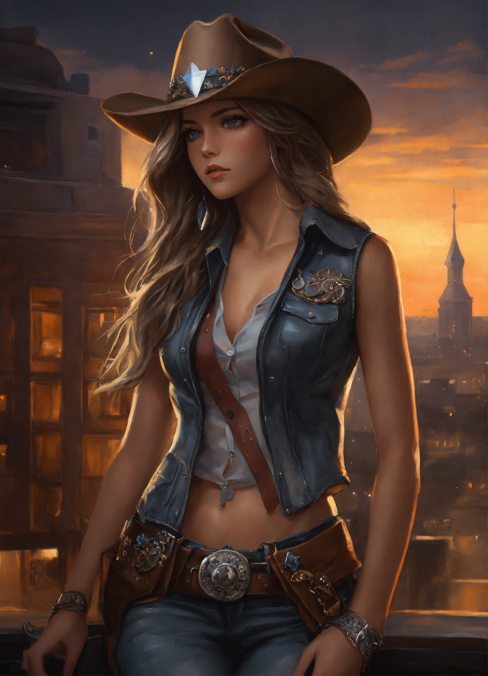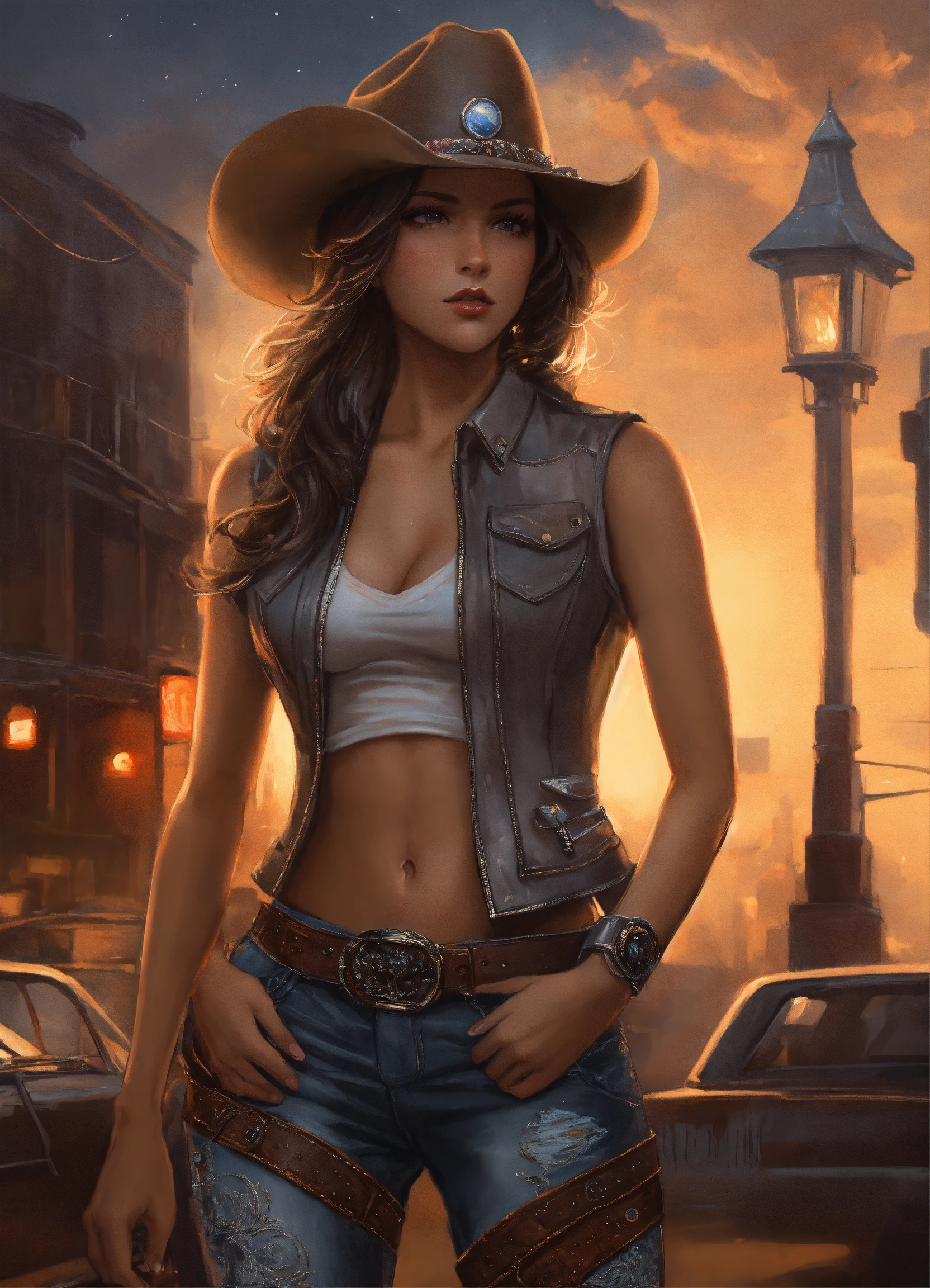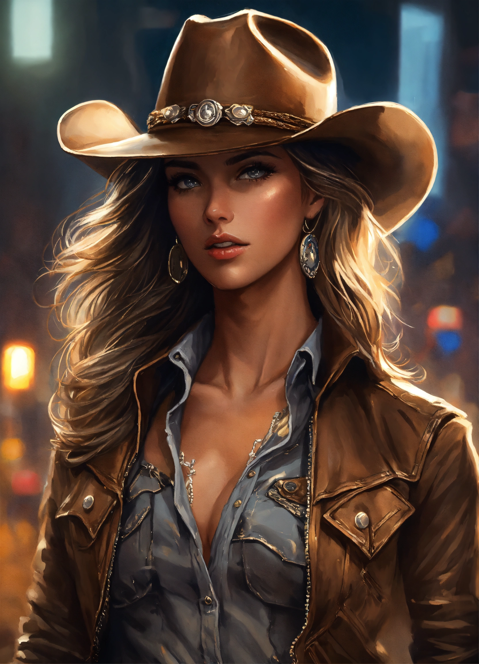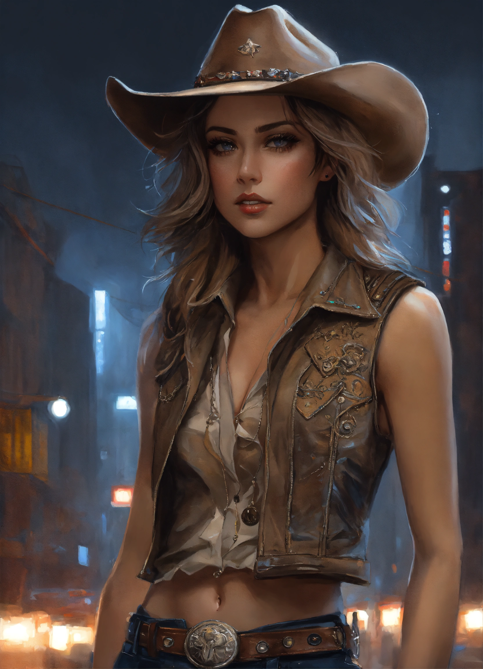 A southern beauty queen wearing a tattered cowgirl outfit with a light tan buttoned shirt and a leather vest and a cowboy hat. the scene is set in a dark, grey, futuristic dytopian nighttime cityscape. the art style is oil on canvas. highly detailed and intricate, this piece is trending on artstation, reference artists for inspiration include artgerm, greg rutkowski, jiří barbacha