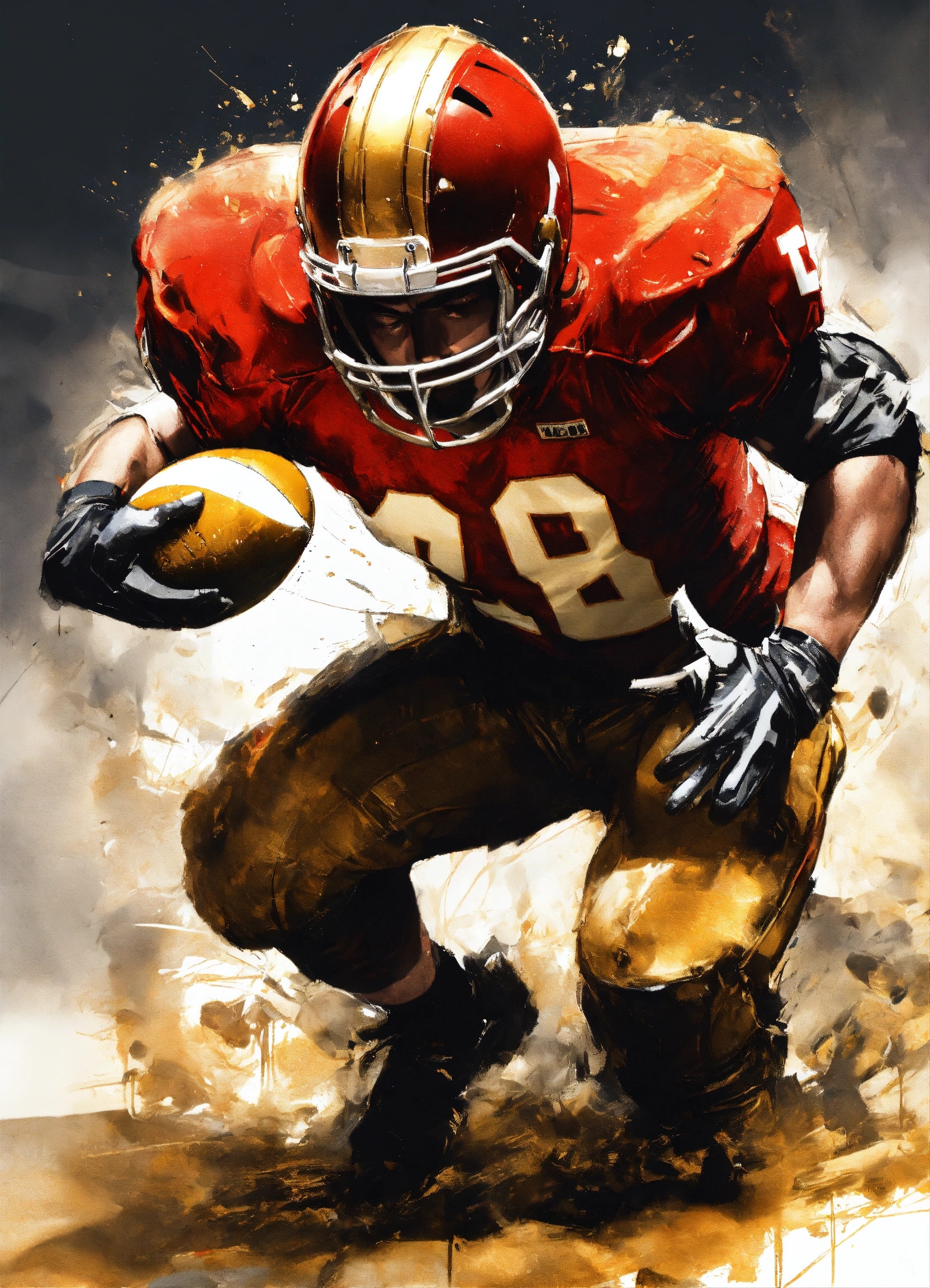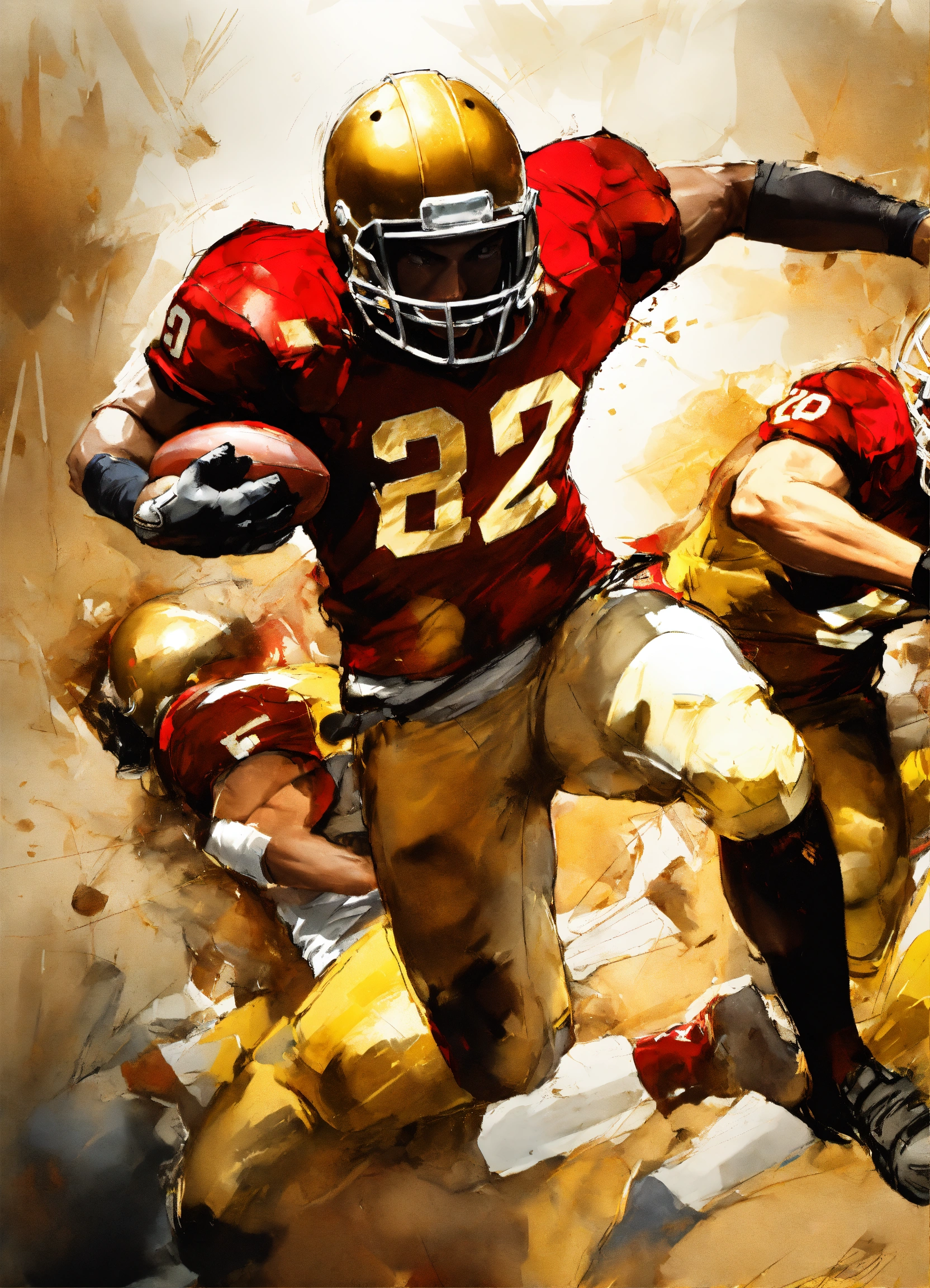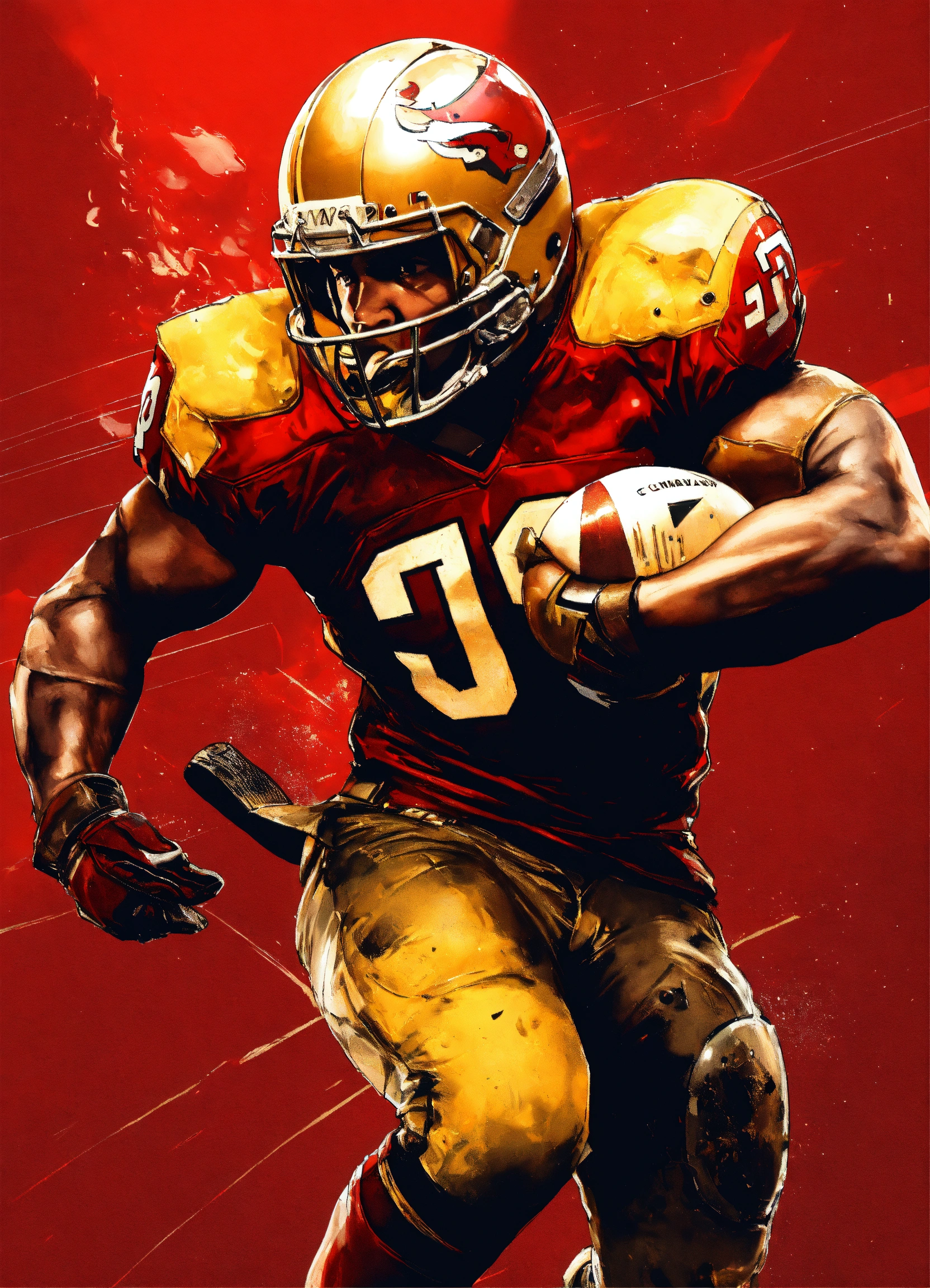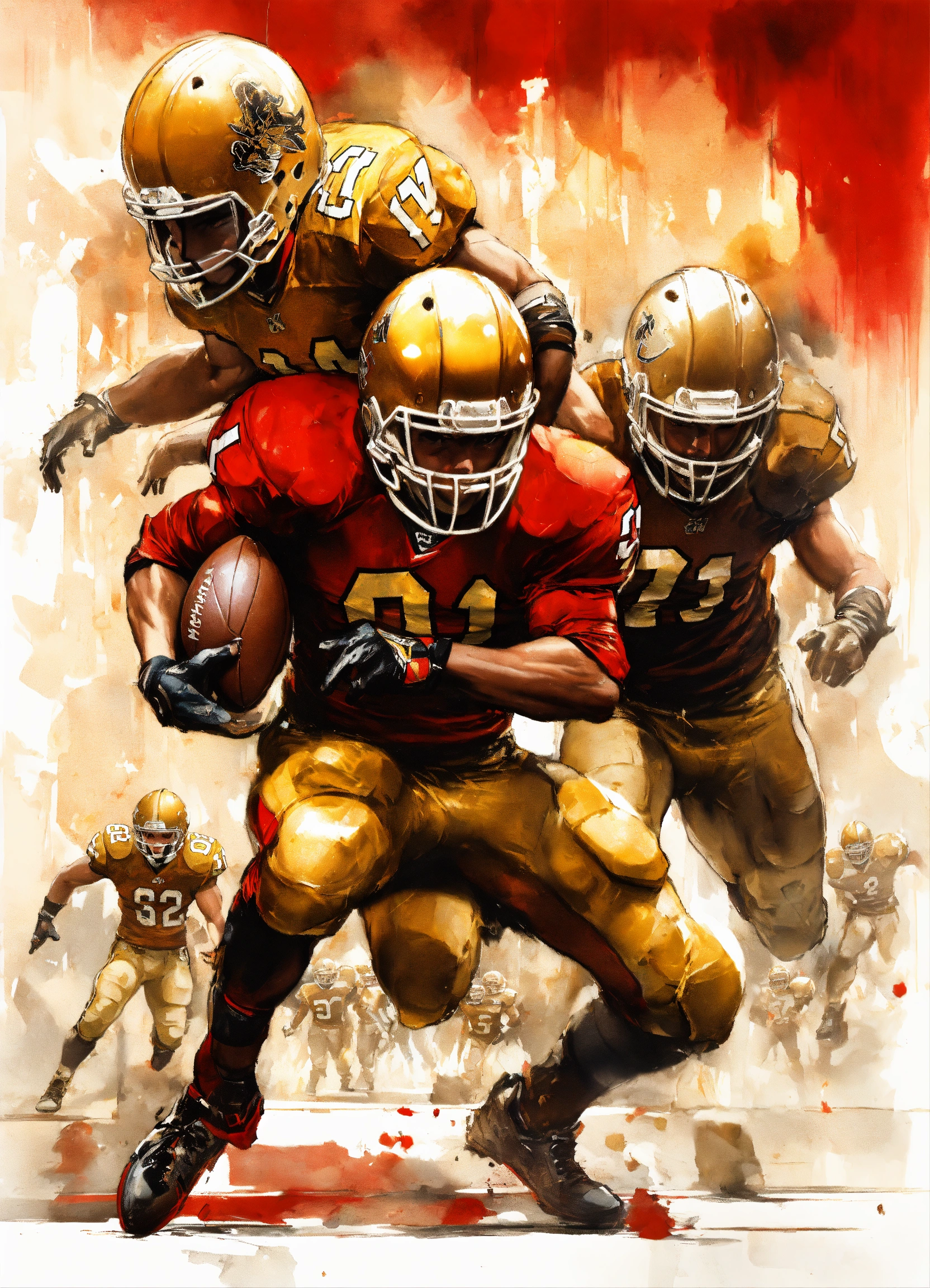 Full photo shot of an american football player getting tackled so hard helmet flies off, yoji shinkawa style, jean-baptiste monge, balanced composition, entirely on a sheet, concept art, backlighting, red, (gold1.3), red and dark gold, stylize, intricate detail, 32k, transparent background, (gold, white background1.4), 3d vector, comic book