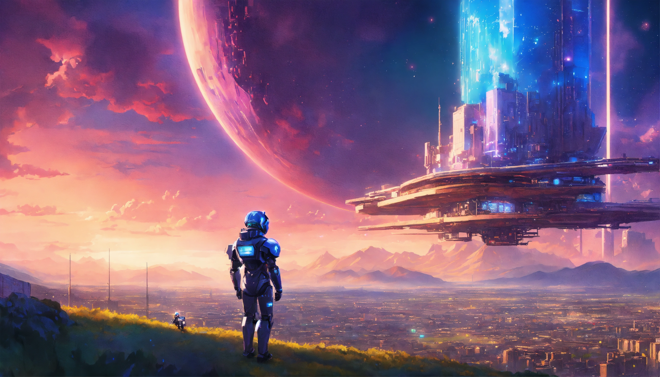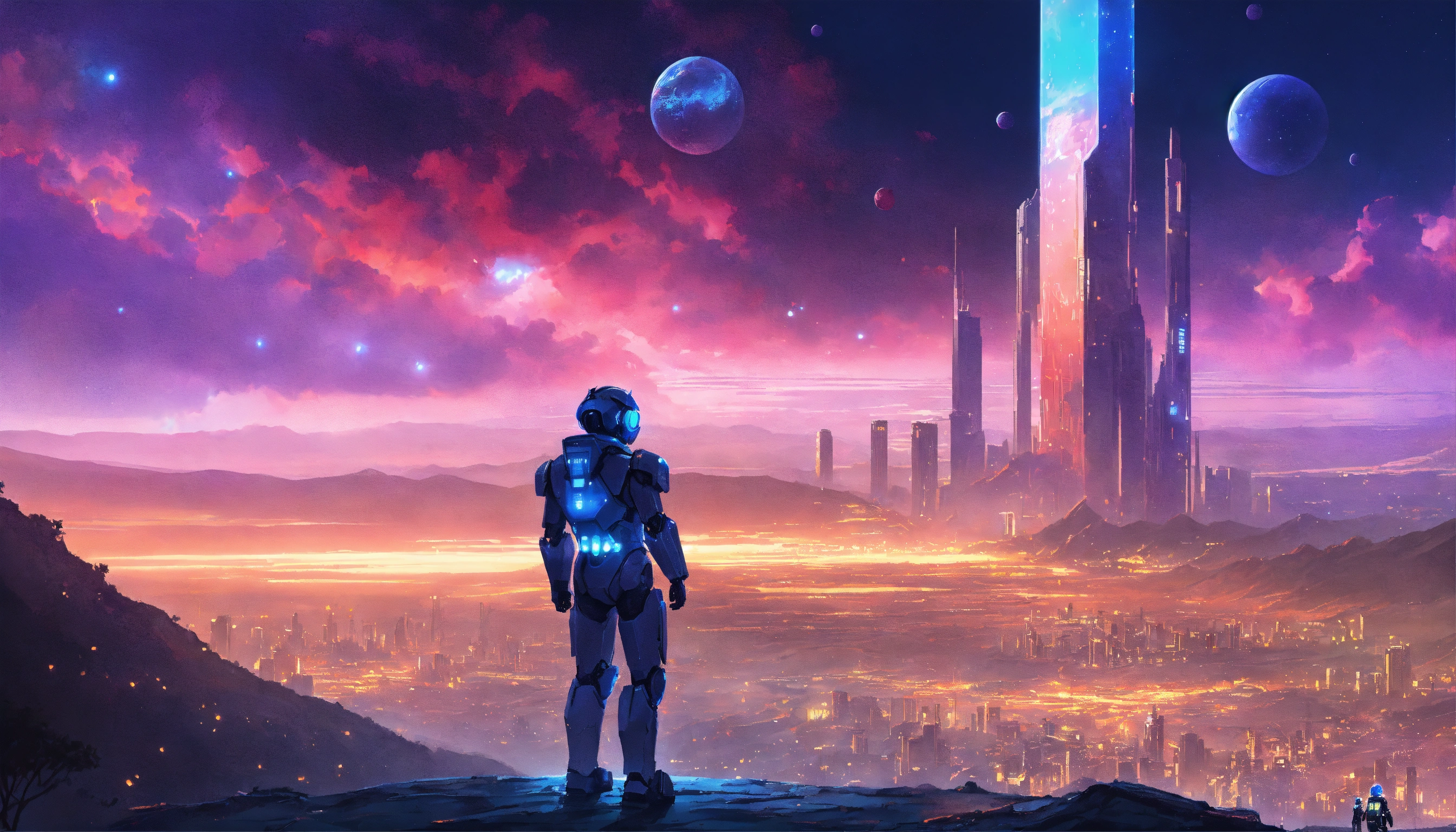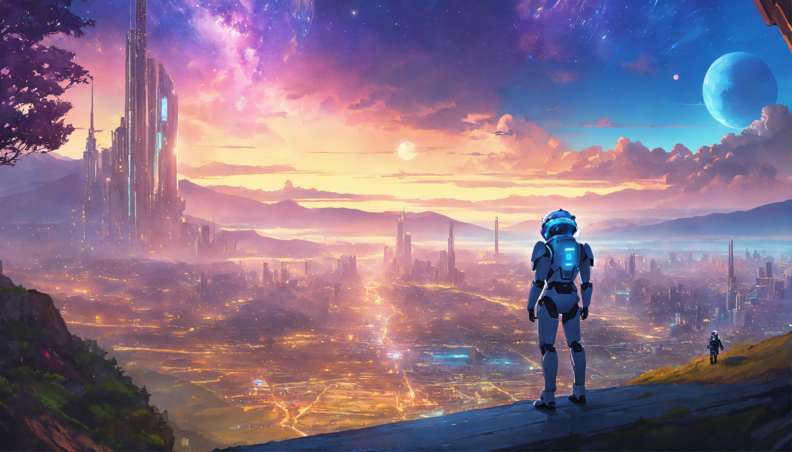 Makoto shinkai, small robotic android man in spacesuit on the right of the image, futuristic cyberpunk dystopia city in a valley, vibrant nebula sky, blue and purple hazes, peace and serein