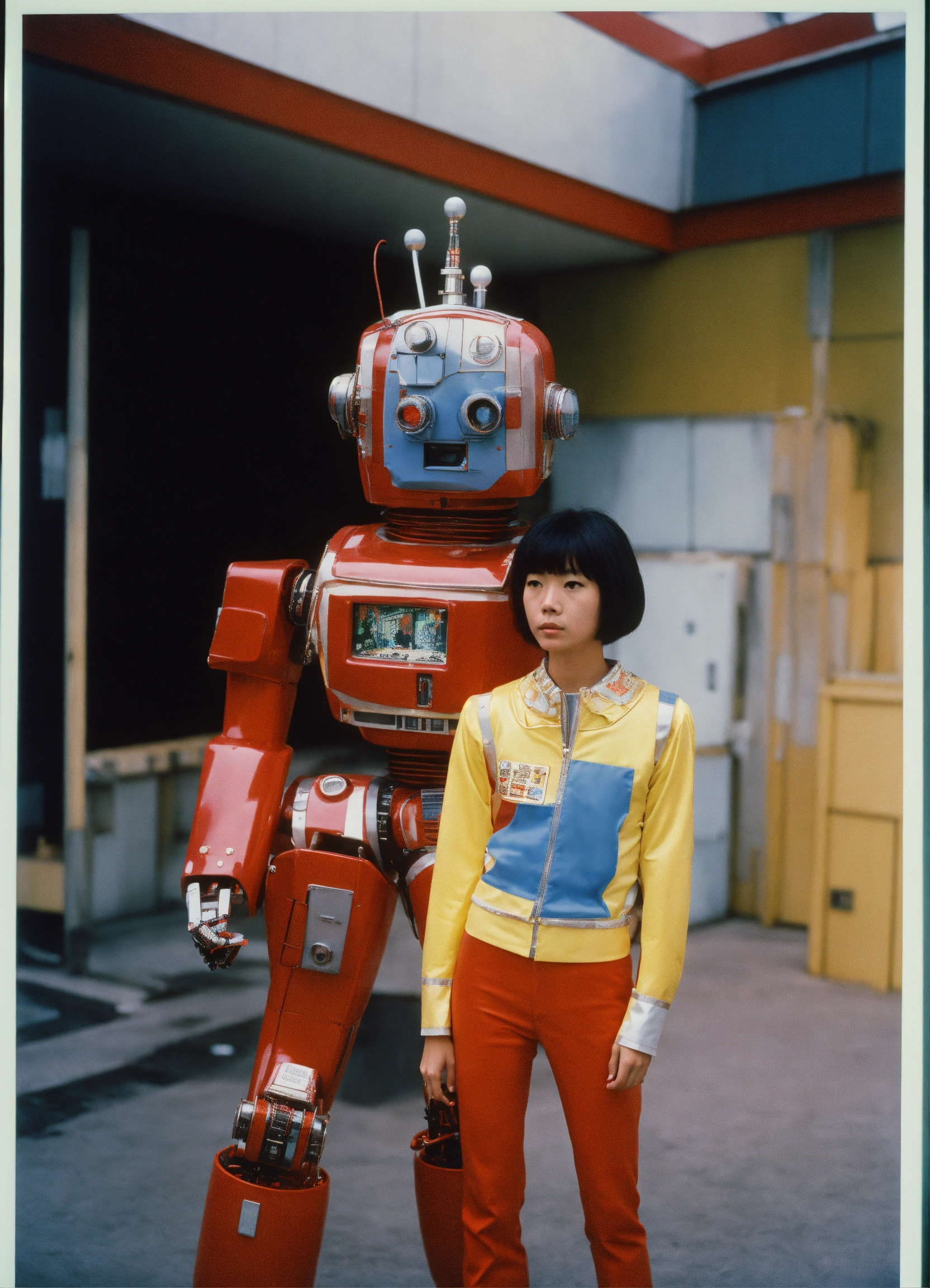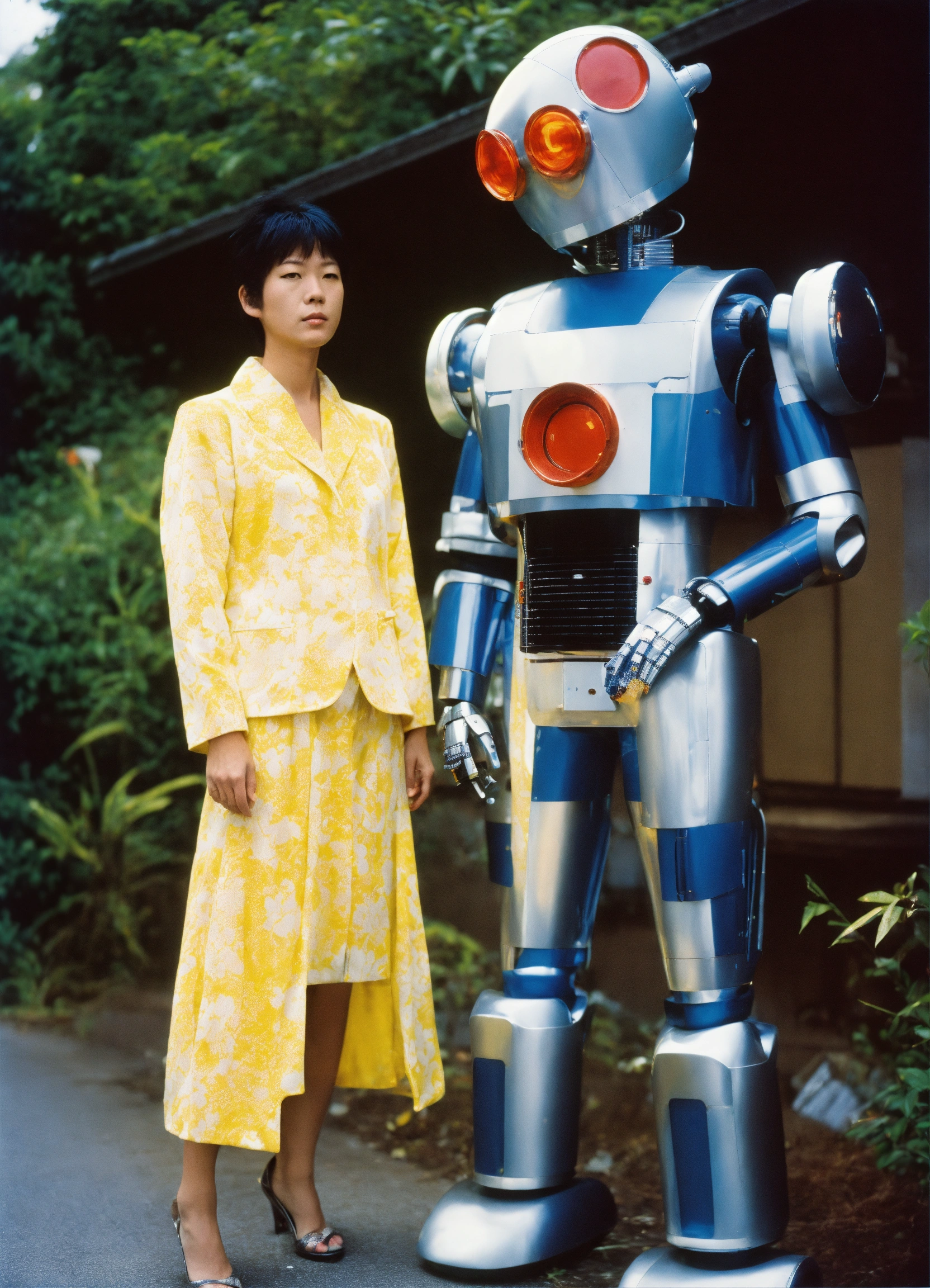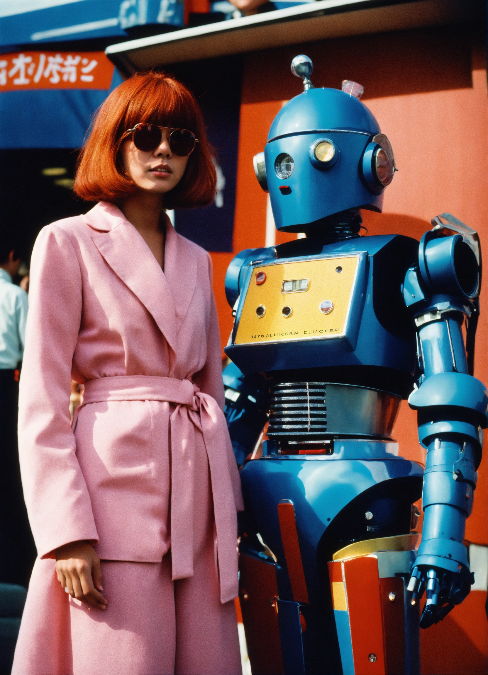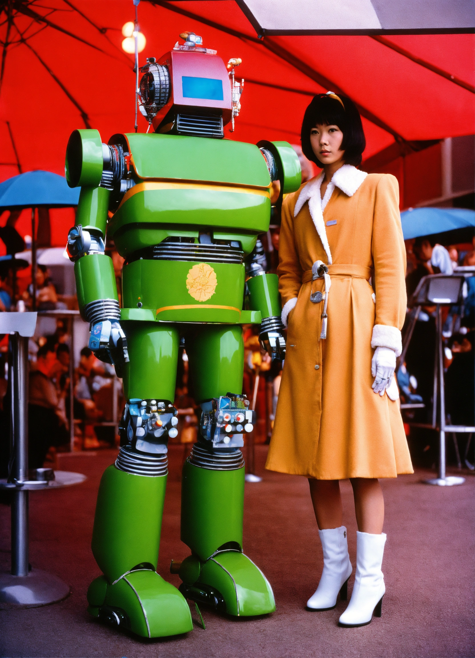 A man dressed in a robot costume next to woman in a costume, in the style of katsuhiro otomo, kodak elite chrome extra color, tetsuo hara, larry elmore, 1970–present, poolcore, ricoh ff-9d --ar 5293