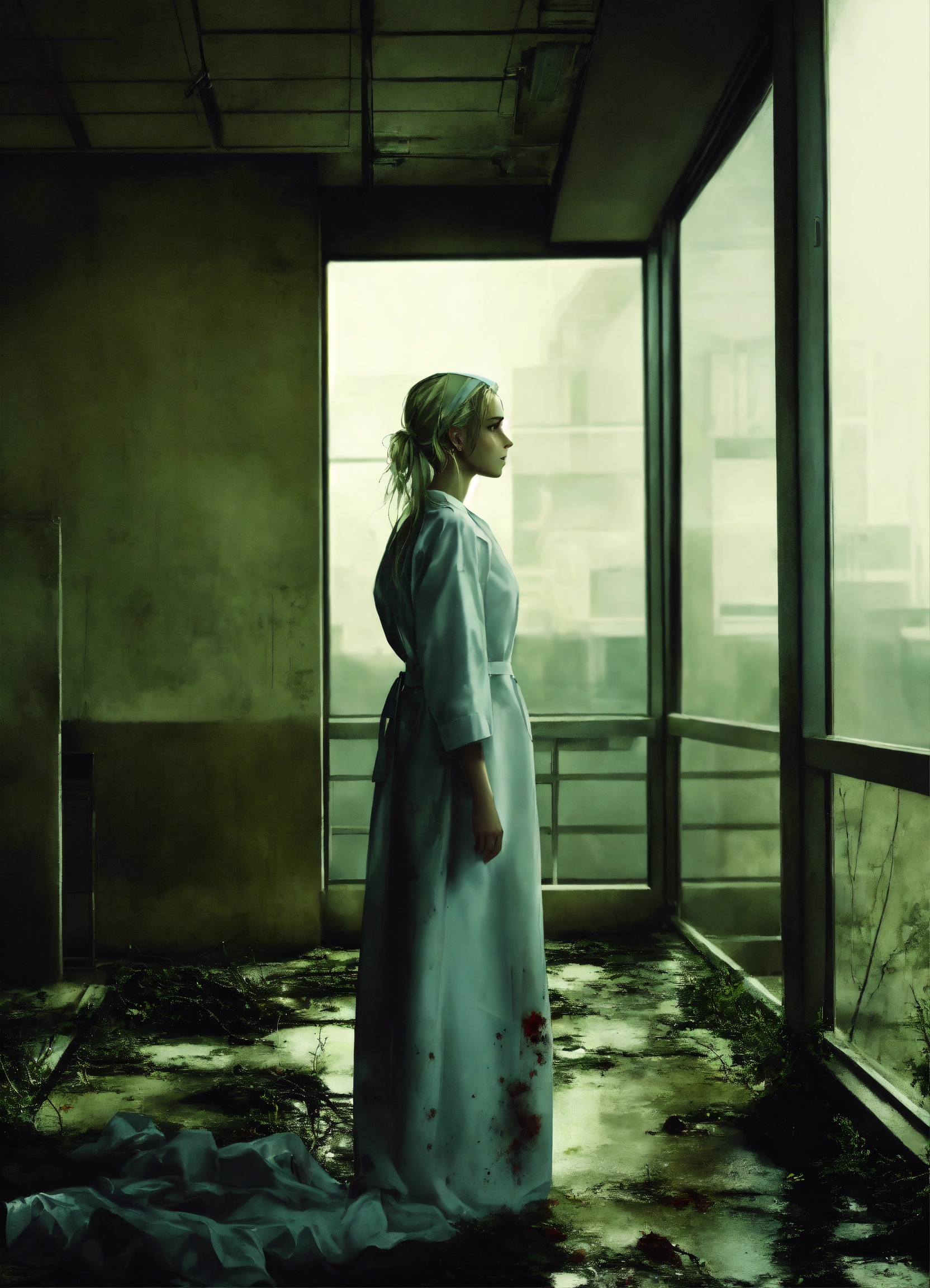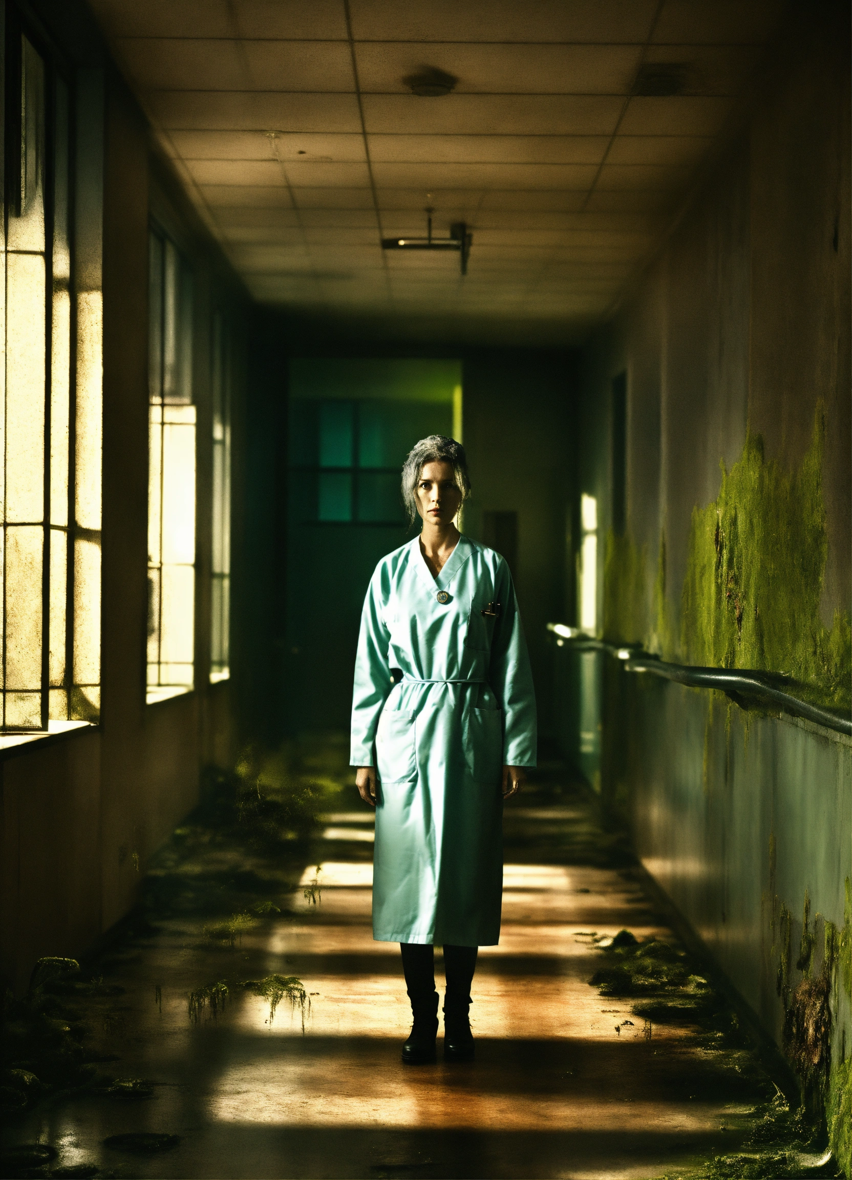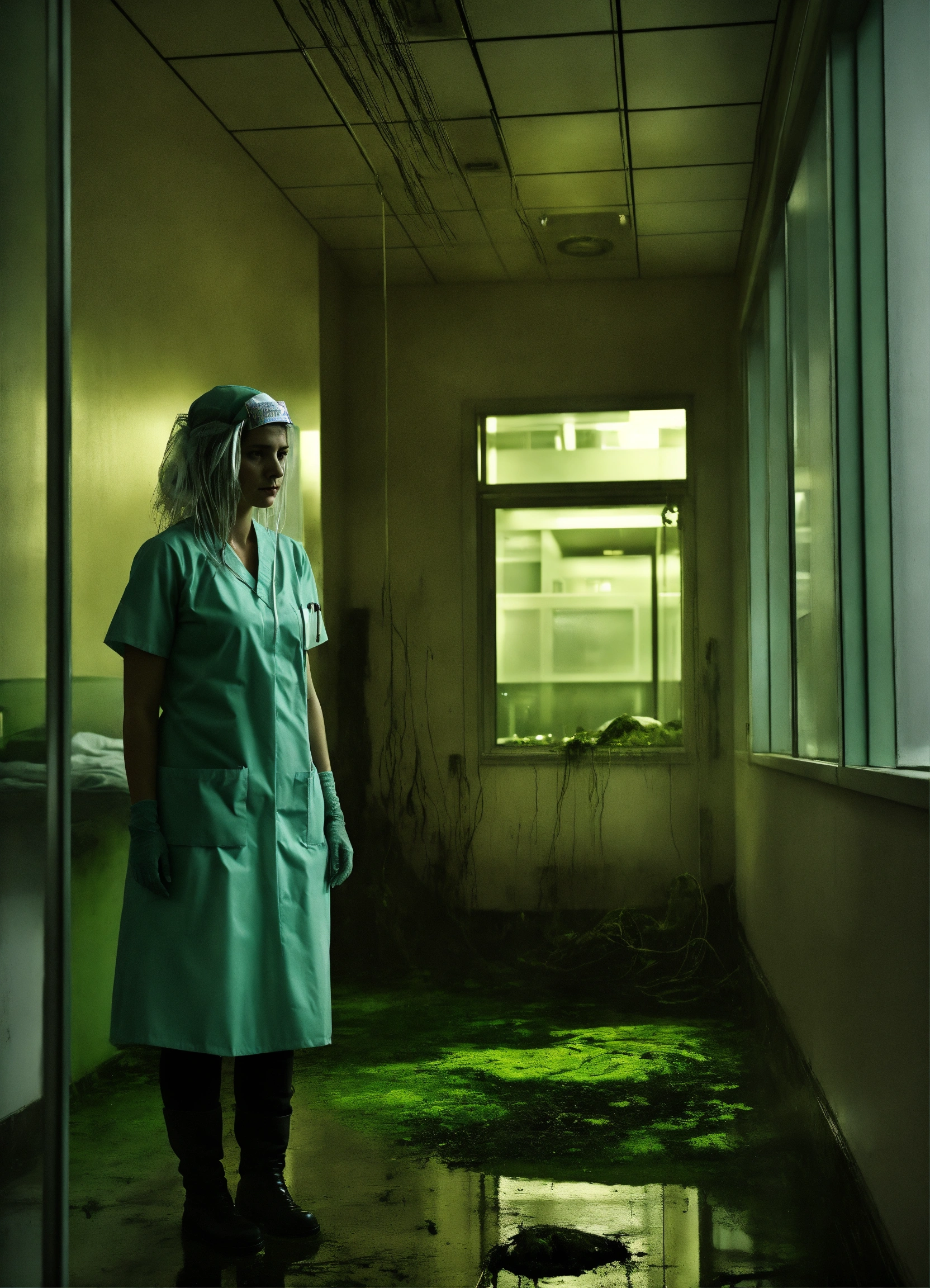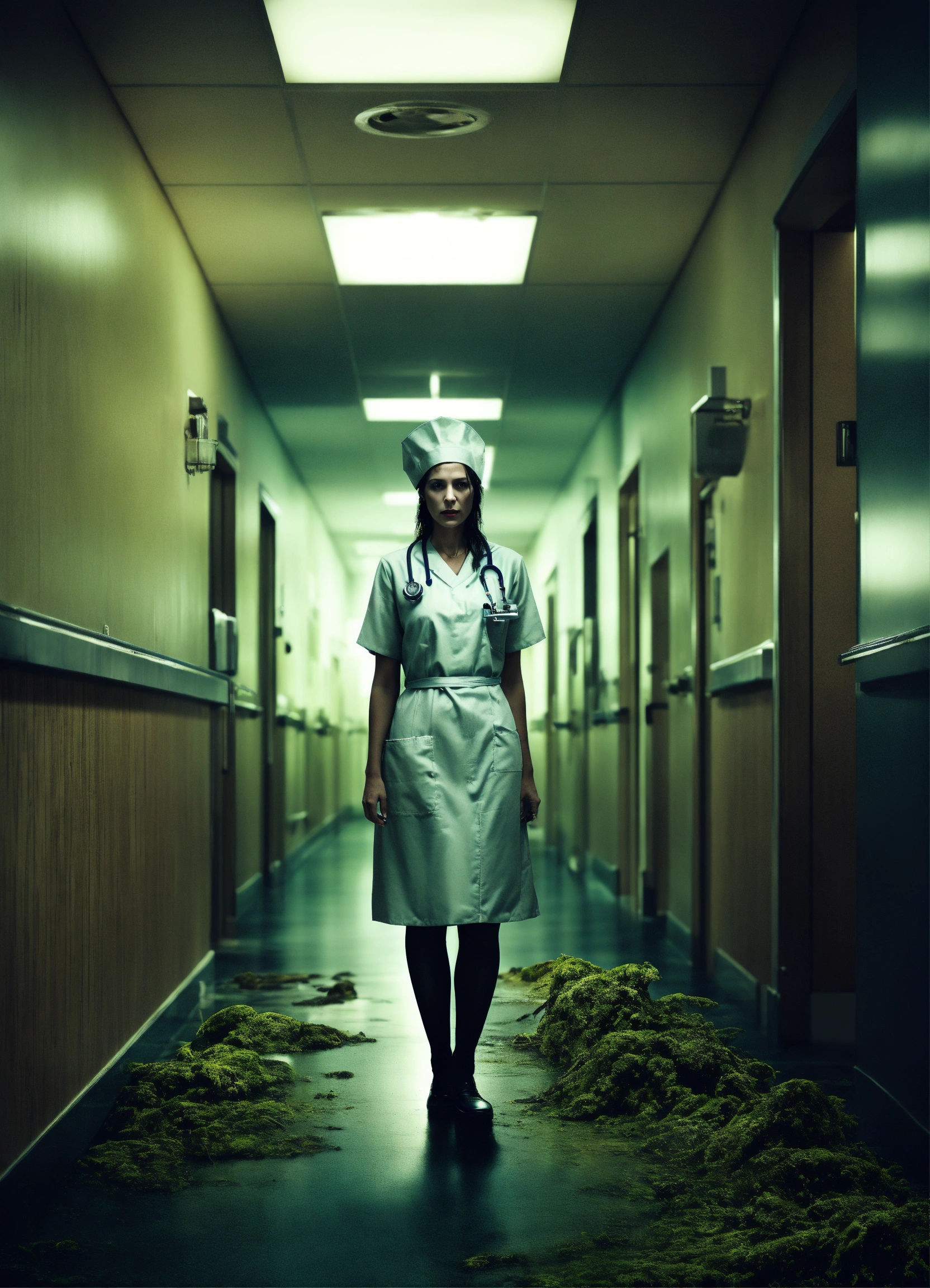 Photo realistic, eery, dark, moldy, evil nurse ghost, hospital, hair black, modern architecture, swampy