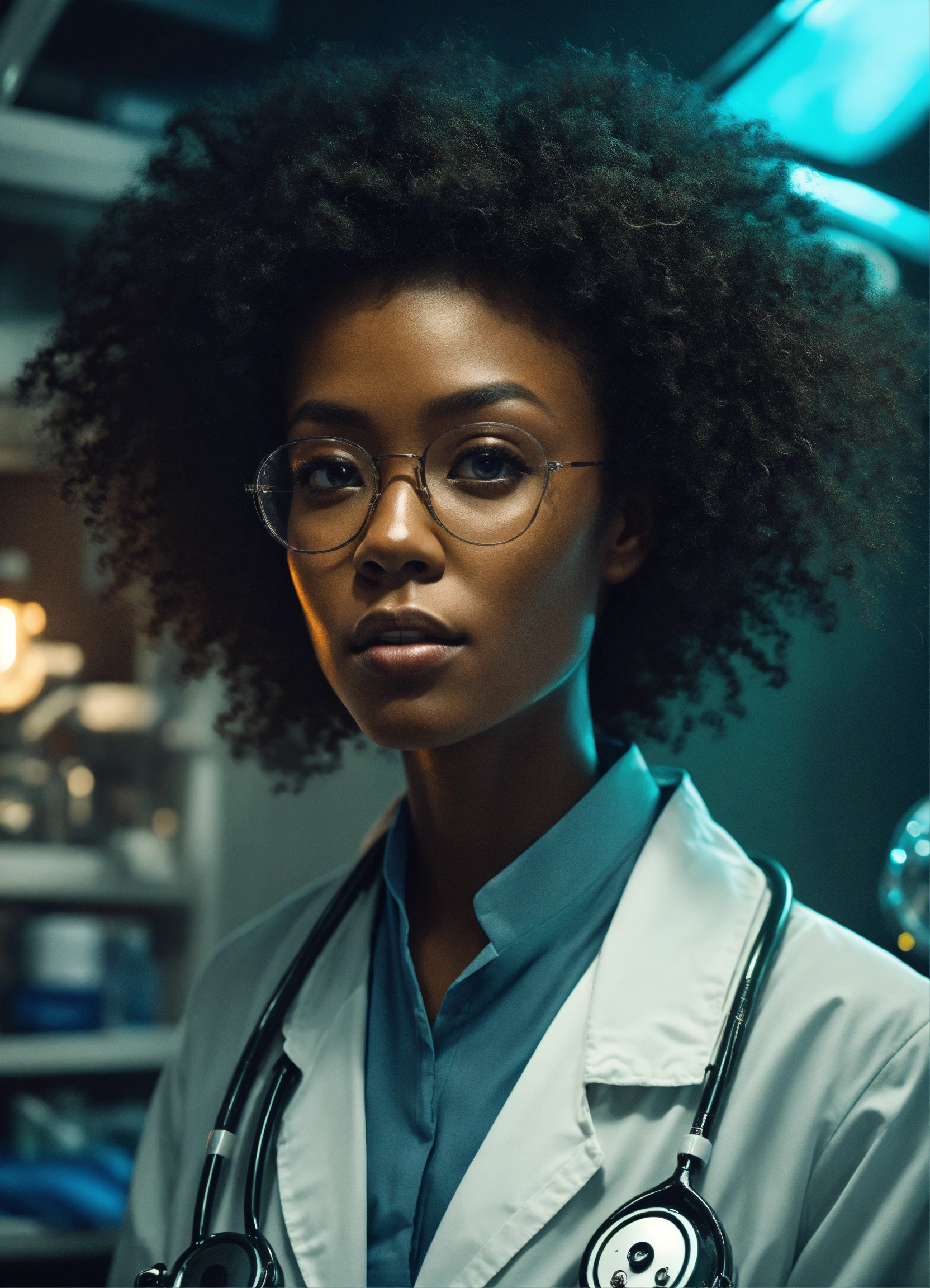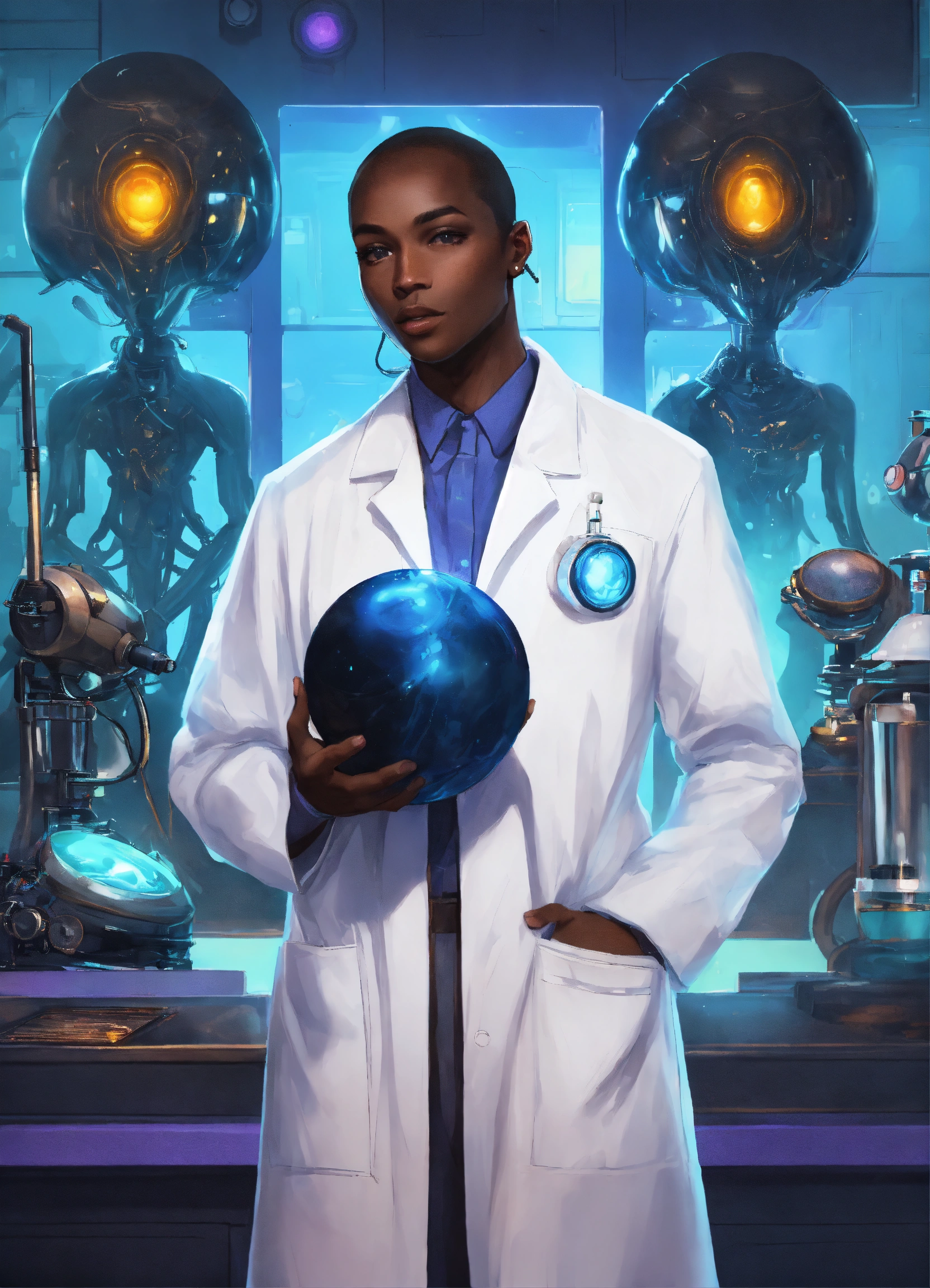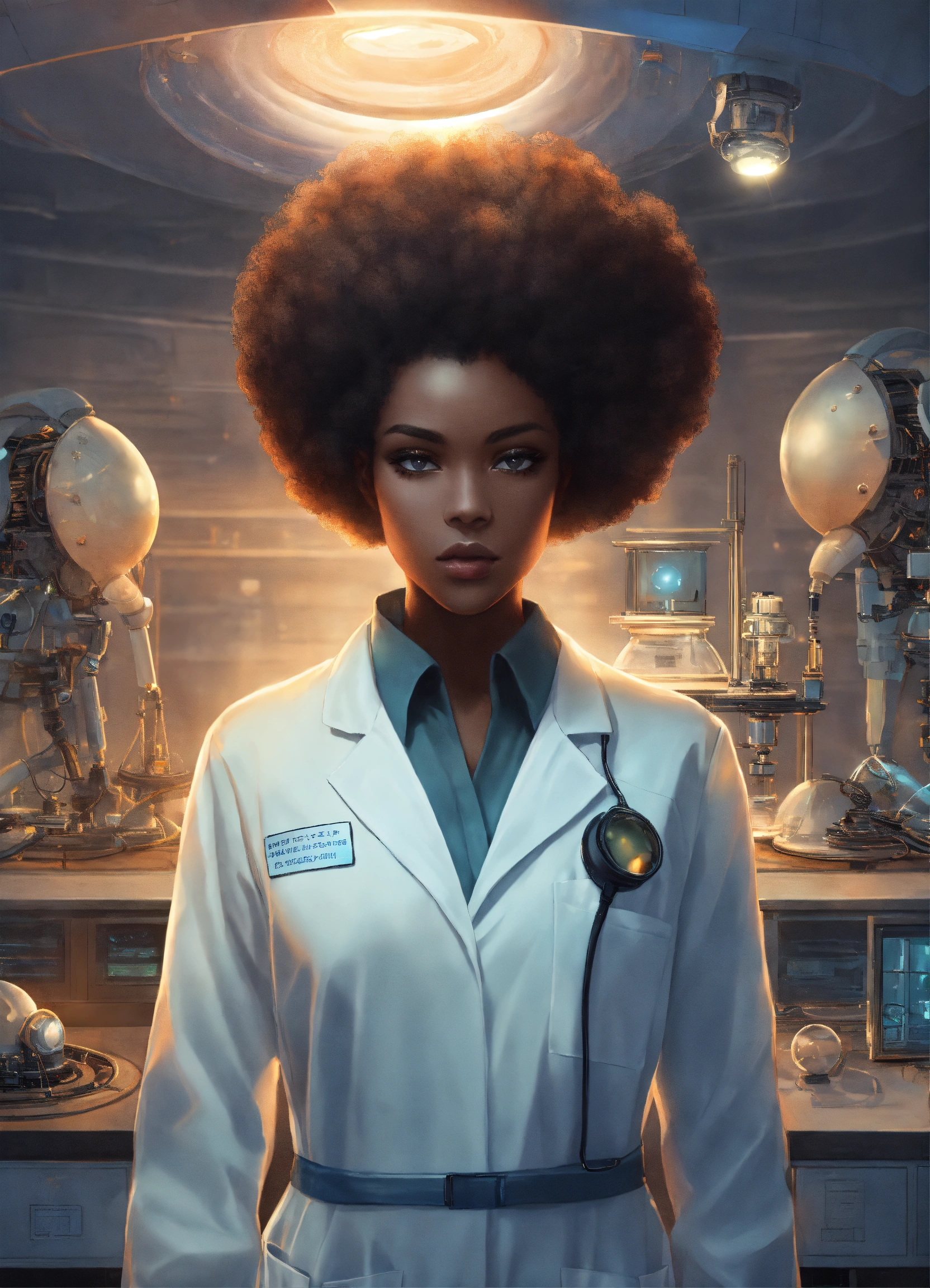 dressed in lab coat. in white lab.