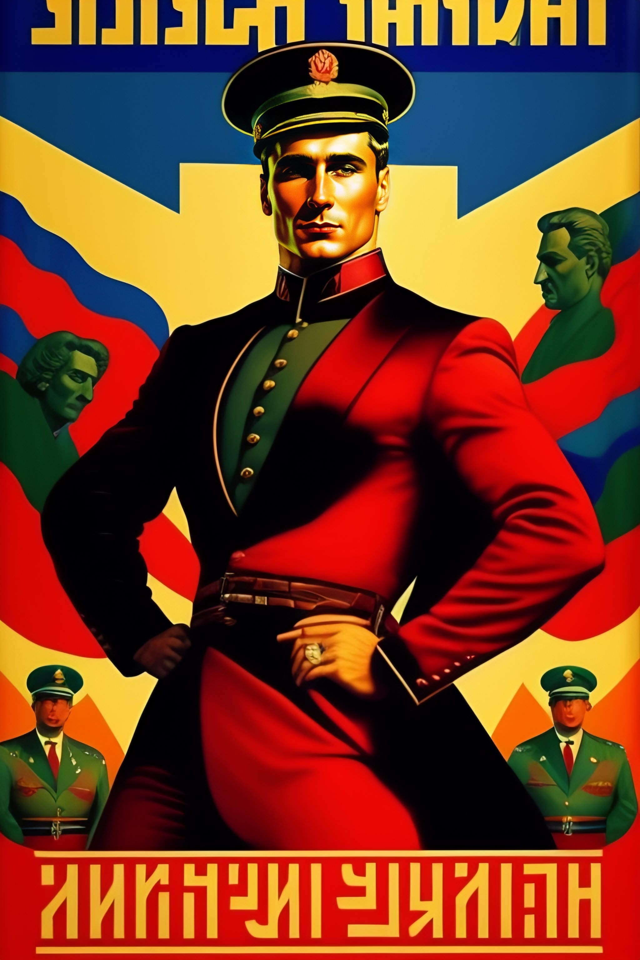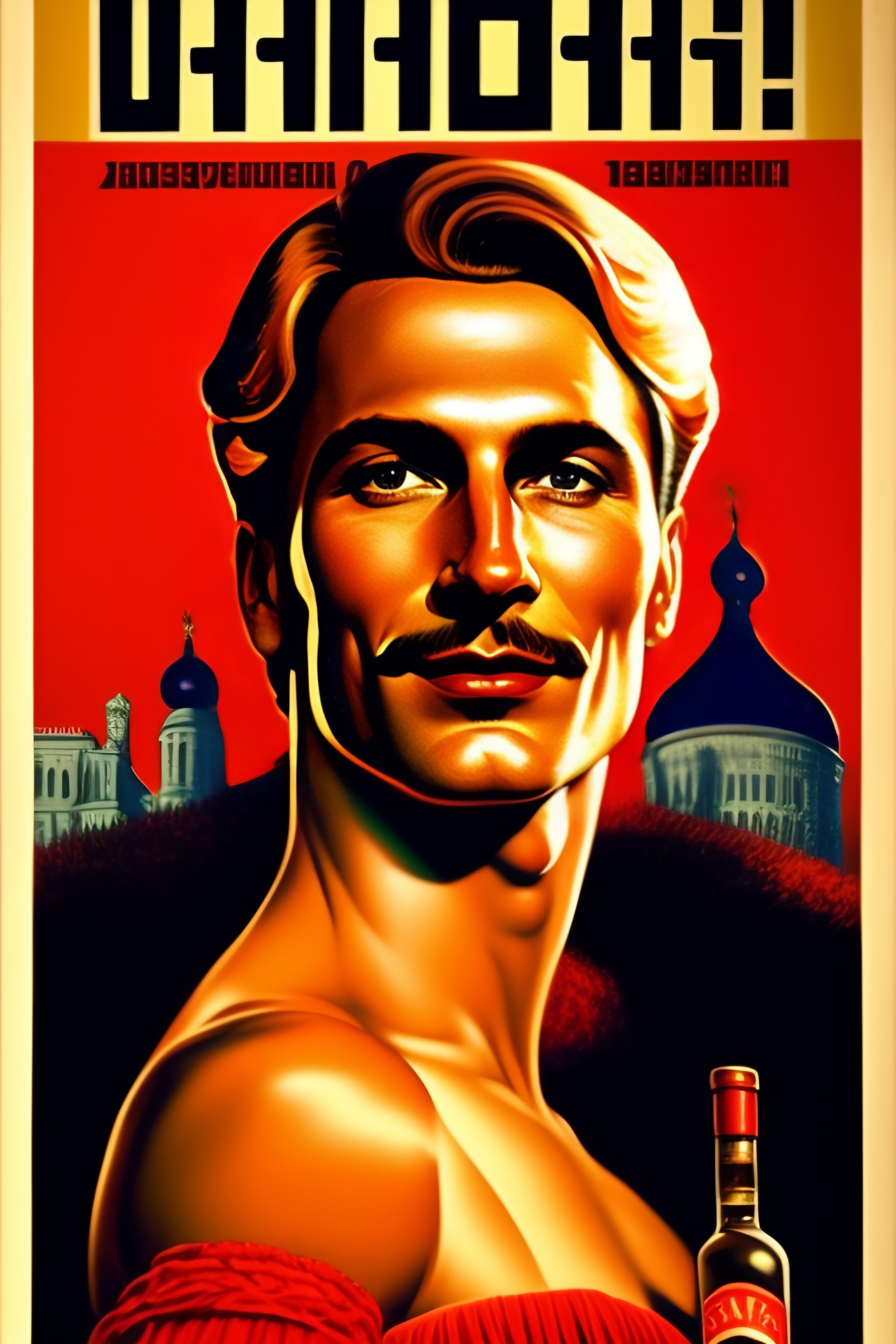 Soviet style propaganda poster with sexy putin in the image of a matador calls to drink vodka and eat cucumbers