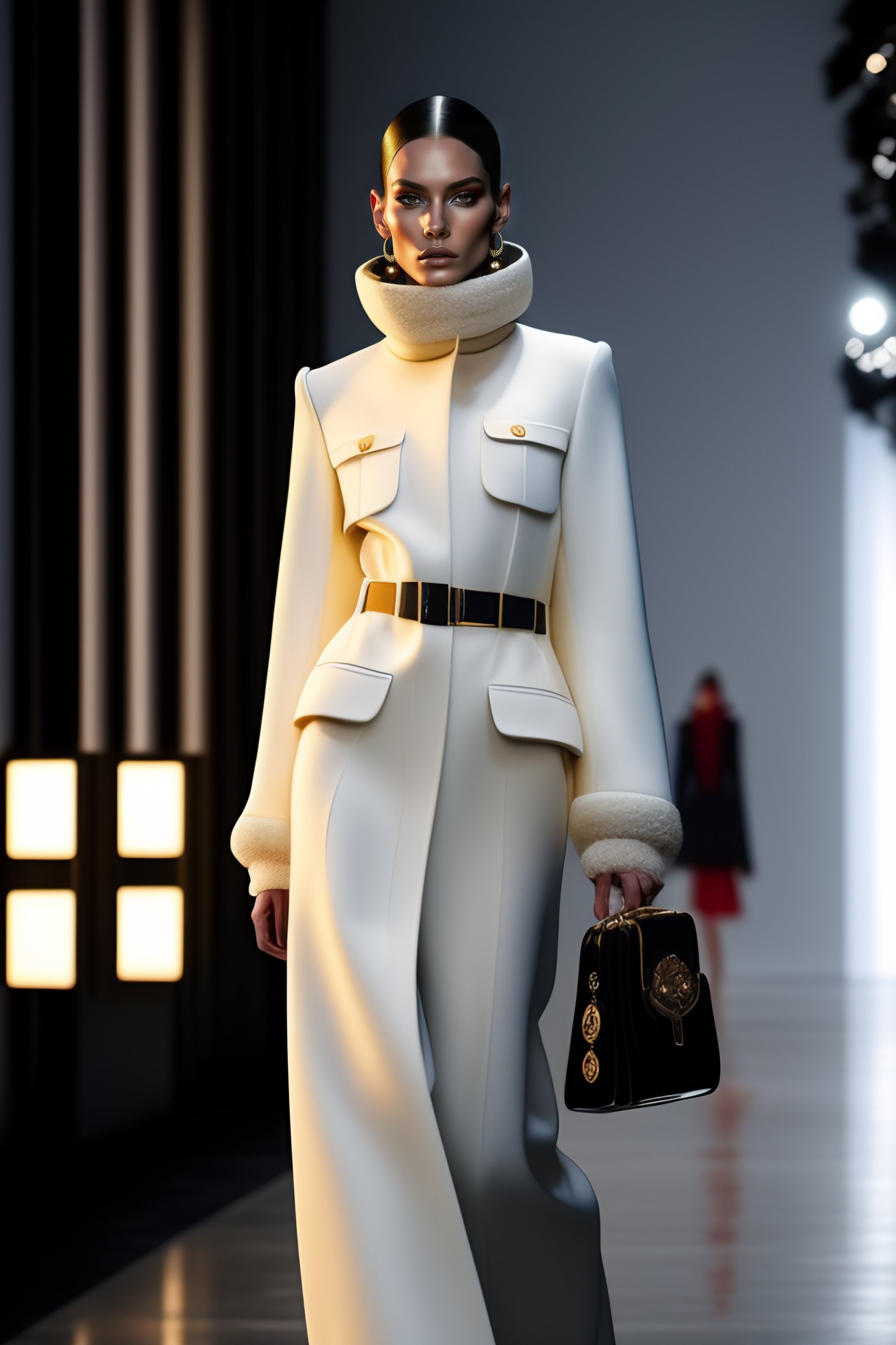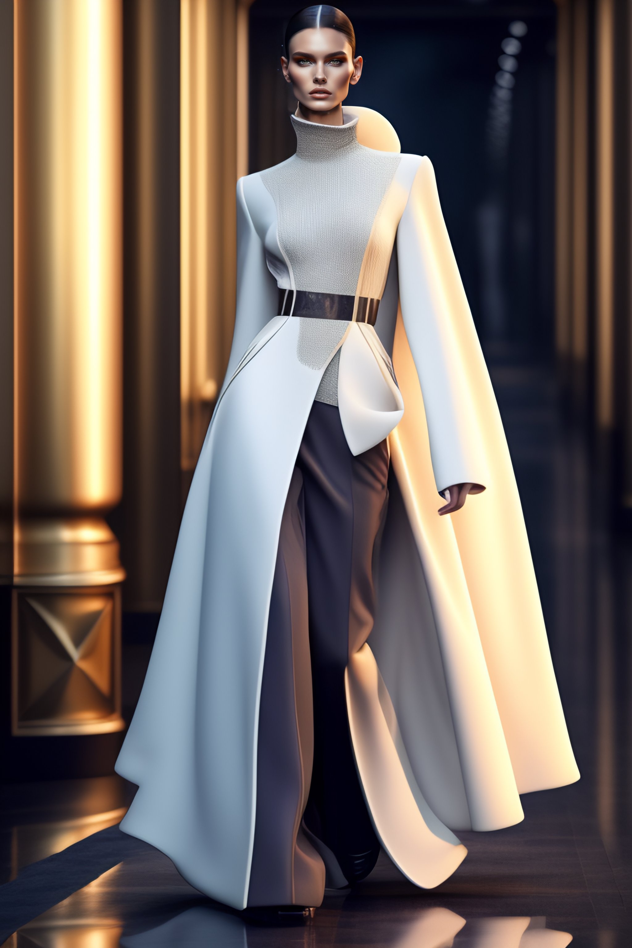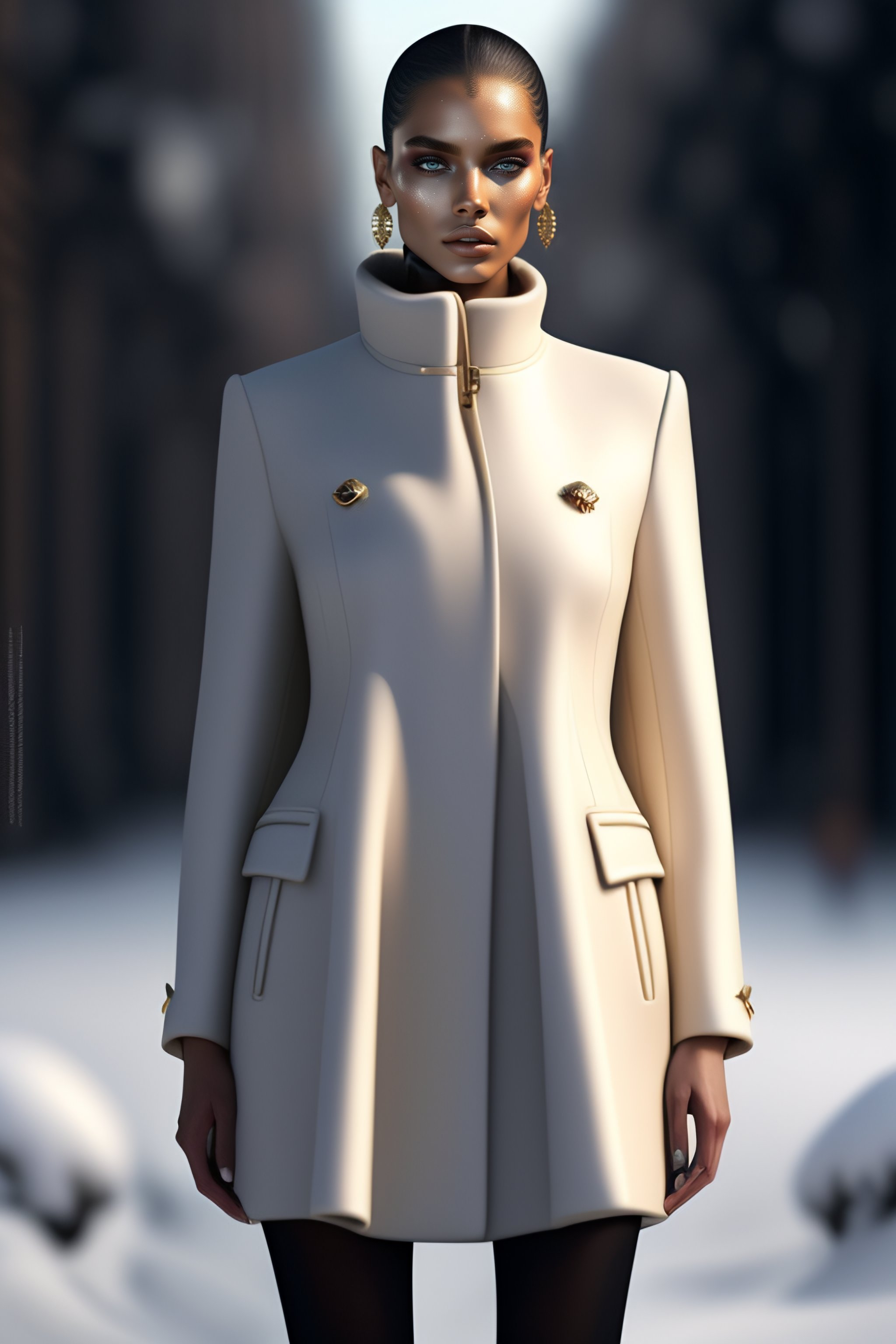 Оченть реалистичный дизайн asymmetrical, avant-garde clothing style, hyperrealism, 3d woman, snow, fashion trends fall-winter 2023, clothes, texture fabric