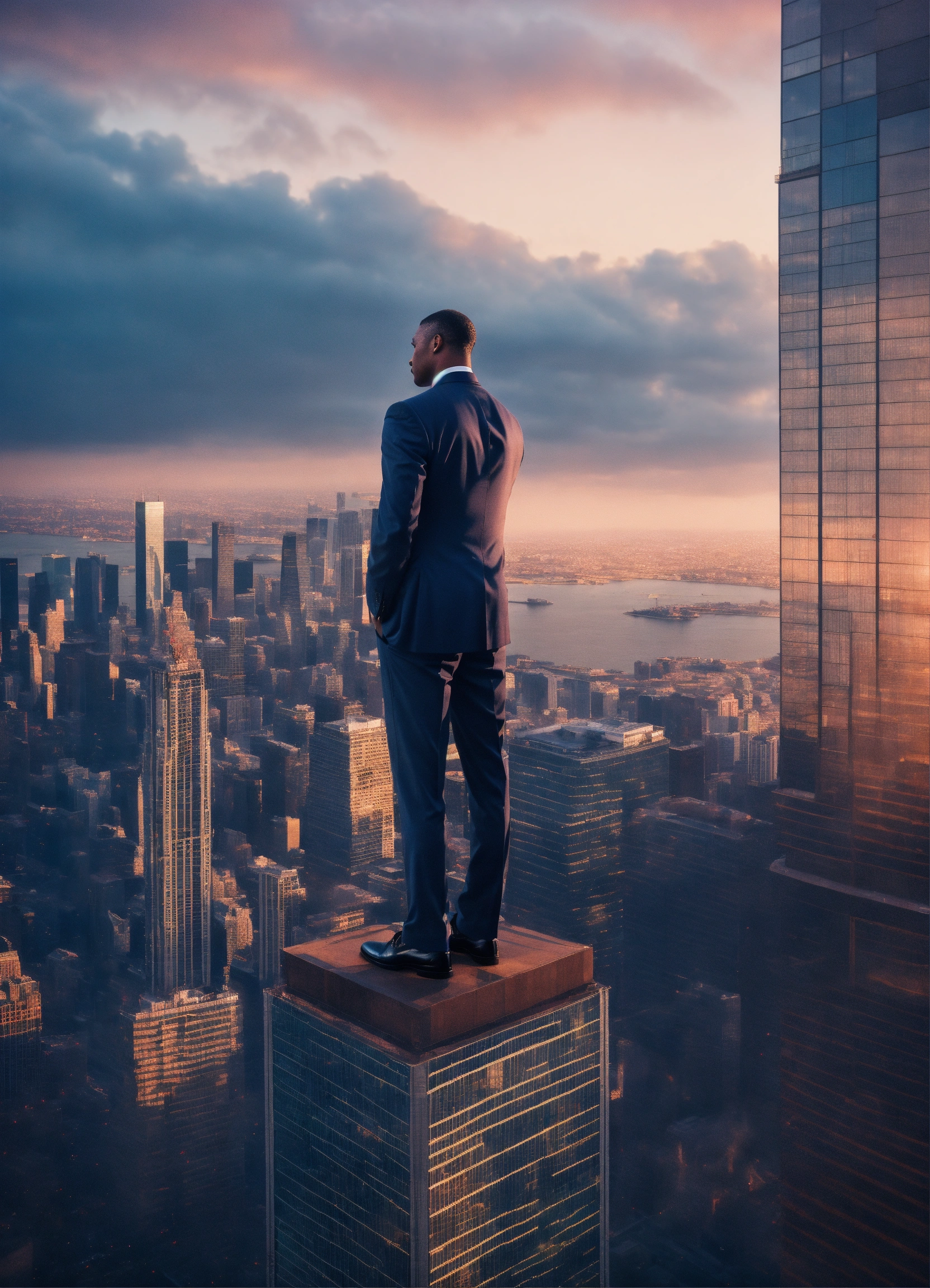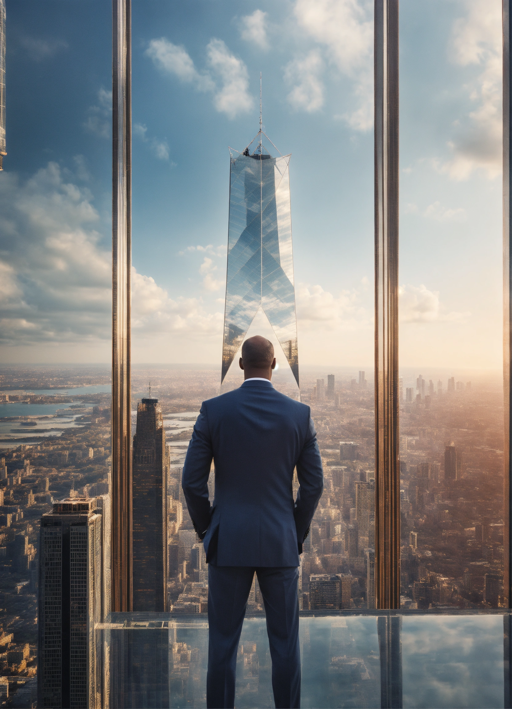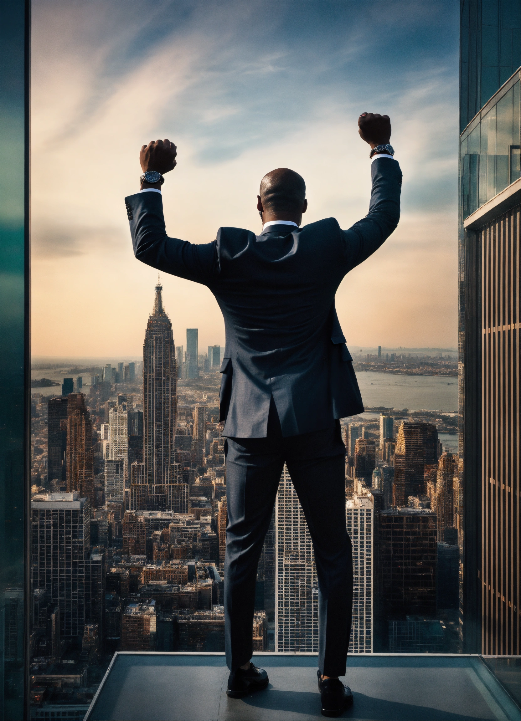 Fade away image of a man in a suit standing in the top of a luxurious skyscraper with his hands in the airwith a michael jordan jersy