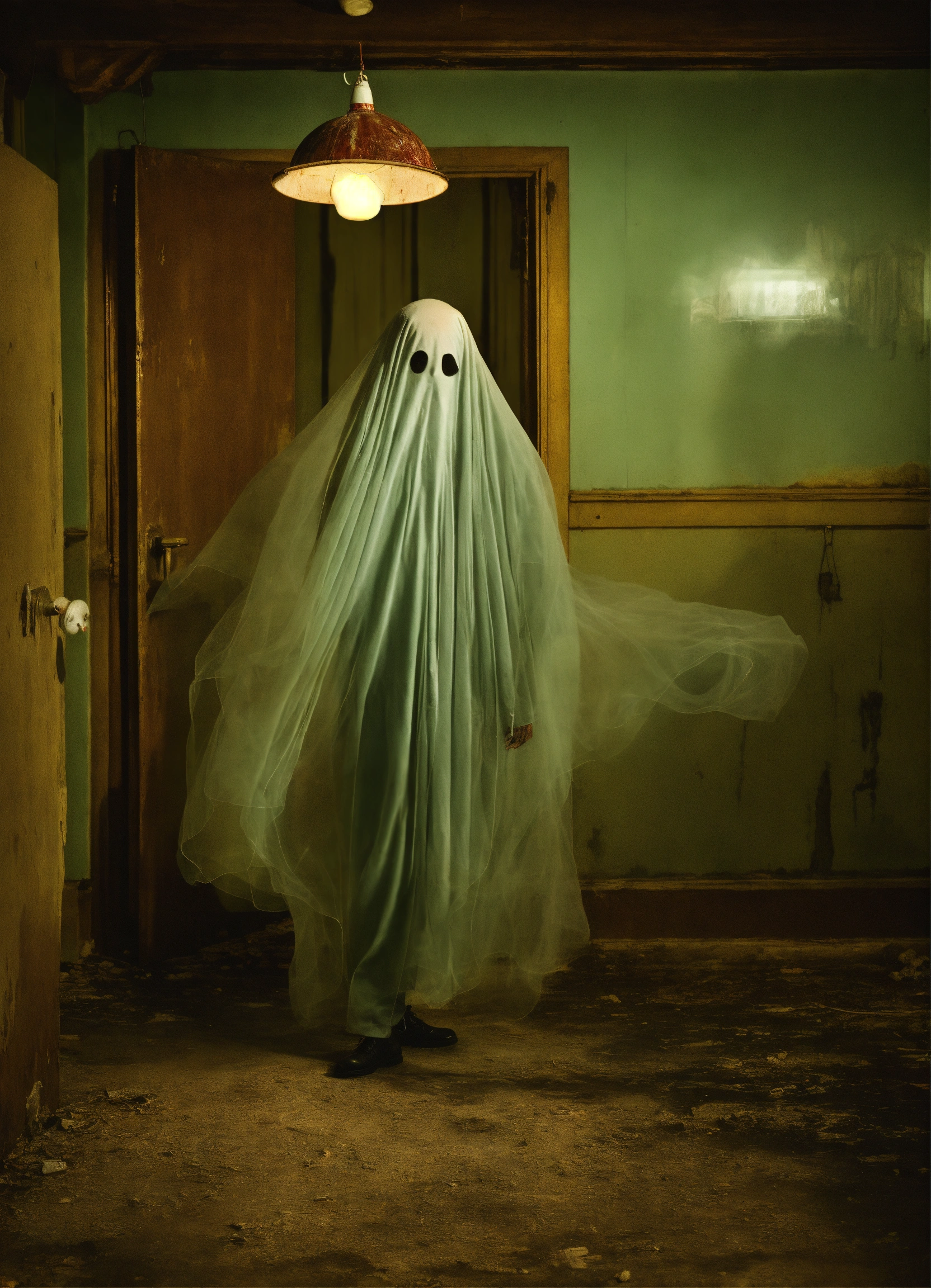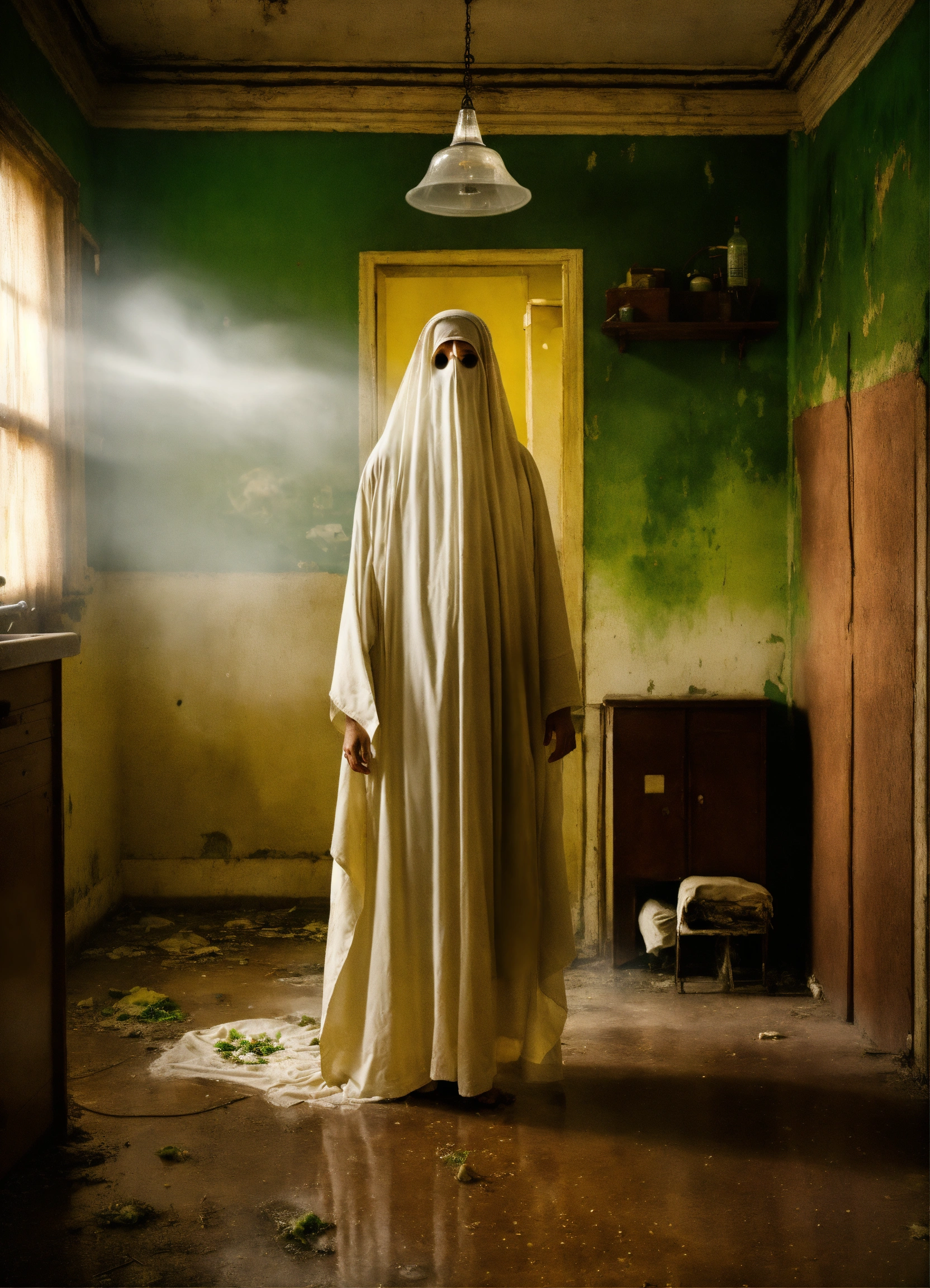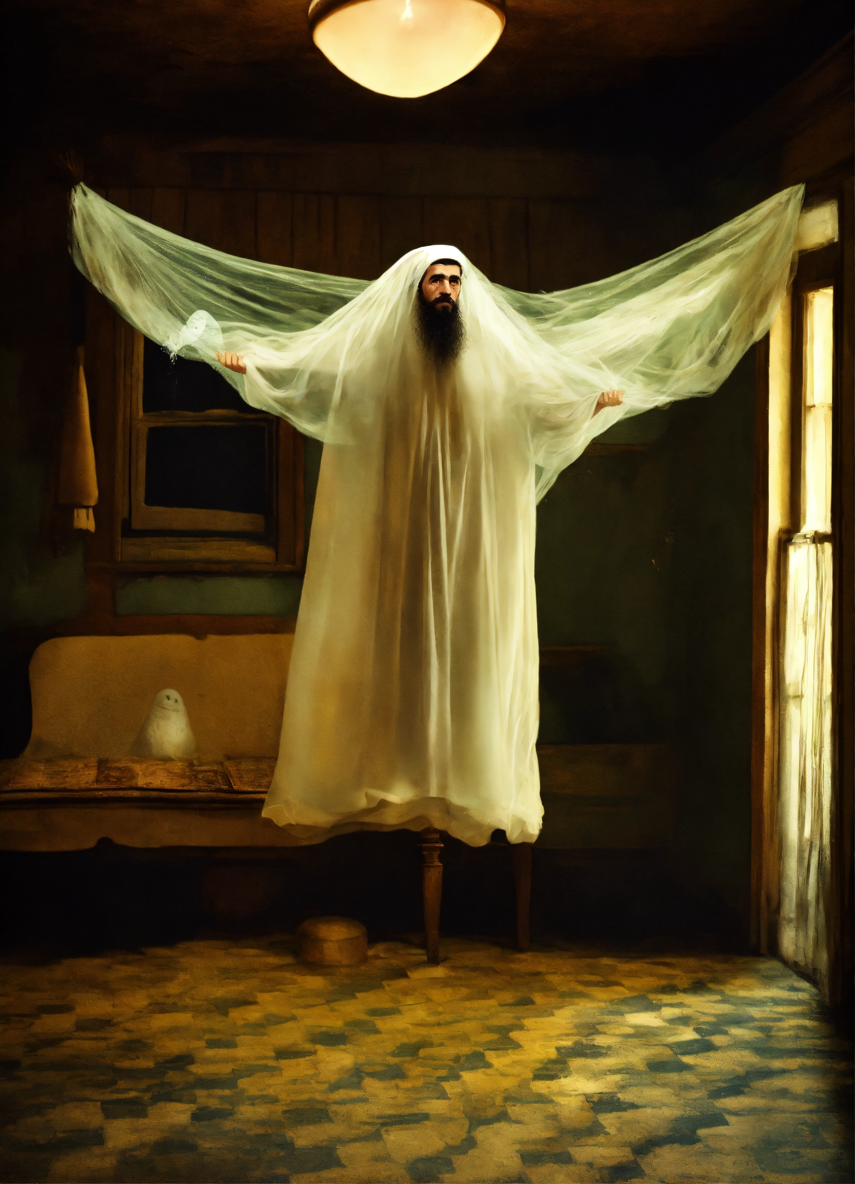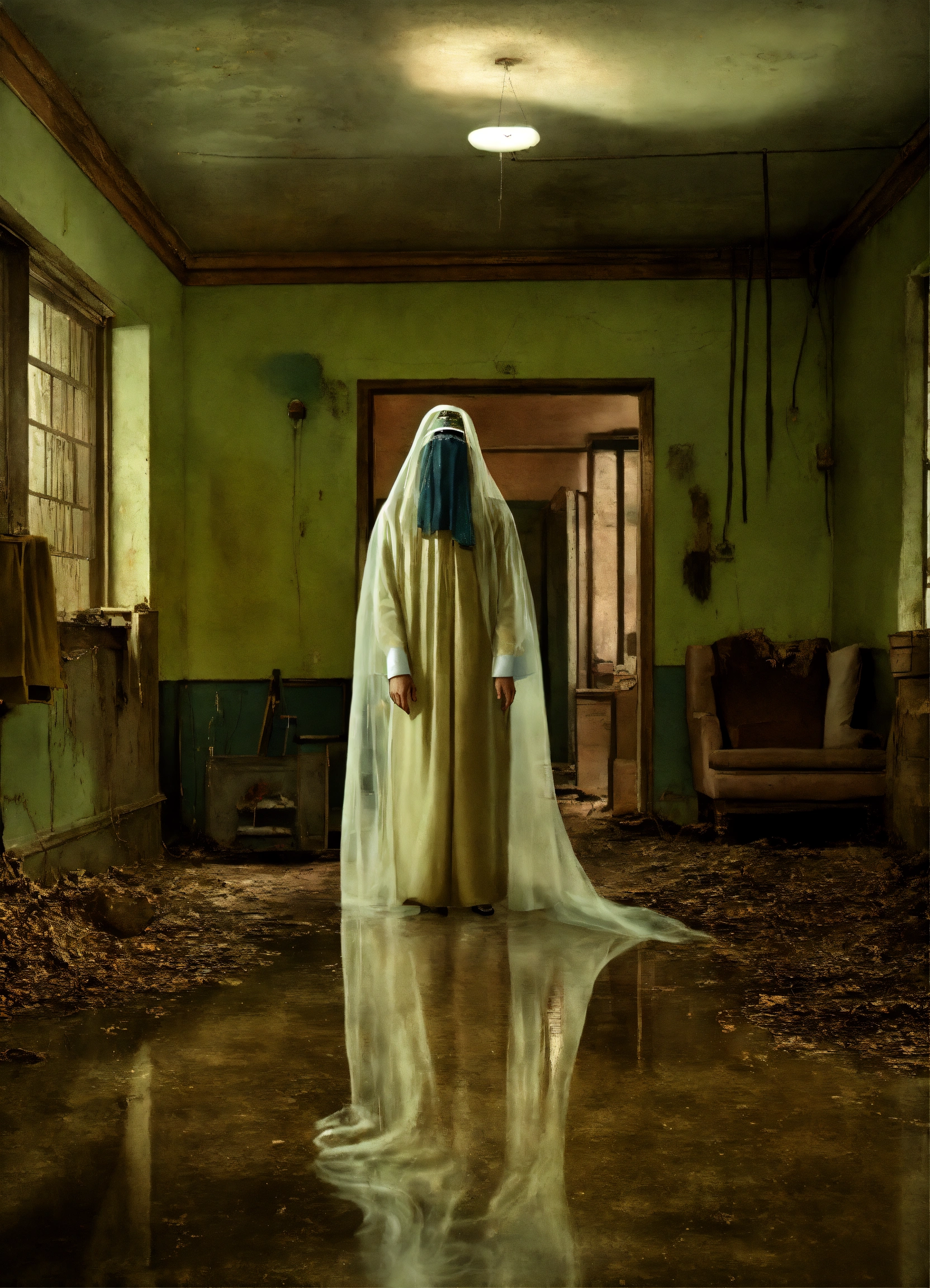 Mid-century, photo realistic, floating flying ghost see-through, haunted, abandoned, eery, dark, moldy, doctor, dirty water, mental asylum, hair, dishdasha, arab man