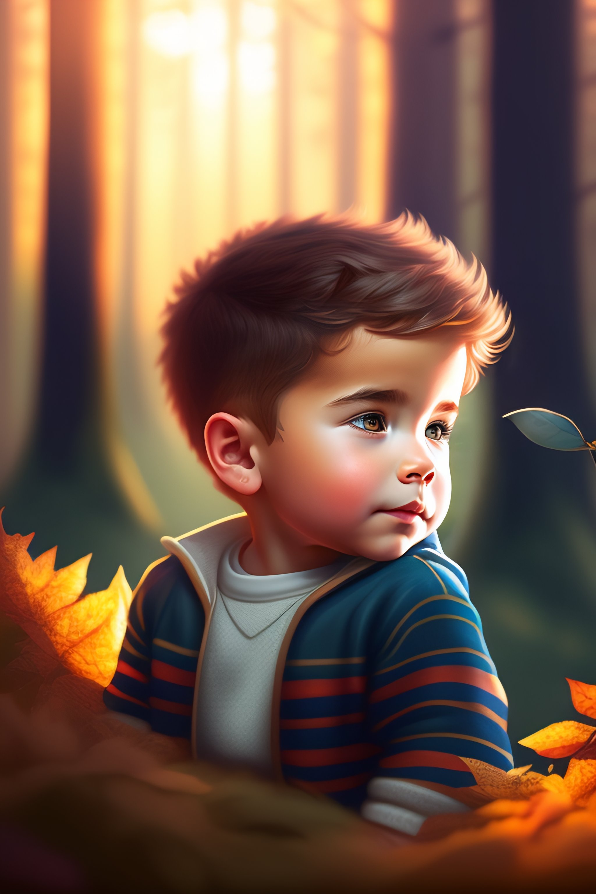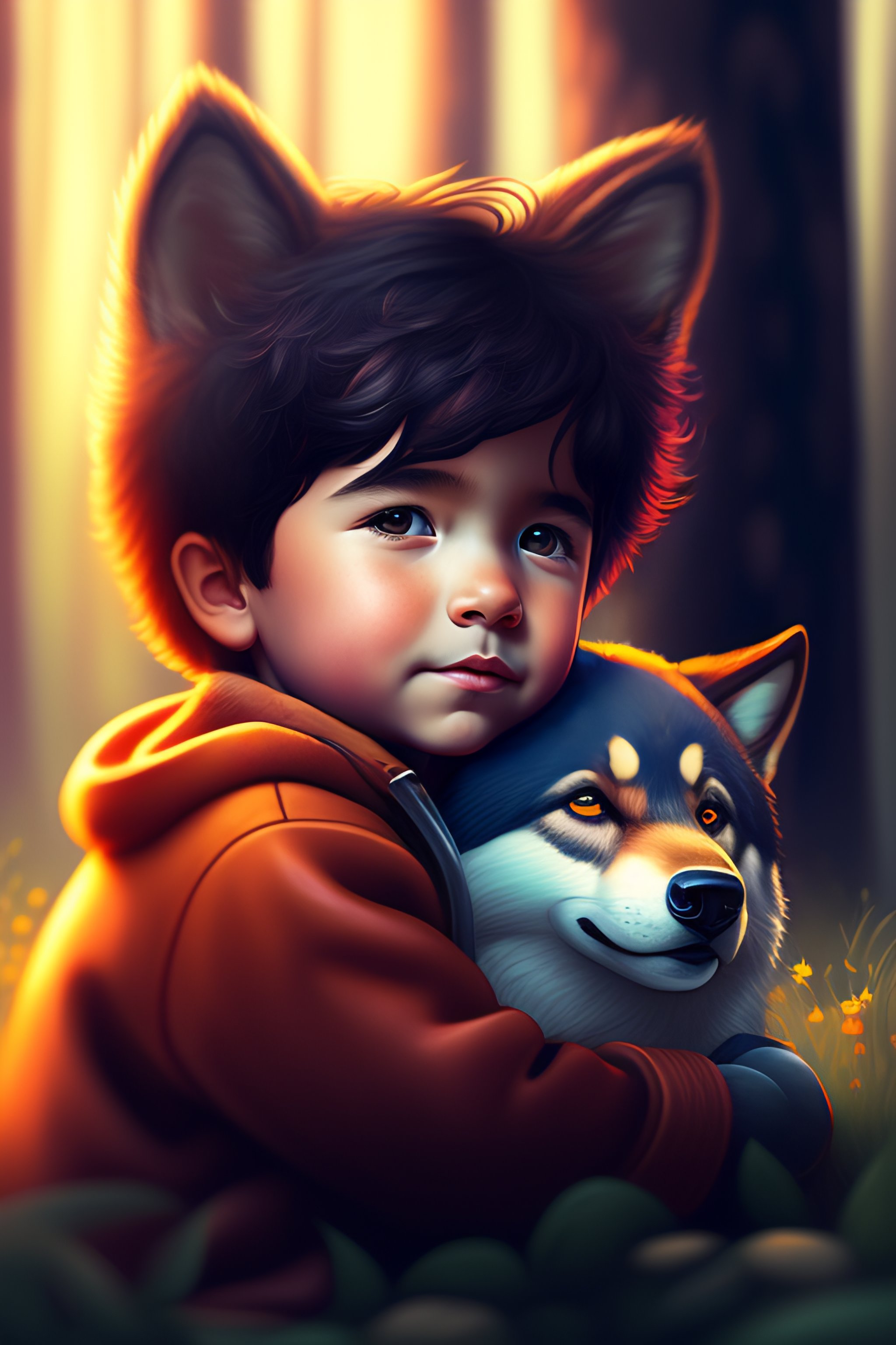 A cinematic portrait of a little boy cuddling with a big wolf with a background of woods, portrait, digital painting, artstation, concept art, illustration, artgerm, children's cartoon