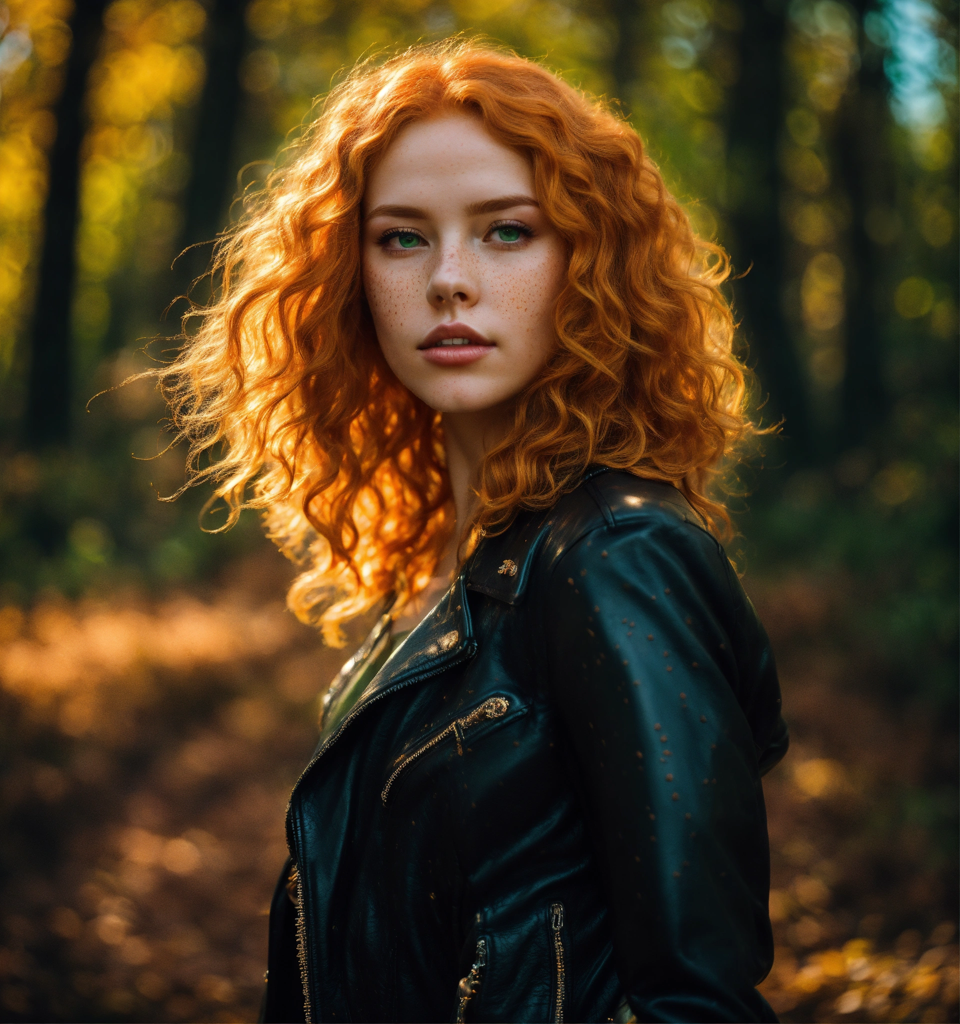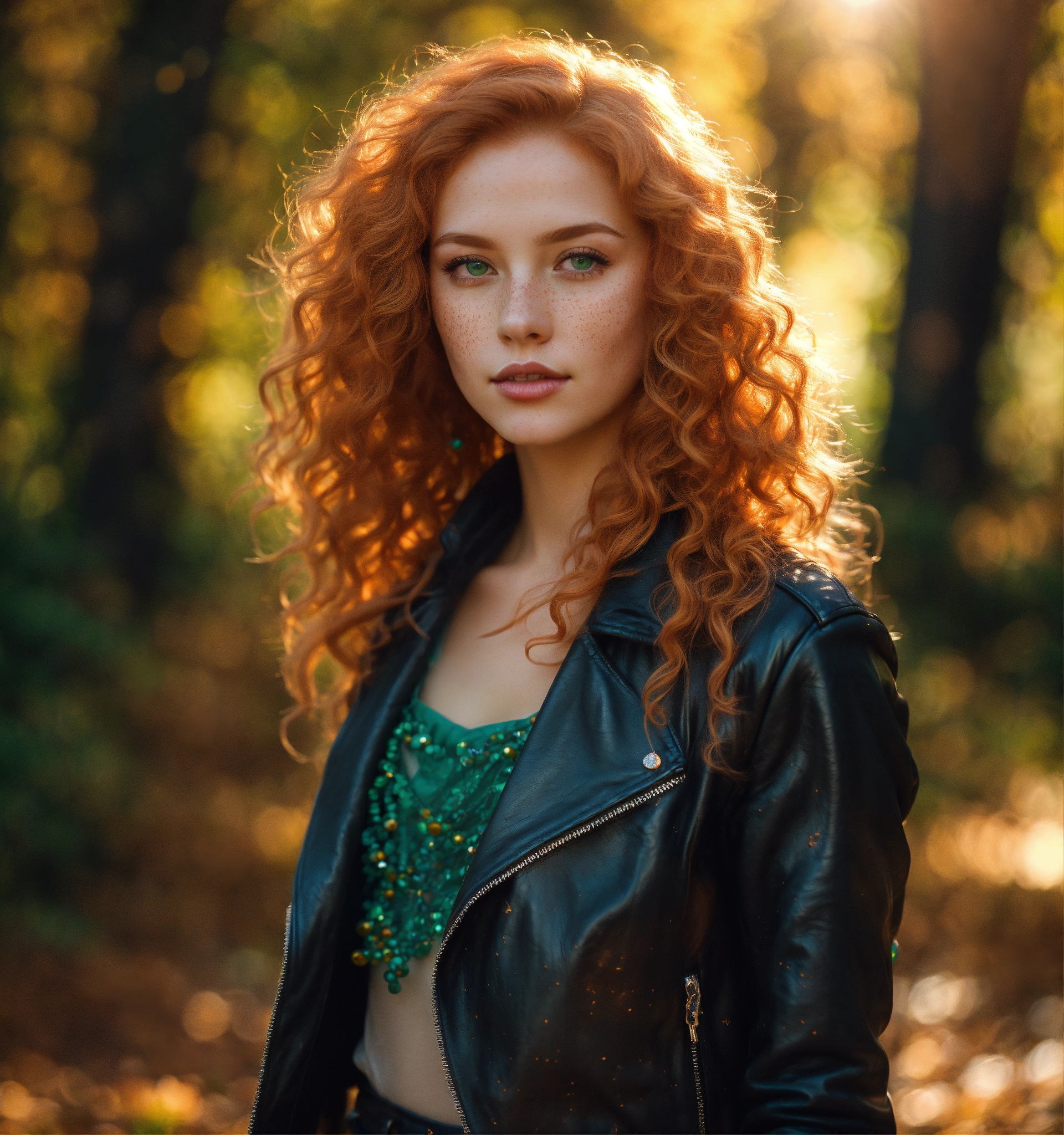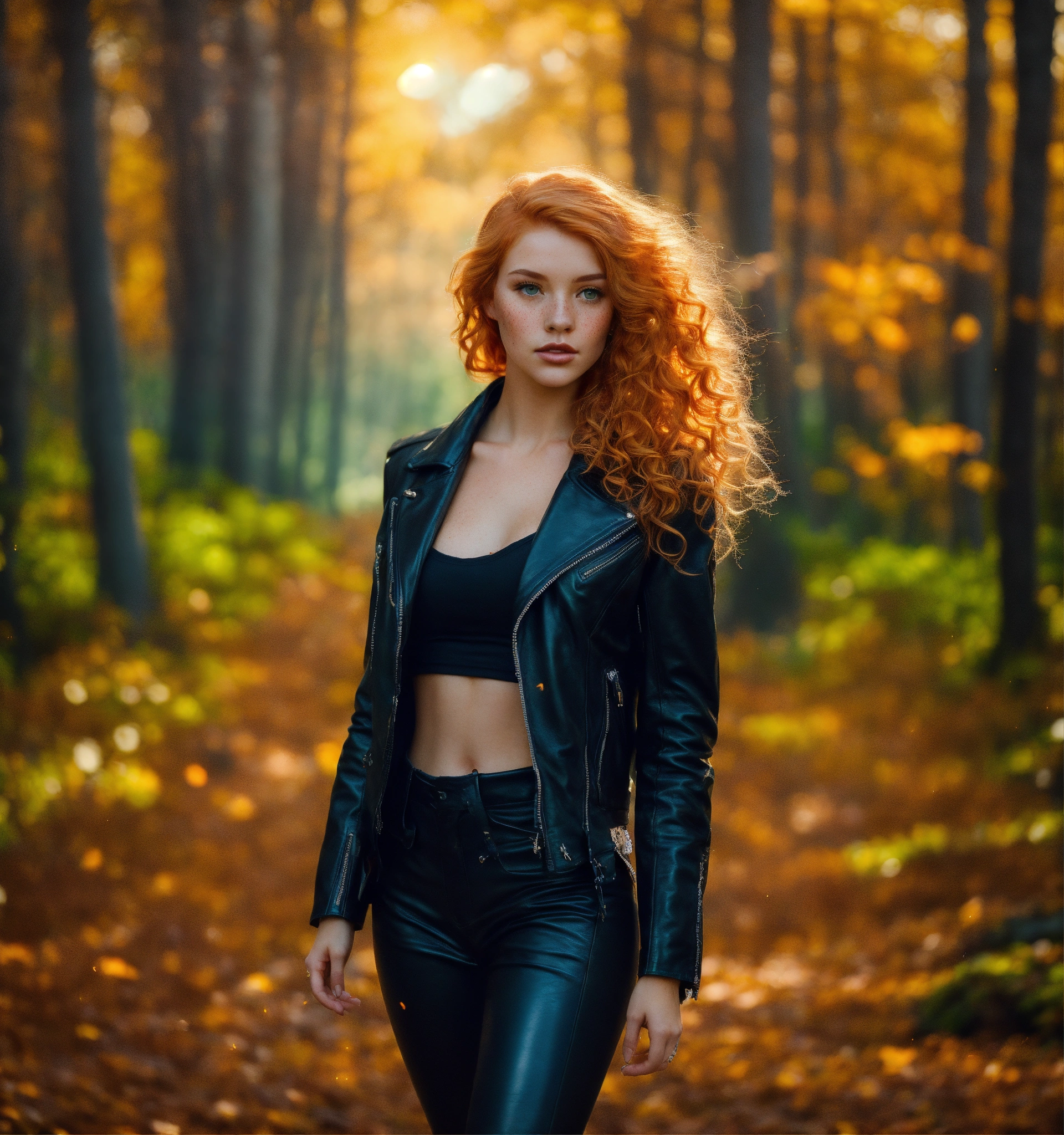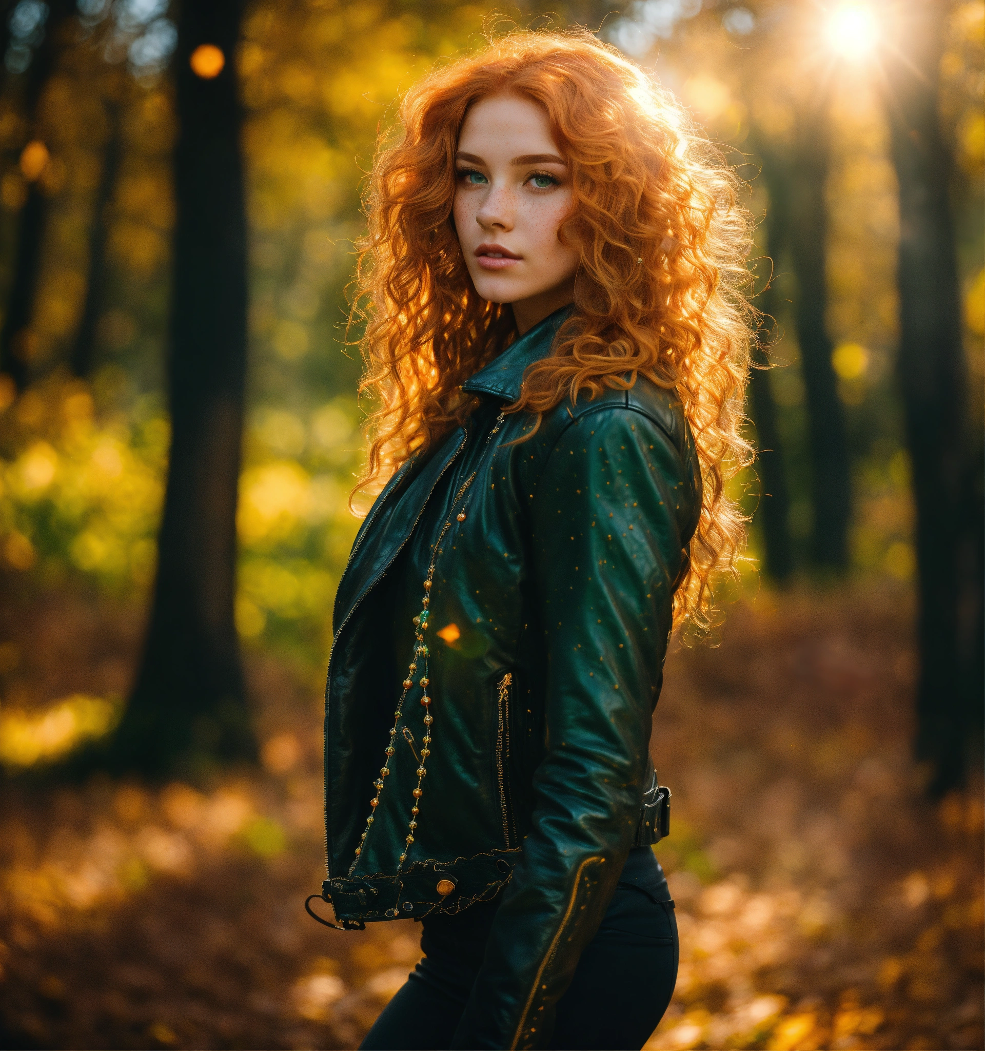 Two bright, strawberry blonde-haired, with freckles. 30 year old 38 inch bustline anf full lips, green eyes, wearing a black leather jacket and pants and amber strands and beads the sun, the autumn forest, fantastic beauty. curls. ultra-detailed dreamlike, photography 8k resolution image, translucent and ethereal. full body walking