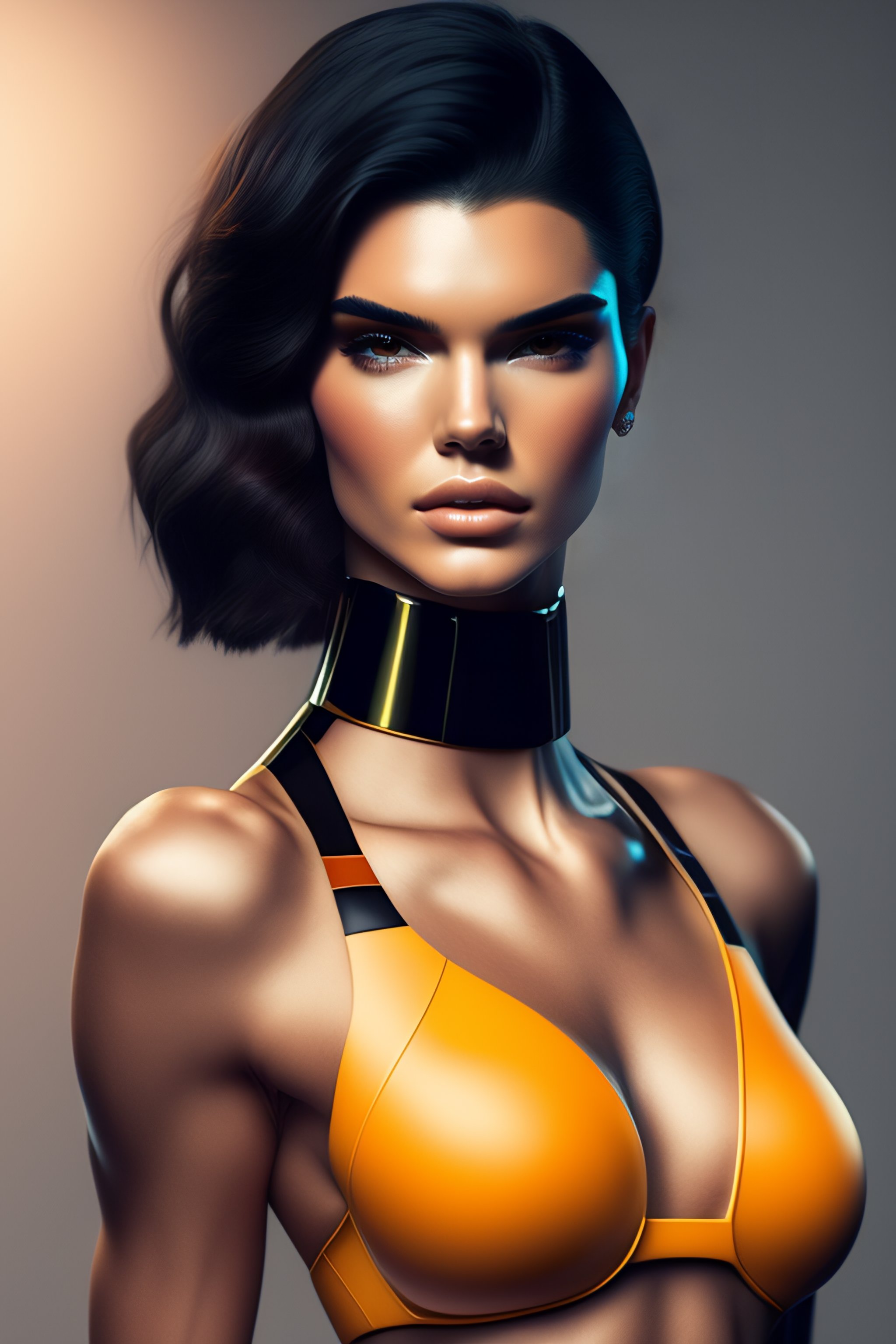 2500 future kendall jenner robot, athletic body, full body product photography, double round, tiny waist, pretty face, concept art