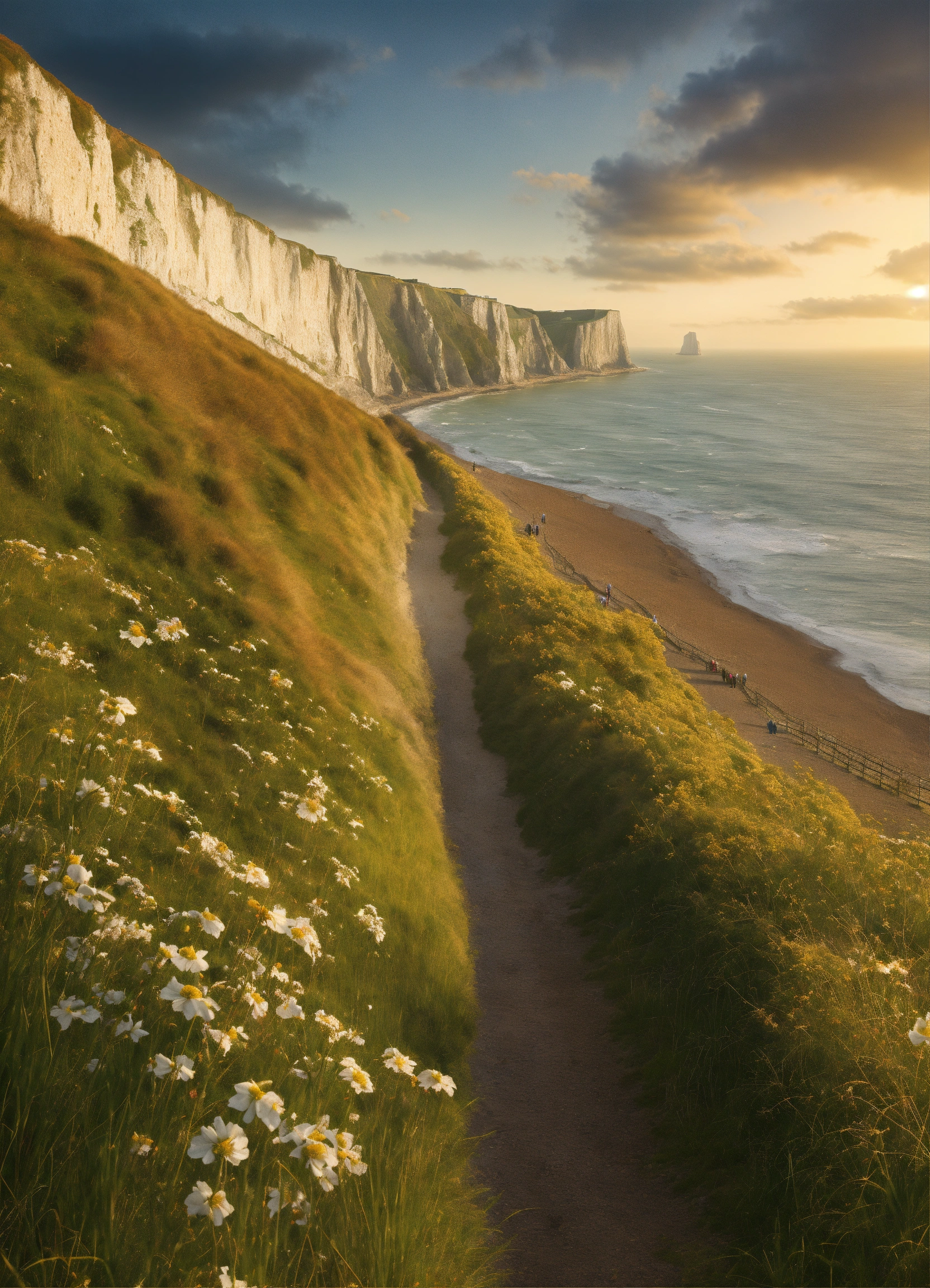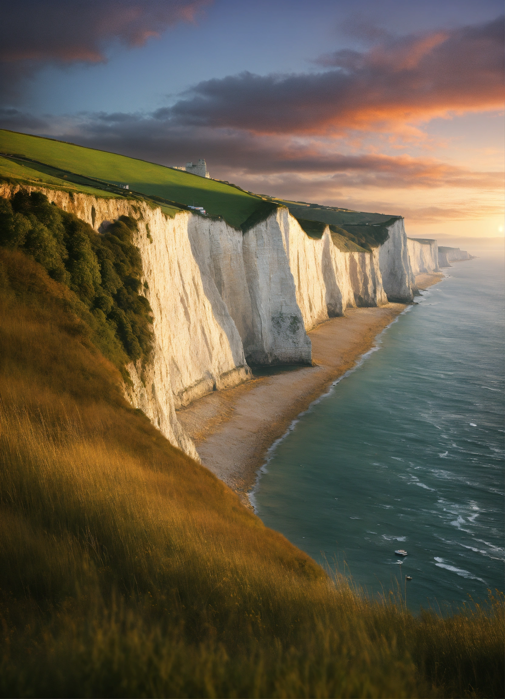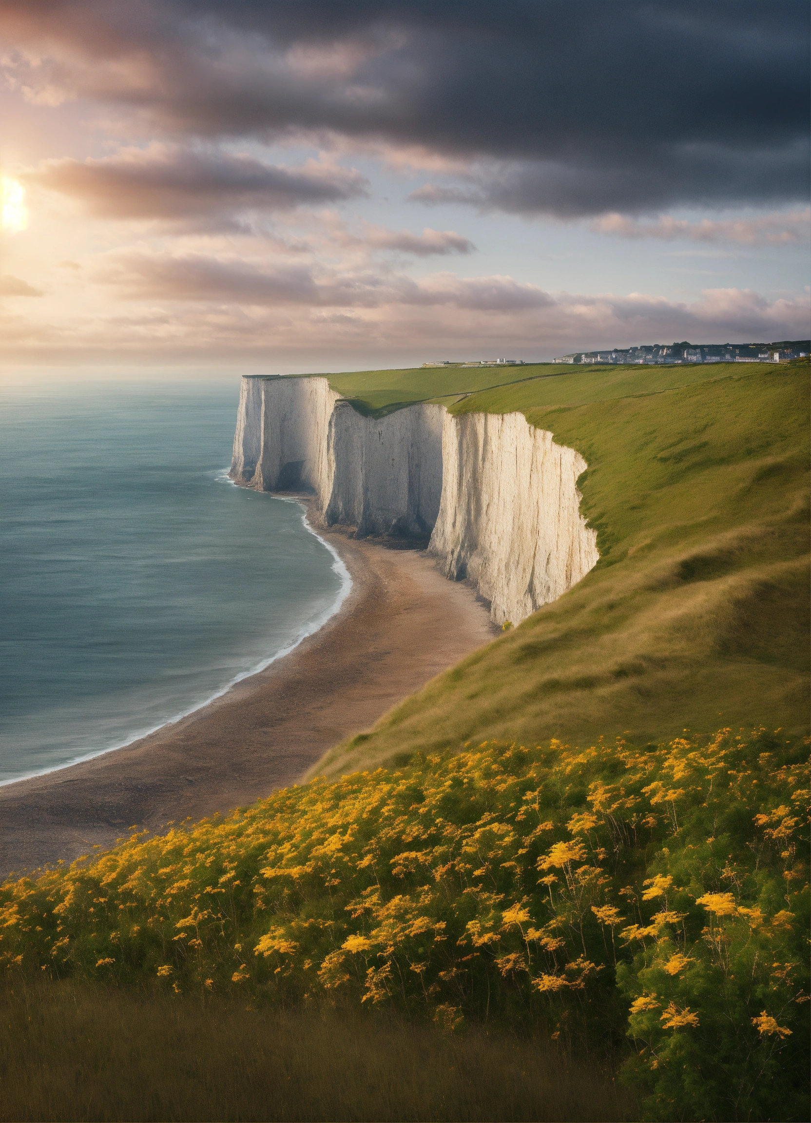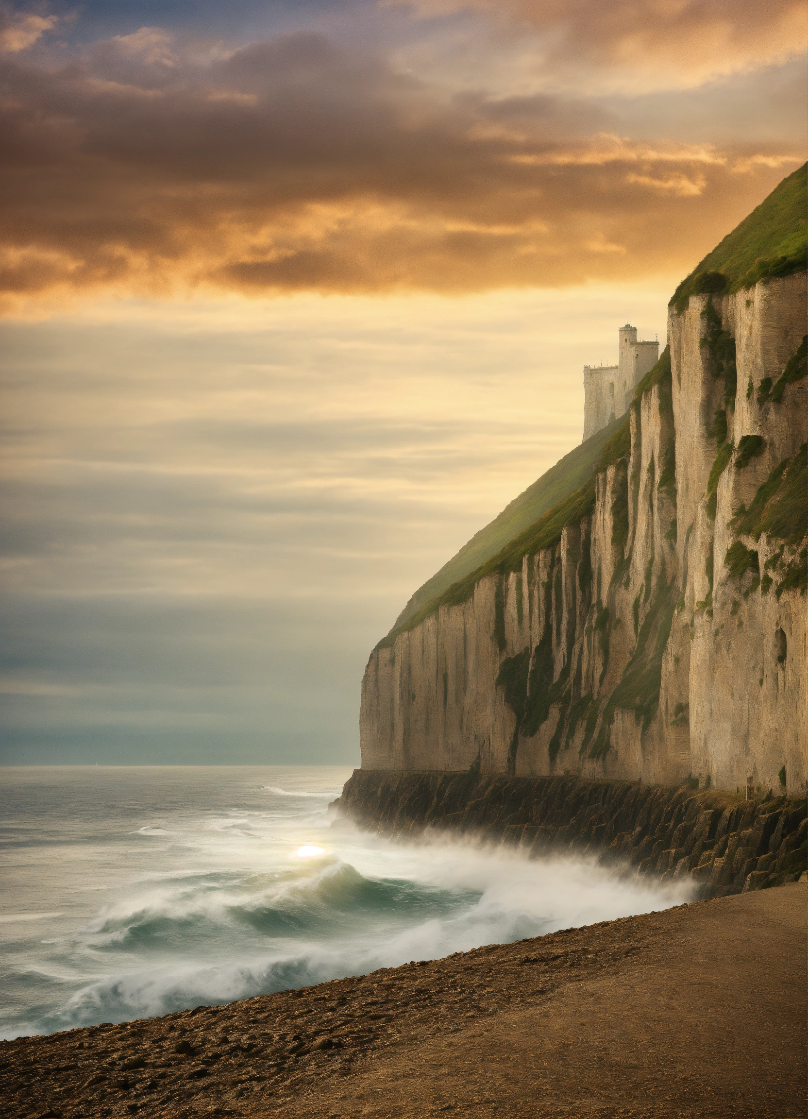 Create a captivating background scene, photorealistic, photoreal, with the cliffs of dover in their background