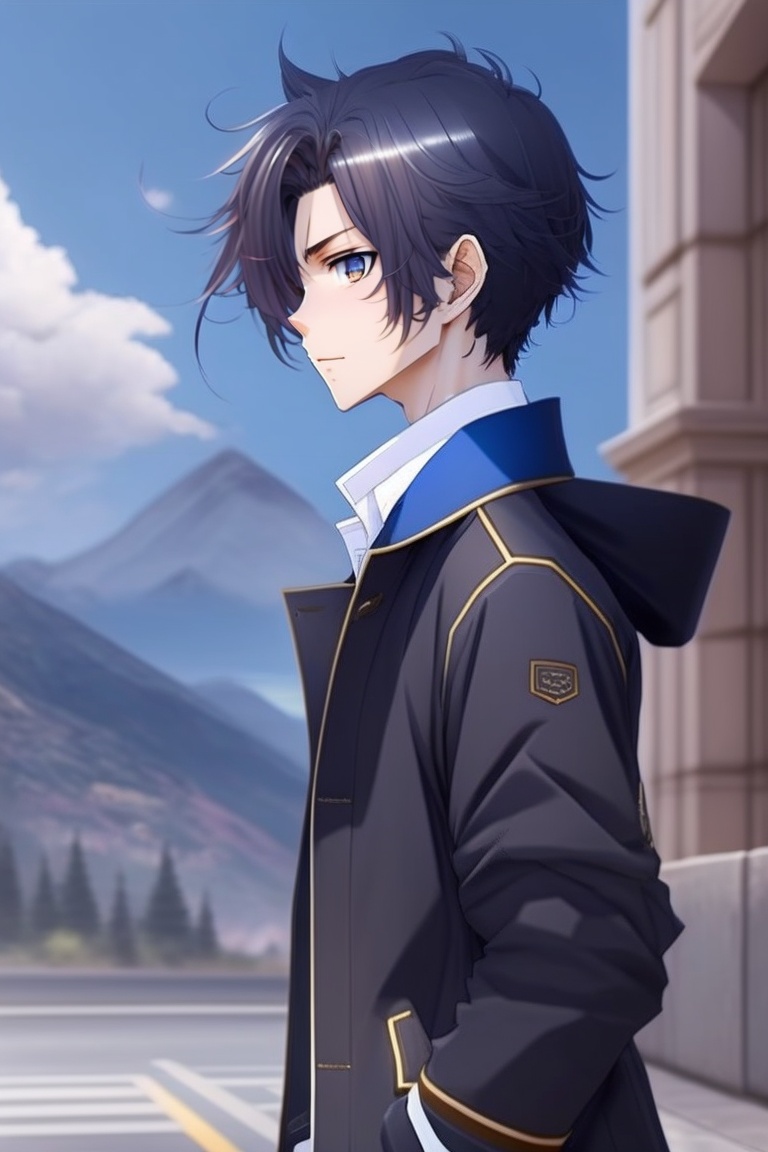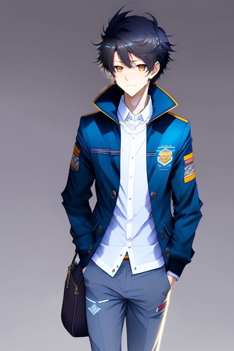 Anime boy, tapered black hair, modern haircut, white skin color close to brown, slate eyes, black coat, white shirt, blue pants, white shoes