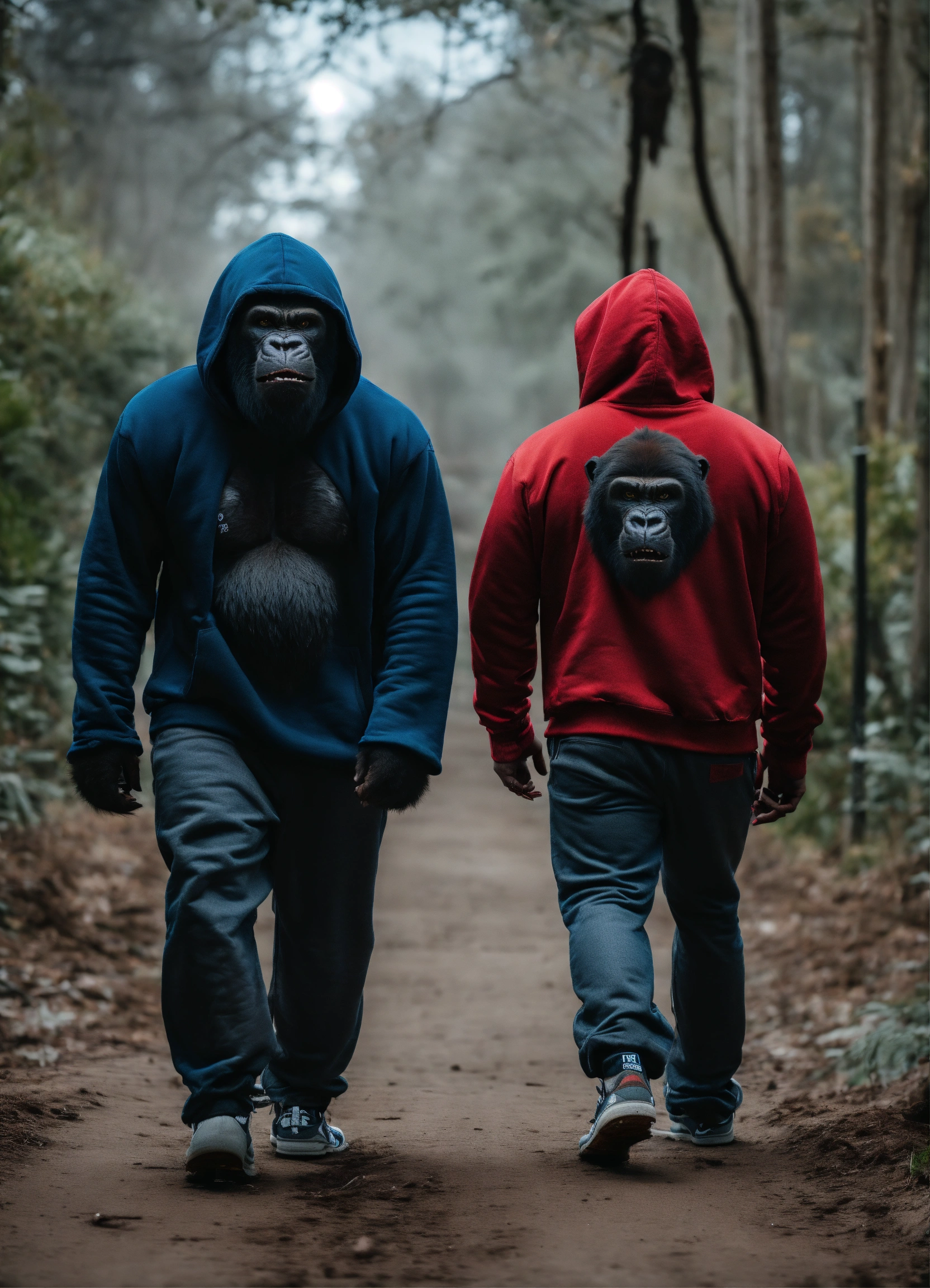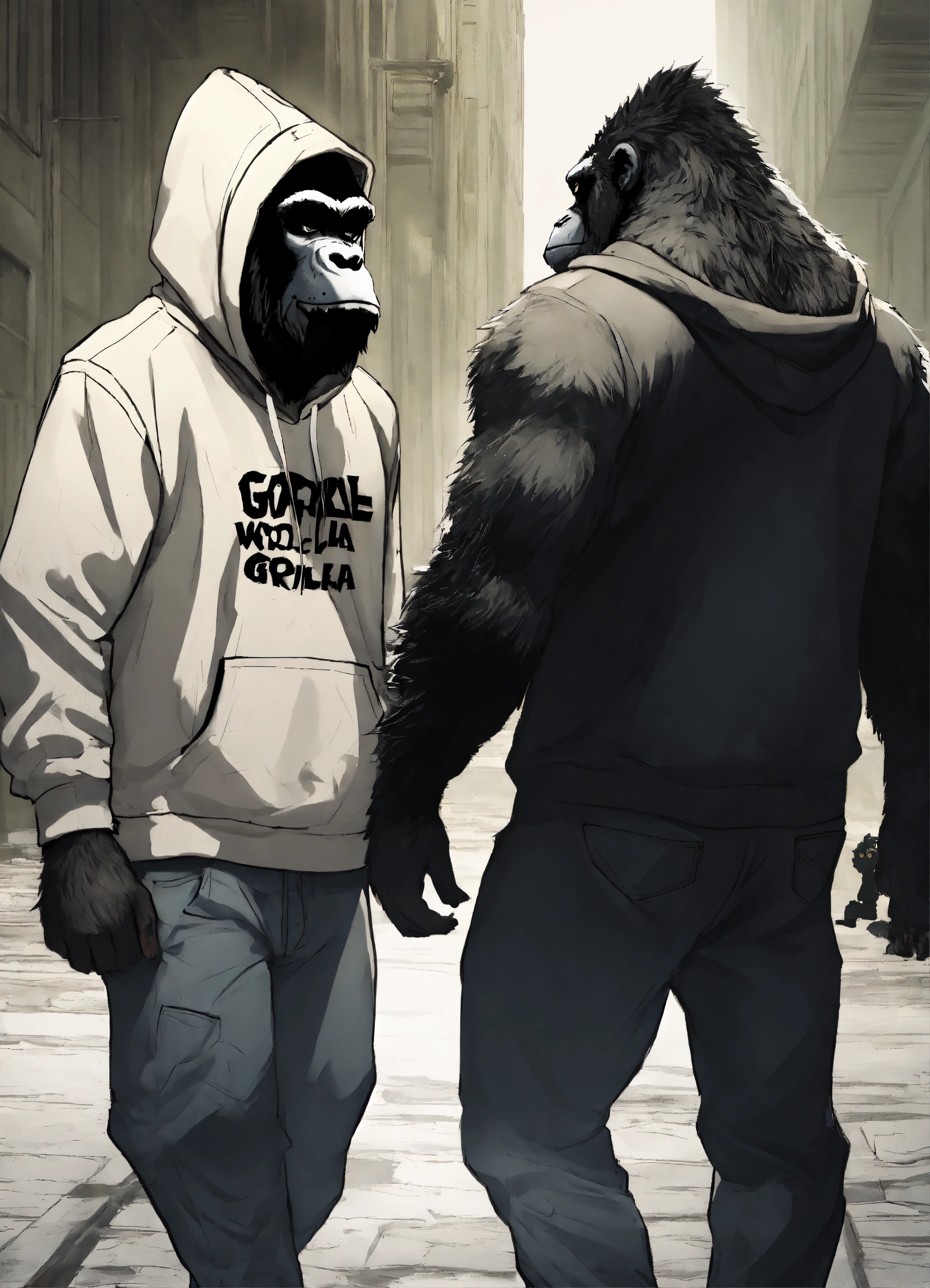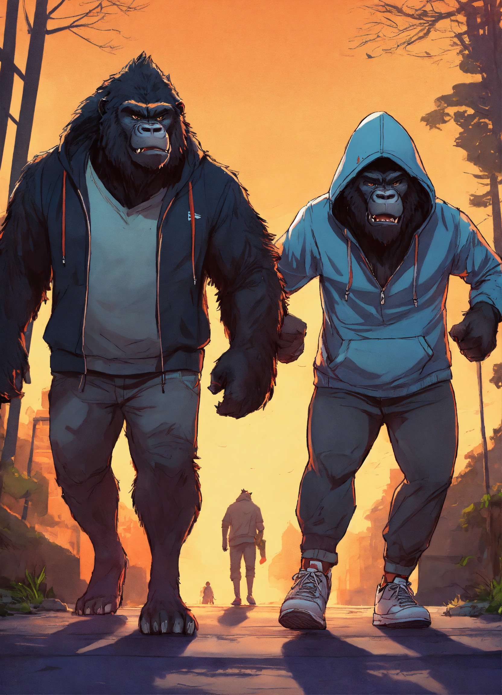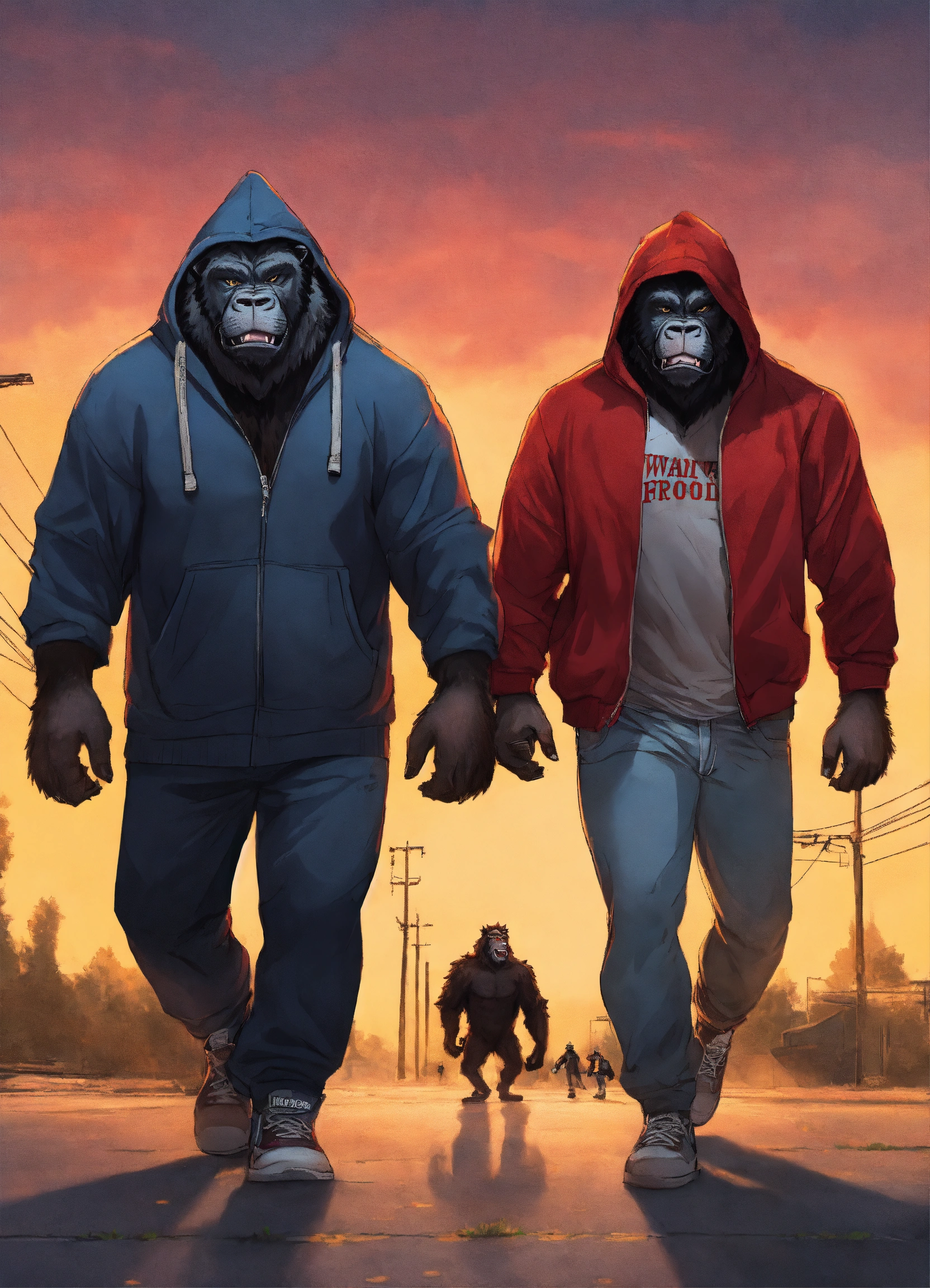 Werewolf and gorilla wearing hoodies and baseball caps mad walking away from each other