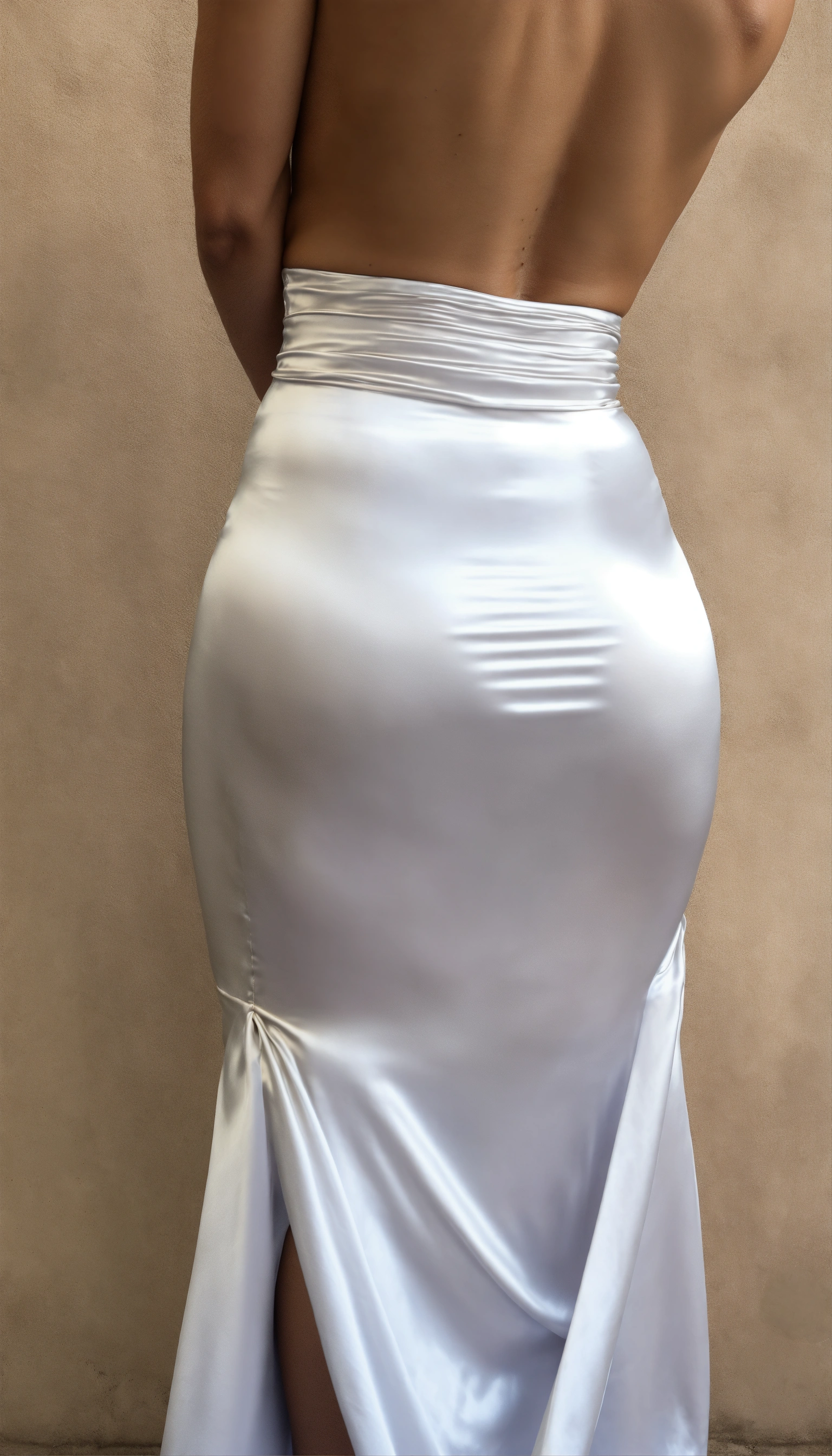 Close up of man holding bridal crop wearing white satin shiny figure-hugging clingy pencil maxi skirt, pulled taut. close up. manly body part straining through fabric. toned bulking body. bu lge. ere ct. intimate. tumescent. extremely tight skirt. hard outline.