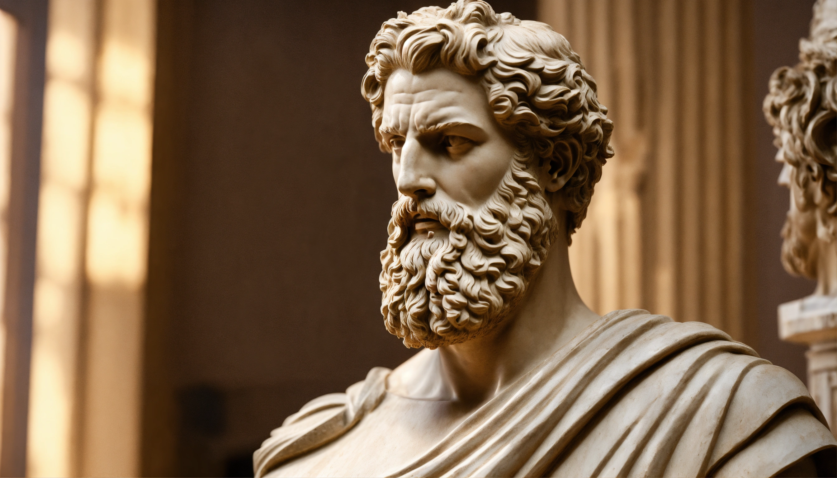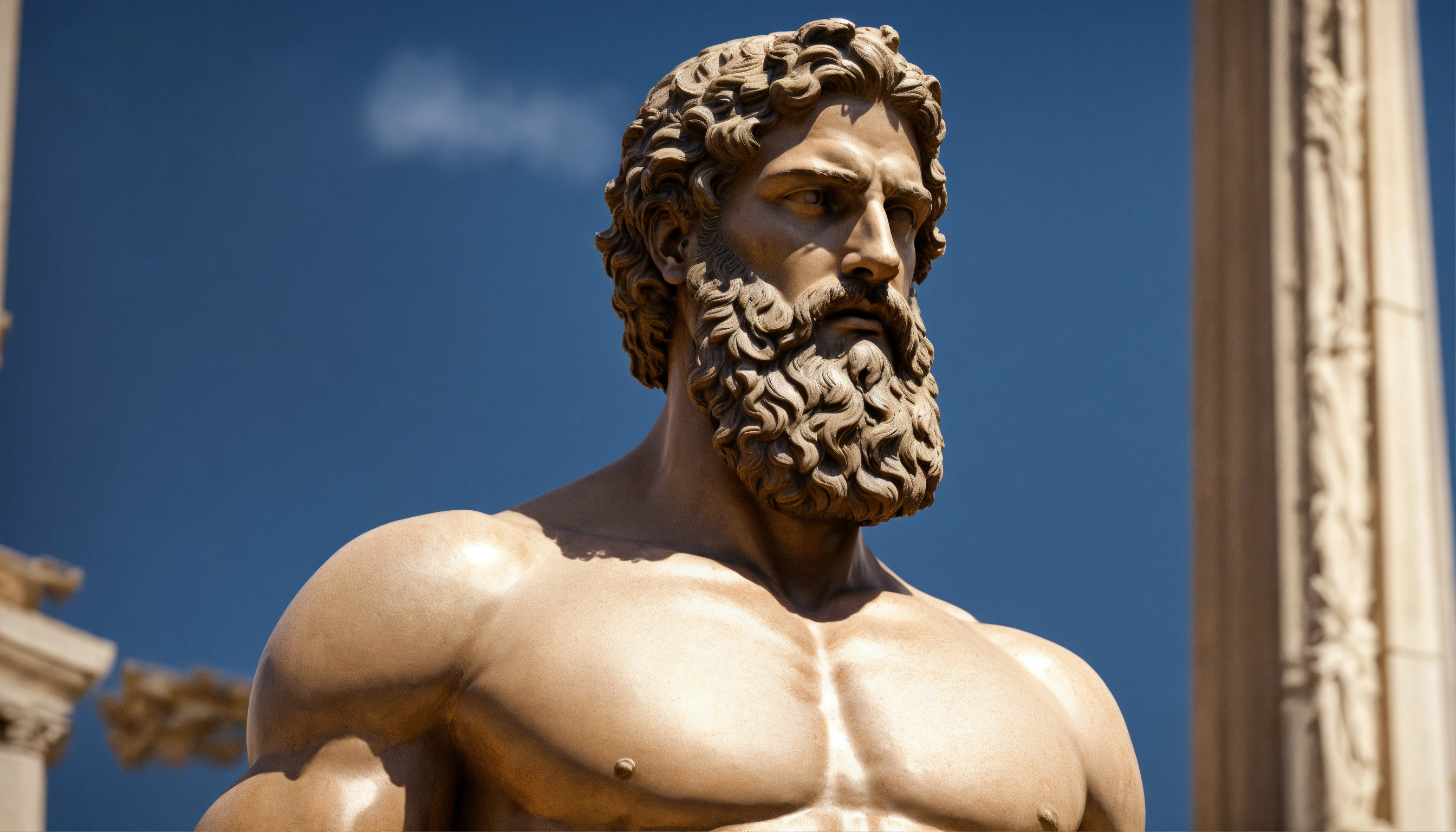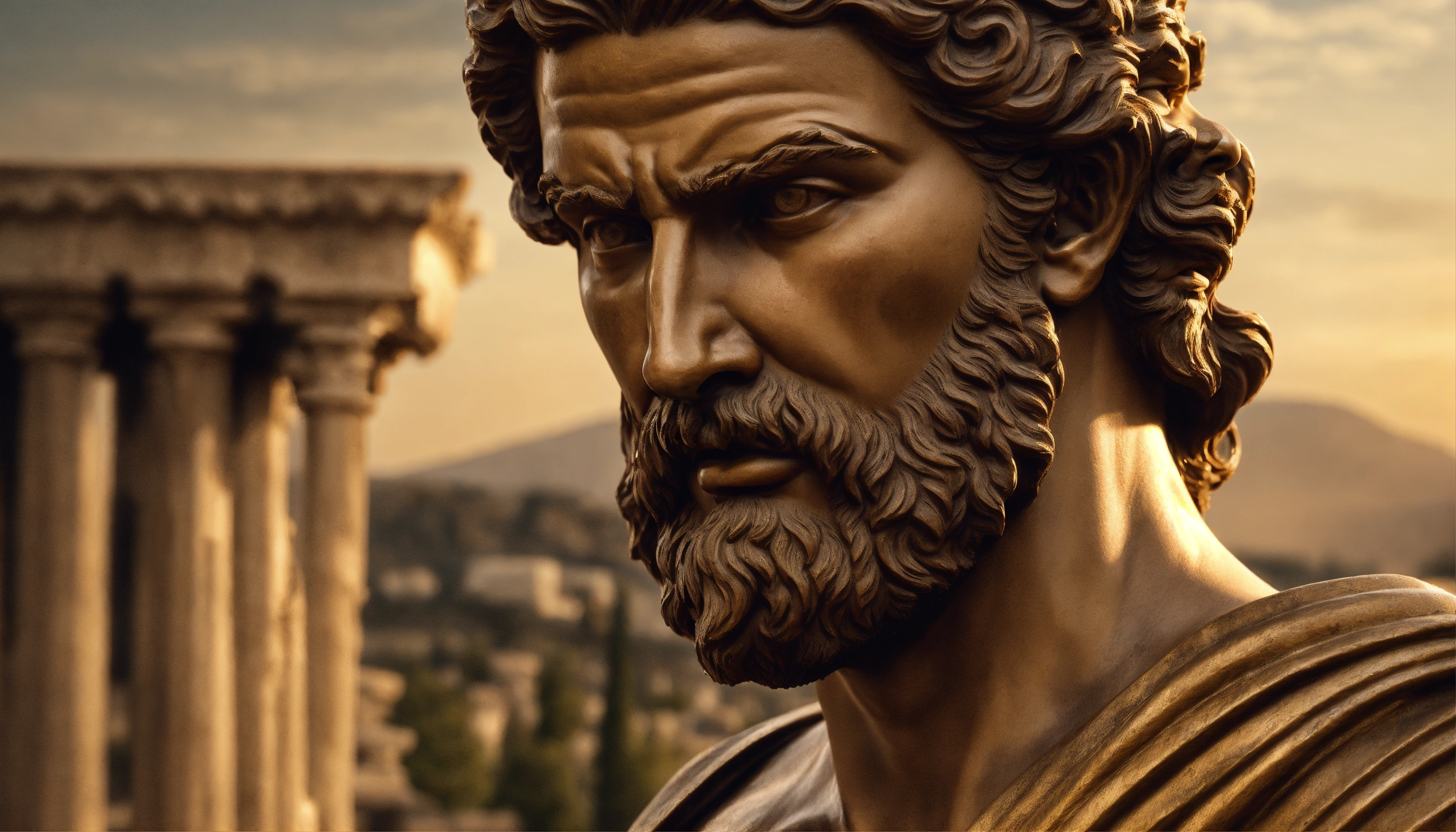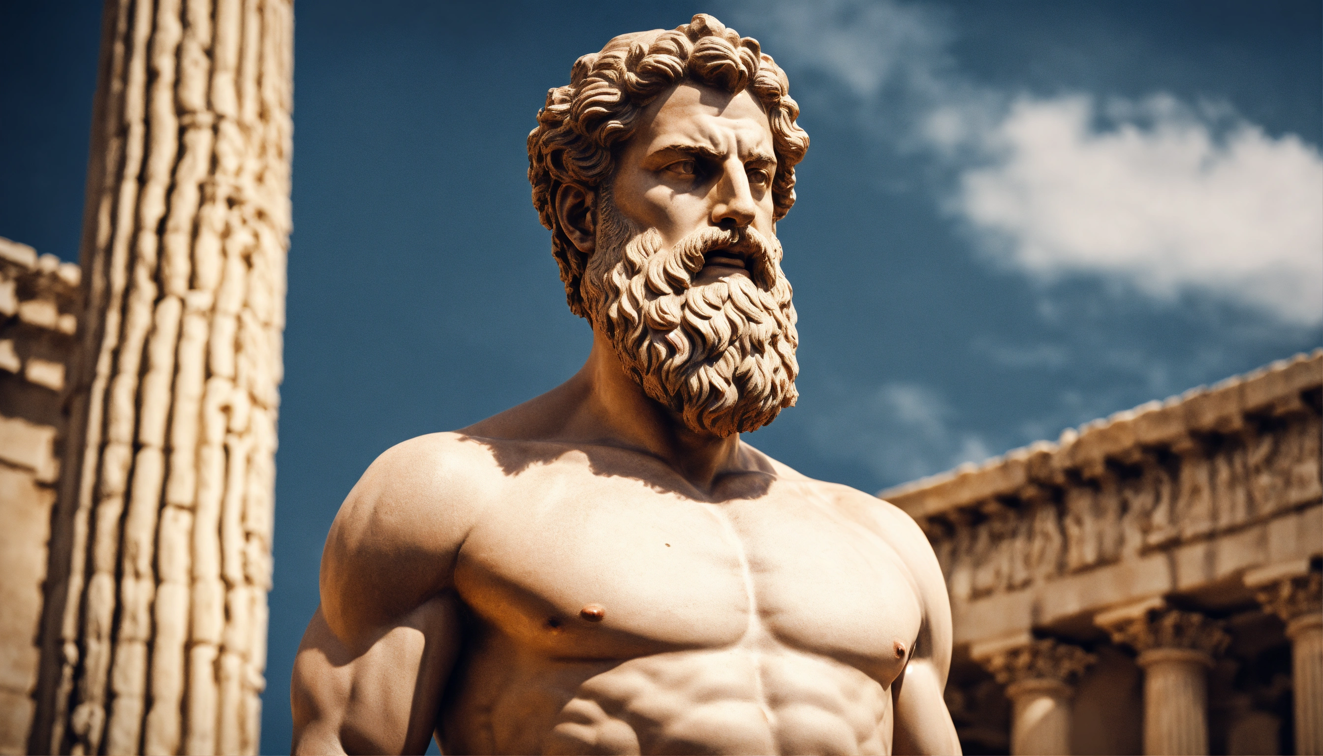 Greek man sculpture, bearded, muscular, perfect face, detailed, stoic, controlling stress, ancient greece in the background, realistic, 169.8k