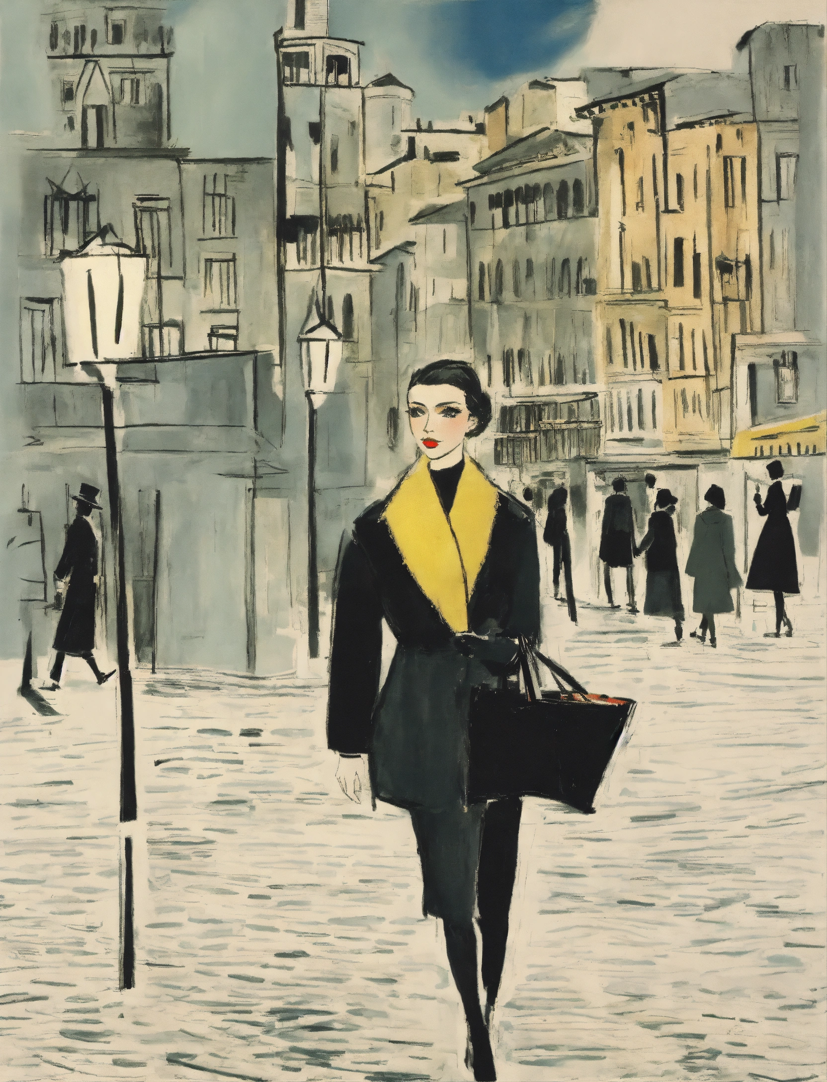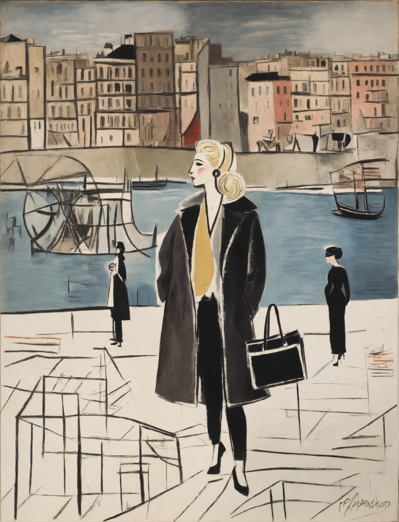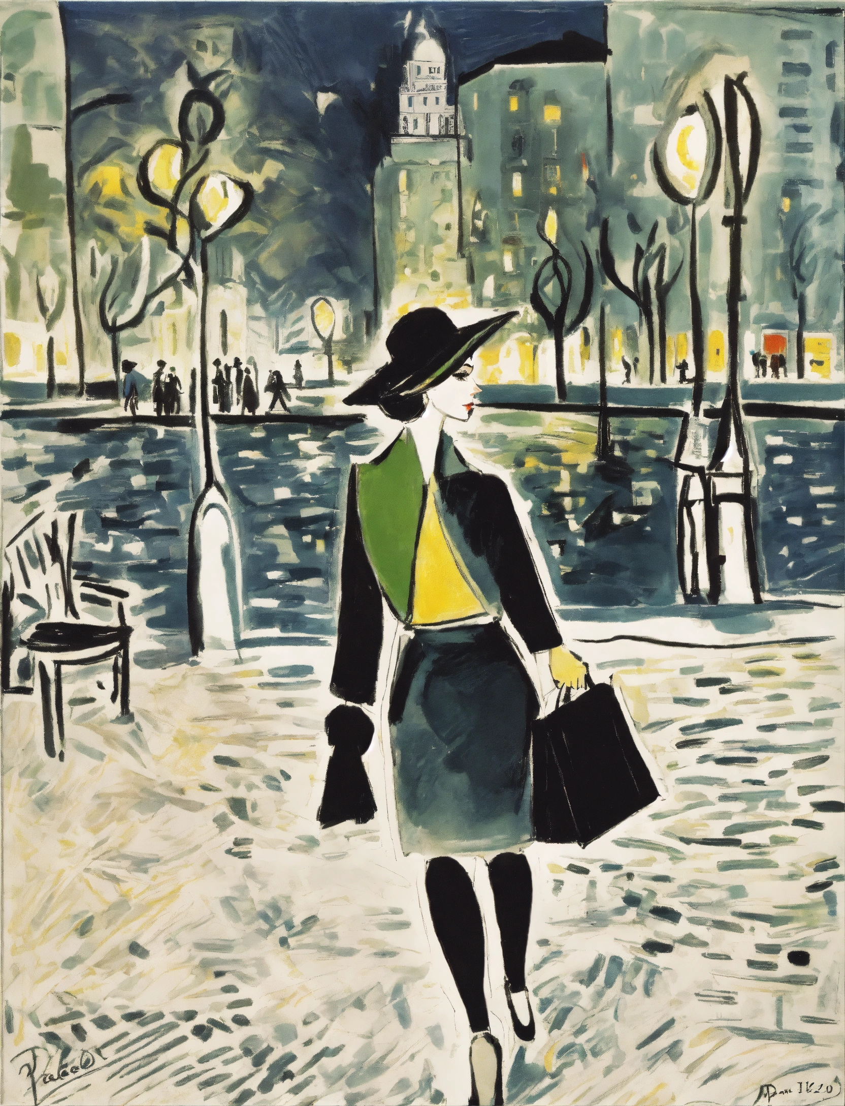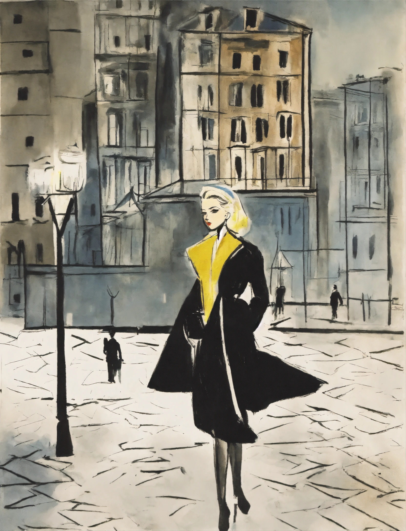 Illustration by pablo picasso of a city at night where grace kelly wears a black coat, city skyline, dramatic lighting, black makeup, rough texture, dark night, (by pablo picasso1.2)