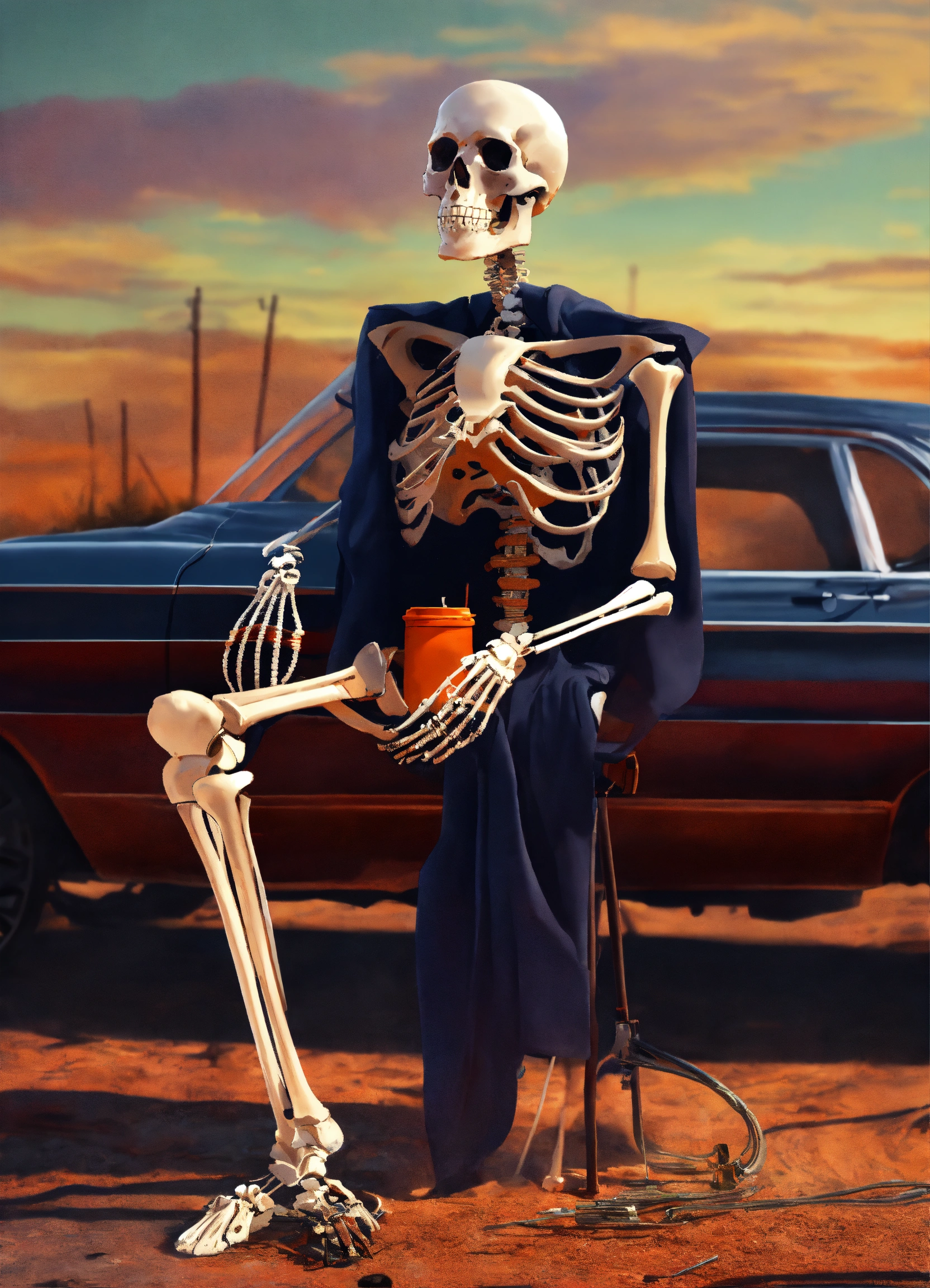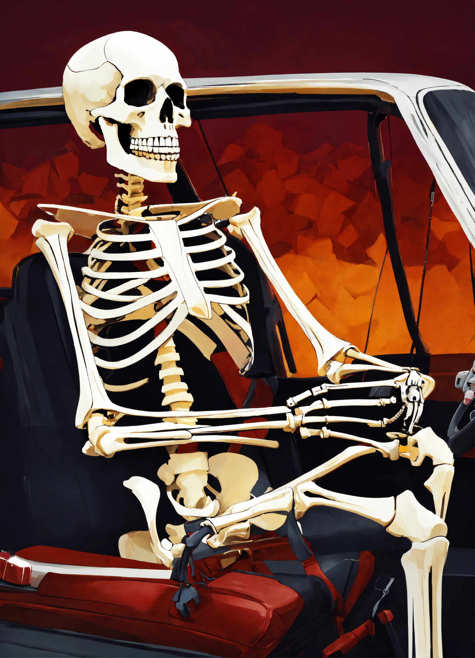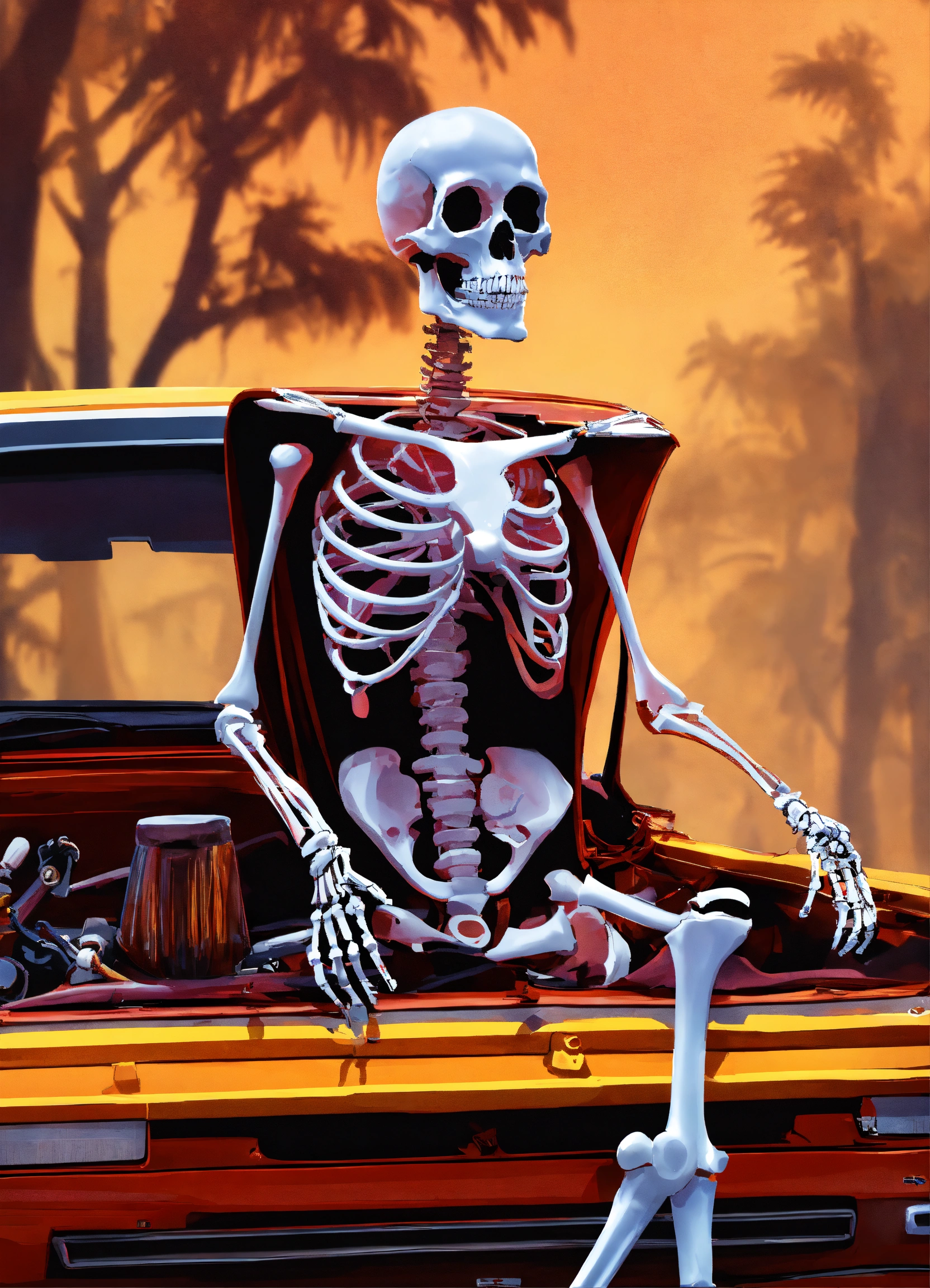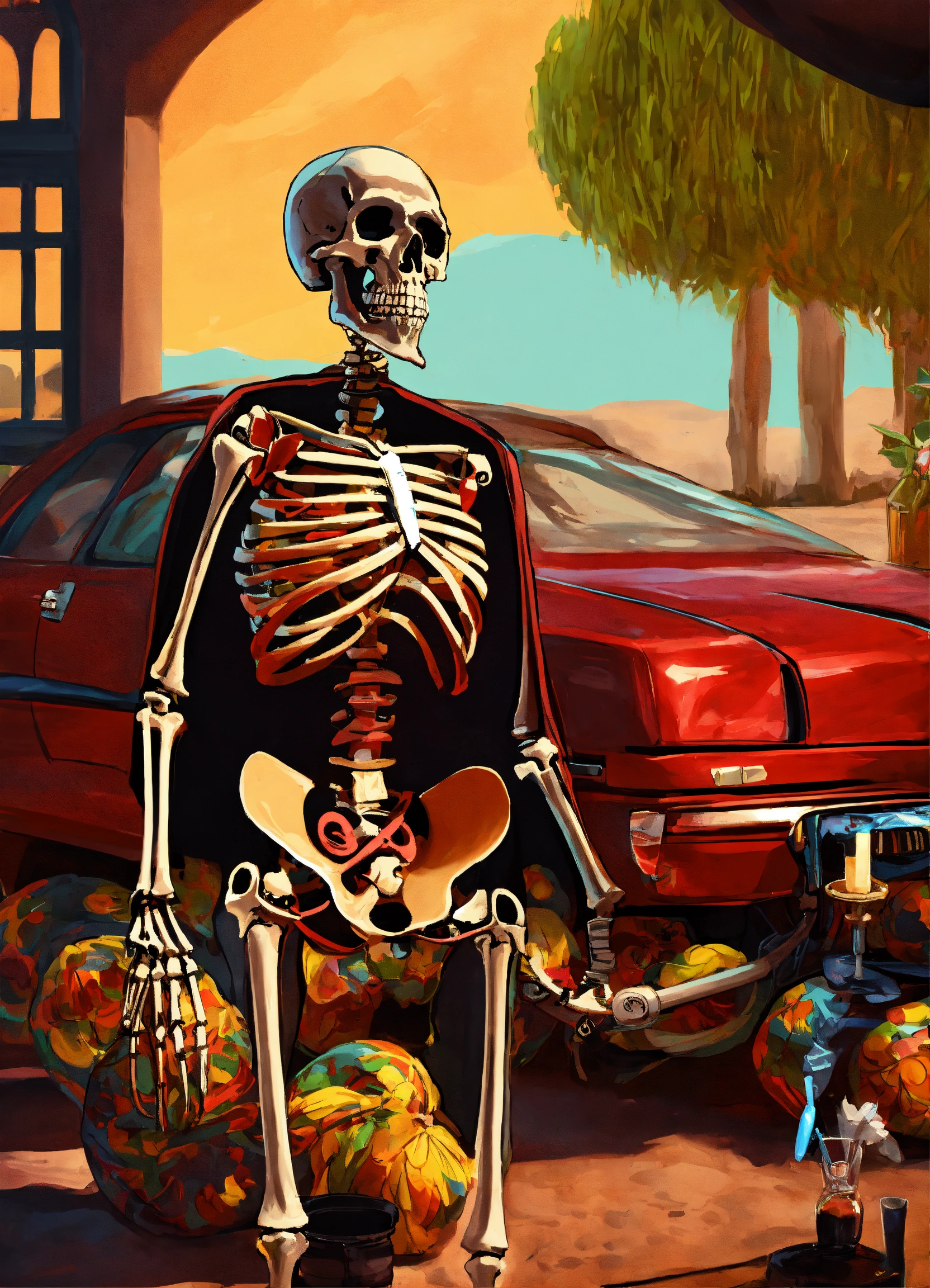 A digital art of a skeleton master in automotive plastic repair for cars, inspired in the mexican art of death´s day
