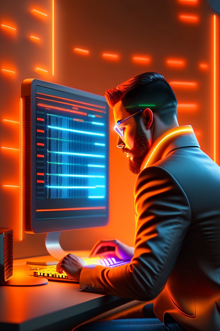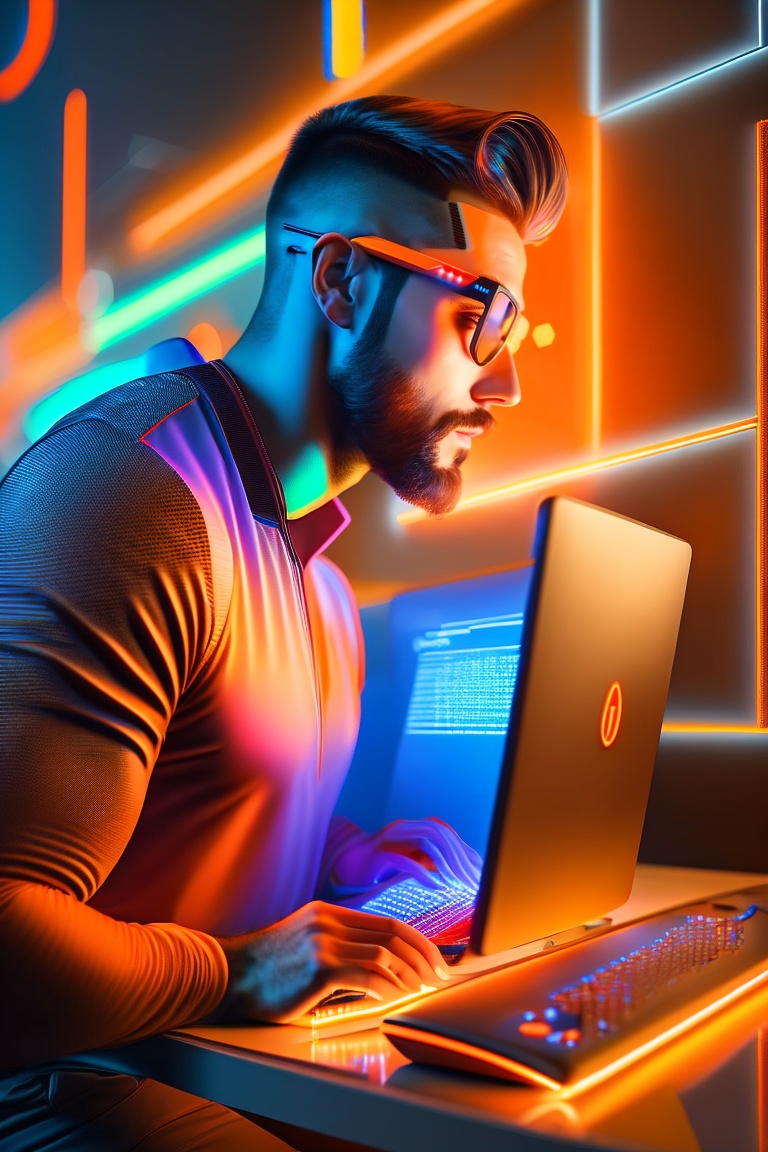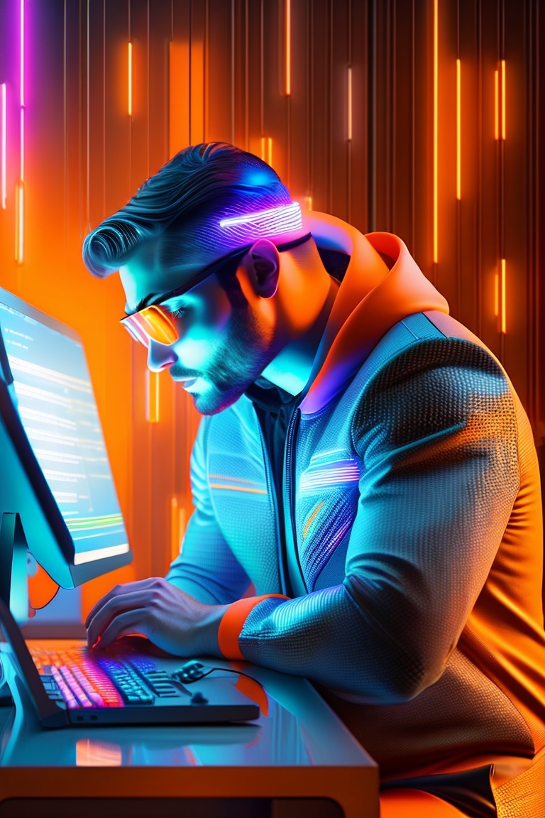 Man programming on his computer, from the computer screen the lines of codes come out along with an orange neon light, photorealistic