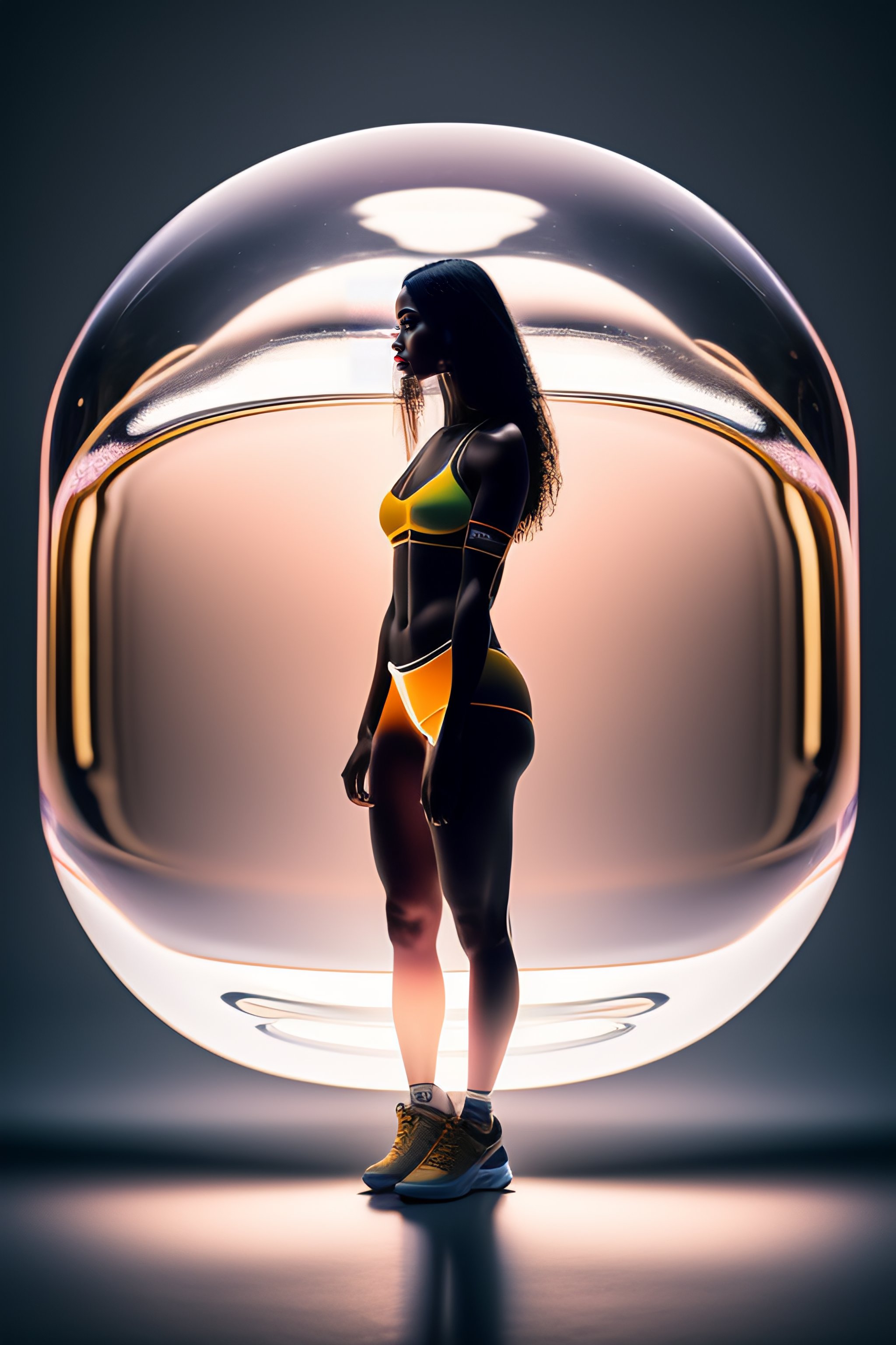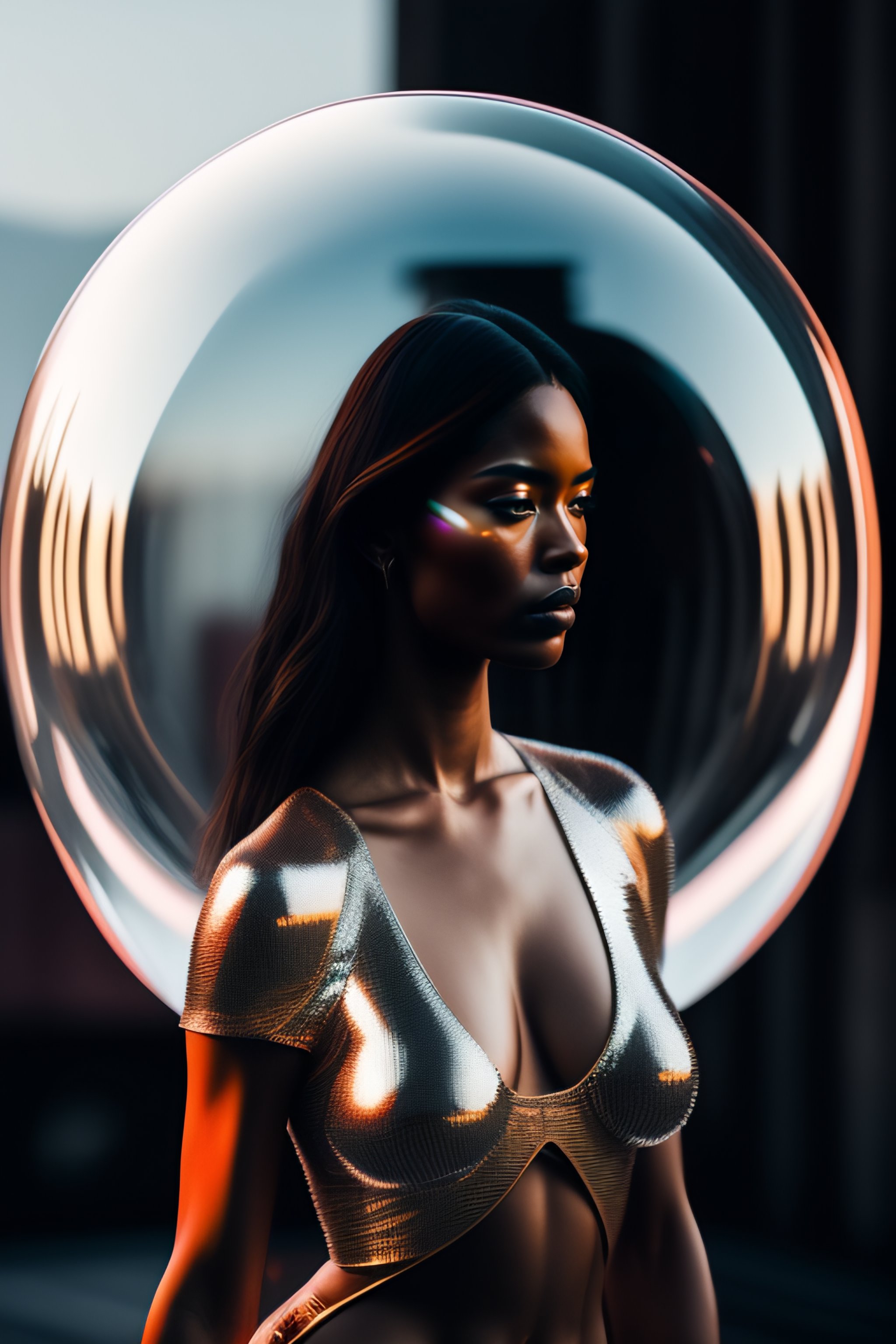 Female standing pose trapped glass bubble, ultra hd! realistic! helmut lang photoshoot, david rudnick detailed behance instagram underground 4k