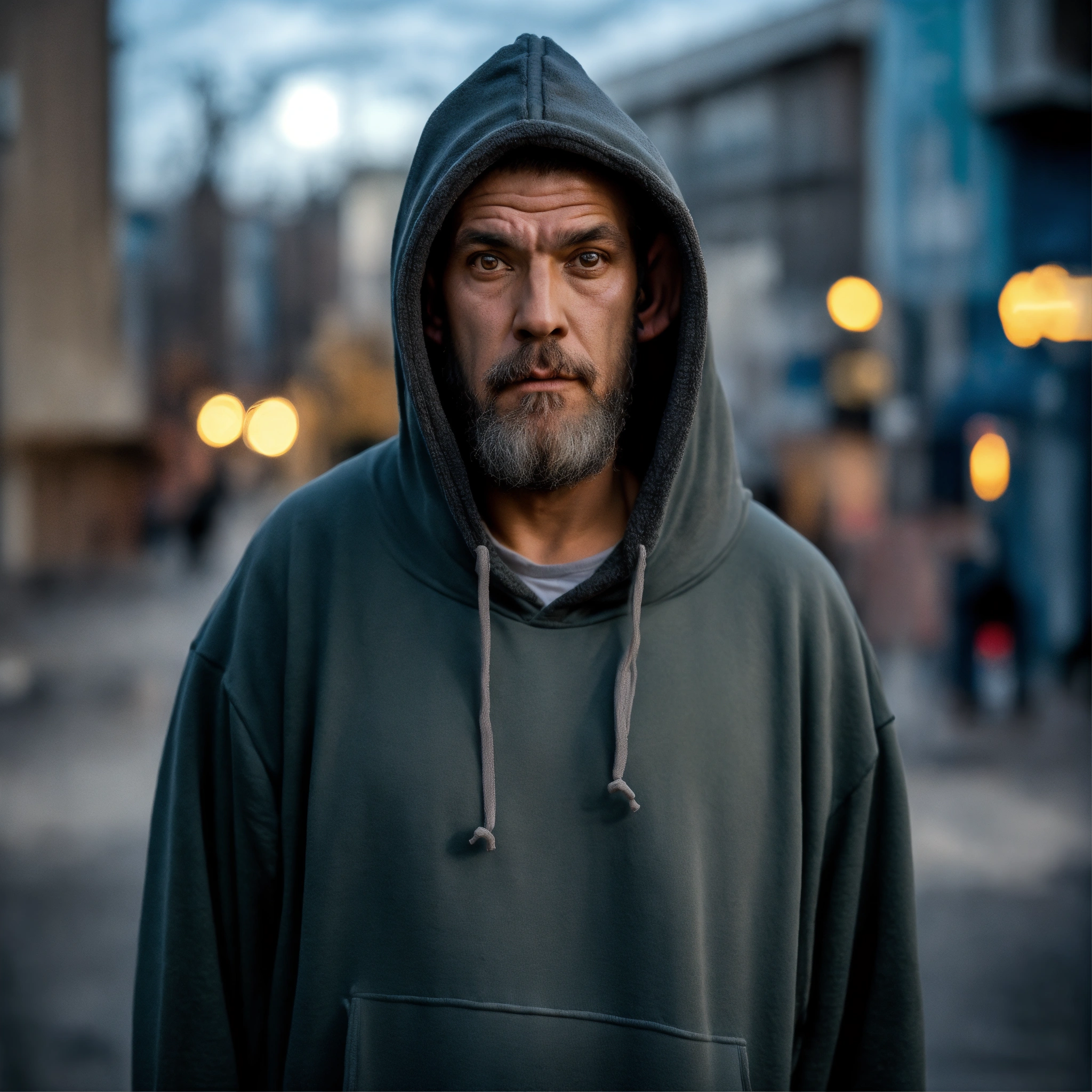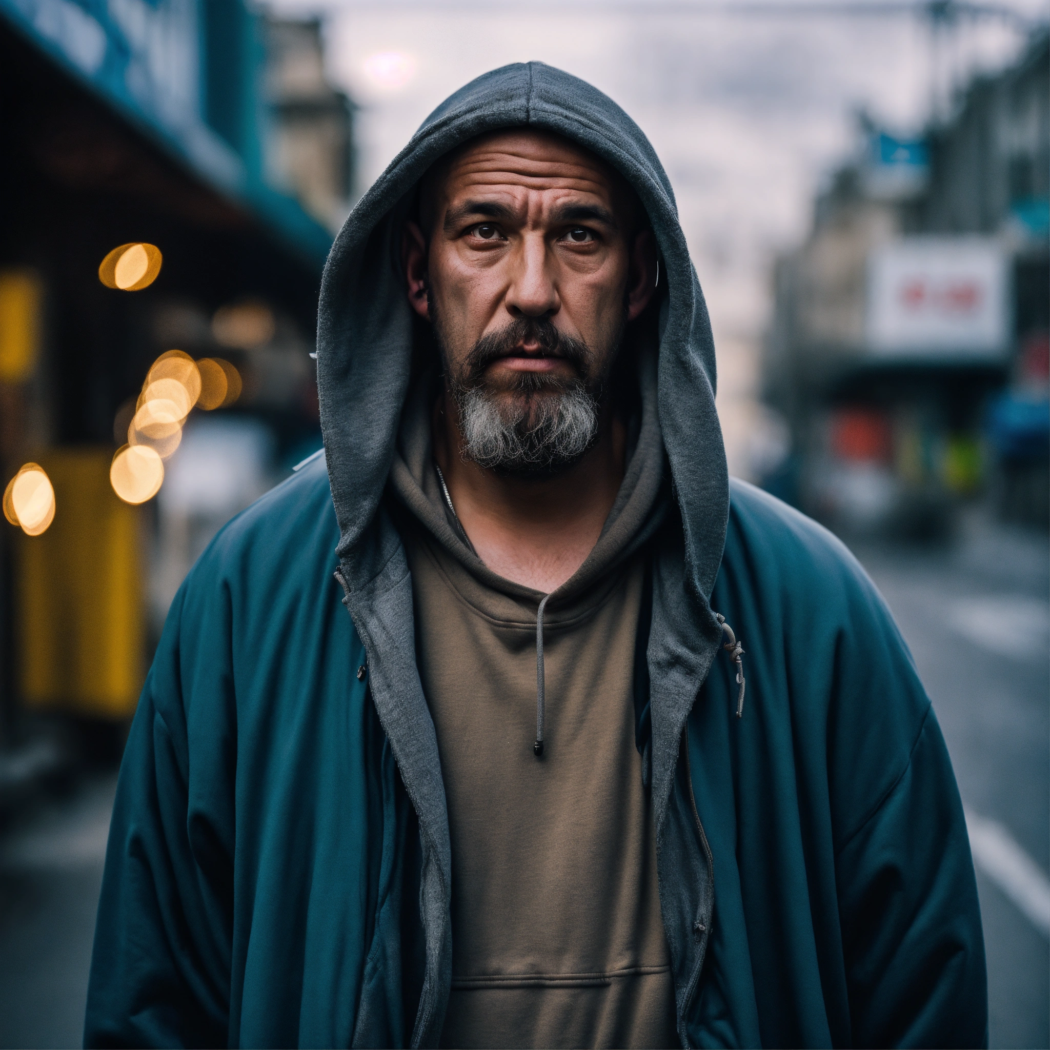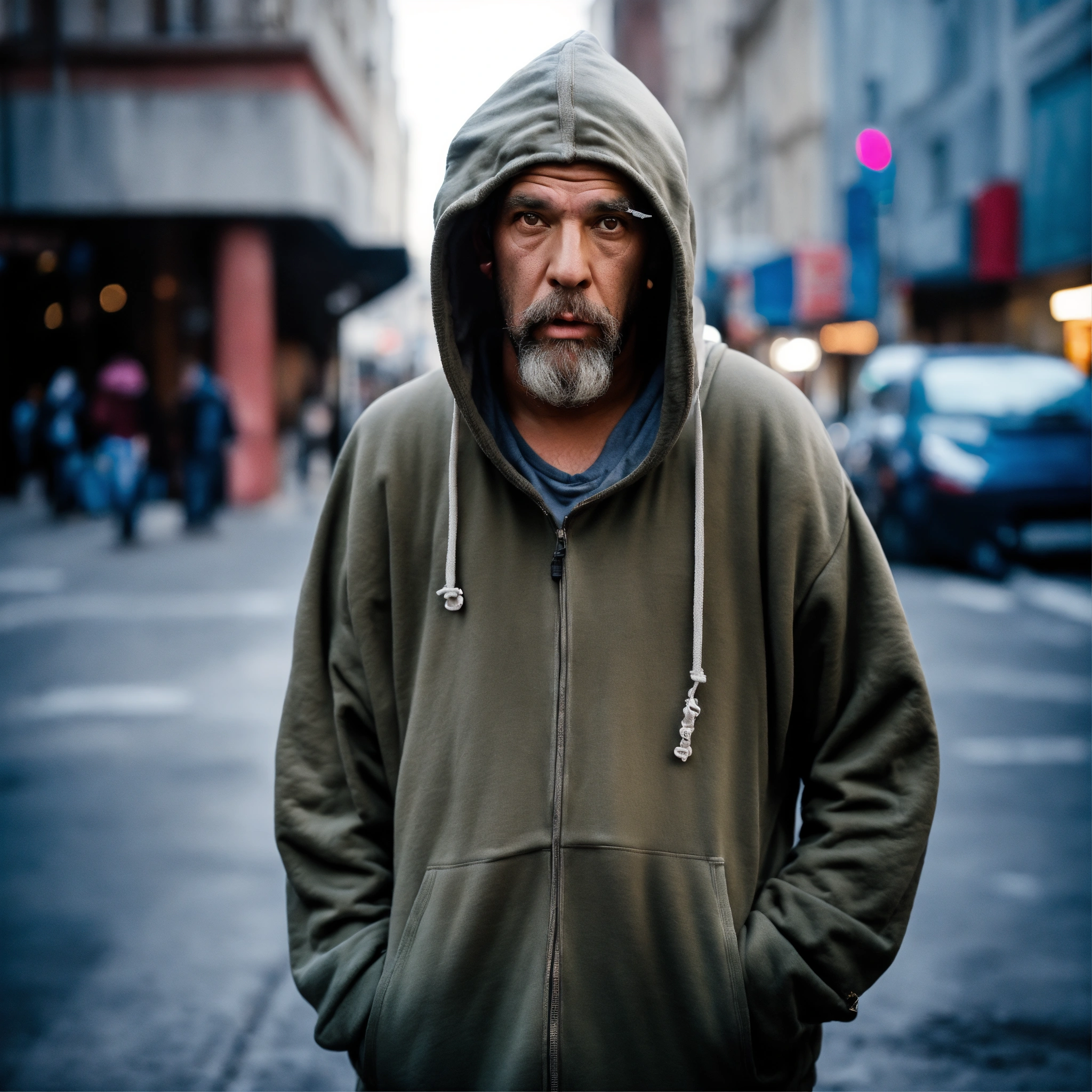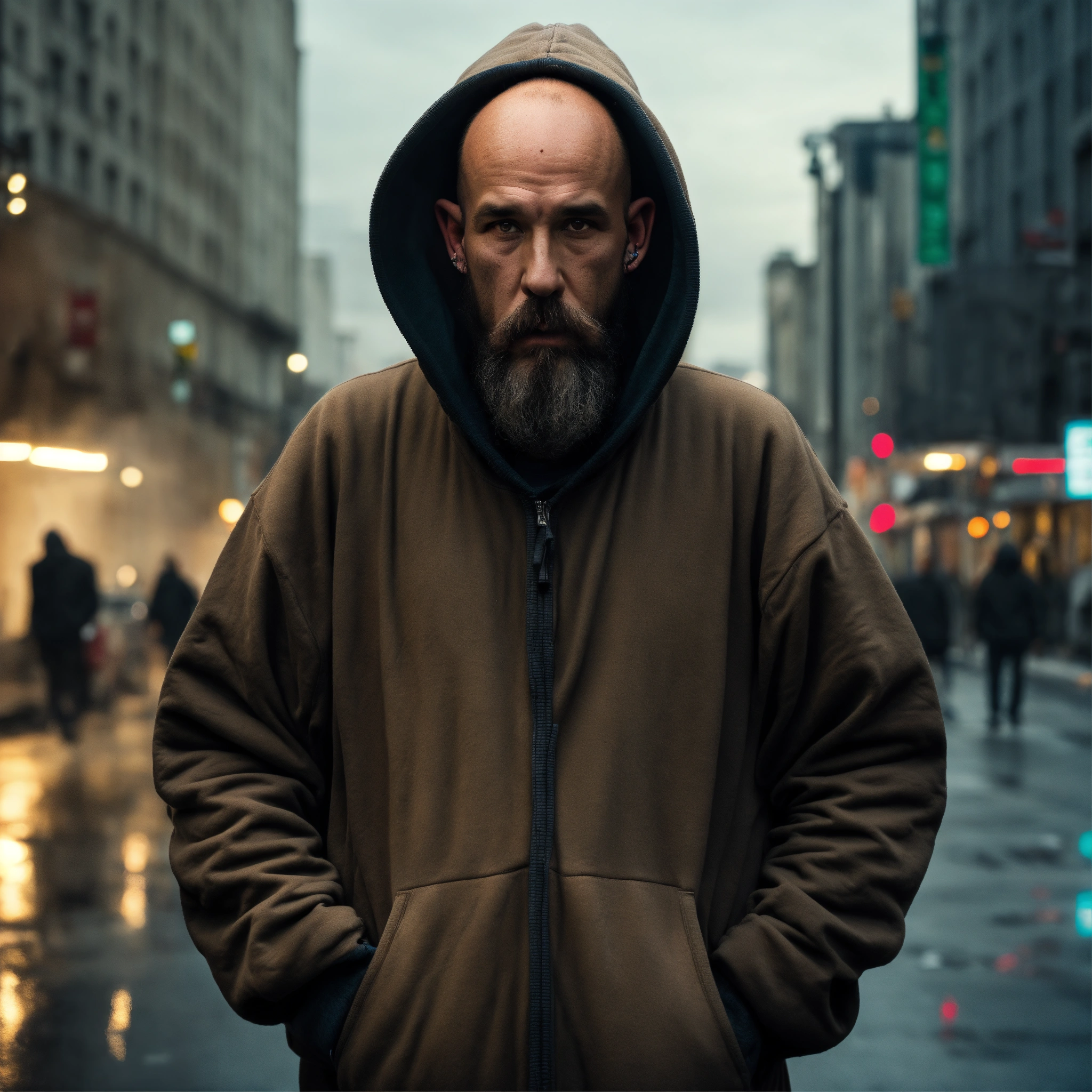 A homeless huge man with a huge lumpy bald head, a tiny goatee, protruding forehead, sunken silver eyes, crooked mouth, large ears, wearing a hoodie up over his head, standing in the street